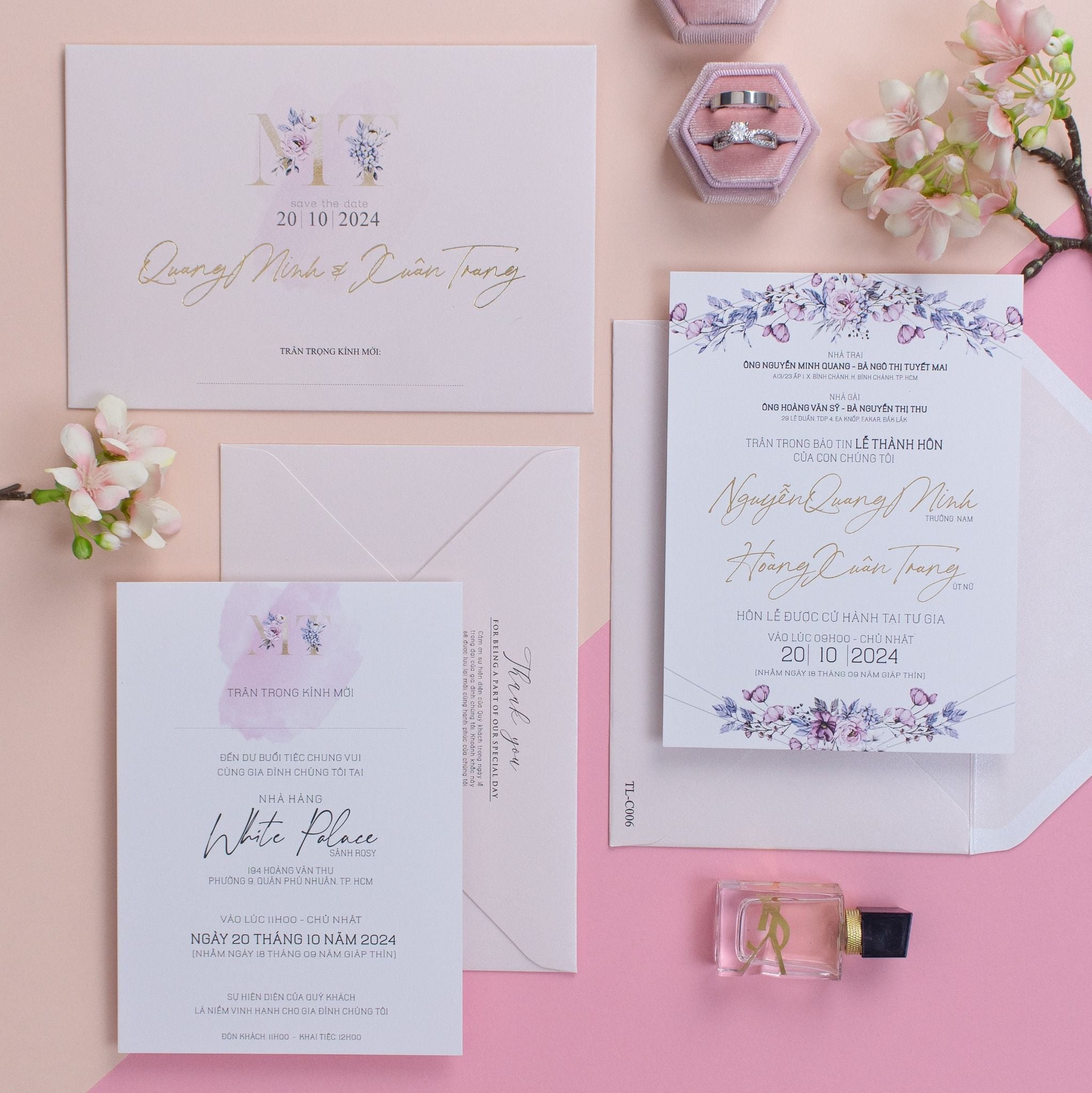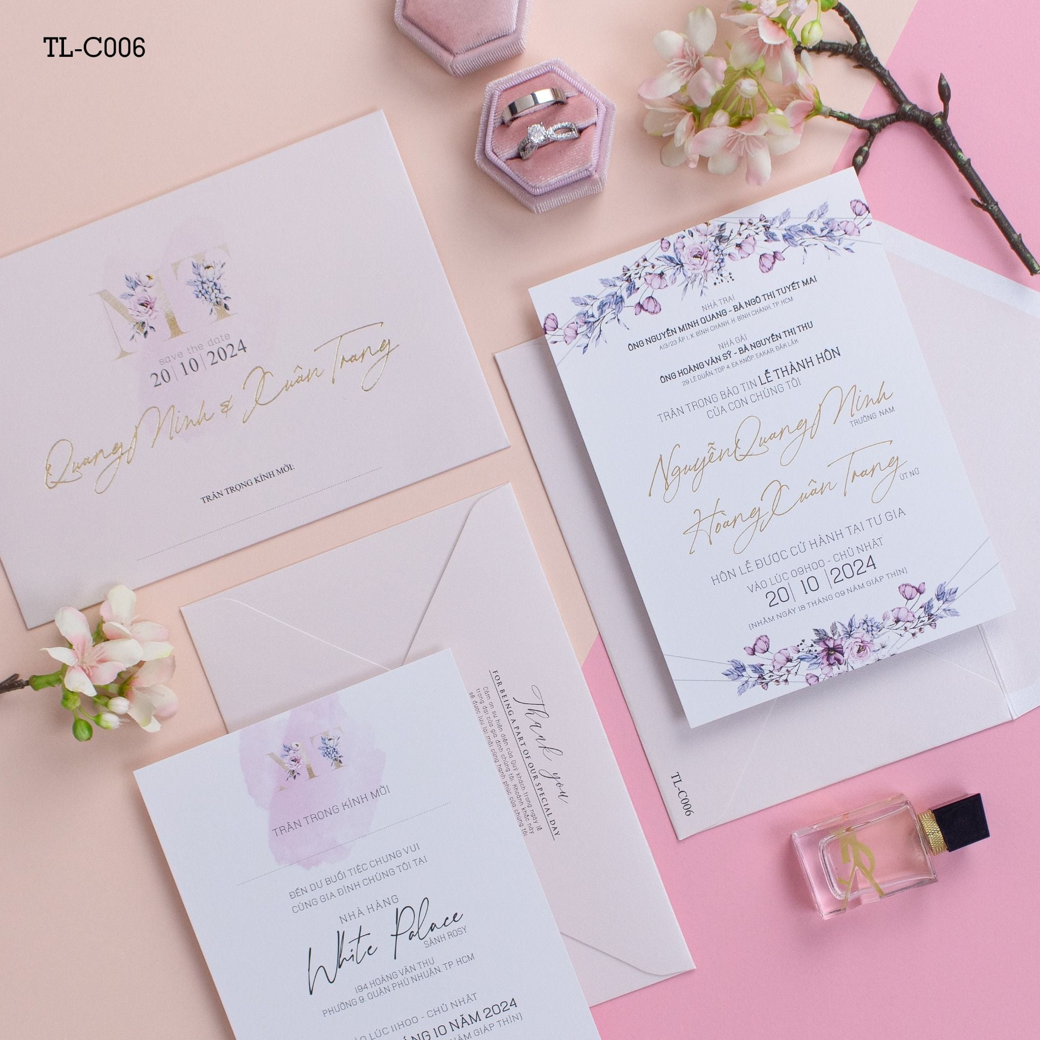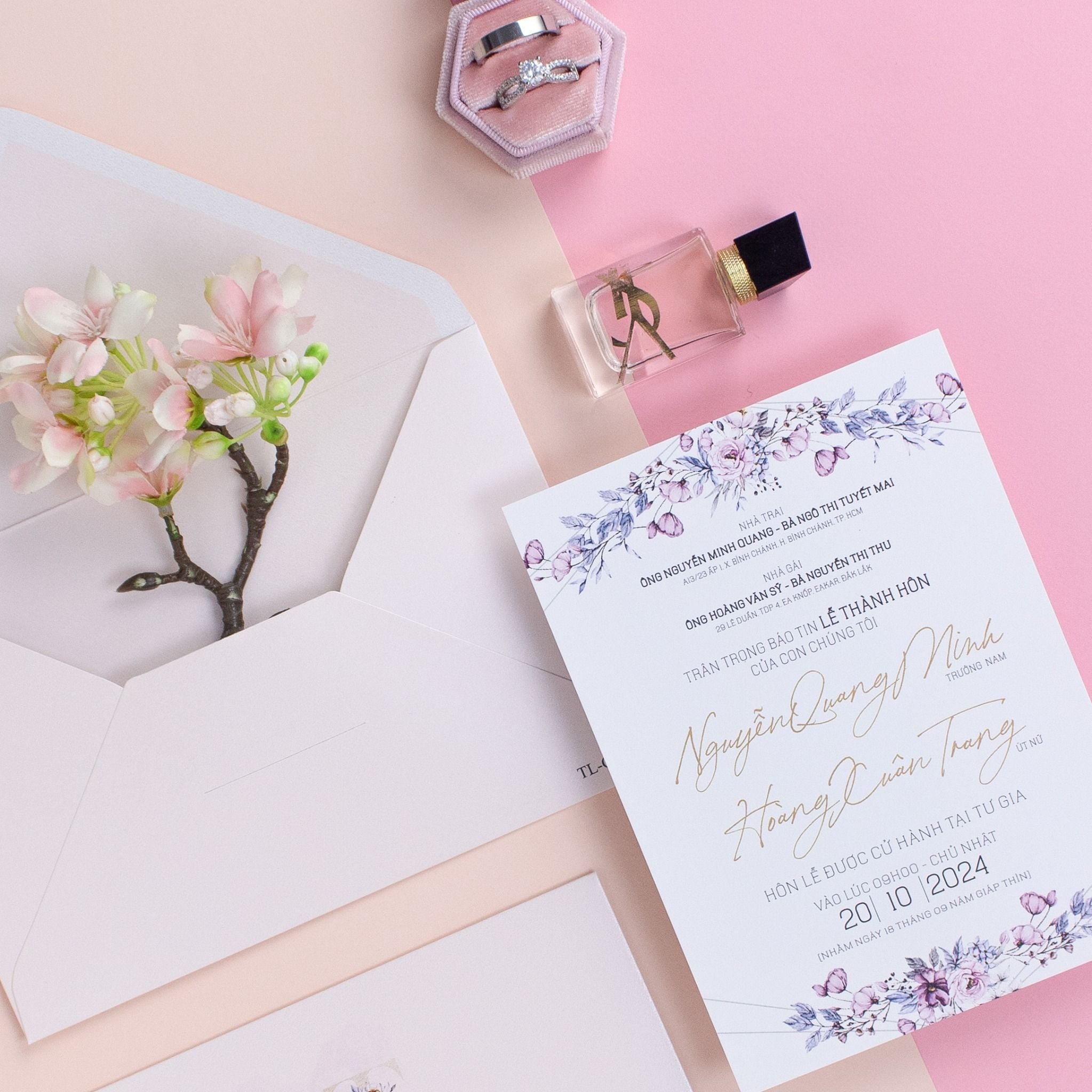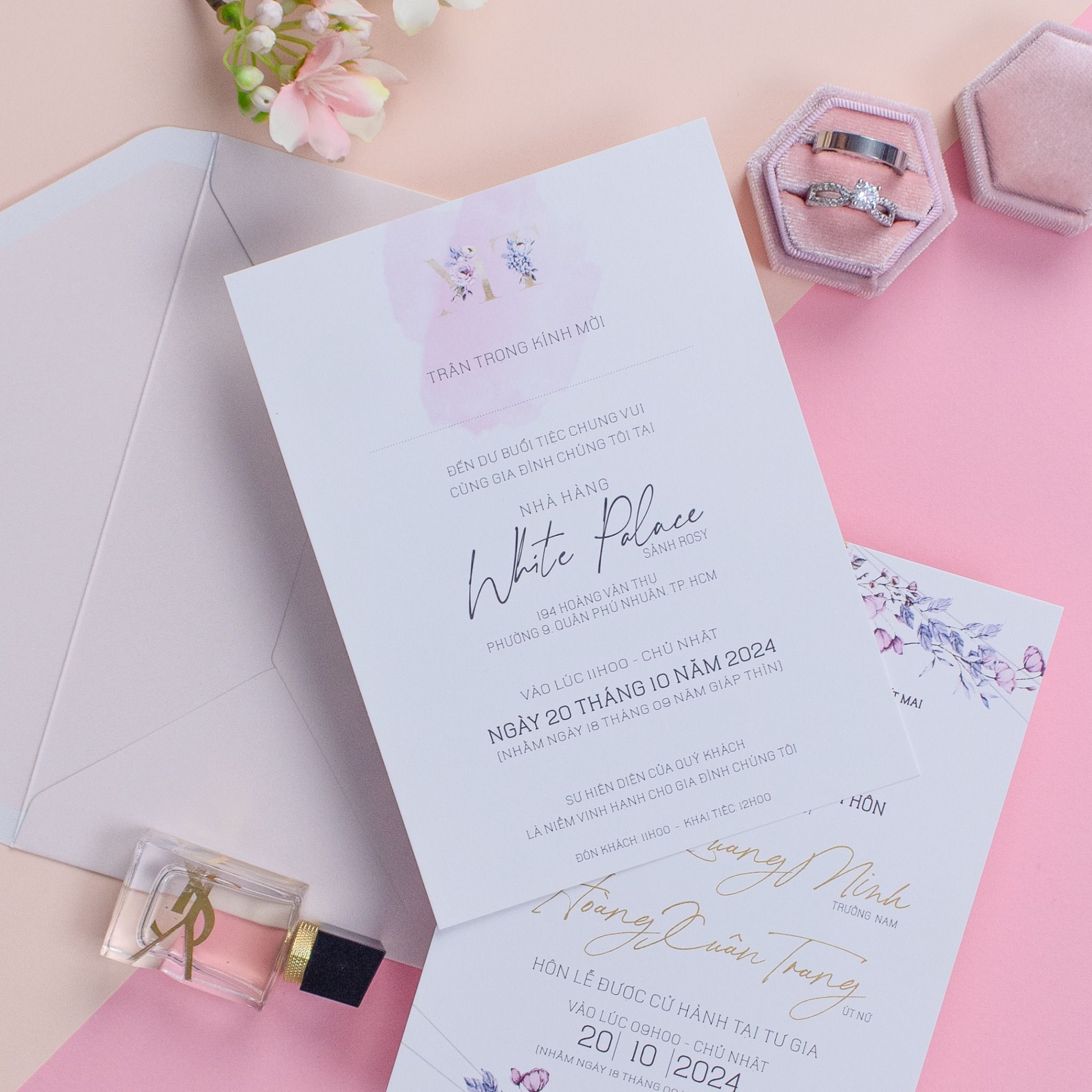 Mang đến một trải nghiệm thị giác dịu dàng và đầy chất thơ, tựa như những giai điệu êm đềm của tình yêu lứa đôi. Mẫu thiệp cưới này gây ấn tượng bởi sự kết hợp tinh tế giữa tông màu hồng pastel chủ đạo và những vệt màu nước loang nhẹ, tạo nên những mảng sắc màu có chiều sâu và sức sống trên nền giấy trắng cao cấp. Những chi tiết hoa nho nhỏ được điểm xuyết khéo léo dọc theo các vệt loang, mang lại vẻ đẹp thanh khiết, tinh khôi và làm tăng thêm nét lãng mạn cho tổng thể bộ thiệp. Sự giao thoa giữa phông chữ ép kim vàng sang trọng cùng bố cục tối giản giúp tấm thiệp cưới toát lên vẻ thanh lịch hiện đại, biến lời mời thành một món quà trân trọng để khách mời cùng bước vào hành trình hạnh phúc ngọt ngào của bạn.