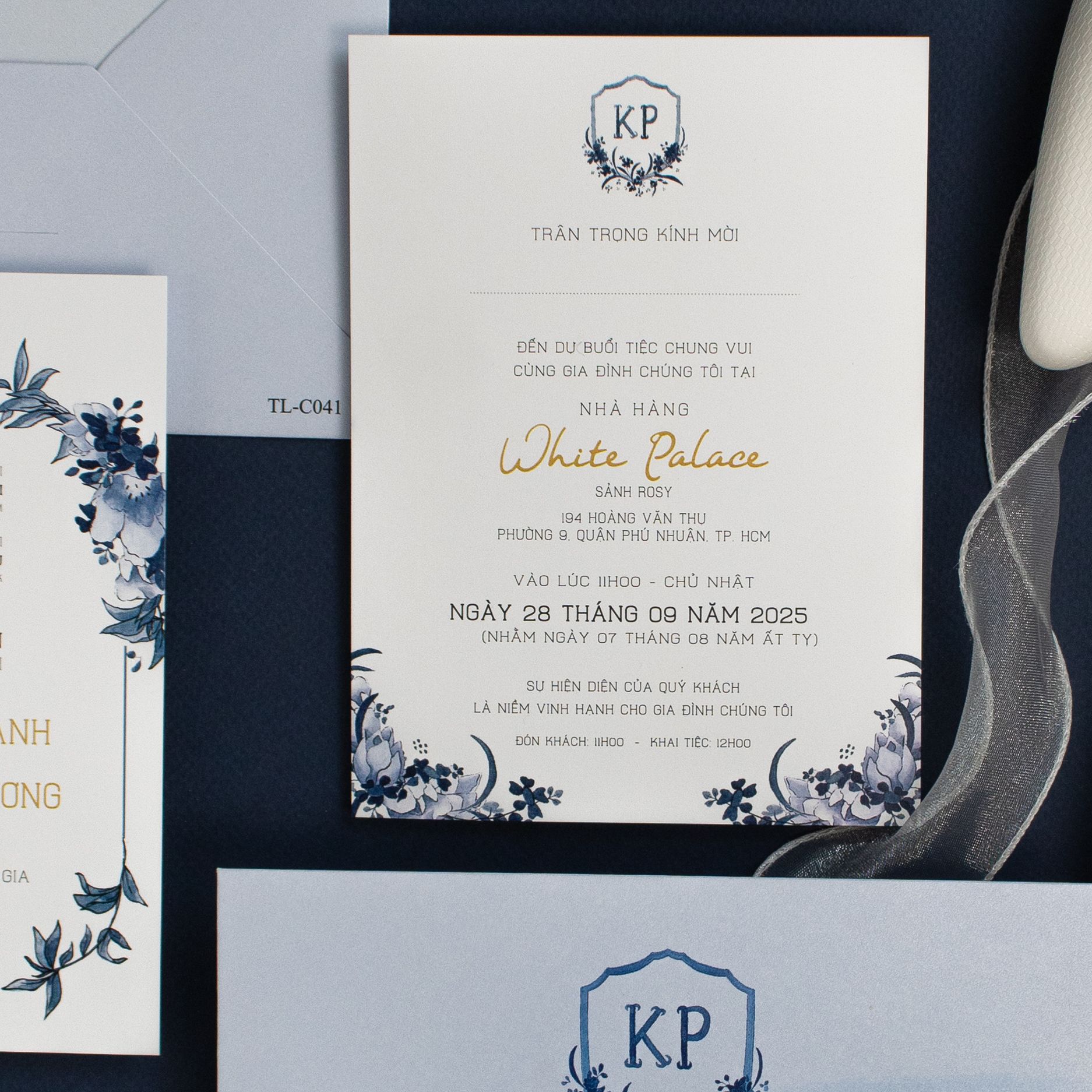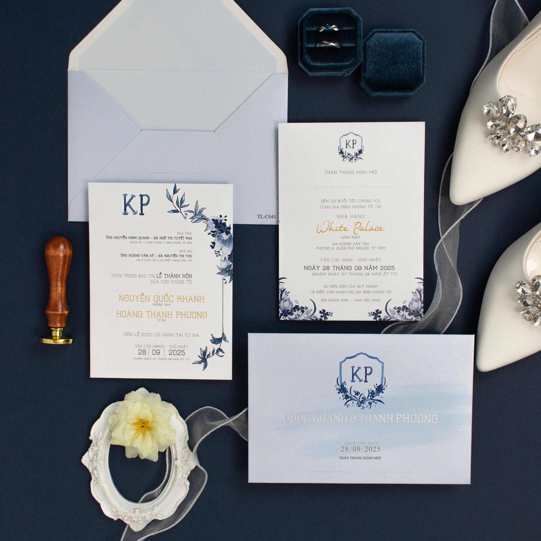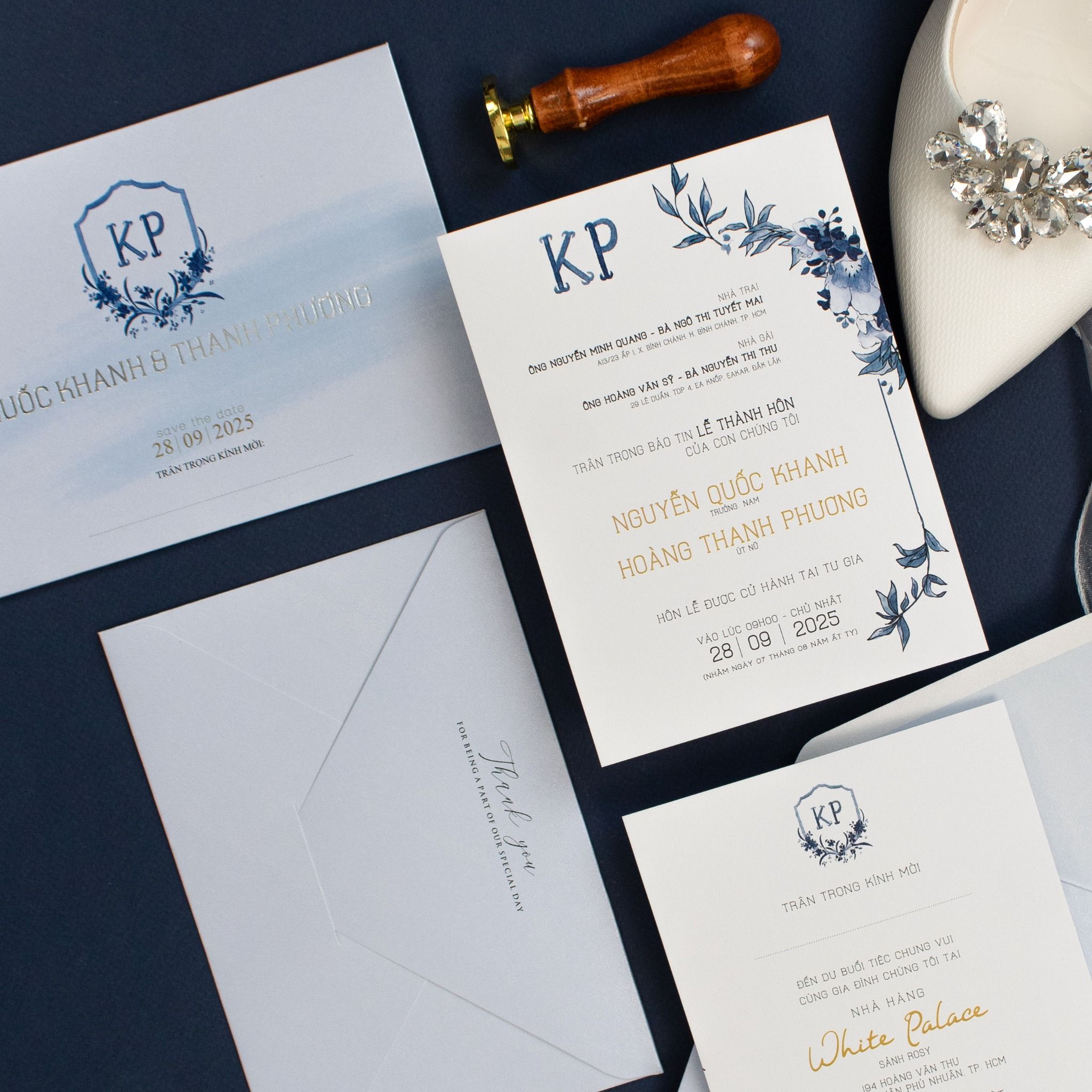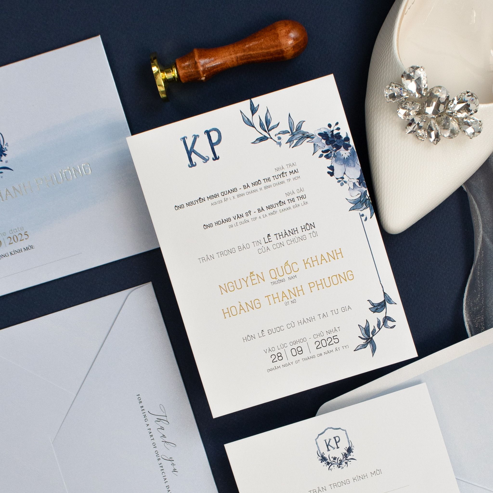 Cầm trên tay bộ thiệp Blue Sapphire, bạn sẽ cảm nhận rõ sự chỉn chu trong từng đường nét. Không cầu kỳ, không phô trương, bộ thiệp chọn ngôn ngữ thiết kế tối giản. Màu xanh trên nền giấy ánh kim, mang lại cảm giác mịn màng, sang trọng ngay từ cái chạm đầu tiên. Từng font chữ được lựa chọn kỹ lưỡng, kết hợp cùng dấu ấn Logo tên riêng biệt của đôi uyên ương, tạo nên một lời mời vừa trang trọng, vừa mang đậm dấu ấn cá nhân. Đây không chỉ là một tấm thiệp, mà là lời mở đầu đầy cảm xúc cho câu chuyện hạnh phúc của bạn.