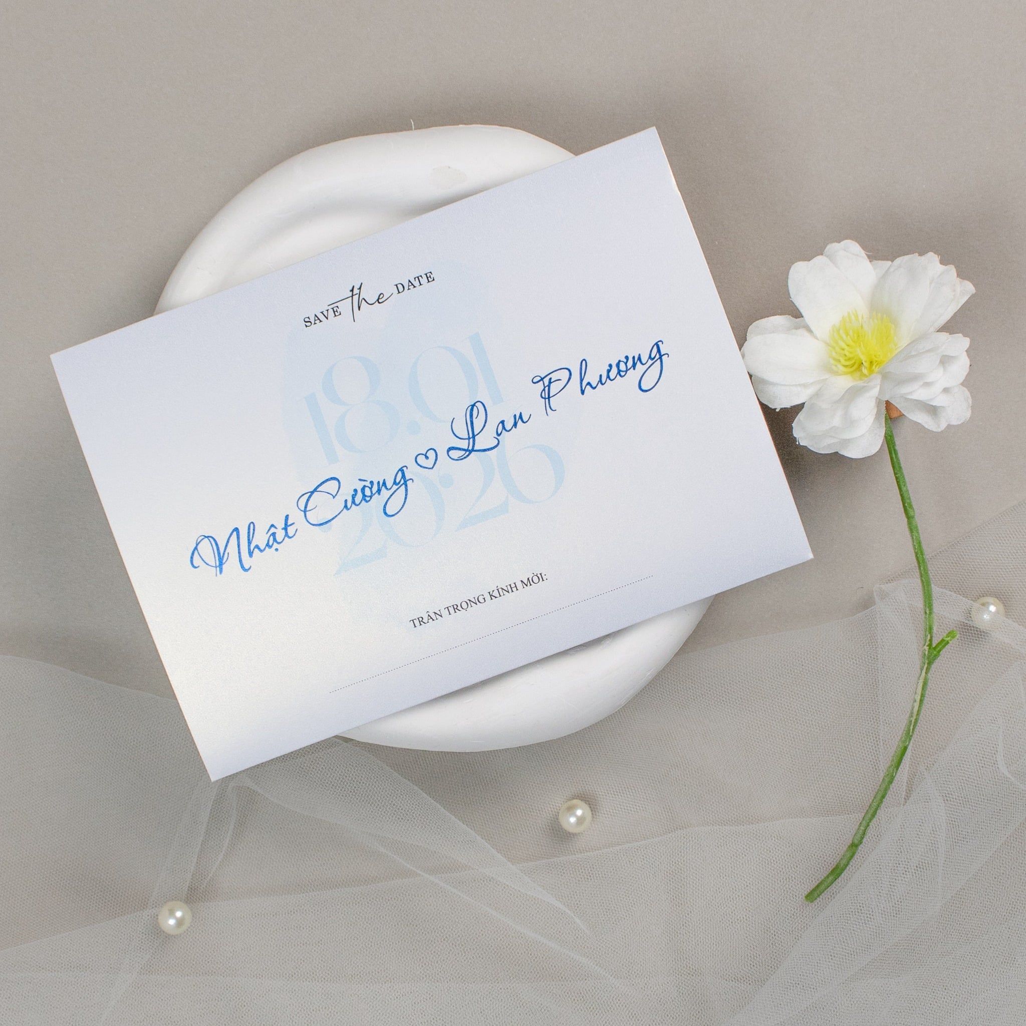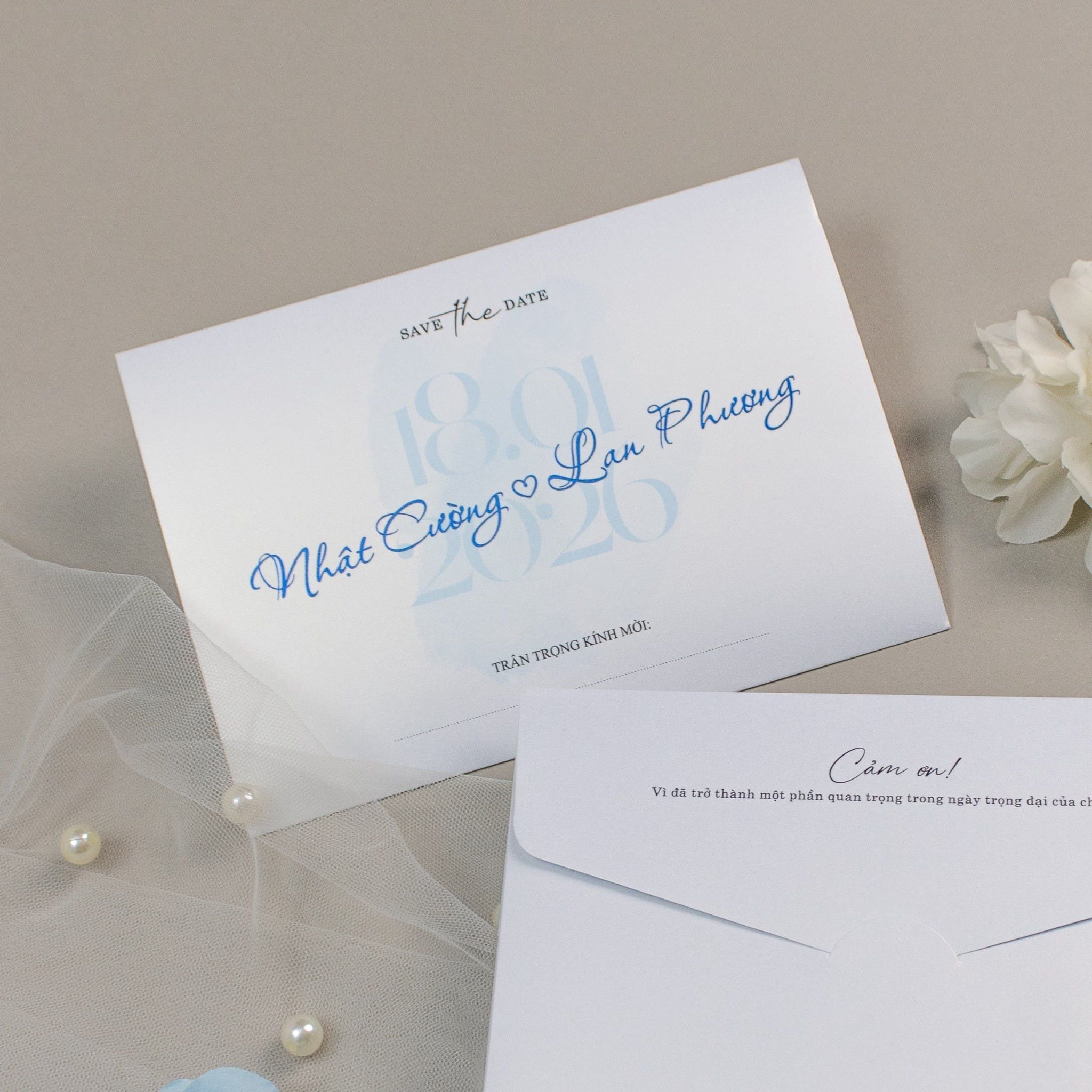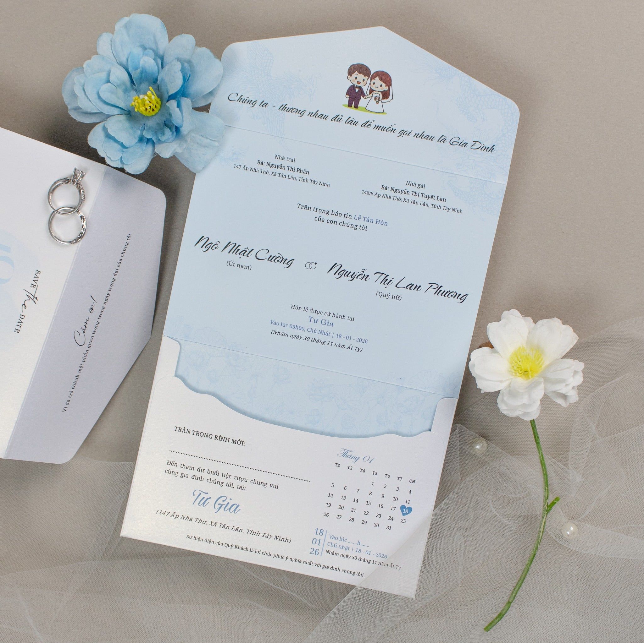 Thiệp cưới thiết kế Chibi tông xanh thanh khiết Một tấm thiệp không đơn thuần là lời thông báo, đó là chương mở đầu cho một tổ ấm mới. Với gam màu xanh pastel dịu mắt, mẫu thiết kế này mang đến cảm giác bình yên ngay từ cái chạm tay đầu tiên. Hình ảnh chibi khắc họa cặp đôi đầy hóm hỉnh, xóa tan vẻ khô khan của những khuôn mẫu truyền thống. Từng đường nét chữ bay bổng trên nền giấy ánh kim không chỉ thể hiện sự trân trọng đối với khách mời mà còn là cách bạn kể lại câu chuyện 'thương nhau đủ lâu' một cách tinh tế nhất. Mỗi chi tiết nhỏ đều được chăm chút để ngày trọng đại của bạn bắt đầu bằng sự ngọt ngào khó quên.
