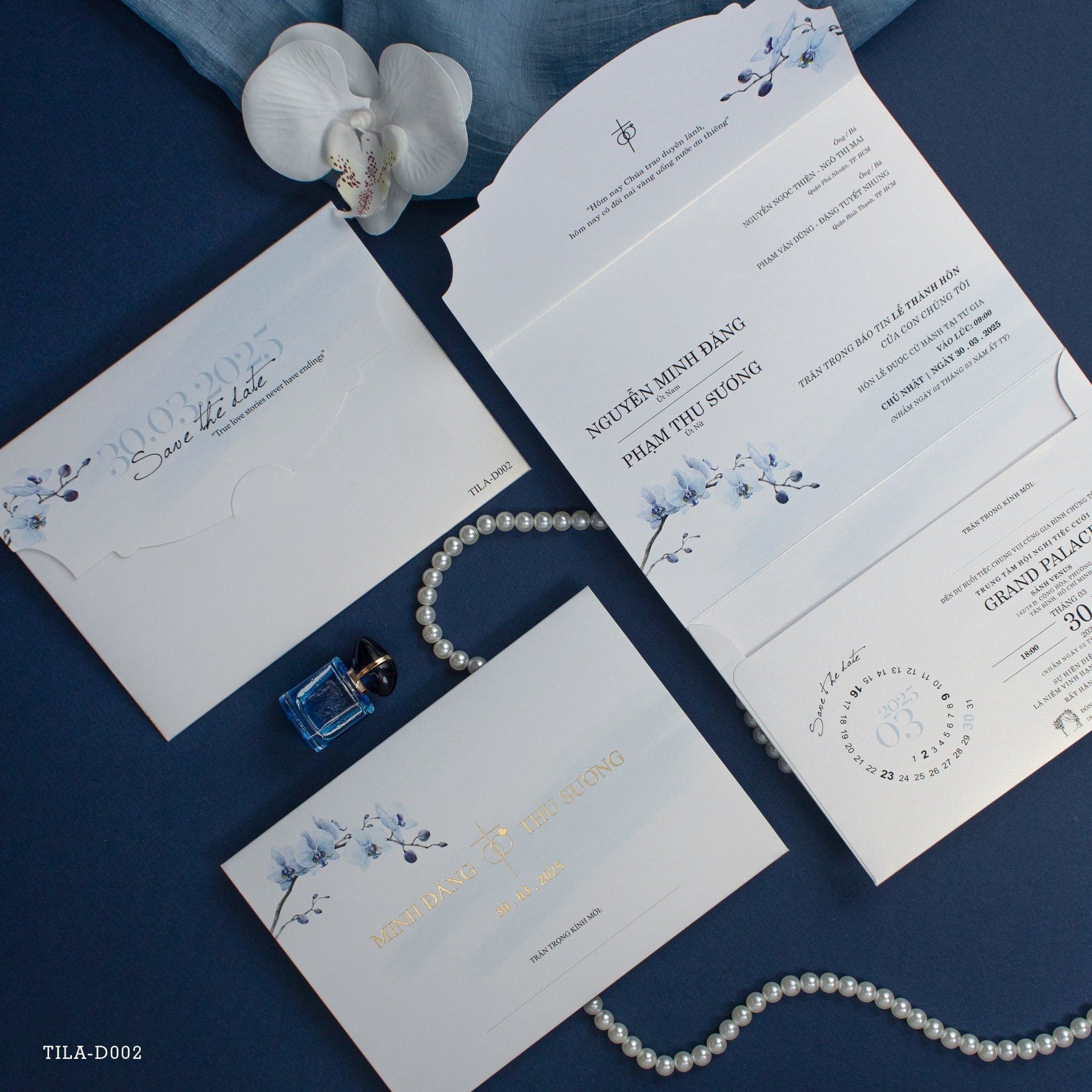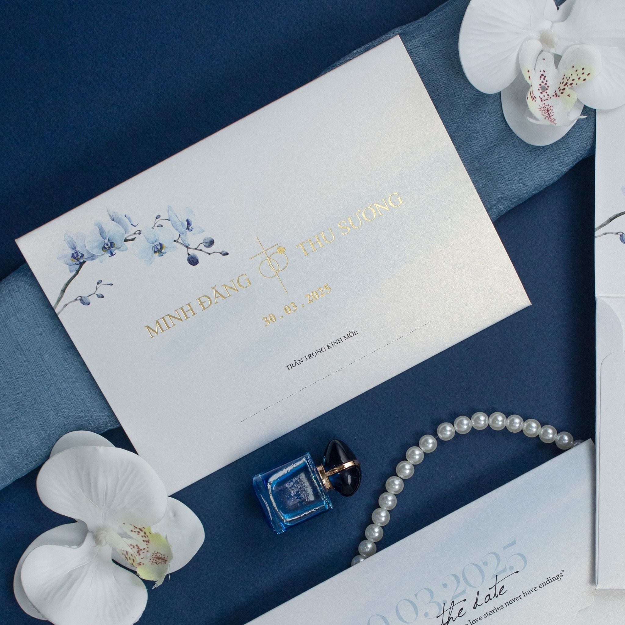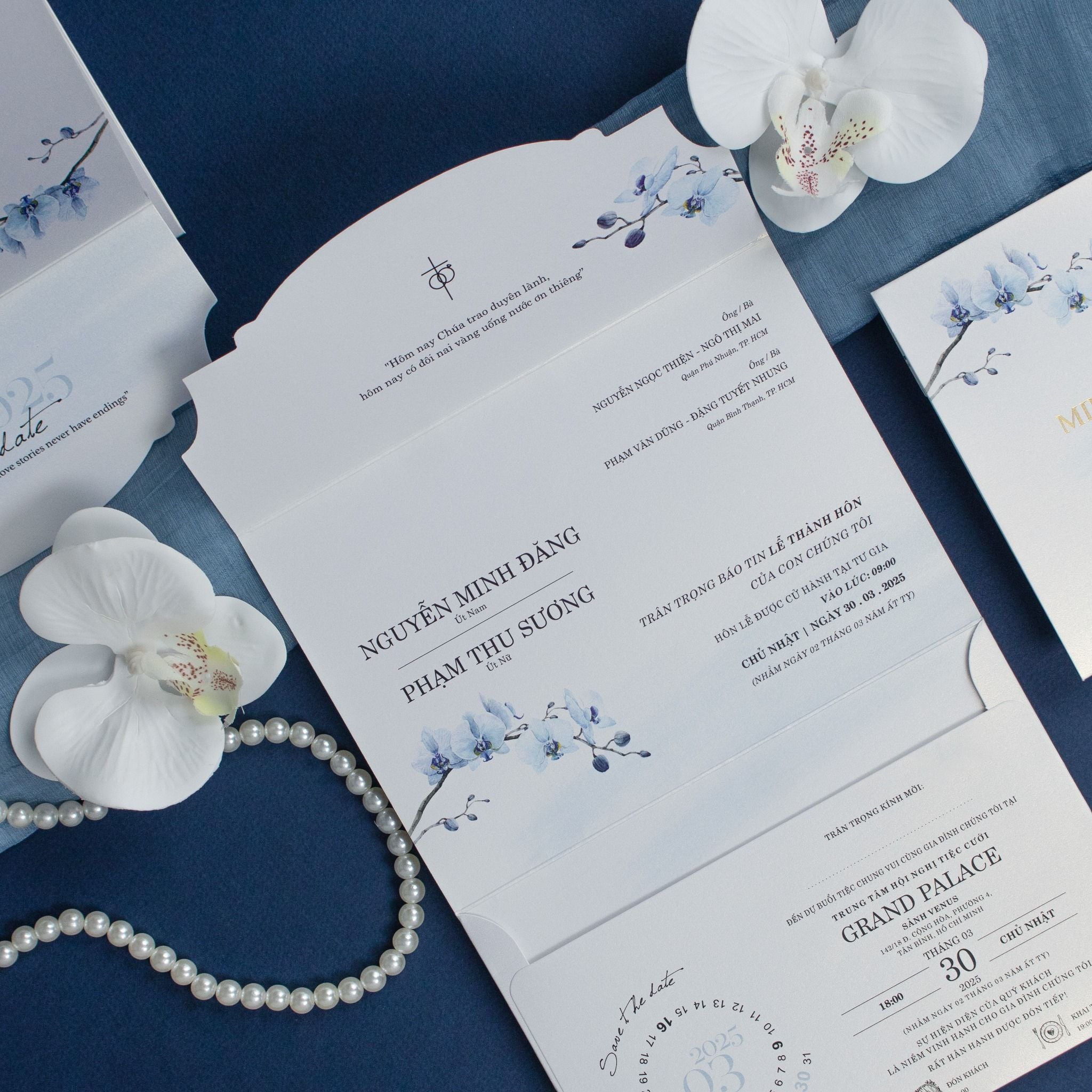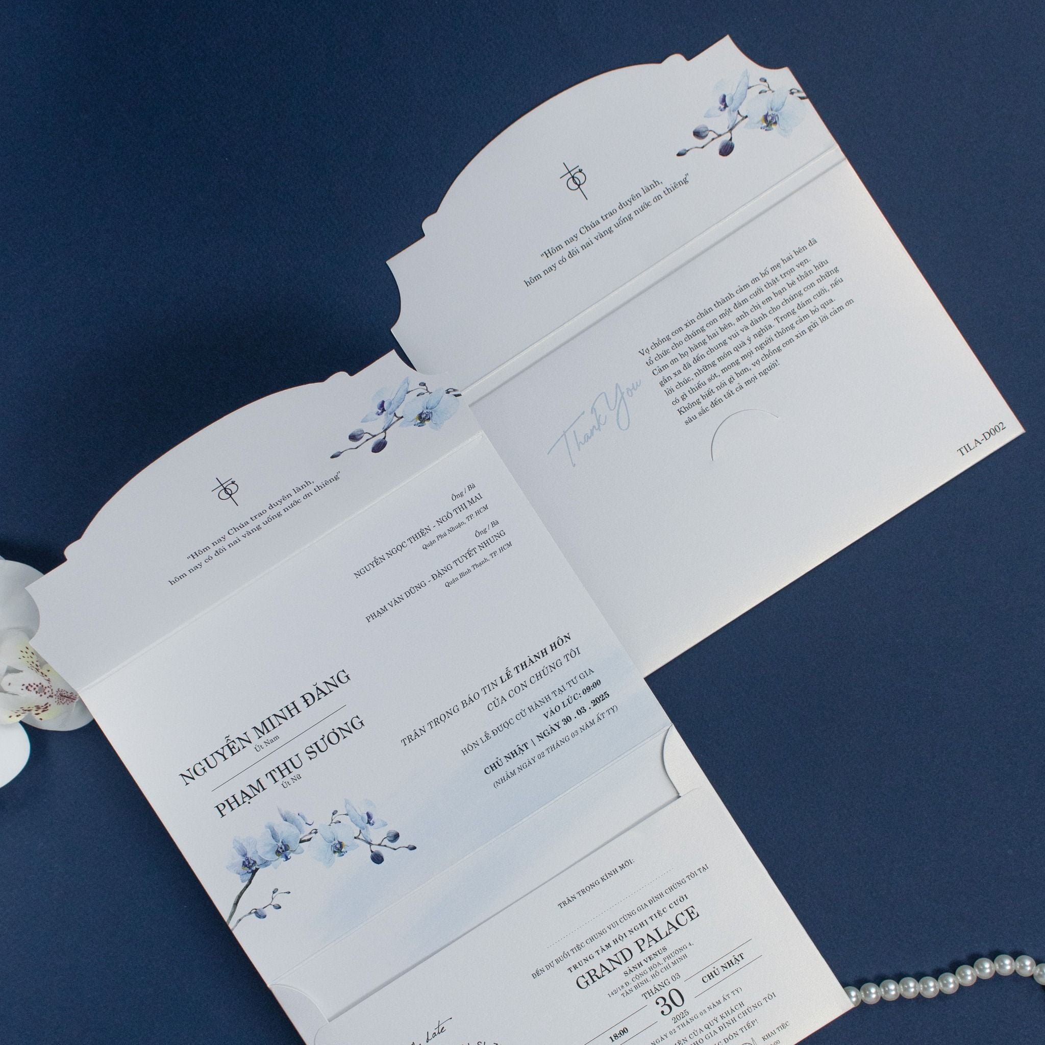 Sắc xanh thiên thanh của những nhành lan hồ điệp được điểm xuyết vô cùng tinh tế. Không cần quá cầu kỳ, chính sự tối giản trong đường nét và những khoảng trắng tinh khôi lại tạo nên một bản giao hưởng bình yên cho ngày trọng đại. Với những đôi uyên ương theo đạo, lời chúc "Chúa trao duyên lành" được đặt trang trọng ở vị trí trung tâm như một lời khẳng định về một tình yêu vĩnh cửu, có sự che chở của bề trên. Chất liệu giấy ánh kim trắng với độ dày vừa phải, sờ vào thấy rõ sự mướt mịn và đằm tay, giúp từng nét chữ in trở nên sắc sảo, xứng tầm với không gian tiệc cưới tại các sảnh đường sang trọng.