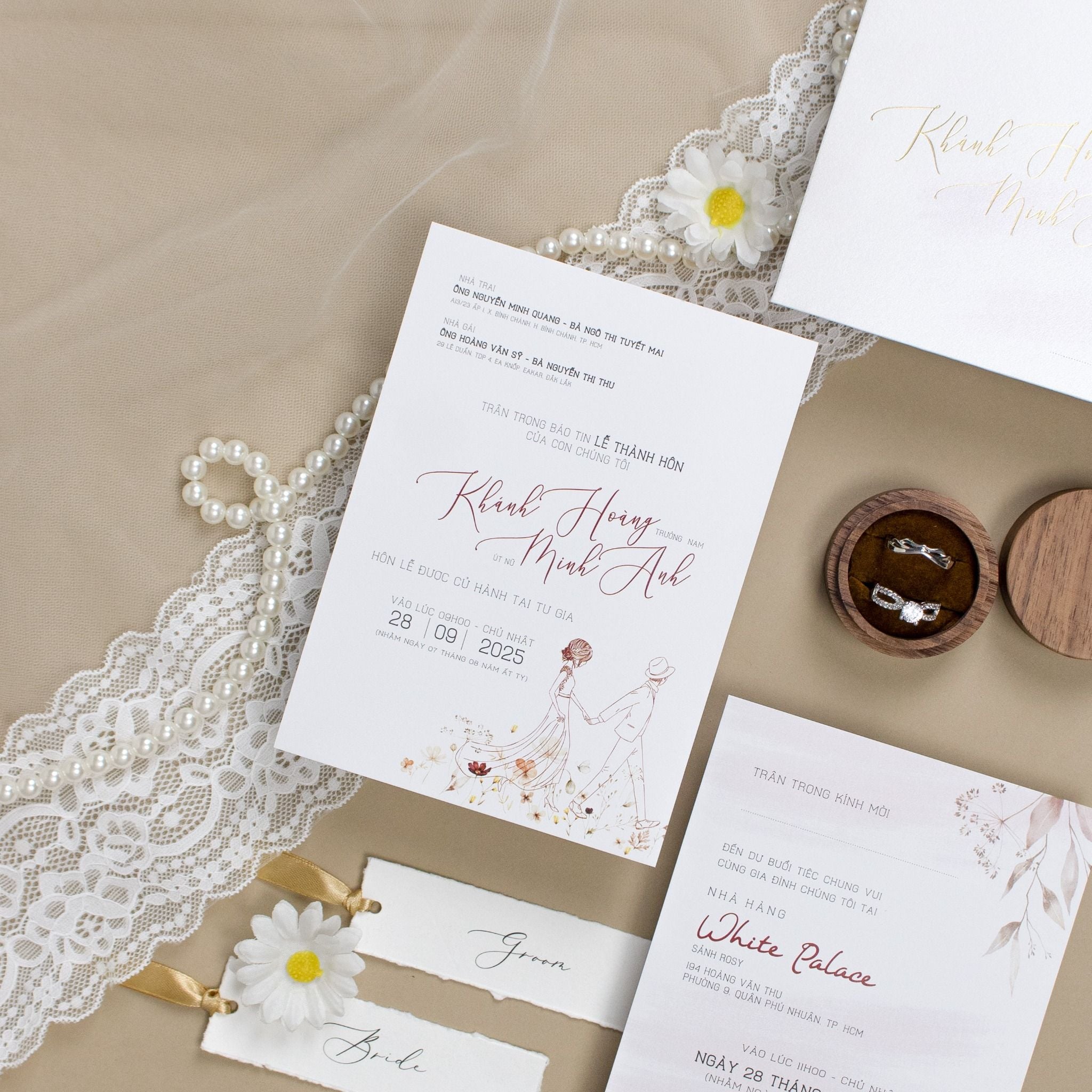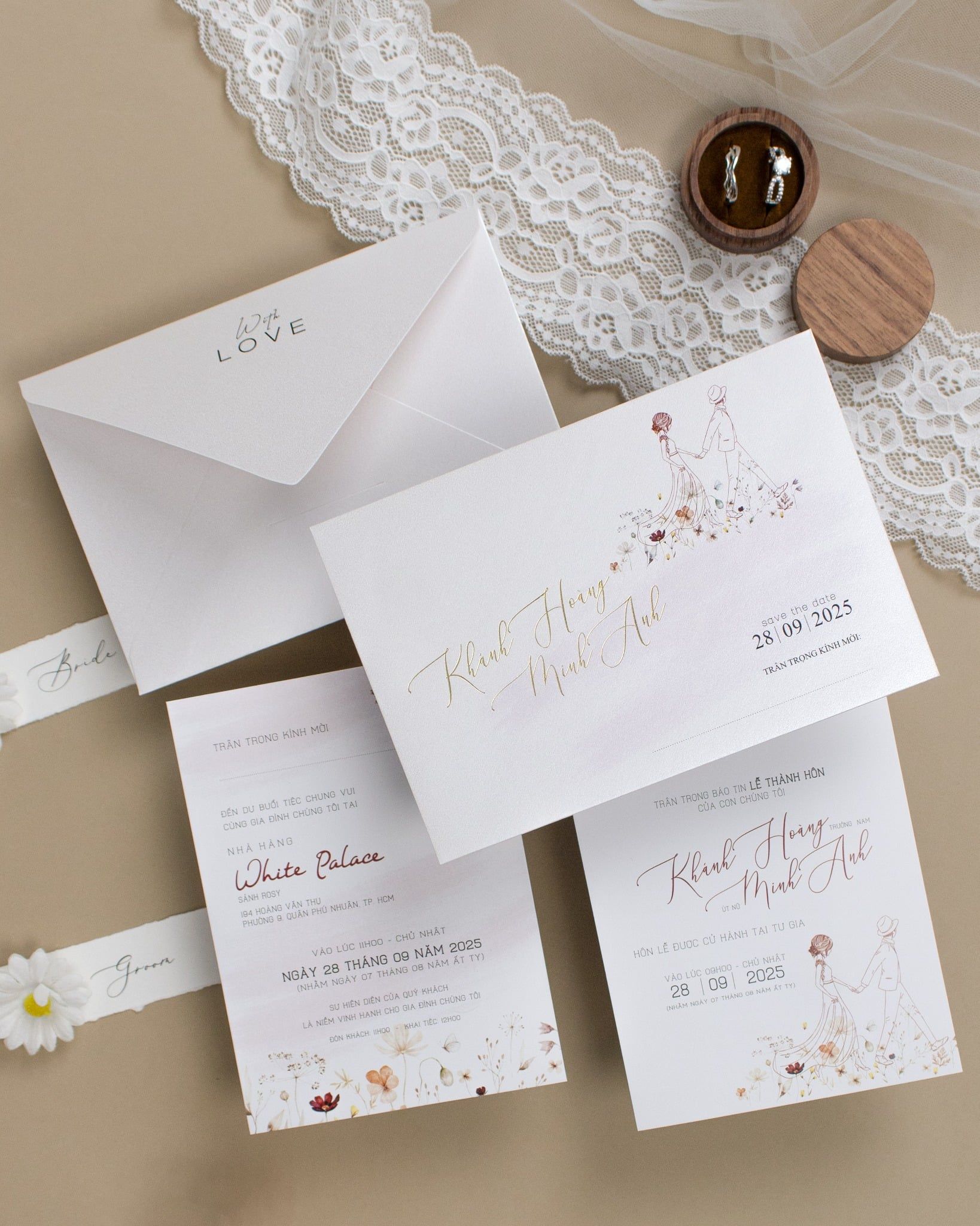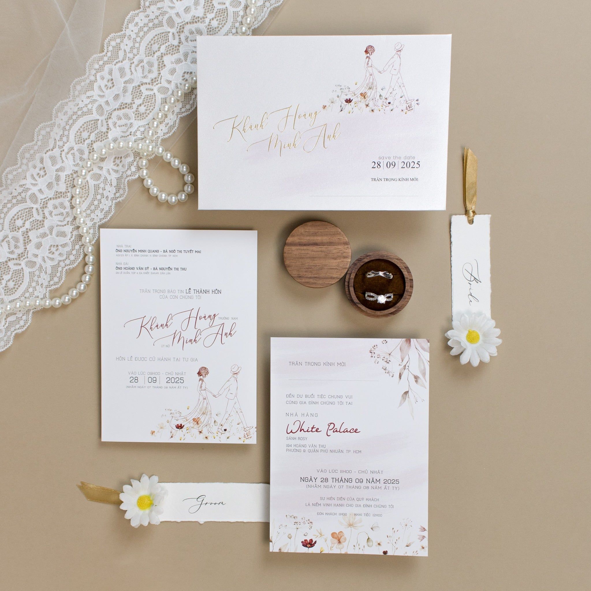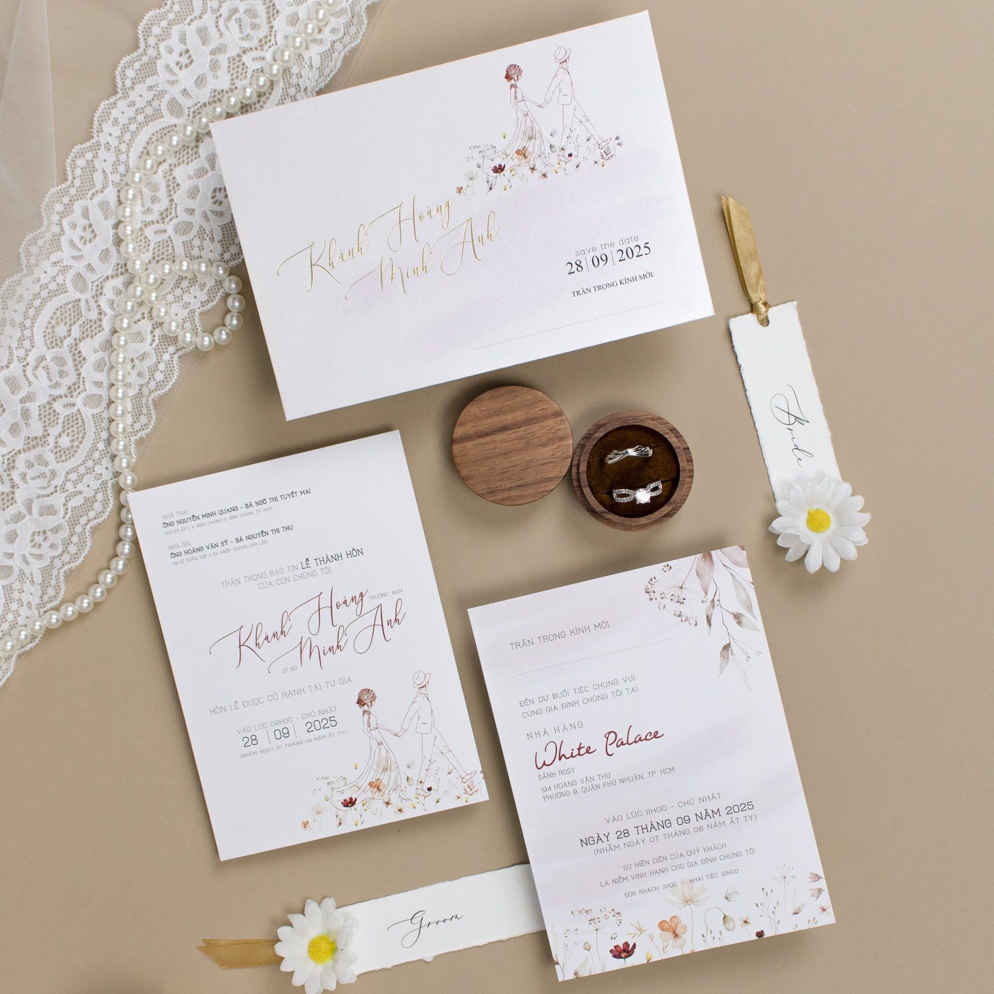 Mẫu thiệp là lời mở đầu đầy lãng mạn cho hành trình chung đôi, nổi bật với hình ảnh cặp đôi dạo bước bên nhau được khắc họa qua những nét vẽ minh họa chibi duyên dáng. Sắc hồng pastel dịu dàng từ những vệt loang màu nước hòa quyện cùng họa tiết hoa cỏ nhỏ xinh, tạo nên một không gian nghệ thuật tinh tế và tràn đầy cảm xúc. Bộ thiệp là bức tranh khởi đầu hạnh phúc, thay bạn gửi trao lời hẹn ước chân thành và khẳng định gu thẩm mỹ đẳng cấp.Khi bạn đặt trọn niềm tin vào Thiệp cưới KK để chuẩn bị cho ngày khởi đầu hạnh phúc, chúng tôi hiểu rằng sự riêng tư là điều quý giá nhất.