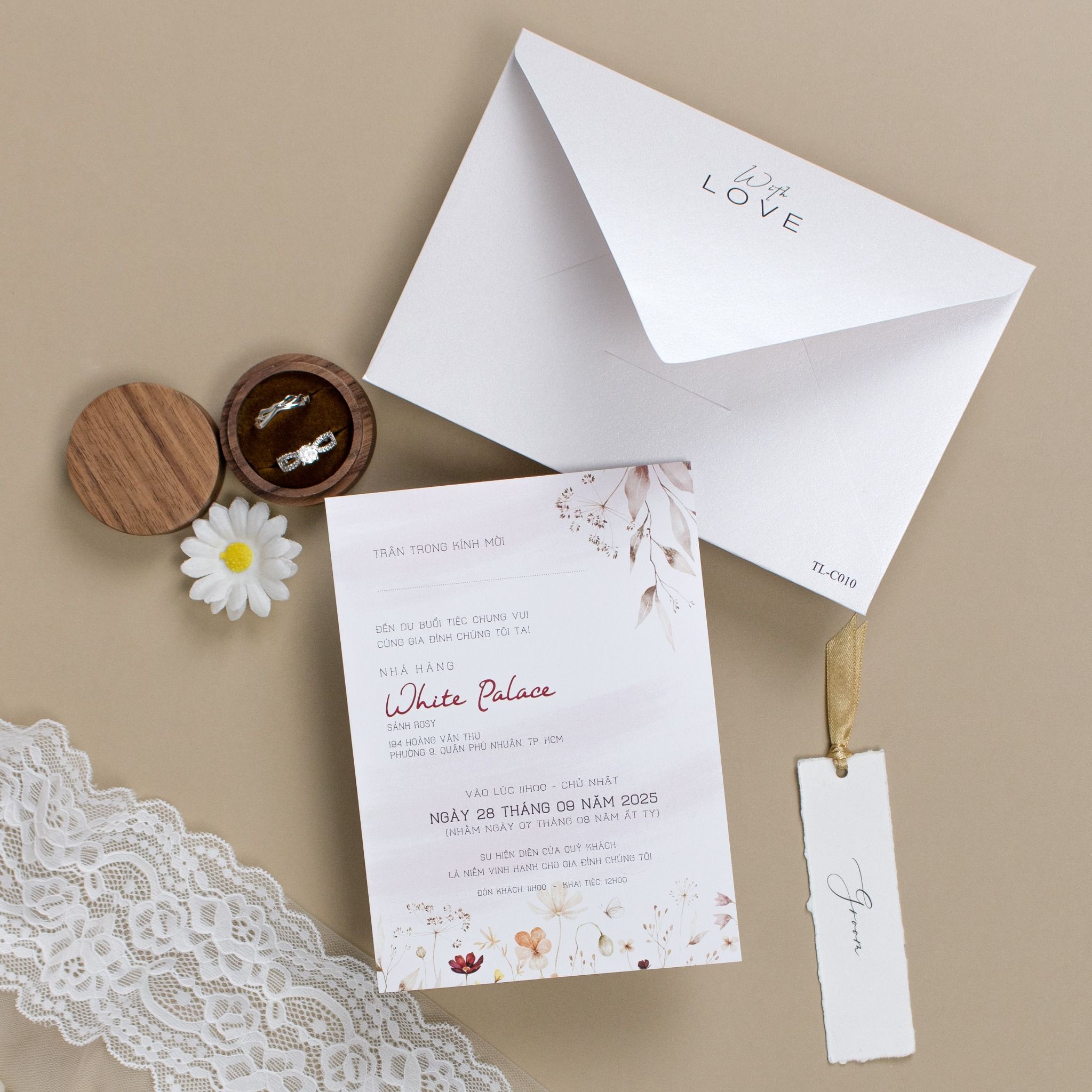 Tờ thiệp mời: 11,8cm x 16cm, in 1 mặt - chất liệu giấy ford 200gsm