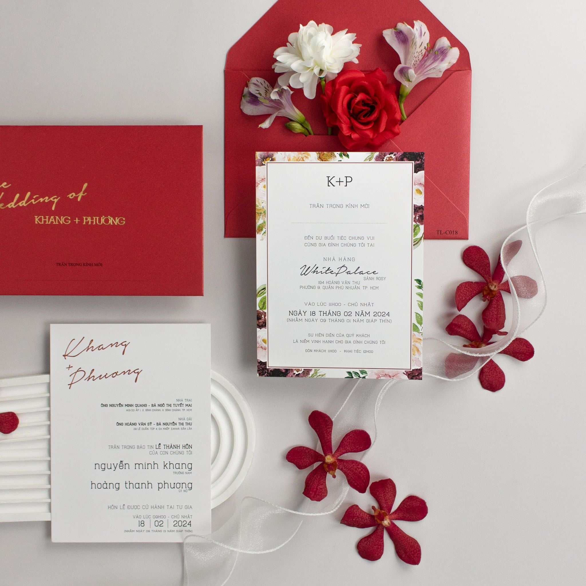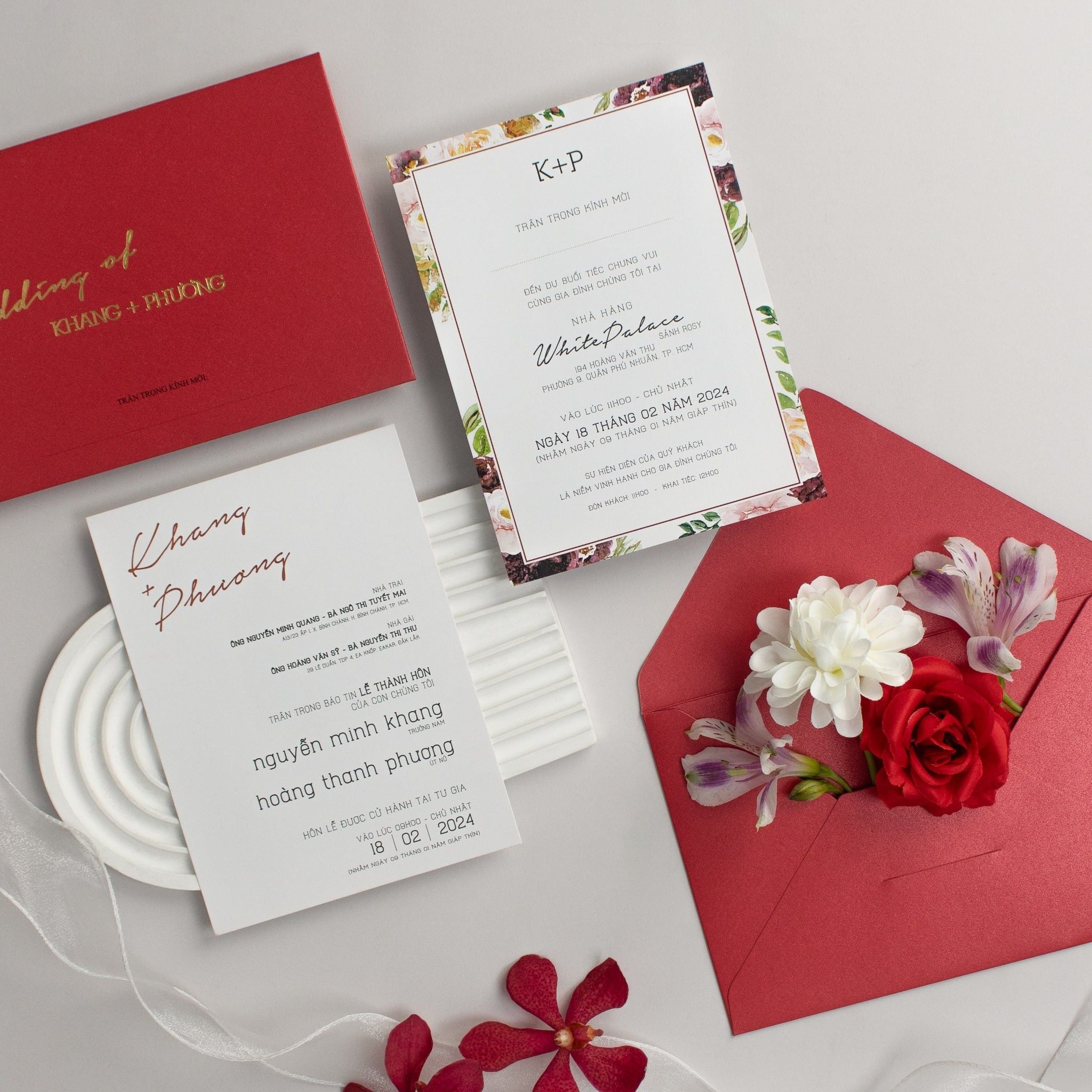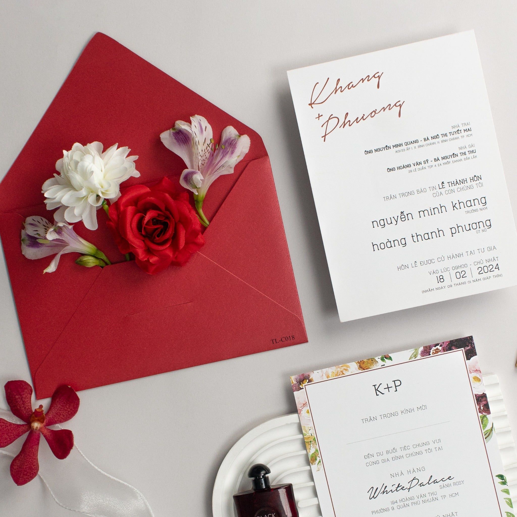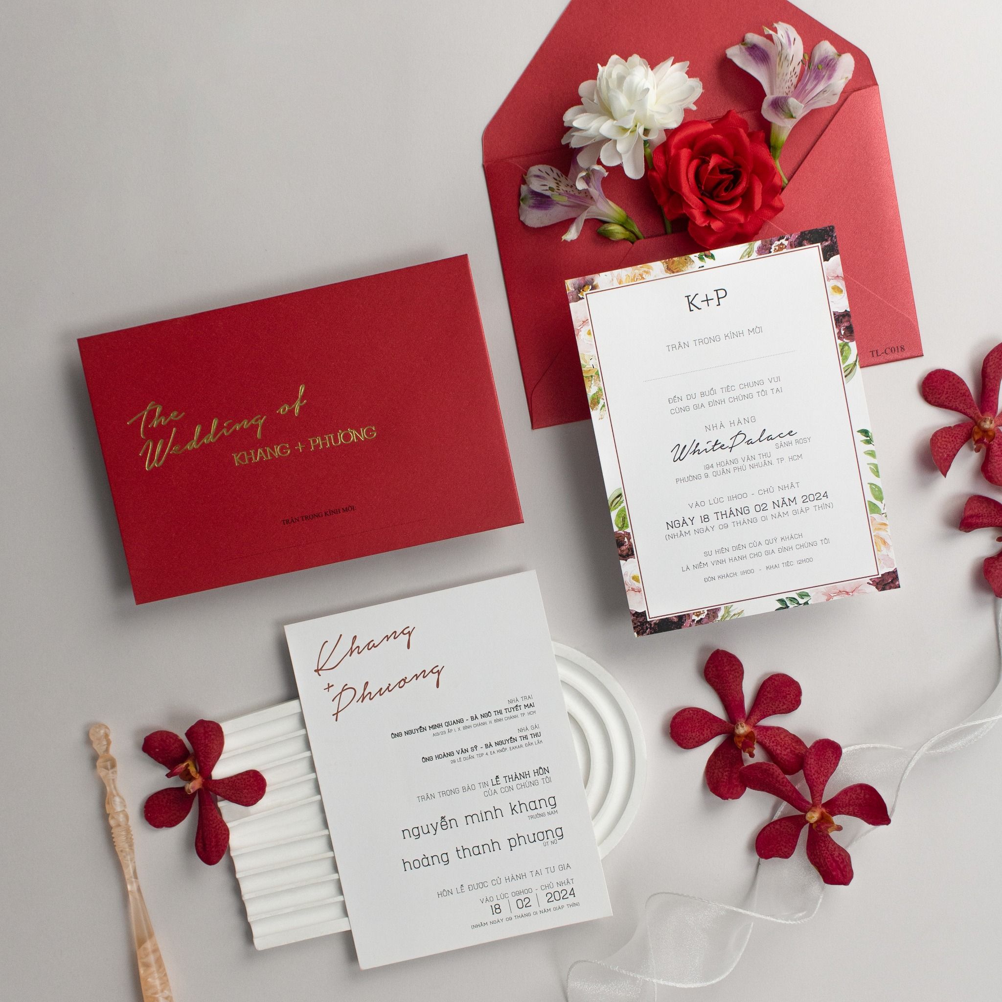 Chẳng cần phô trương, sắc đỏ trầm ấm của bộ thiệp này vẫn đủ sức làm xao xuyến bất kỳ ai ngay từ cái chạm đầu tiên. Từng đường nét ép kim vàng tinh xảo trên nền giấy ánh kim đỏ dày dặn không chỉ thể hiện gu thẩm mỹ đẳng cấp mà còn là lời trân trọng gửi đến những vị khách quý. Chạm tay vào bề mặt giấy, bạn sẽ cảm nhận được độ đằm, sự chắc chắn và cái tâm của người thợ thủ công gửi gắm trong đó. Không chỉ là một tấm thiệp, đây là lời thông báo trịnh trọng, một lời hứa hẹn về một khởi đầu viên mãn. Điểm xuyết xung quanh là những cánh hoa phong lan và hồng leo mềm mại, giúp cân bằng lại sự mạnh mẽ của sắc đỏ, mang đến một tổng thể hài hòa và đầy cảm xúc cho ngày trọng đại của bạn.