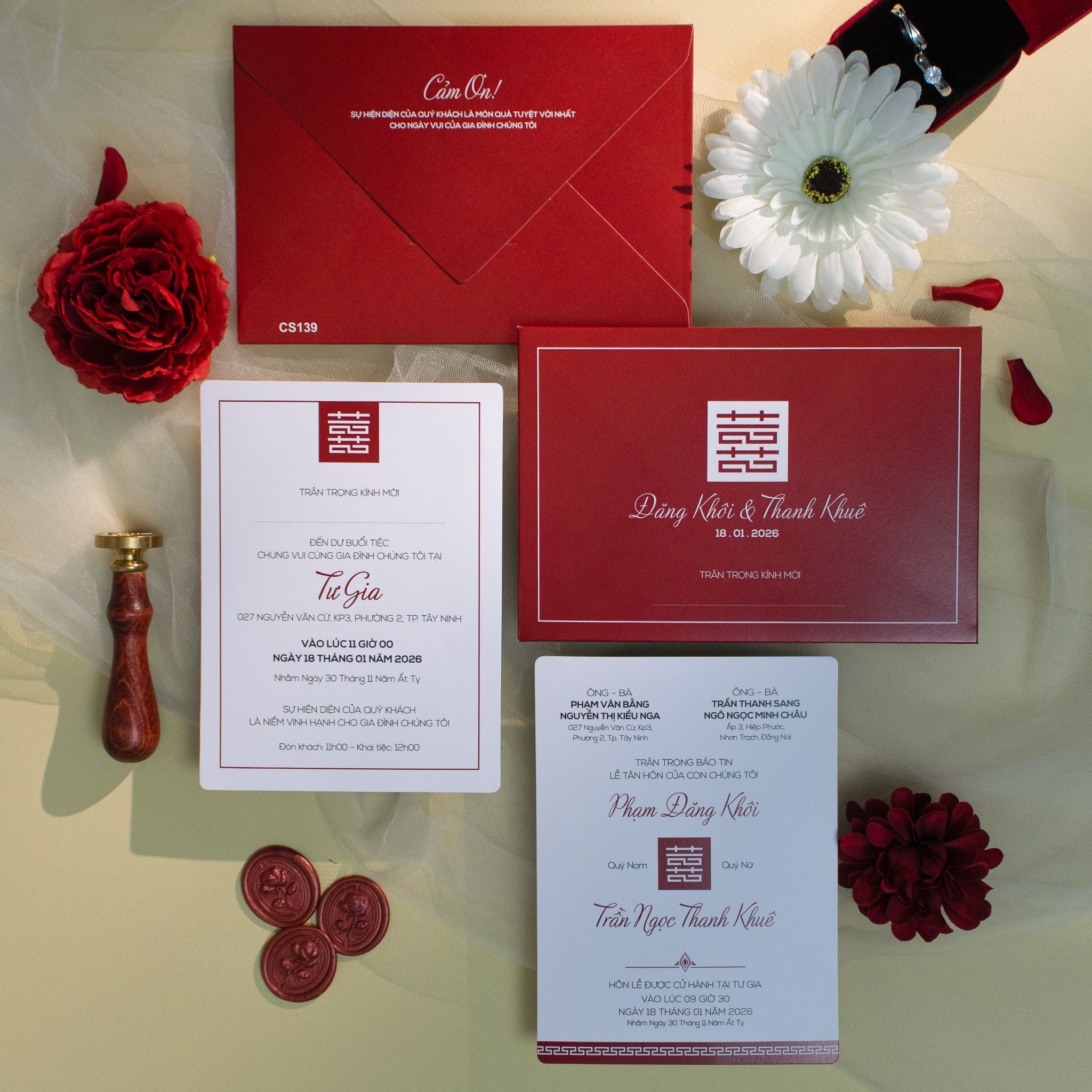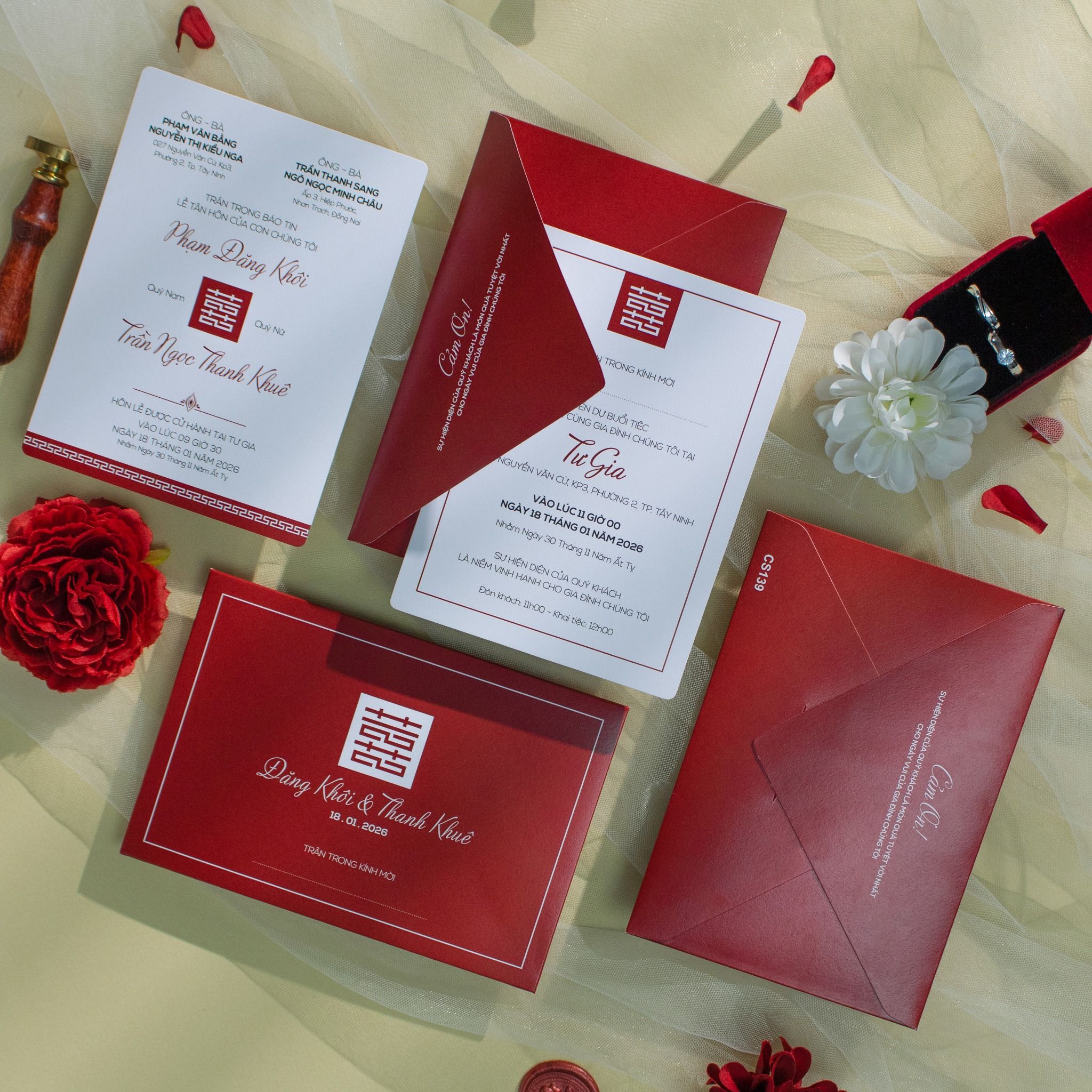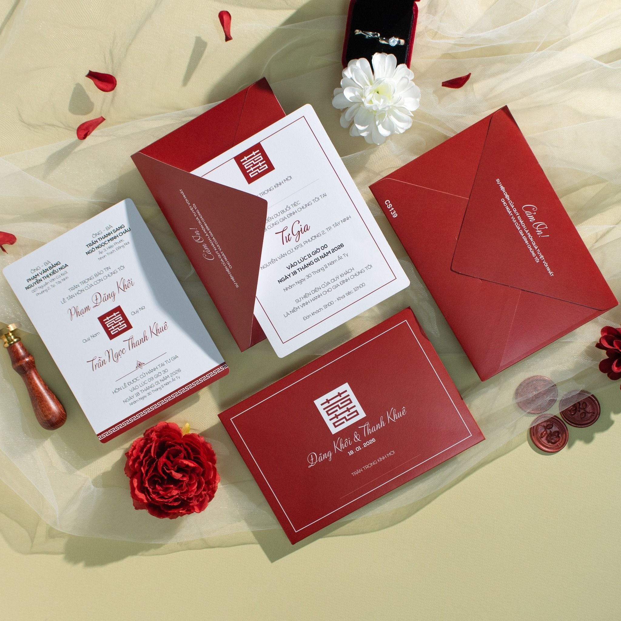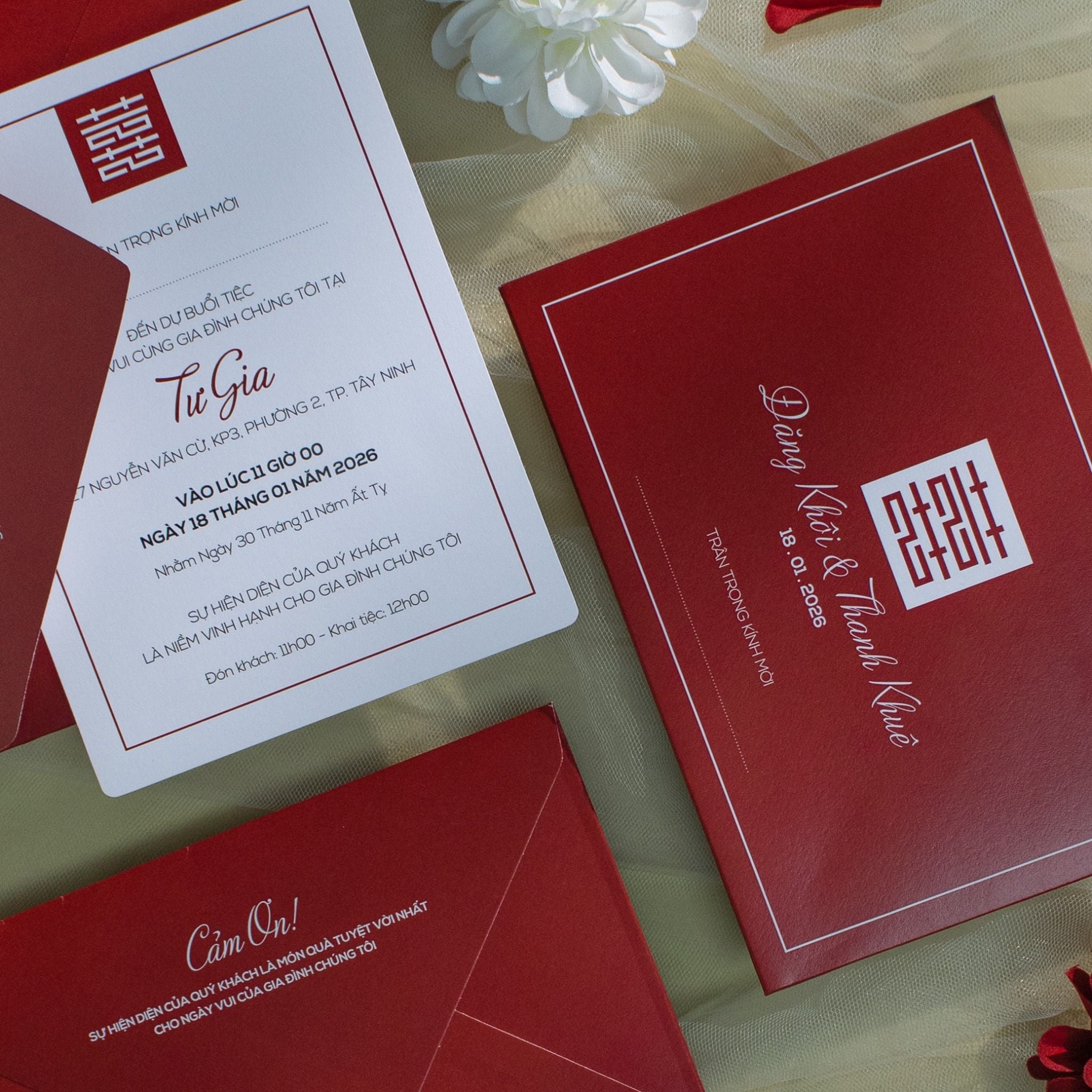 Là sự giao thoa tinh tế giữa nghệ thuật truyền thống và phong cách hiện đại. Nền đỏ trầm sang trọng tượng trưng cho hỷ sự và phúc lộc, được kết hợp cùng biểu tượng song hỷ và đường viền tối giản, tạo nên một tổng thể vừa trang trọng vừa thời thượng.Khi bạn đặt trọn niềm tin vào Thiệp cưới KK để chuẩn bị cho ngày khởi đầu hạnh phúc, chúng tôi hiểu rằng sự riêng tư là điều quý giá nhất.