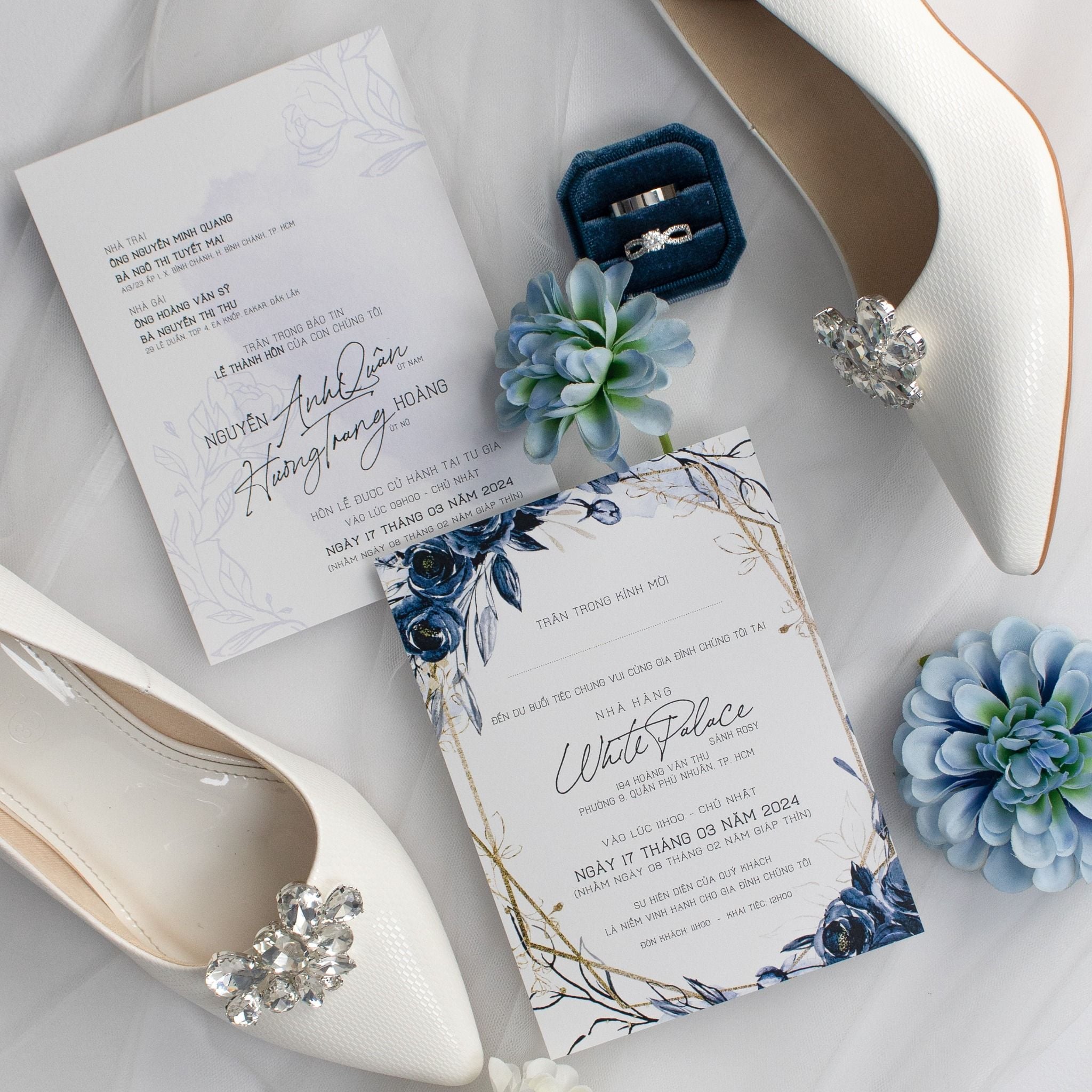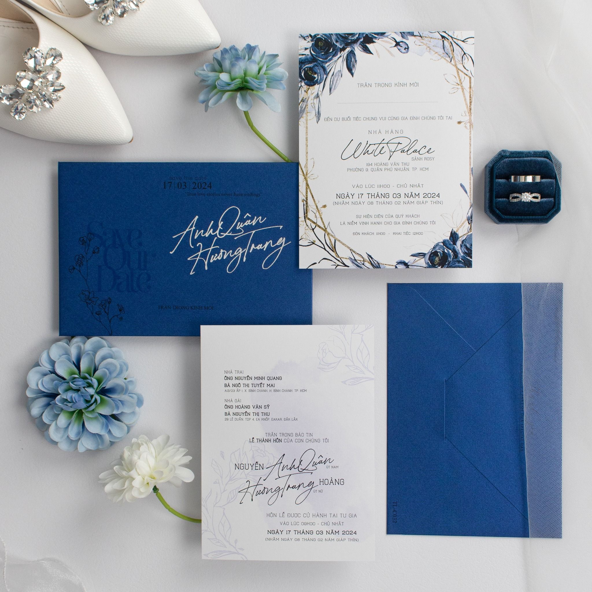 Thiệp Cưới Đóa Hồng Hải Lam Ép Kim Bạc Cao Cấp Trên Nền Navy