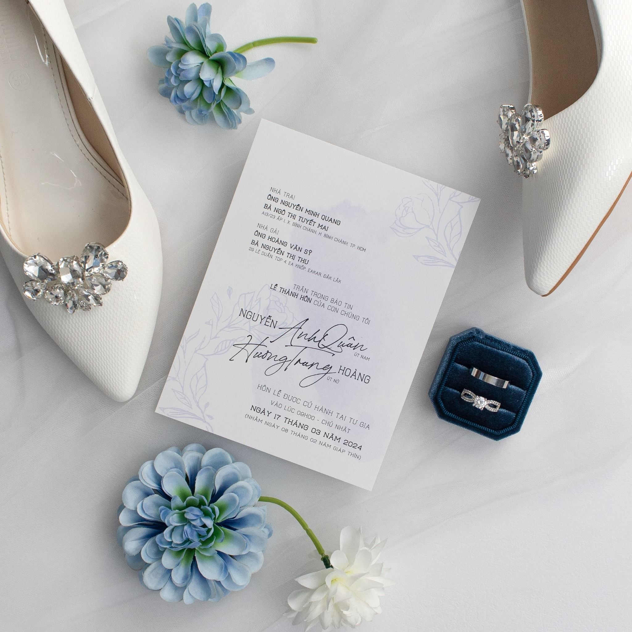 Được ép nhũ ánh BẠC tên Dâu - Rể nổi bật ngoài bìa thiệp