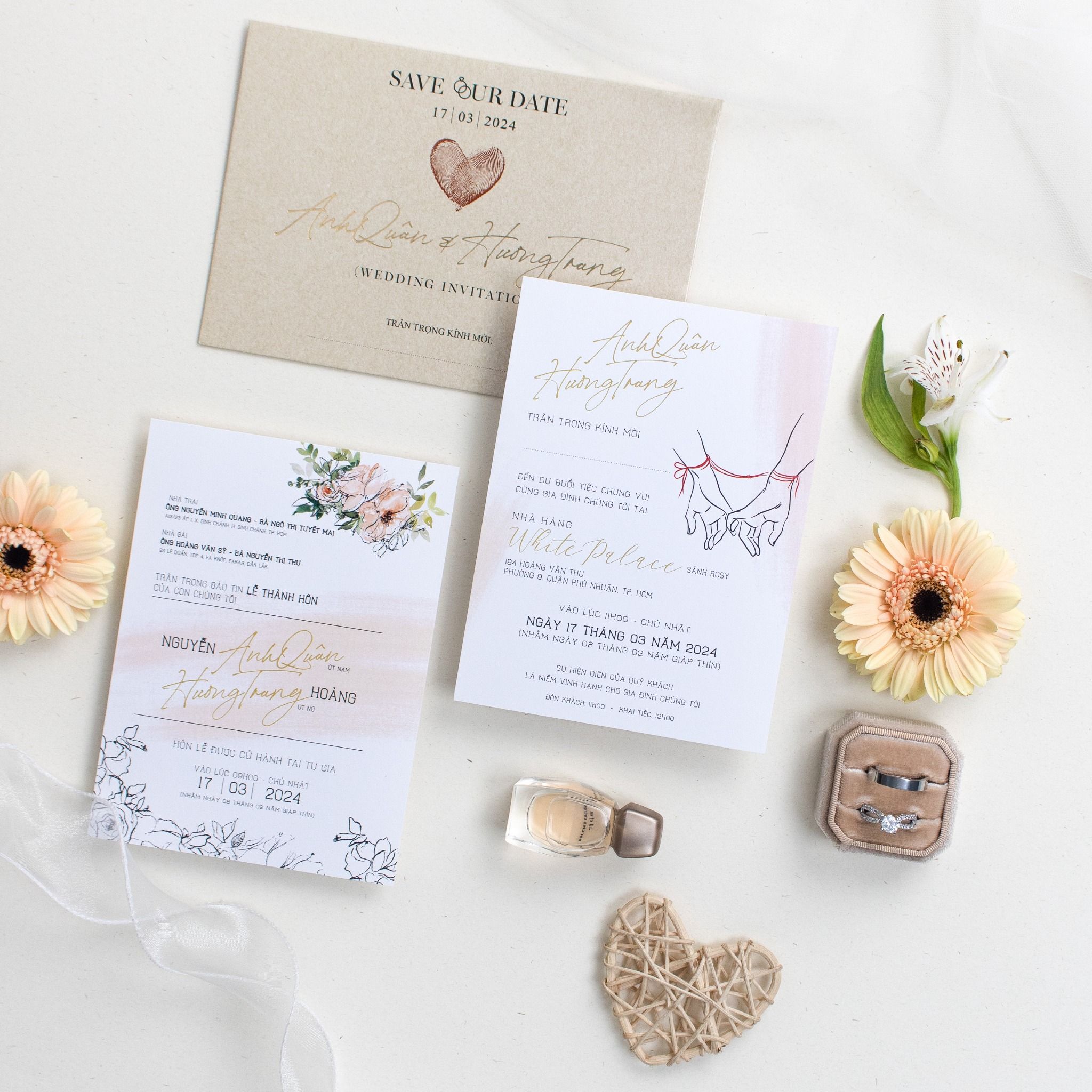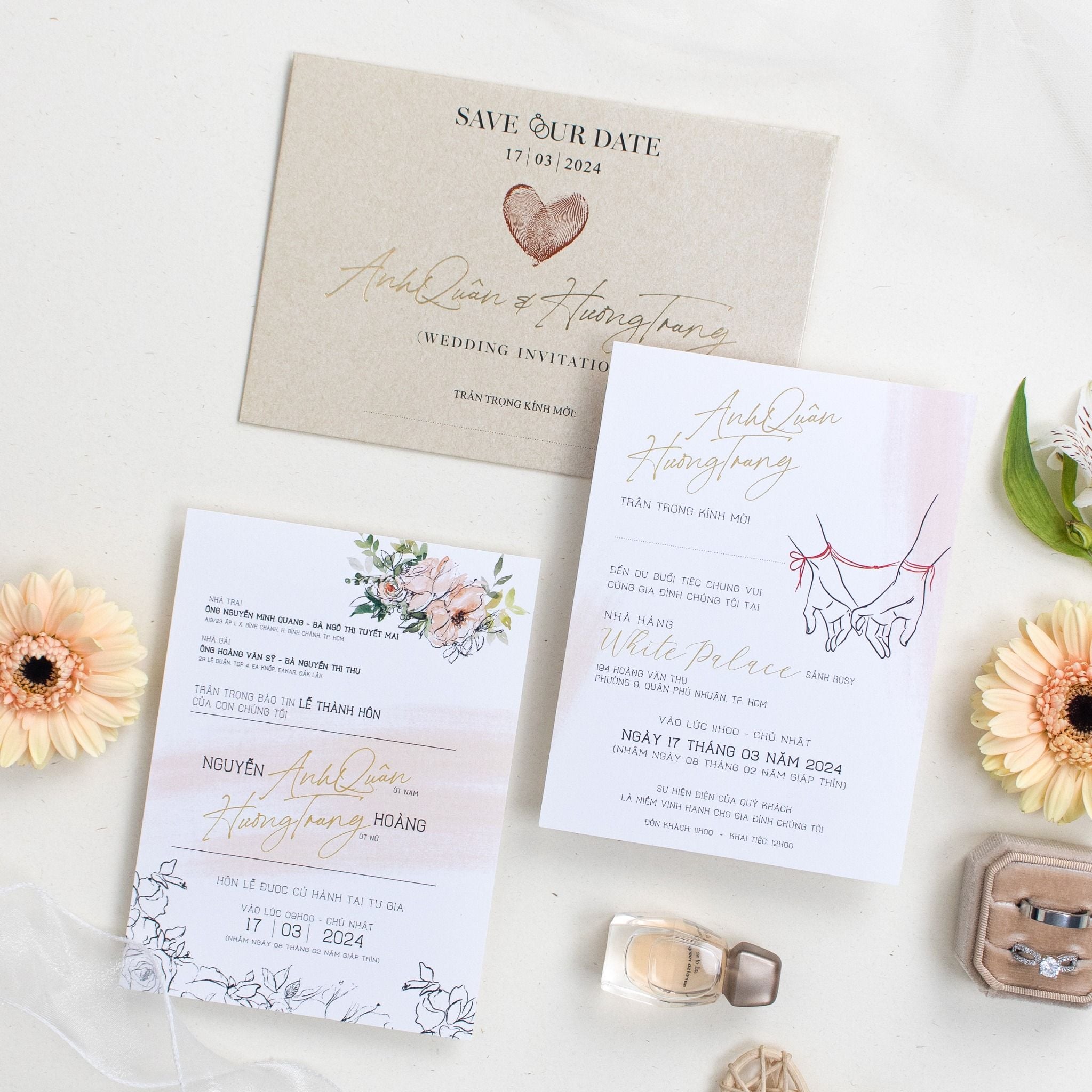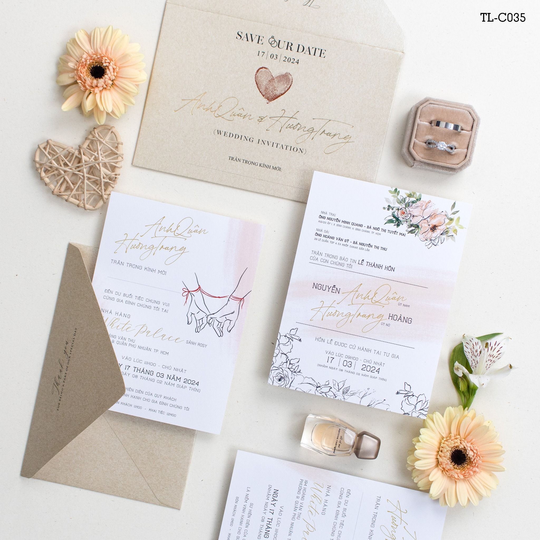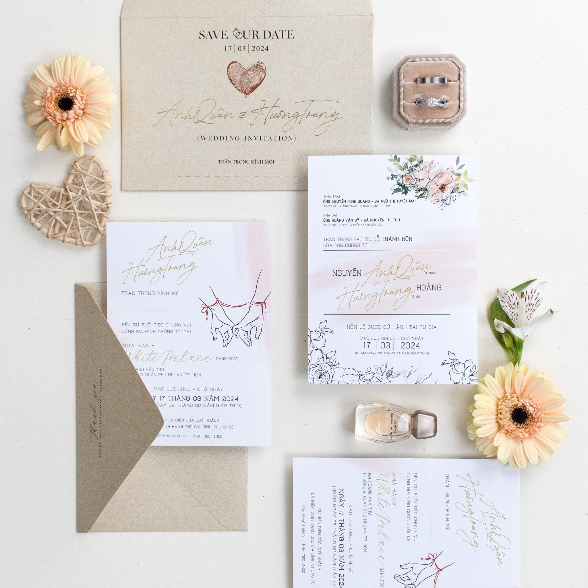 Nghệ thuật kể chuyện tình qua phong cách Minimalist Không cần cầu kỳ hay phô trương, bộ thiệp "Duyên Định" chọn cách chạm vào cảm xúc bằng sự chân phương nhất. Điểm nhấn là hình ảnh hai bàn tay đan lấy sợi chỉ đỏ biểu tượng của mối lương duyên trời định, được đặt tinh tế trên nền giấy trắng tinh khôi xen lẫn sắc kraft trầm ấm. Từng chi tiết từ dấu vân tay ghép thành hình trái tim đến nét chữ bay bổng đều được chăm chút tỉ mỉ, tạo nên một lời mời vừa hiện đại, vừa đậm chất tự sự. Đây không chỉ là một tấm thiệp, mà là mảnh ký ức đầu tiên cho hành trình trăm năm của riêng bạn..