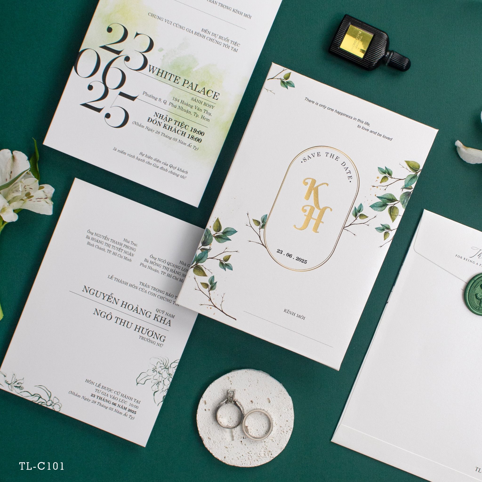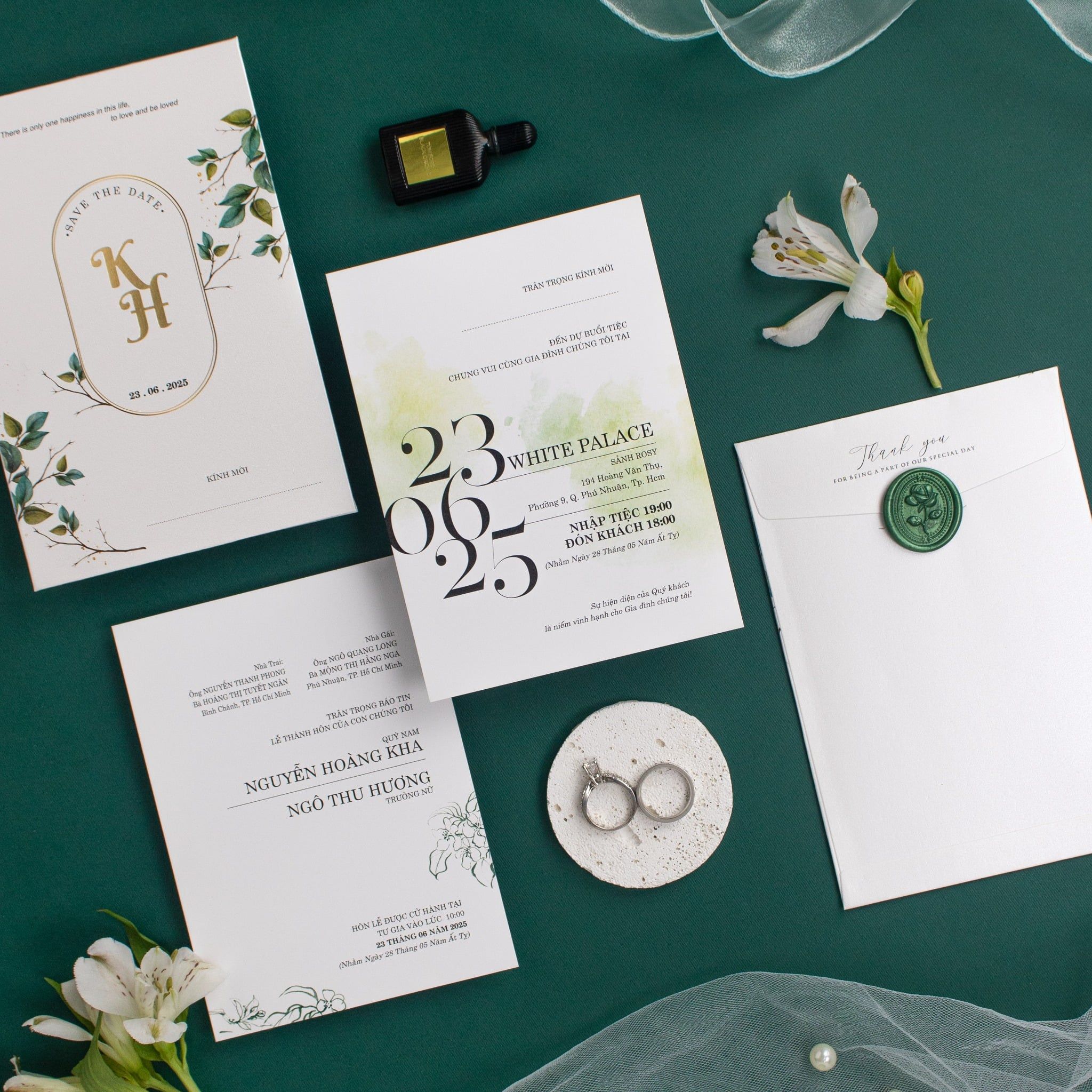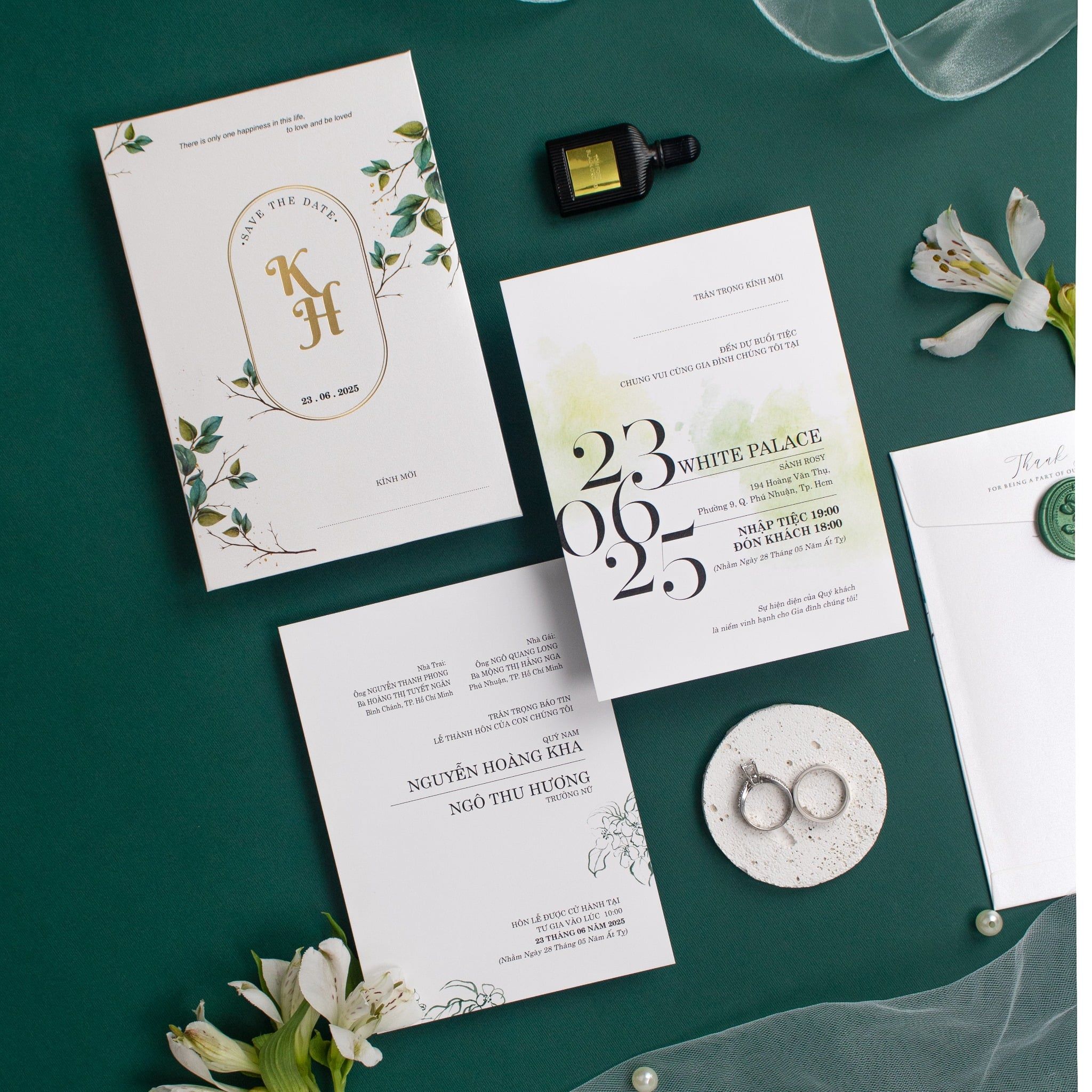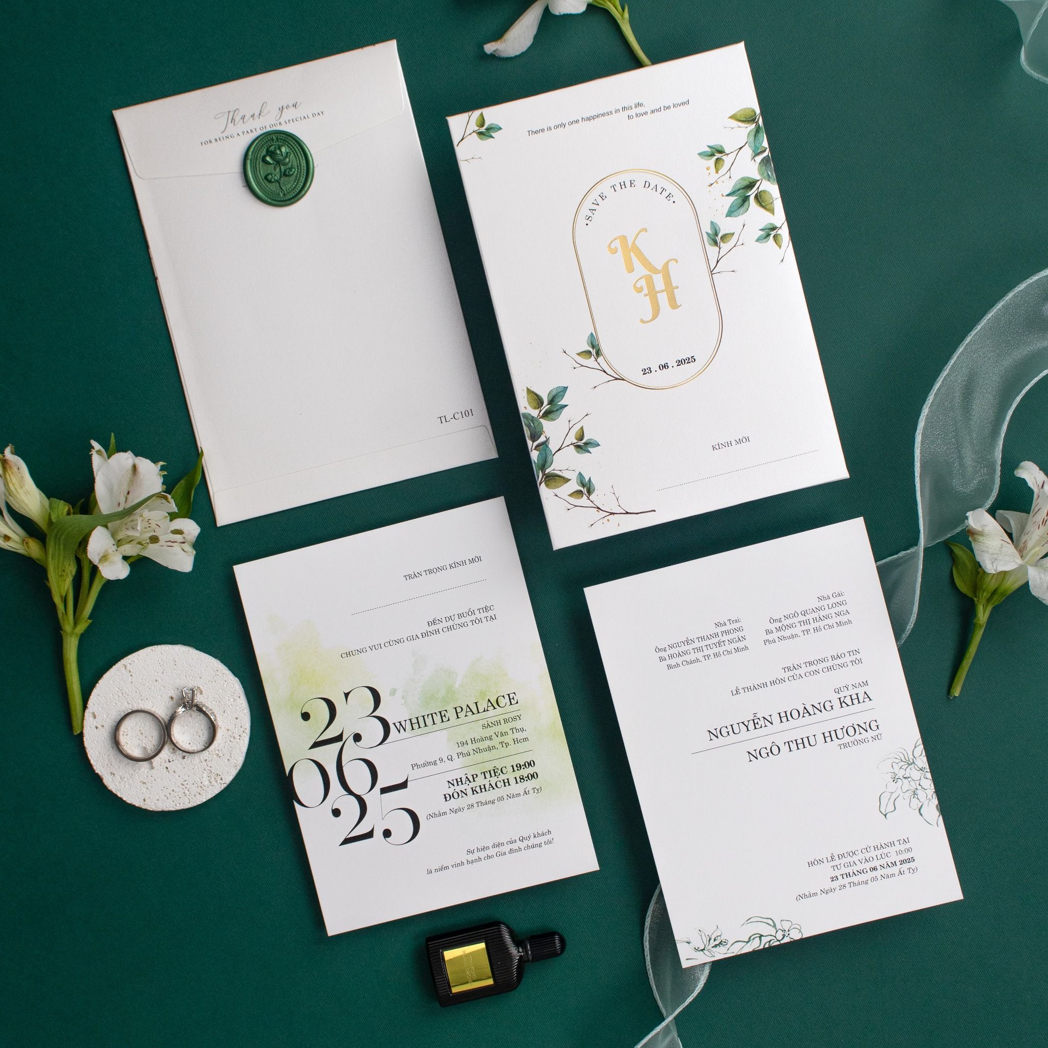 Cầm trên tay bộ thiệp Emerald Garden, cảm giác đầu tiên là sự dịu mát từ tông xanh lục bảo kết hợp cùng sắc trắng giấy mỹ thuật cao cấp. Không cầu kỳ phô trương, bộ thiệp kể câu chuyện tình yêu bằng những nét vẽ lá cỏ mềm mại và con dấu sáp thủ công đầy hoài niệm. Từng chi tiết ép kim vàng tinh tế trên nền chữ tối giản không chỉ là thông tin, mà còn là lời khẳng định về một gu thẩm mỹ đẳng cấp. Đây là sự lựa chọn hoàn hảo cho những cặp đôi yêu thích vẻ đẹp tự nhiên nhưng vẫn muốn giữ trọn nét trang trọng, lịch thiệp trong ngày trọng đại của mình.Khi bạn đặt trọn niềm tin vào Thiệp cưới KK để chuẩn bị cho ngày khởi đầu hạnh phúc, chúng tôi hiểu rằng sự riêng tư là điều quý giá nhất.