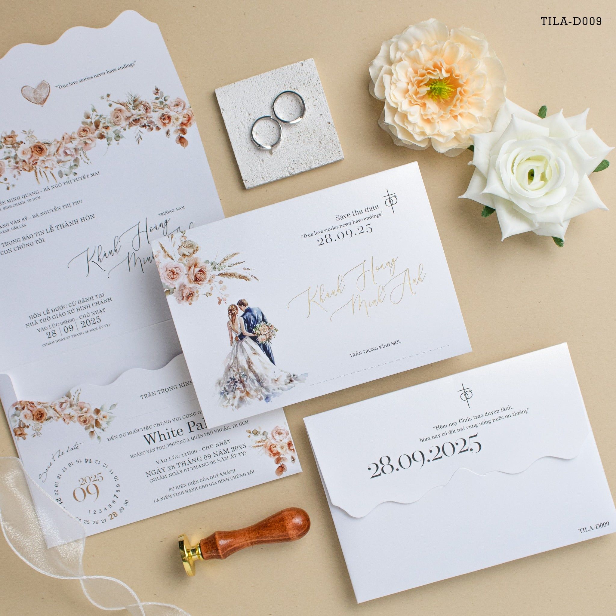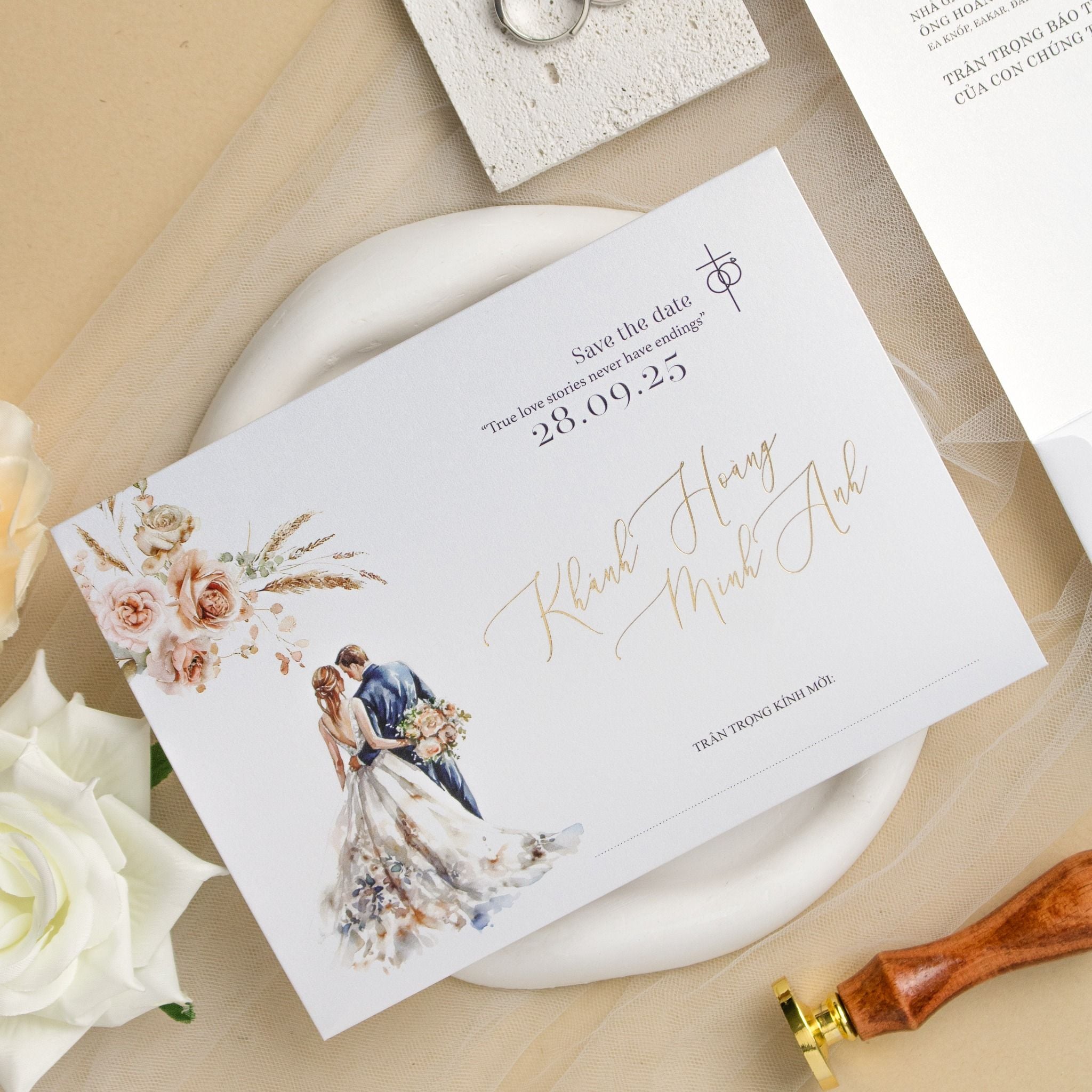 Với mẫu TILA-D009, chúng tôi không chỉ tạo ra một thông báo, mà là một tác phẩm nghệ thuật thu nhỏ. Hình ảnh đôi lứa được phác họa bằng nét vẽ màu nước mềm mại, e ấp bên những đóa hoa hồng pastel dịu ngọt, gợi lên một không gian lễ cưới đầy thơ mộng và lãng mạn. Từng dòng chữ bay bổng được chăm chút tỉ mỉ trên nền giấy ánh kim, mang lại cảm giác sang trọng, ấm áp ngay khi chạm tay vào. Đây không chỉ là một tấm thiệp, mà là kỷ vật lưu giữ khoảnh khắc thiêng liêng khi hai trái tim chính thức hòa chung một nhịp.