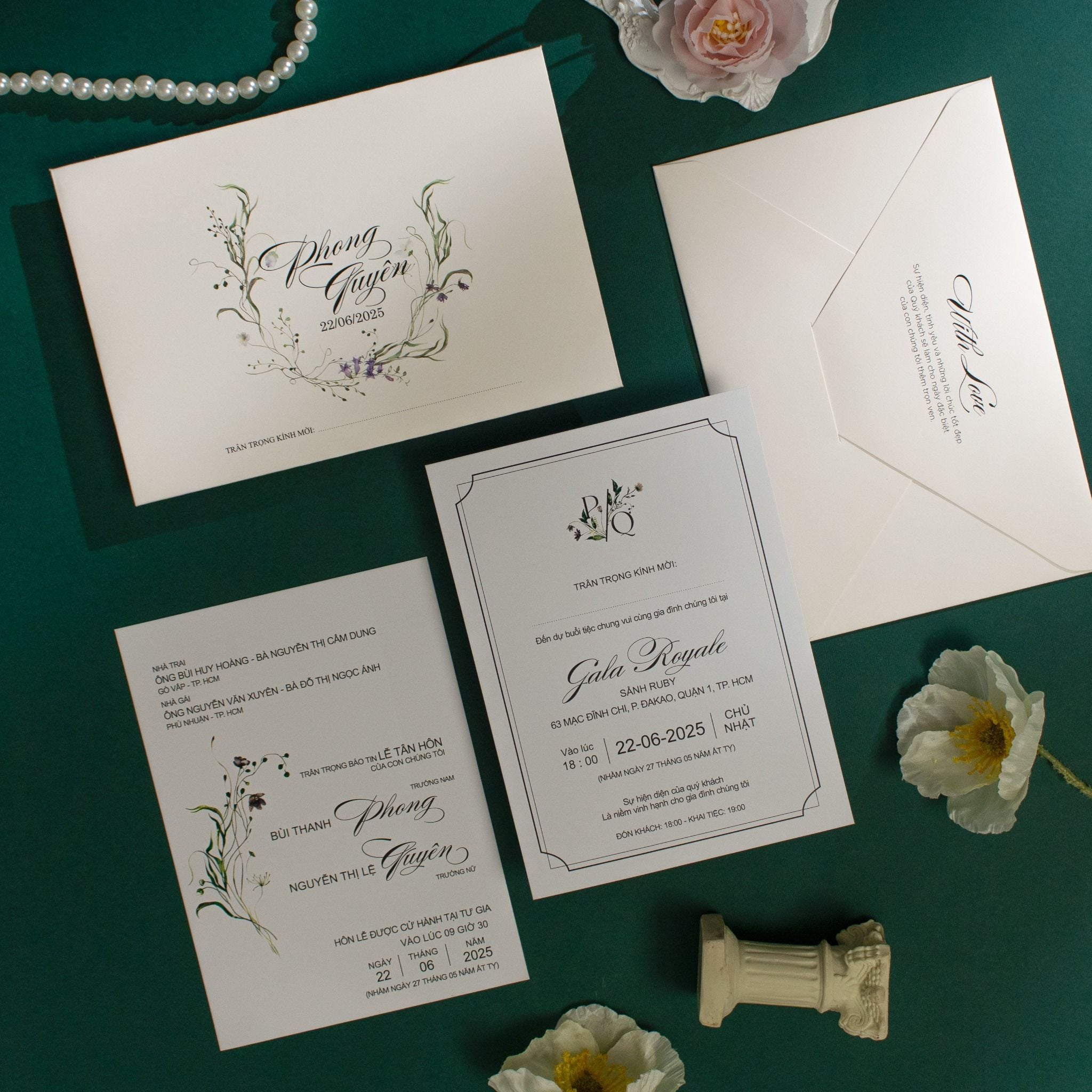 Cảm giác chạm tay vào thớ giấy mịn màng, nghe tiếng lật nhẹ nhàng của lời mời và ngắm nhìn những nhành hoa cỏ dại được phác họa tỉ mỉ đó là cách chúng tôi kể câu chuyện tình của bạn. Bộ thiệp không chỉ là một lời thông báo, mà là một tác phẩm nghệ thuật thu nhỏ dành riêng cho ngày trọng đại. Sự kết hợp giữa nét chữ Calligraphy bay bổng và họa tiết cỏ cây mềm mại trên nền giấy kem tinh khôi tạo nên một vẻ đẹp dịu dàng, tinh tế đến nao lòng. Khi đặt trên nền xanh lục bảo sâu thẳm, mỗi tấm thiệp như tỏa sáng hơn, hứa hẹn một khởi đầu viên mãn và sang trọng cho lứa đôi.Khi bạn đặt trọn niềm tin vào Thiệp cưới KK để chuẩn bị cho ngày khởi đầu hạnh phúc, chúng tôi hiểu rằng sự riêng tư là điều quý giá nhất.