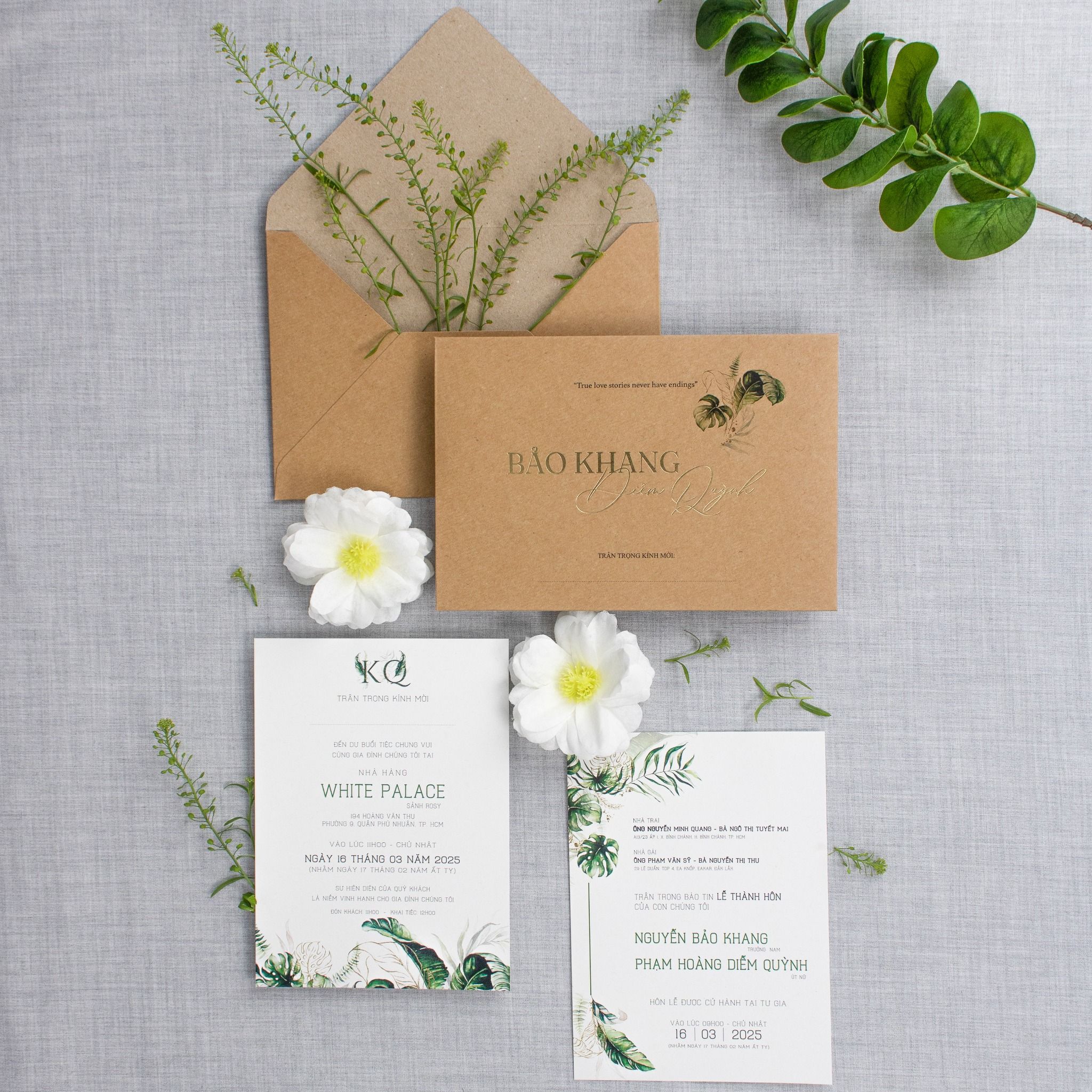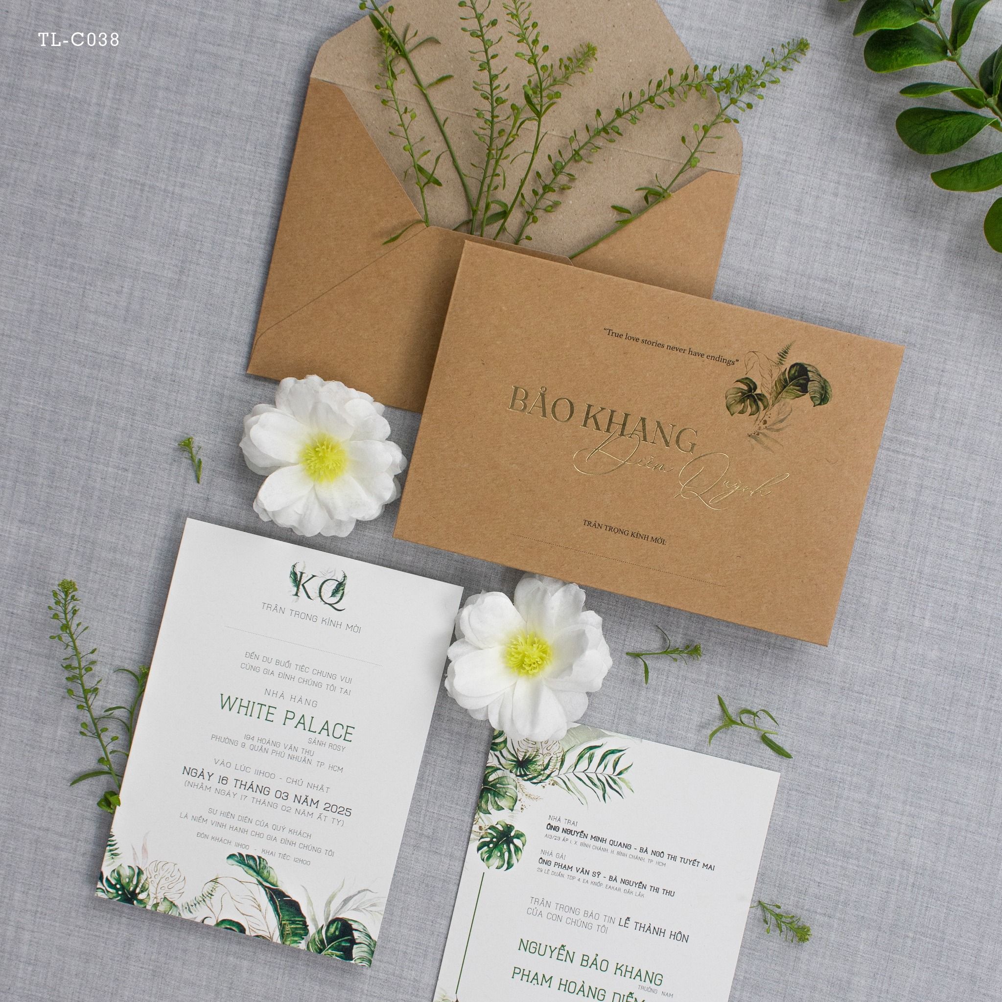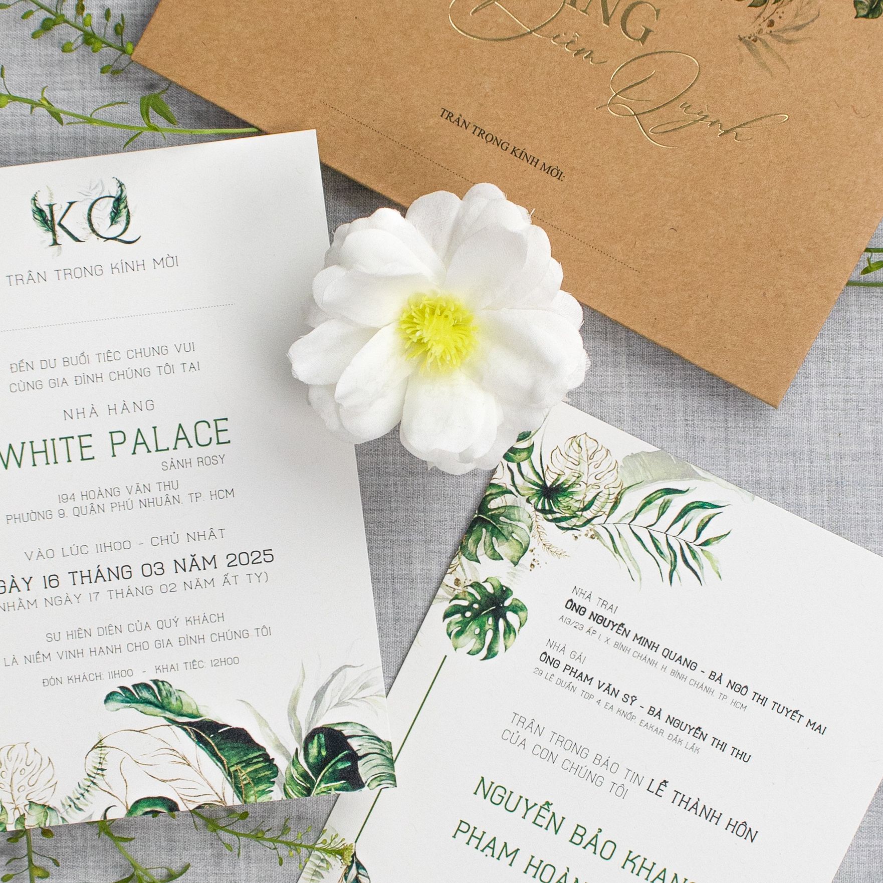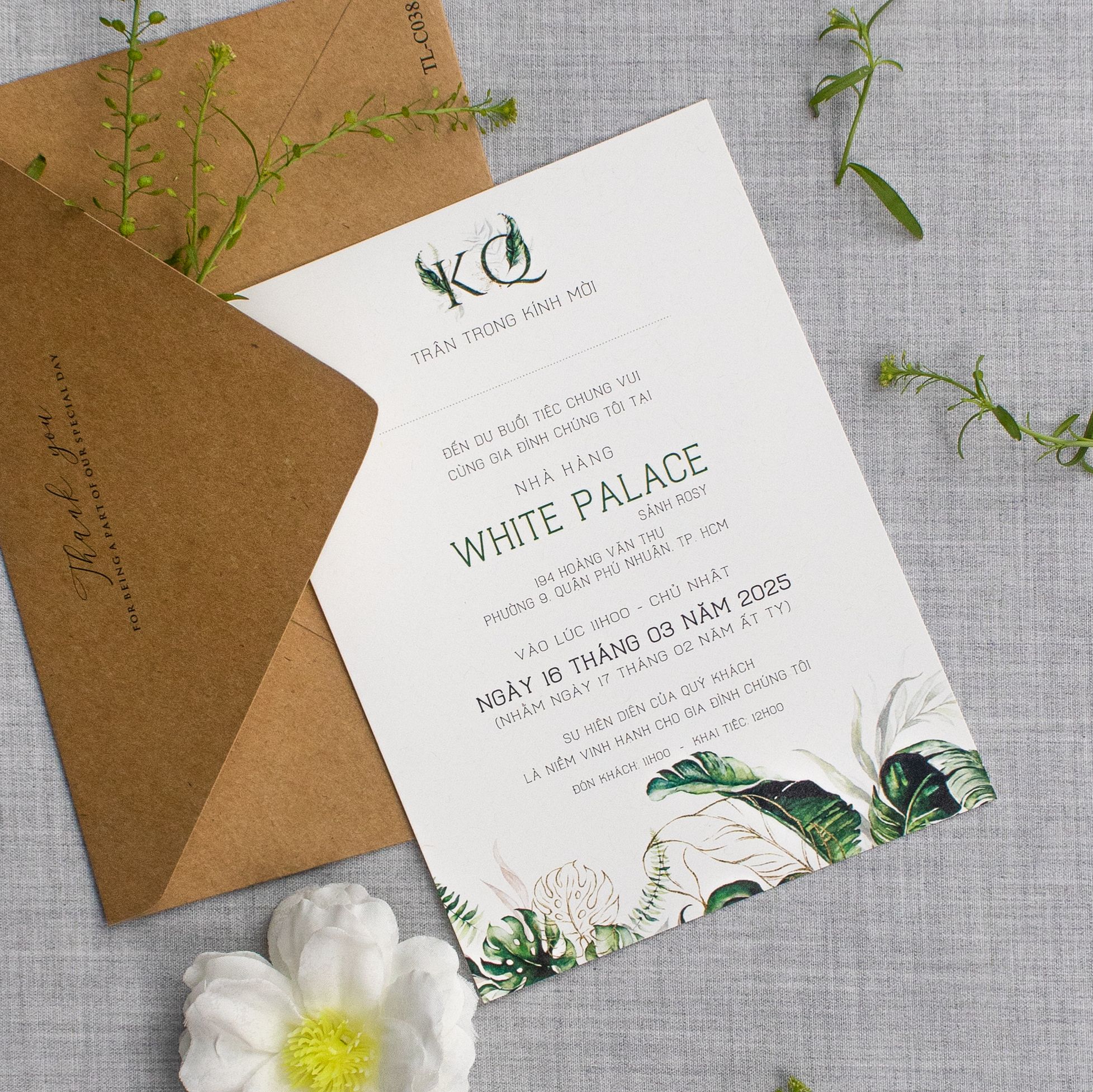 Chạm tay vào lớp giấy Kraft thô mộc, bạn sẽ cảm nhận được hơi thở của tự nhiên đang len lỏi trong từng thớ giấy. Không cầu kỳ hoa mỹ, bộ thiệp là sự giao thoa hoàn hảo giữa nét giản đơn của chất liệu tái chế và sự sang trọng từ những dòng chữ ép kim vàng óng ánh. Từng họa tiết lá nhiệt đới xanh mướt được điểm xuyết khéo léo, biến tấm thiệp thành một lời mời chân thành, ấm áp gửi đến những người thân thương.