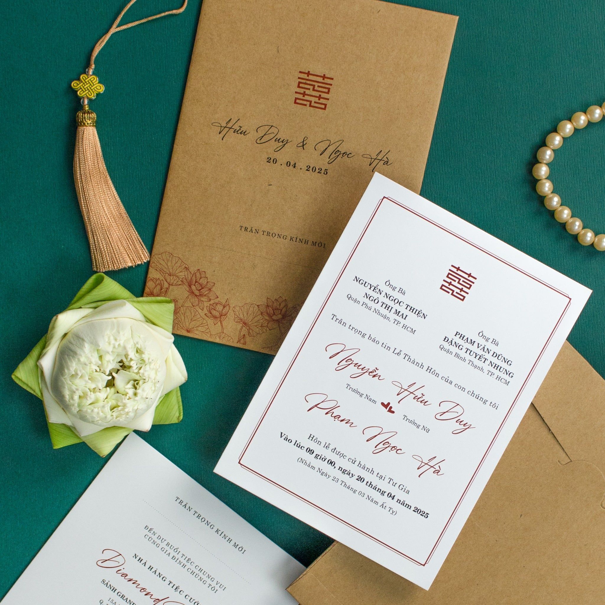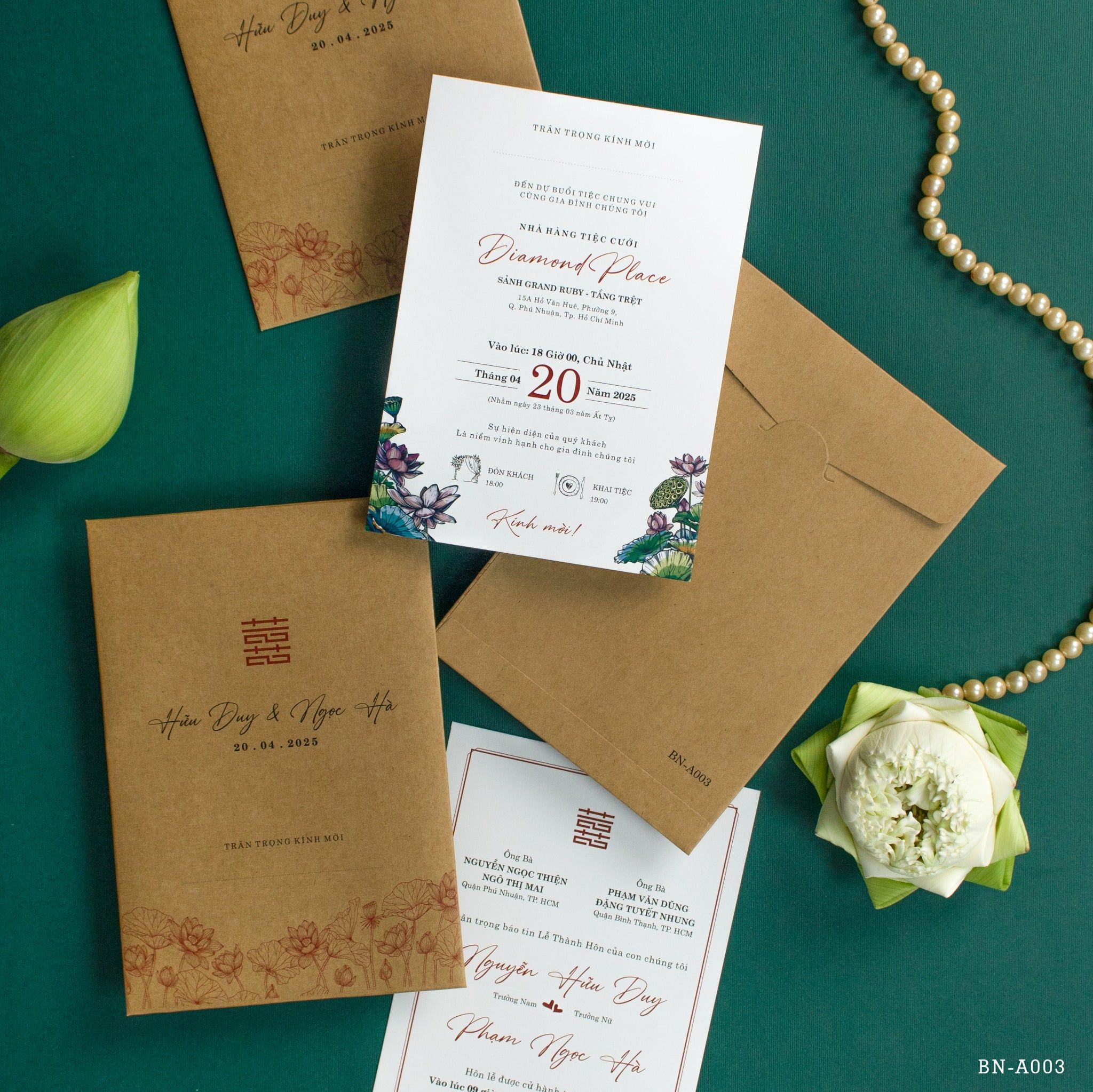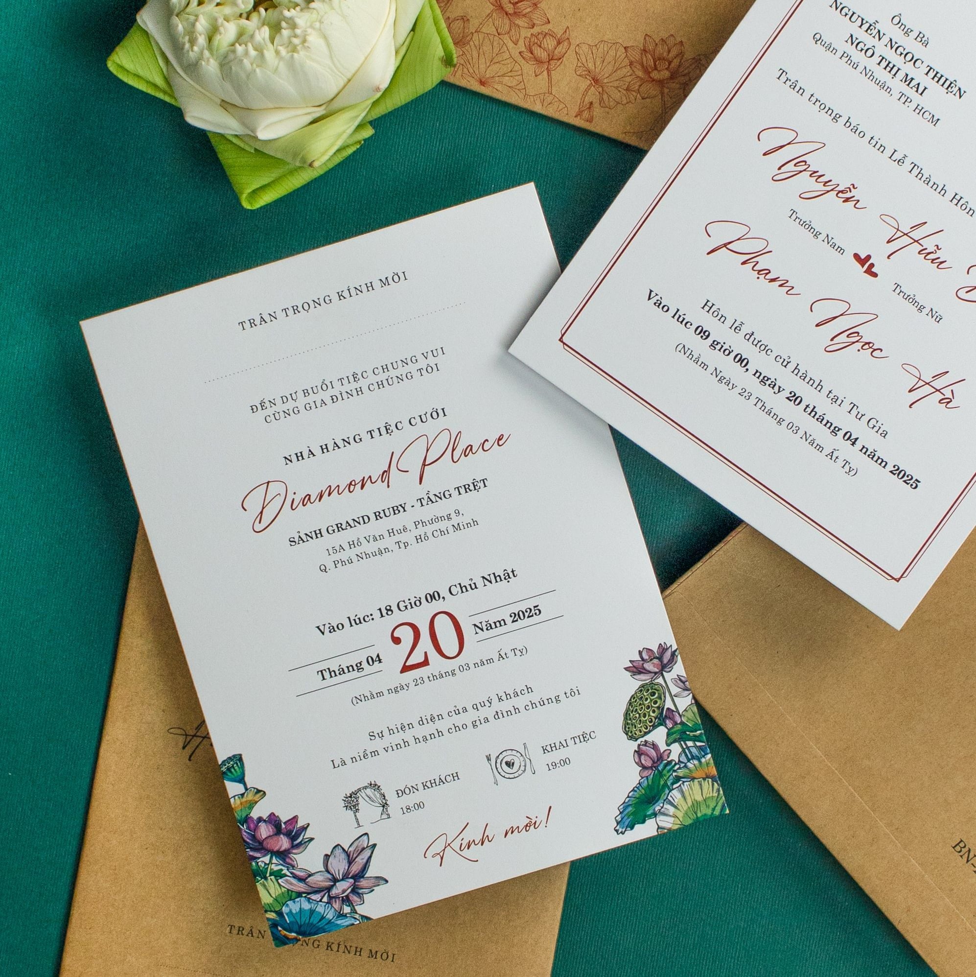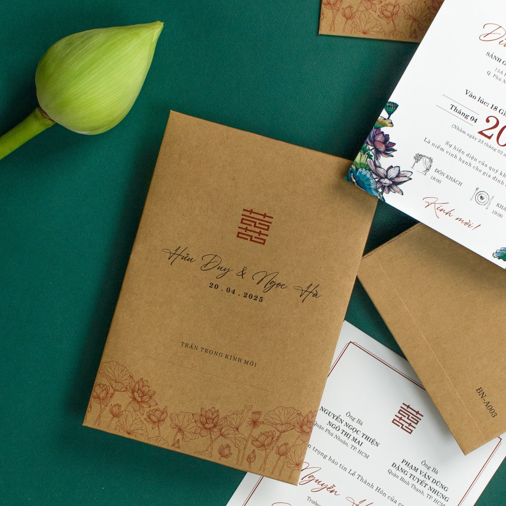 Cầm trên tay bộ thiệp này, bạn sẽ cảm nhận rõ rệt sự ấm áp từ chất liệu giấy kraft thô mộc, gợi nhắc về những giá trị xưa cũ nhưng chẳng hề lỗi thời. Từng đóa sen được phác họa thanh mảnh, nép mình duyên dáng bên những dòng chữ viết tay mềm mại, tạo nên một tổng thể hài hòa giữa nét hoài cổ và tinh thần hiện đại. Đây không chỉ là một lời mời, mà là cách bạn kể câu chuyện tình yêu chân phương, bền bỉ. Sắc nâu trầm của giấy quyện cùng tông xanh mướt của nền tạo nên một cảm giác an yên lạ kỳ, hứa hẹn một khởi đầu viên mãn cho lứa đôi.Khi bạn đặt trọn niềm tin vào Thiệp cưới KK để chuẩn bị cho ngày khởi đầu hạnh phúc, chúng tôi hiểu rằng sự riêng tư là điều quý giá nhất.