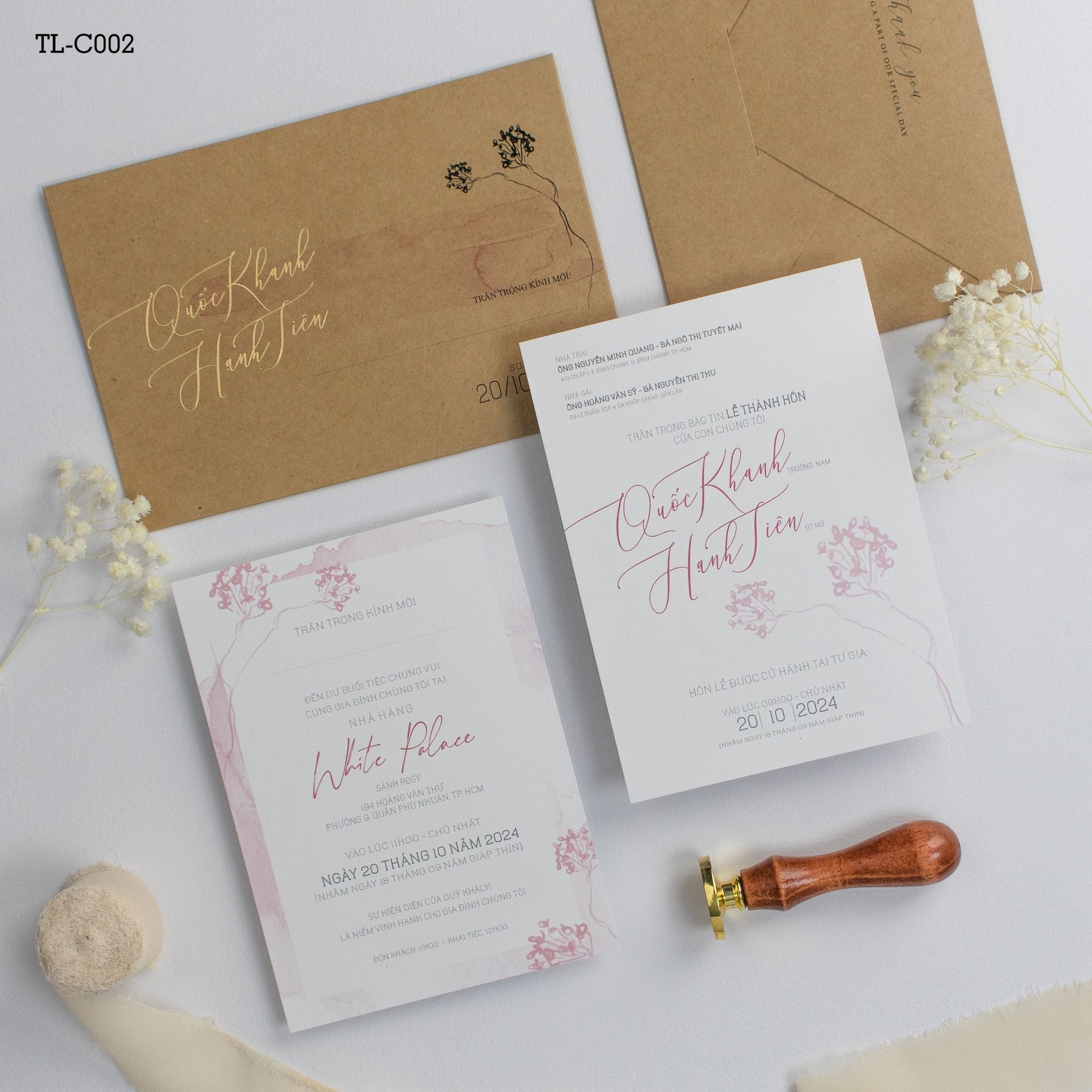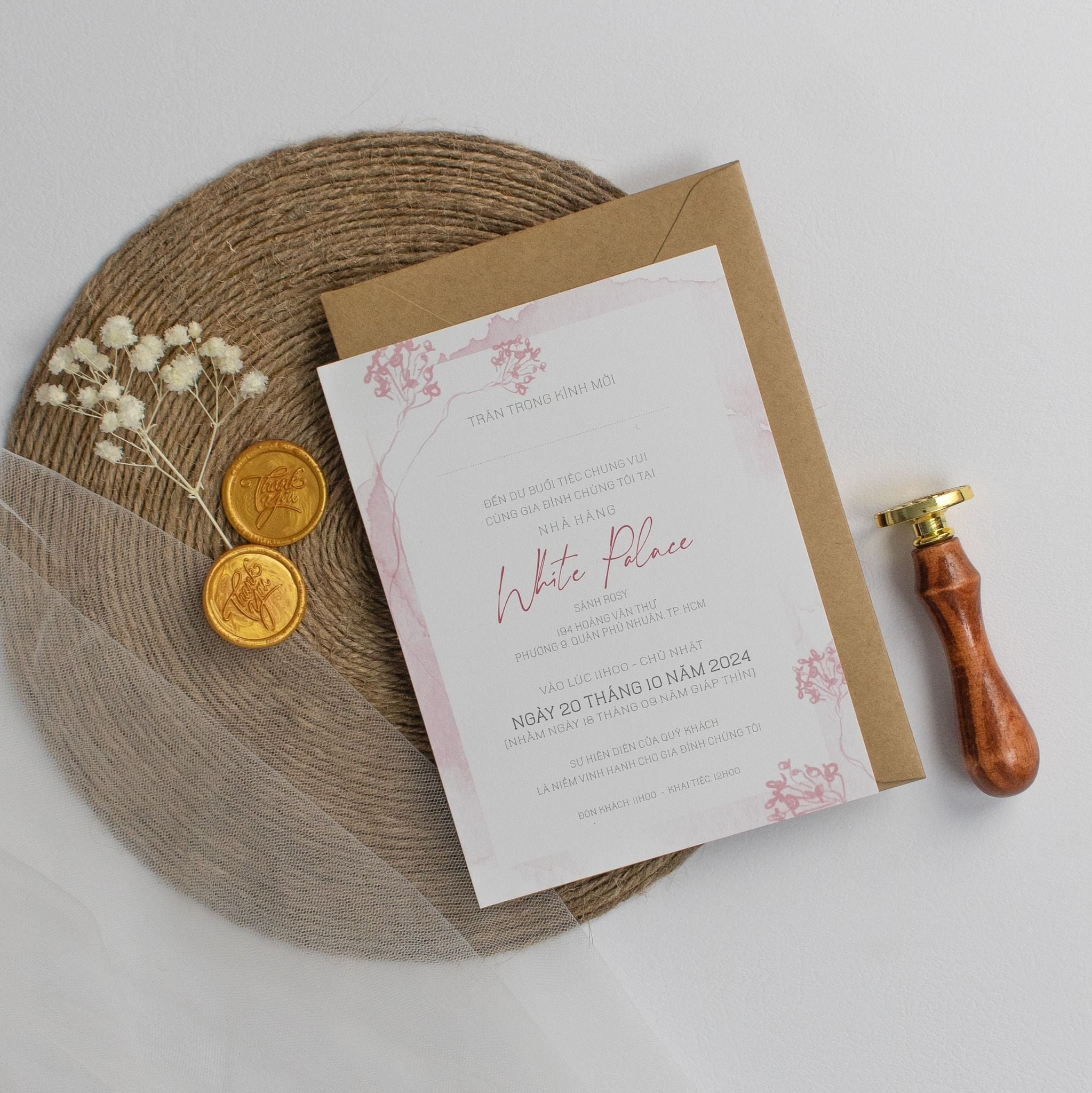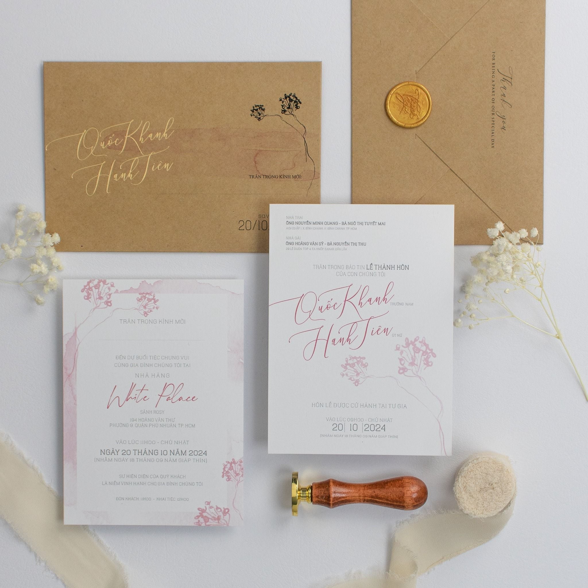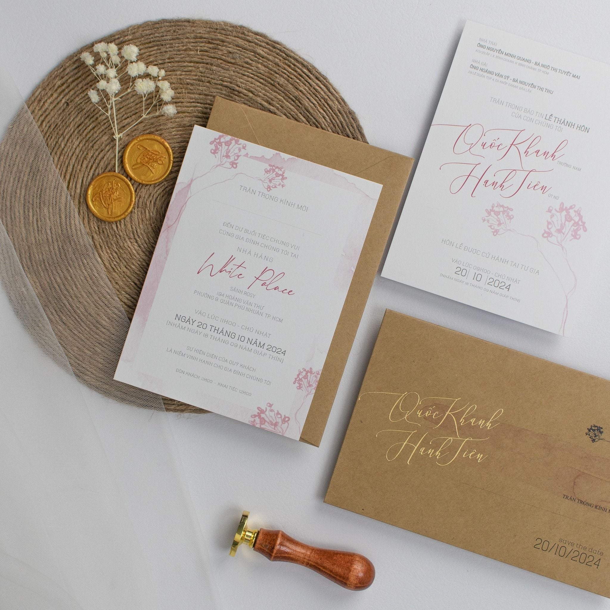 Mẫu thiệp là sự giao thoa tinh tế giữa nét thô mộc của giấy Kraft và sự dịu dàng của sắc hồng. Bao thư nâu cổ điển làm nền hoàn hảo cho tên cô dâu chú rể được ép kim vàng bắt sáng, tạo ấn tượng sang trọng ngay từ cái nhìn đầu tiên. Bên trong, ruột thiệp sử dụng họa tiết thanh mảnh hòa quyện cùng những vệt màu loang nhẹ nhàng, mang lại cảm giác thanh khiết và lãng mạn. Điểm nhấn từ dấu sáp vàng đồng cùng nhành hoa bi khô chính là mảnh ghép cuối cùng, hoàn thiện vẻ đẹp thủ công đầy trân trọng.