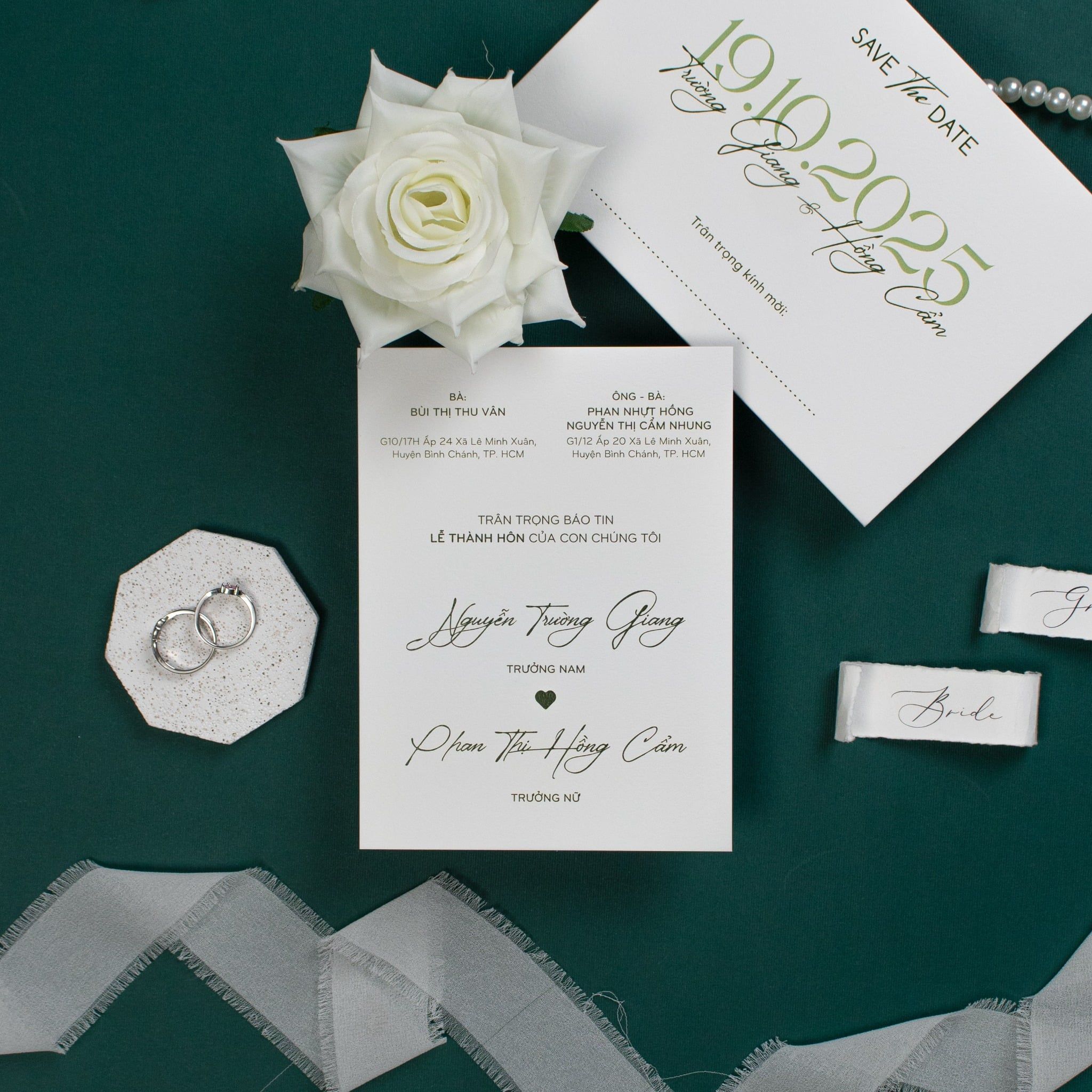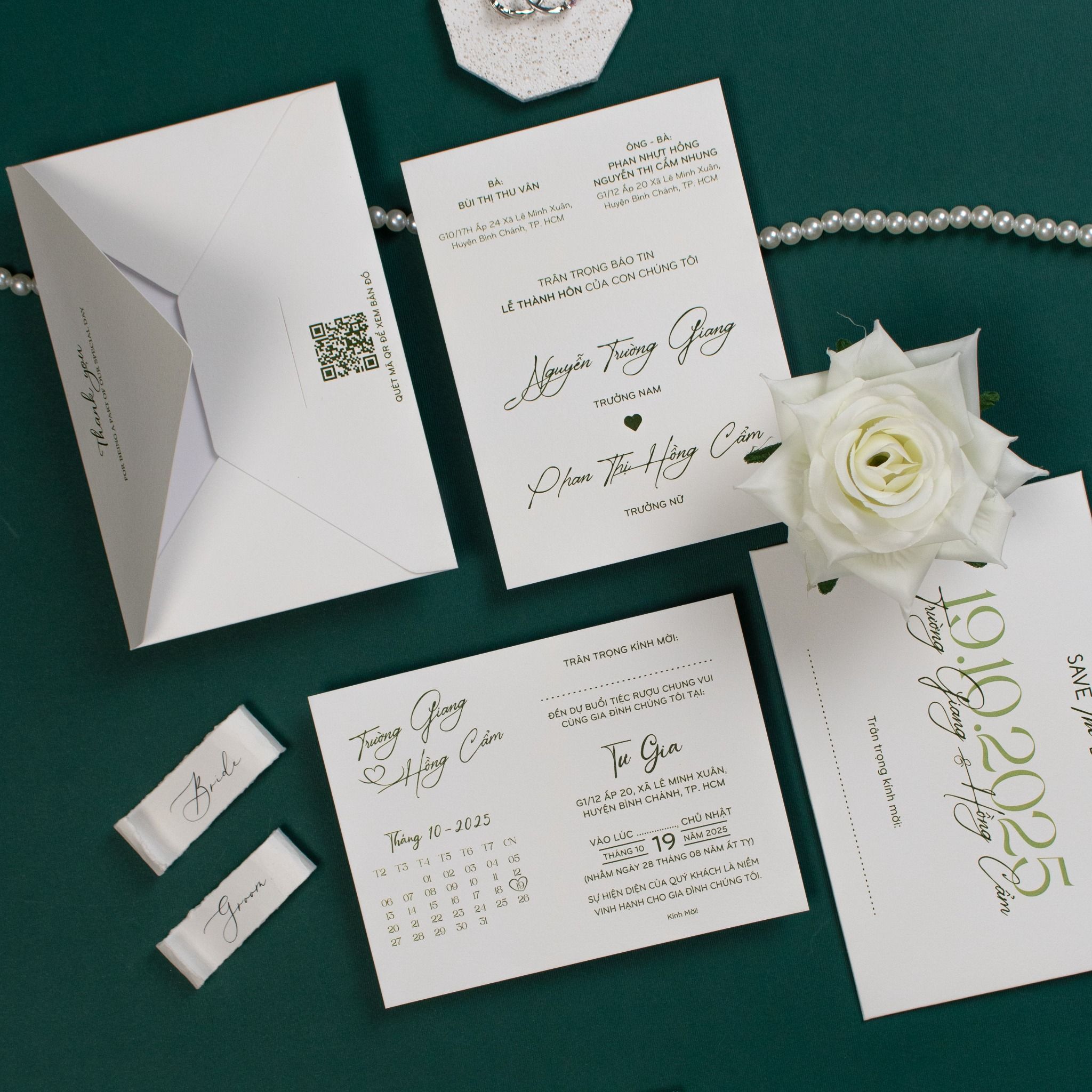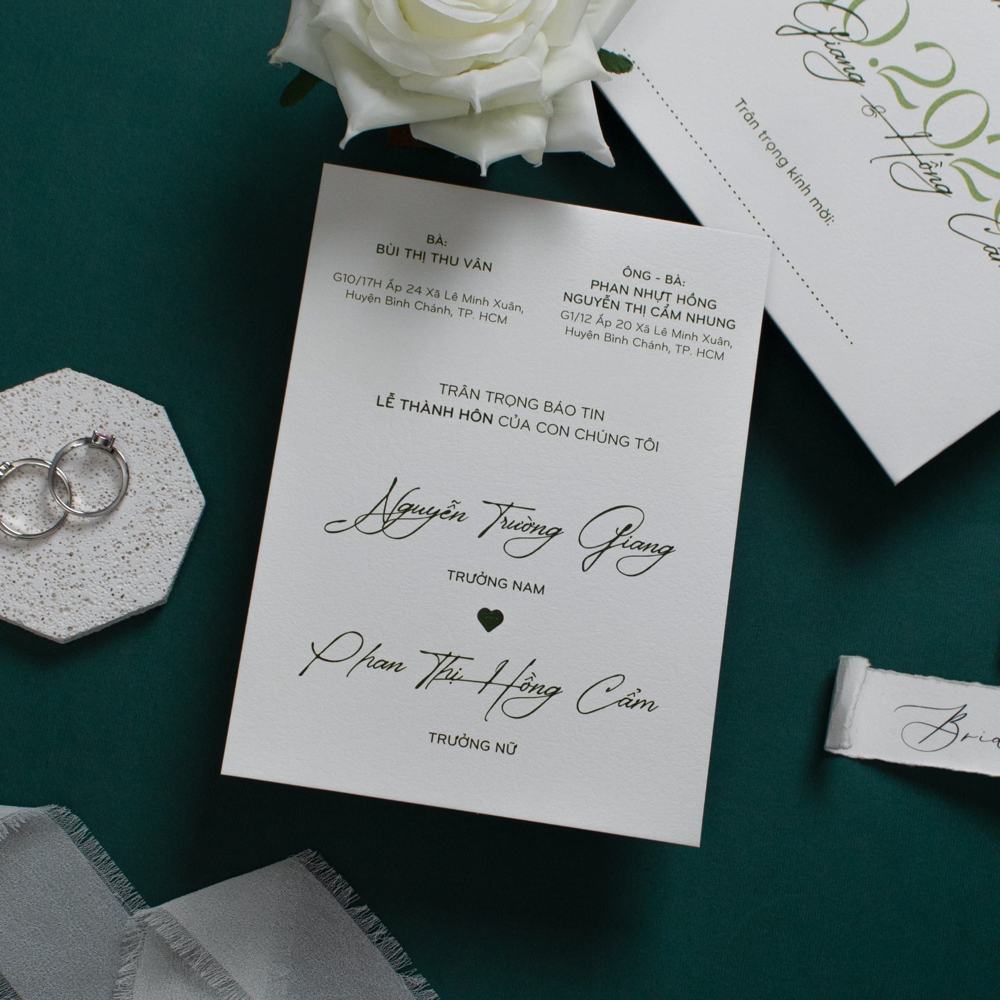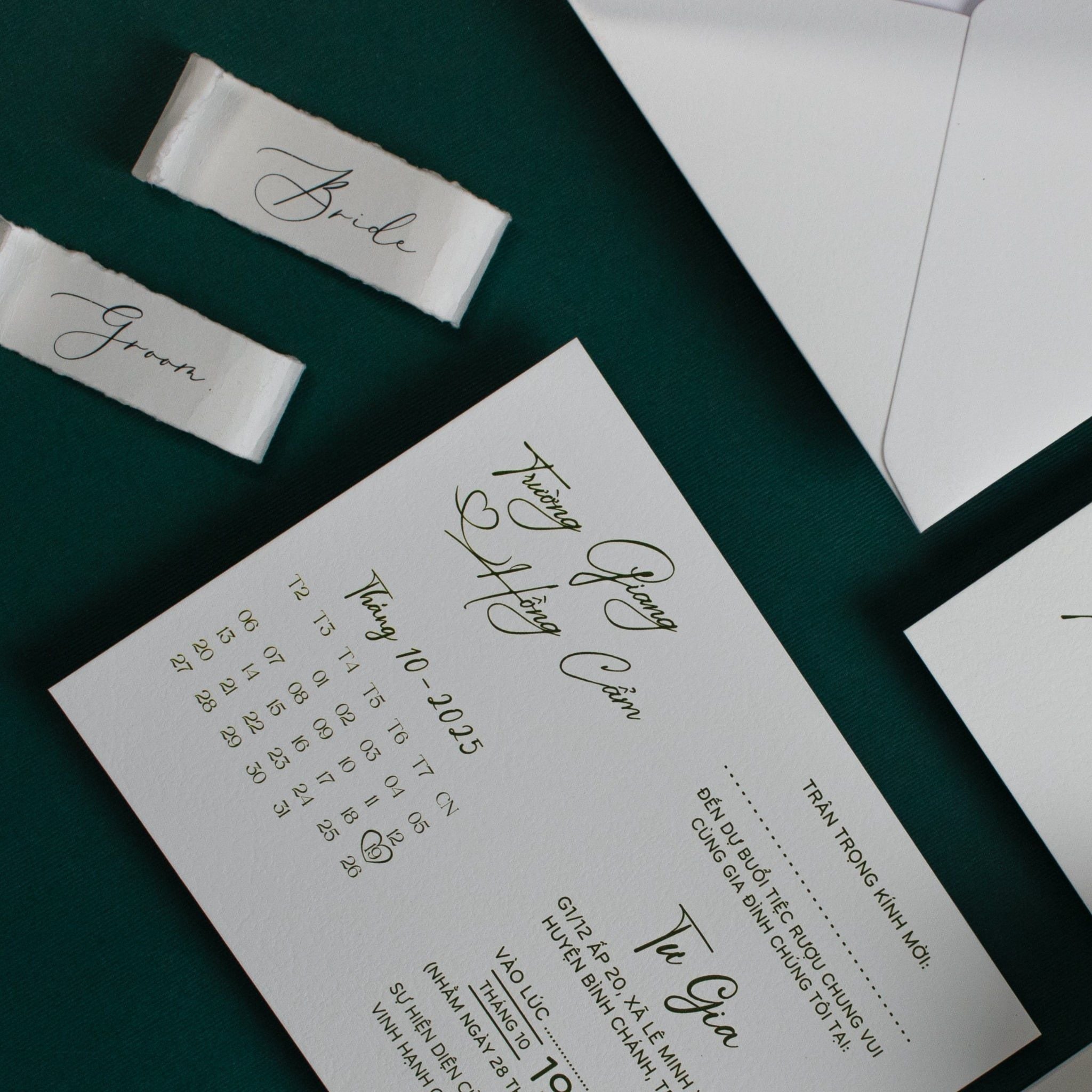 Mẫu thiệp sử dụng dòng giấy trắng có bề mặt vân nổi tinh tế, mang lại cảm giác mộc mạc và cao cấp khi cầm trên tay. Toàn bộ chữ in và các chi tiết trang trí được thể hiện bằng tông màu xanh lục bảo đậm, tạo nên sự tương phản sắc nét và đầy chiều sâu trên nền giấy trắng tinh khôi. Các thông tin được sắp xếp gọn gàng, thoáng đãng, tận dụng tối đa vẻ đẹp vốn có của chất liệu giấy để tạo nên một tổng thể chỉn chu, đại diện cho lời mời chân thành nhất của đôi bạn.