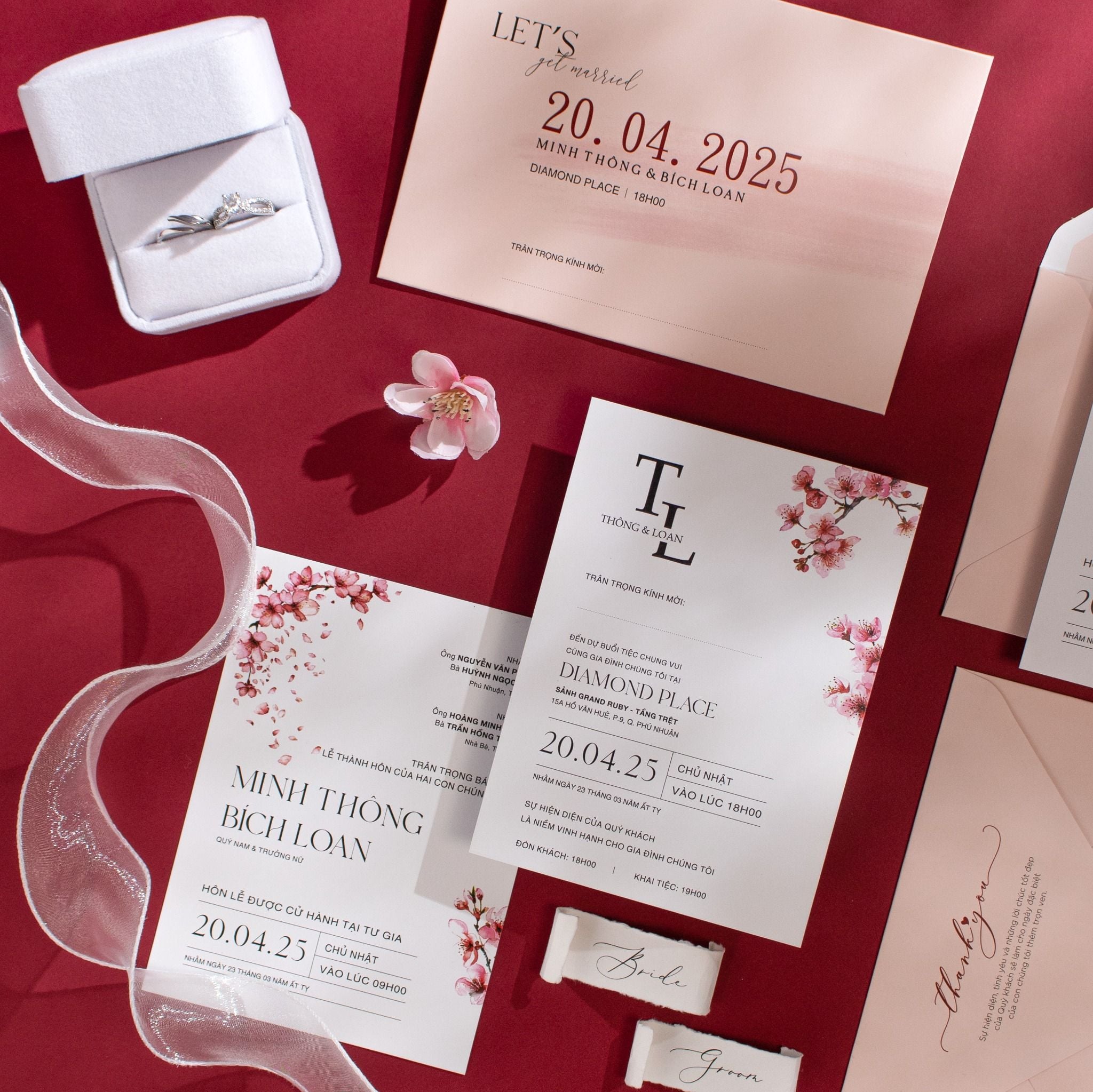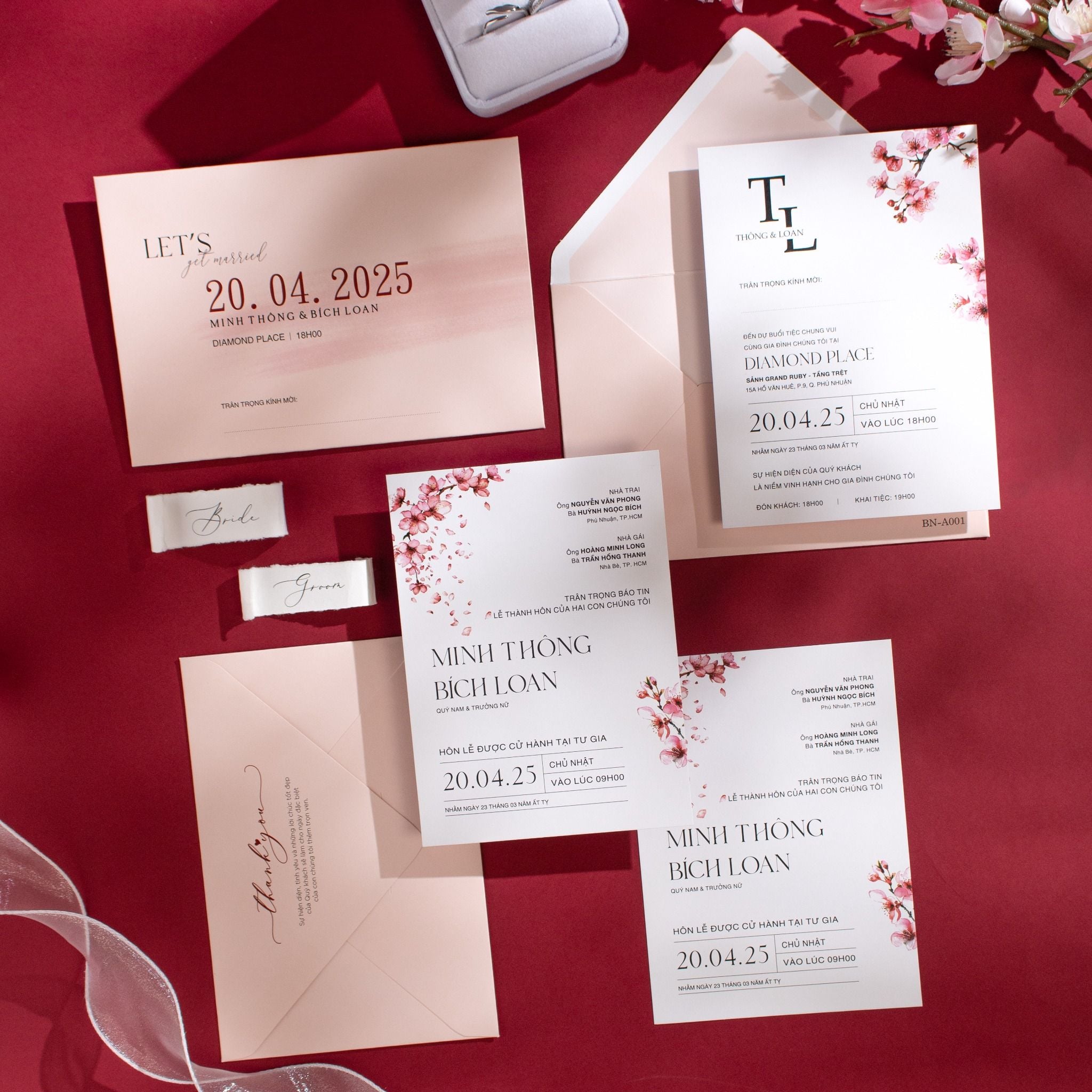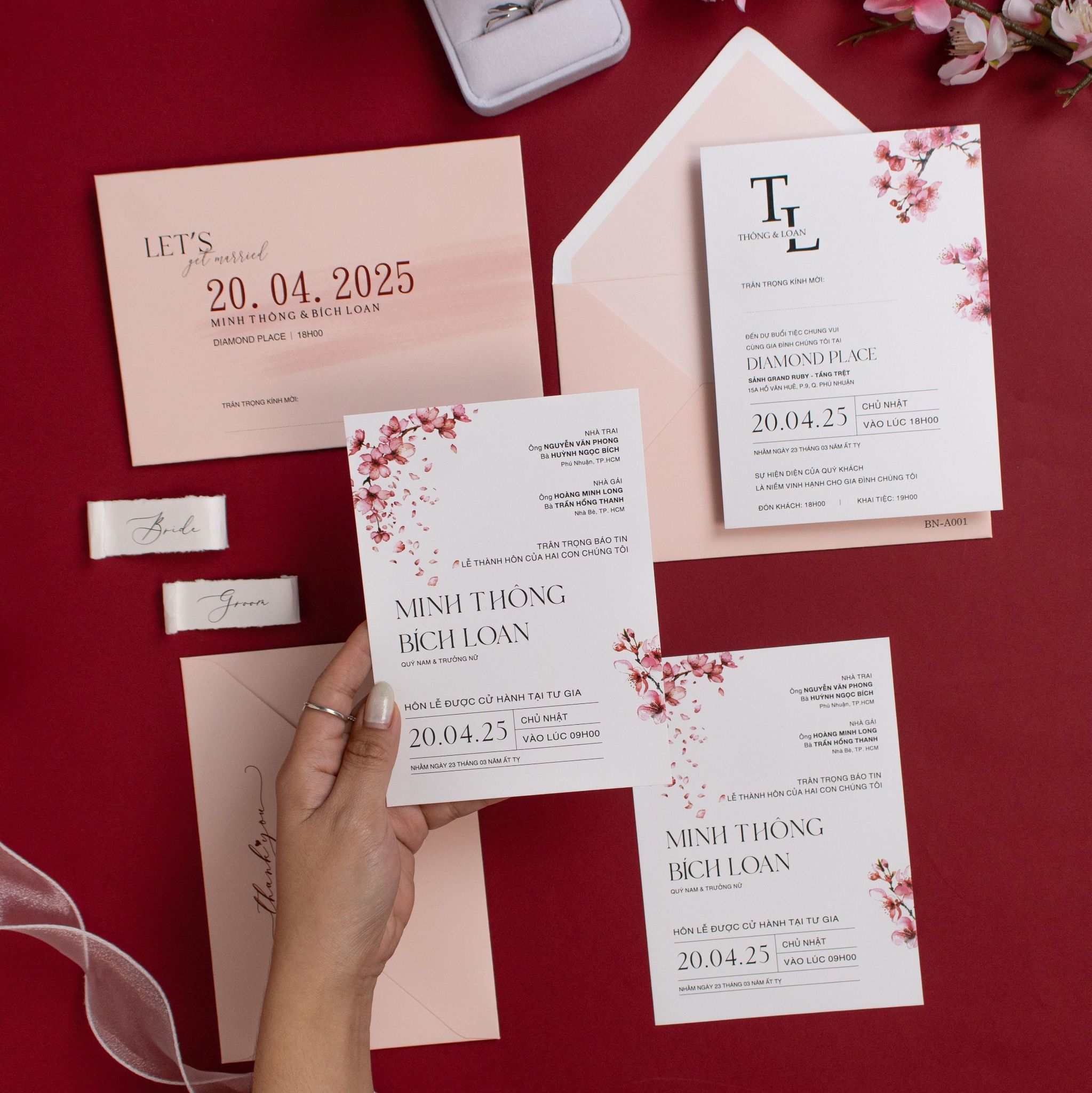 Đánh dấu khởi đầu câu chuyện tình yêu vĩnh cửu bằng mẫu thiệp cưới hoa anh đào lãng mạn này. Lấy cảm hứng từ vẻ đẹp tinh khôi và mong manh của những cánh hoa anh đào đầu xuân, mỗi tấm thiệp là một lời thì thầm ngọt ngào về hạnh phúc. Sắc hồng pastel nhẹ nhàng hòa quyện cùng chất liệu giấy cao cấp, tạo nên cảm giác sang trọng, thanh lịch. Họa tiết hoa anh đào được vẽ tay tỉ mỉ, như những nét chấm phá dịu dàng, báo hiệu một tình yêu đơm hoa kết trái. Thiệp còn được điểm xuyết bằng font chữ bay bổng, uyển chuyển, giúp truyền tải trọn vẹn thông điệp yêu thương. Hãy để thiệp cưới hoa anh đào của chúng tôi trở thành sứ giả đưa tin về ngày vui trọng đại của bạn.Khi bạn đặt trọn niềm tin vào Thiệp cưới KK để chuẩn bị cho ngày khởi đầu hạnh phúc, chúng tôi hiểu rằng sự riêng tư là điều quý giá nhất.