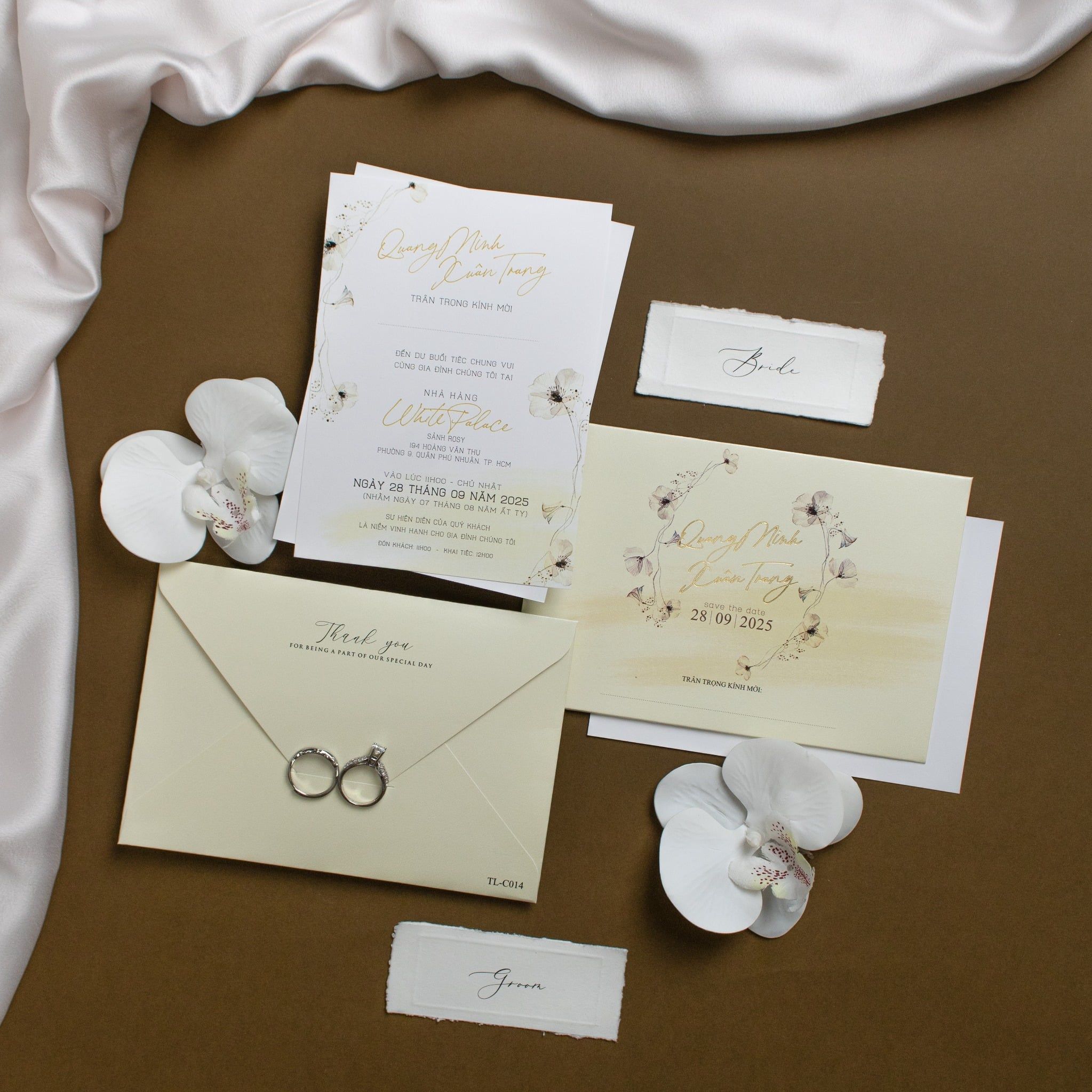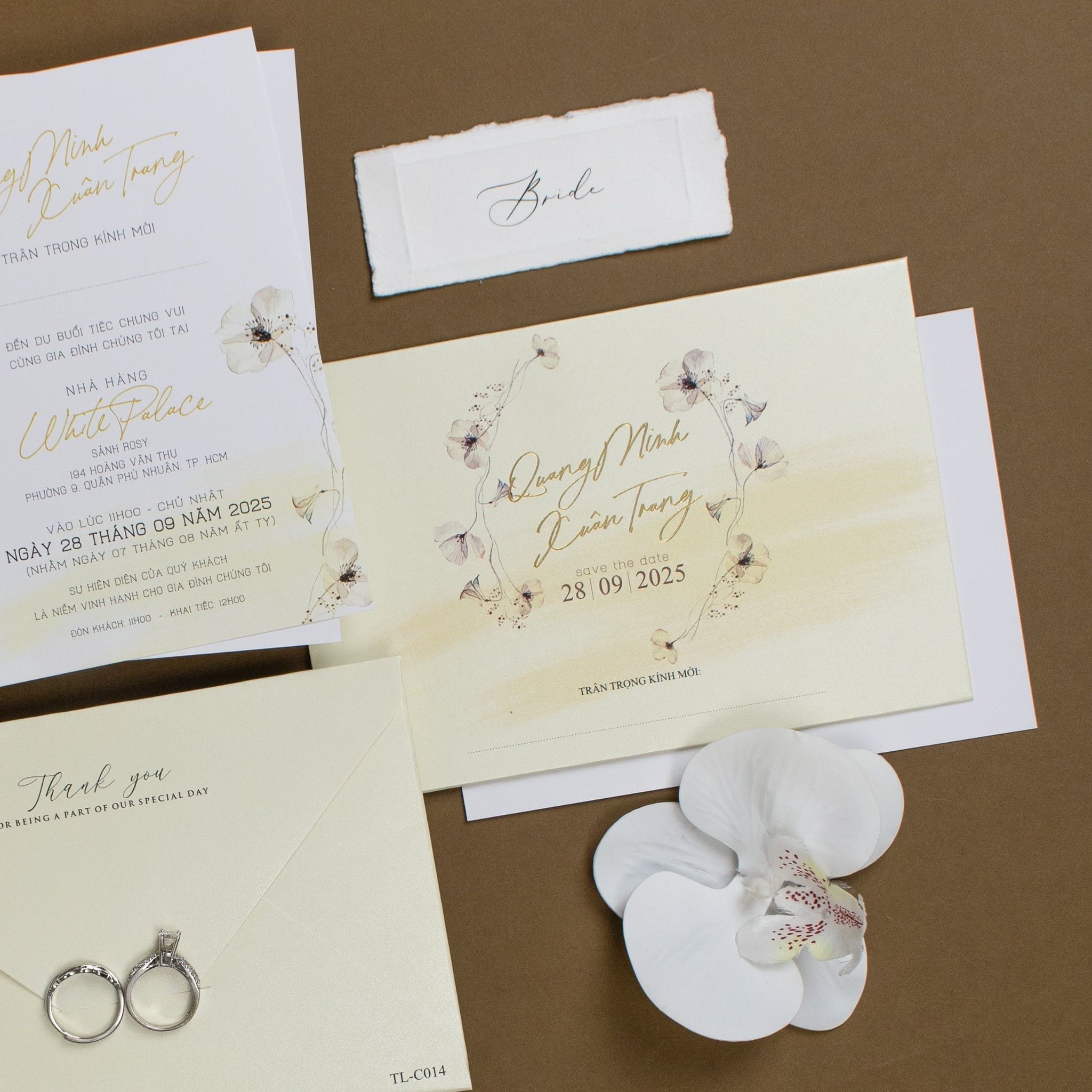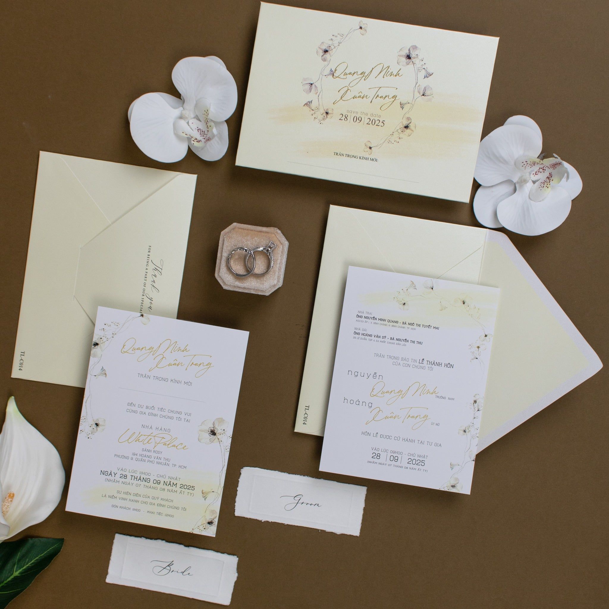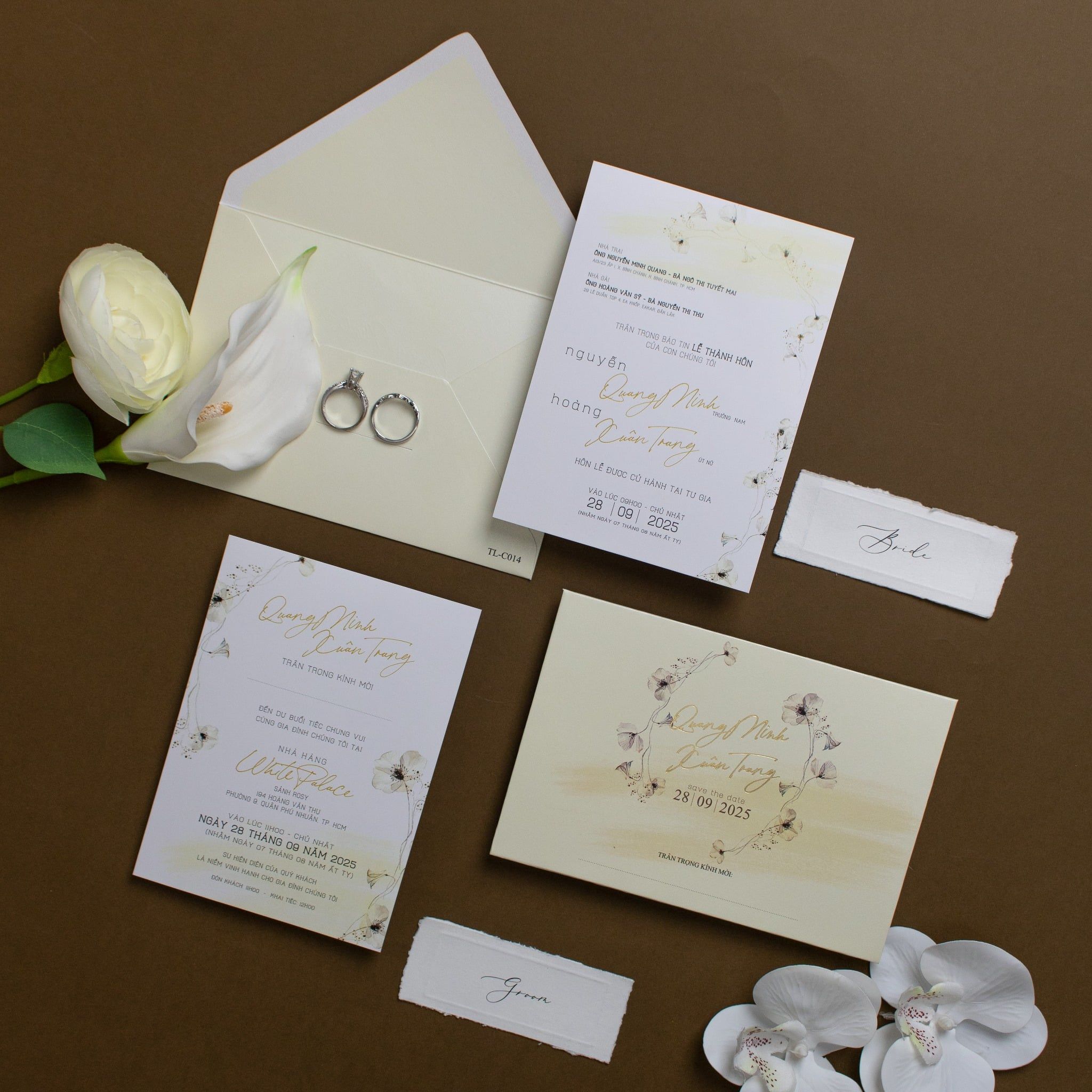 Cầm trên tay tấm thiệp này, bạn sẽ cảm nhận ngay được hơi thở dịu dàng của mùa thu qua những nét vẽ hoa cỏ mềm mại trên nền giấy kem mịn màng. Không cần đến những chi tiết cầu kỳ phô trương, sự sang trọng toát ra từ chính sự giản đơn và những đường nét calligraphy bay bổng, tựa như một lời ngỏ chân thành gửi đến những người thân thương. Đây không chỉ là một tấm thiệp báo tin, mà là mảnh ghép khởi đầu cho một chương mới đầy chất thơ của lứa đôi, nơi sự tinh tế được đặt lên hàng đầu.