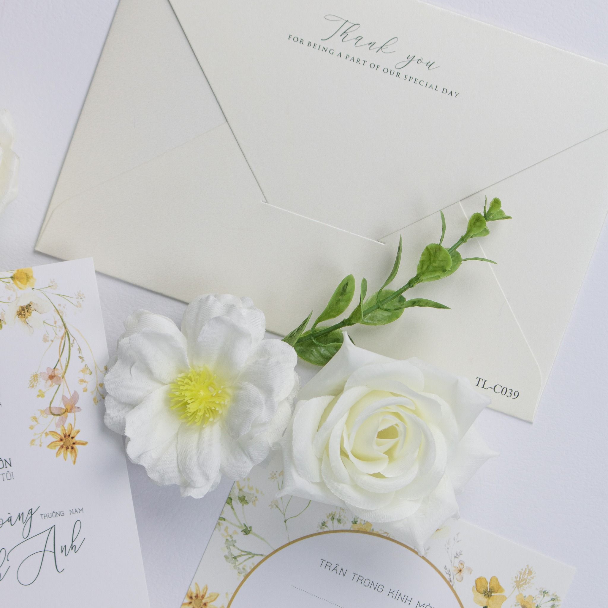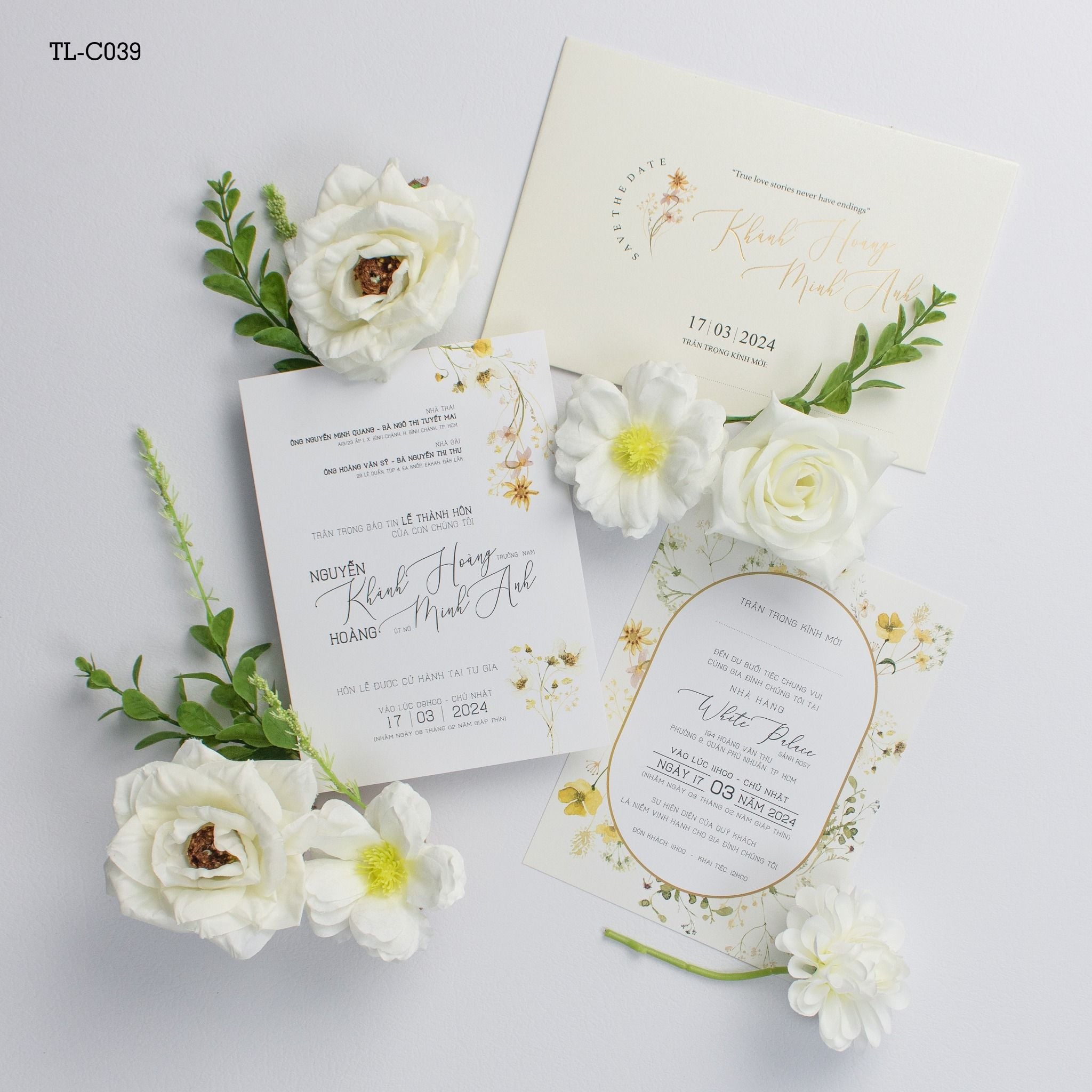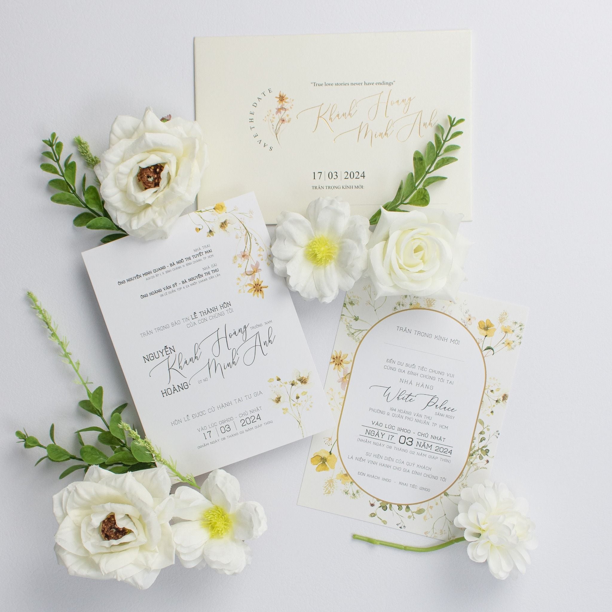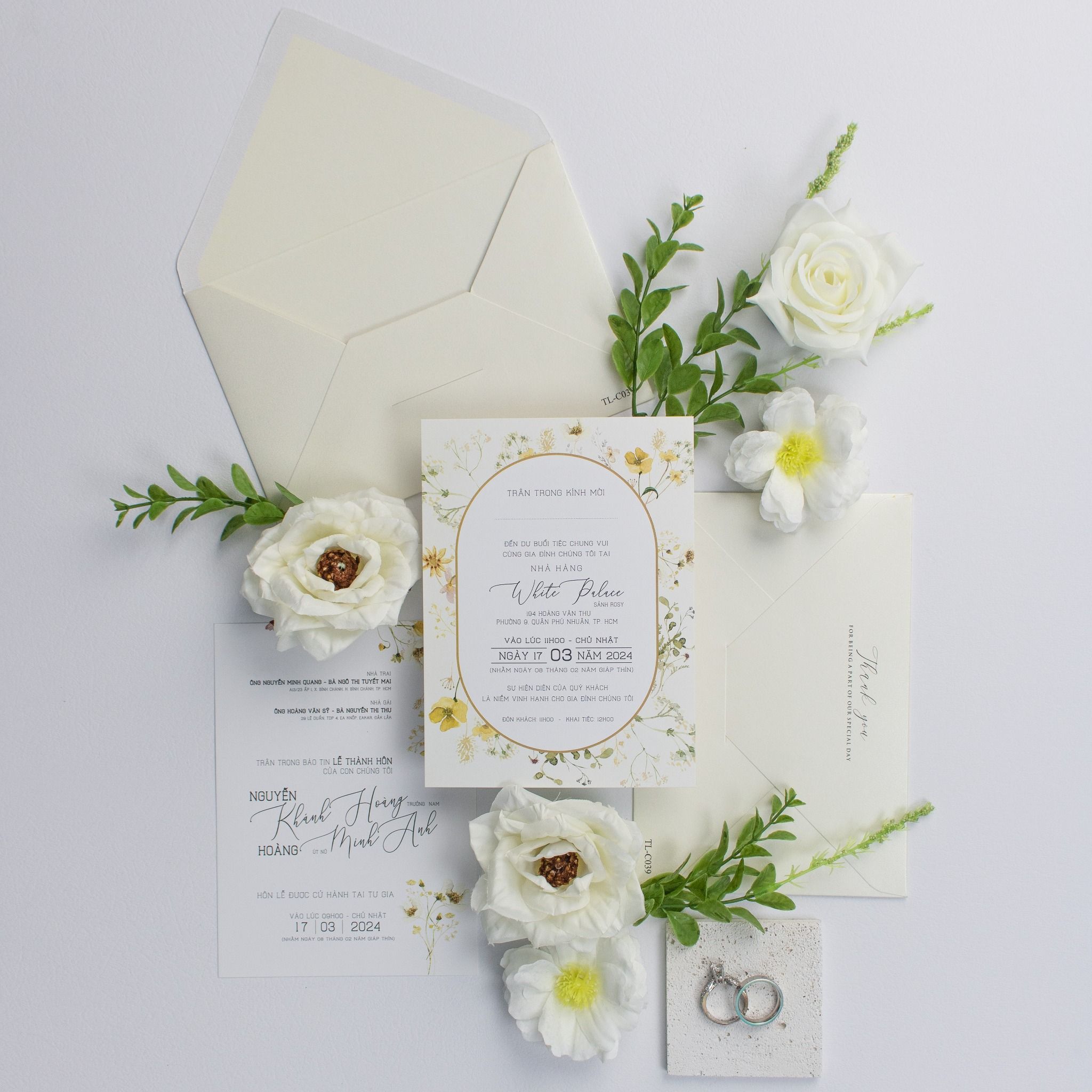 Gói ghém cả hơi thở đồng nội vào từng thớ giấy, bộ thiệp này là lời hồi đáp ngọt ngào cho những tâm hồn yêu sự giản đơn nhưng không kém phần tinh tế. Những nhành hoa dại li ti, vàng óng ả điểm xuyết trên nền giấy kem mịn màng tạo nên một cảm giác nhẹ bẫng, tựa như một buổi sớm mai trong trẻo. Cầm trên tay tấm thiệp, khách mời không chỉ nhận một lời mời, mà là đang chạm vào câu chuyện tình yêu dịu dàng, chân thành nhất. Từng đường nét font chữ bay bổng phối hợp cùng phong bì lót hoa tinh xảo tạo nên một tổng thể hài hòa, đủ sang trọng để trân trọng, đủ gần gũi để khiến người ta phải nhớ nhung.