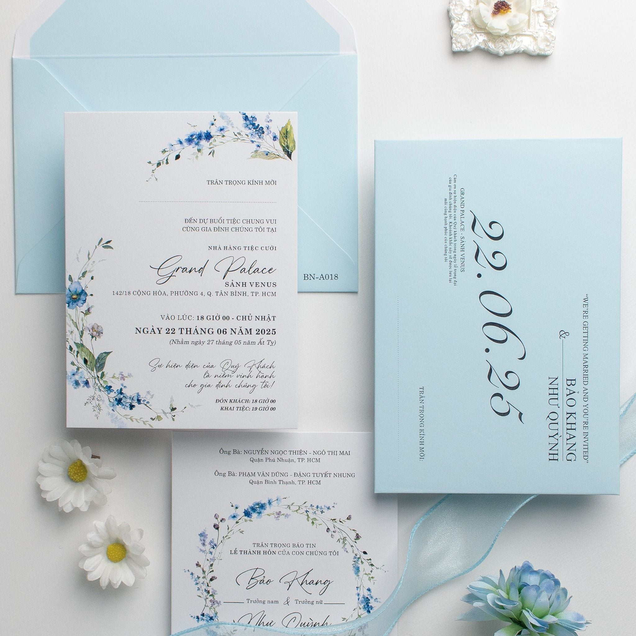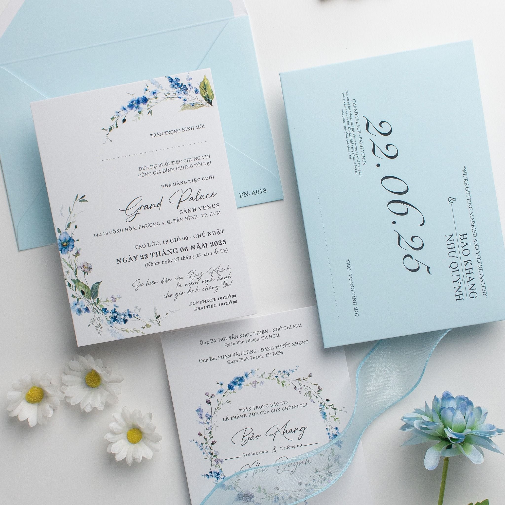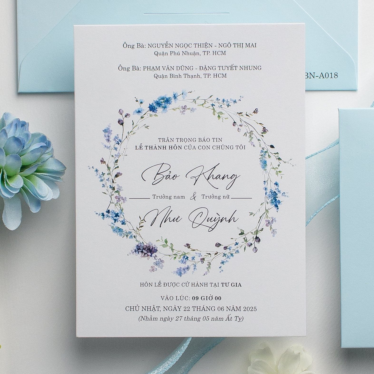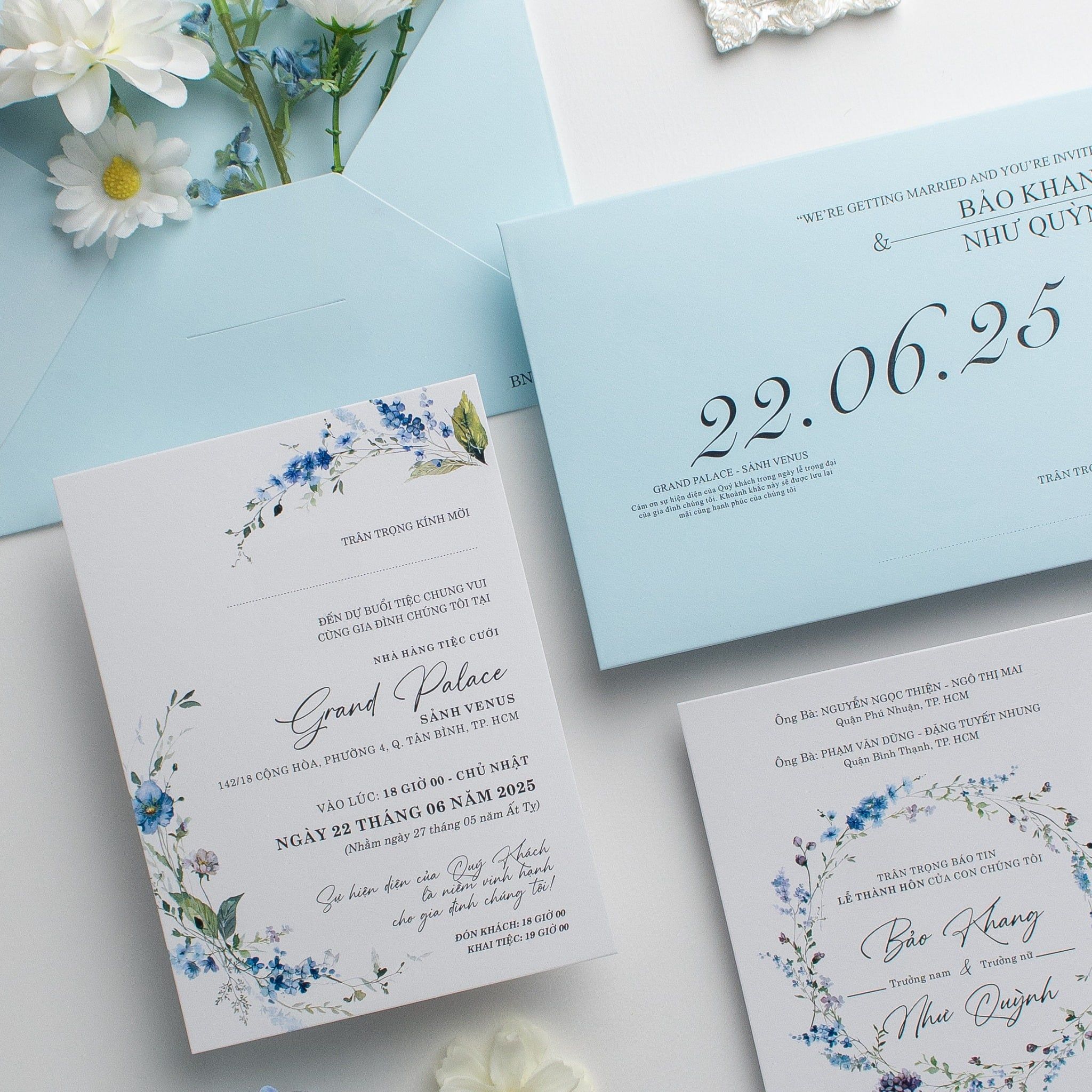 Một buổi sáng mùa hè trong trẻo hiện diện ngay trên lòng bàn tay khi bạn cầm trên tay mẫu thiệp này. Không cầu kỳ, không phô trương, sắc xanh Baby Blue dịu mắt kết hợp cùng những nhành hoa nhí màu nước tạo nên một tổng thể vô cùng dễ chịu. Từng đường nét chữ được chăm chút tỉ mỉ, đan xen giữa phông chữ hiện đại cứng cáp và nét Script bay bổng, kể lại câu chuyện tình yêu một cách đầy chất thơ. Đây không chỉ là một tấm giấy báo tin, mà là mảnh ghép đầu tiên hoàn hảo cho một hôn lễ tinh tế, nơi sự sang trọng đến từ những điều giản đơn nhất.Khi bạn đặt trọn niềm tin vào Thiệp cưới KK để chuẩn bị cho ngày khởi đầu hạnh phúc, chúng tôi hiểu rằng sự riêng tư là điều quý giá nhất.