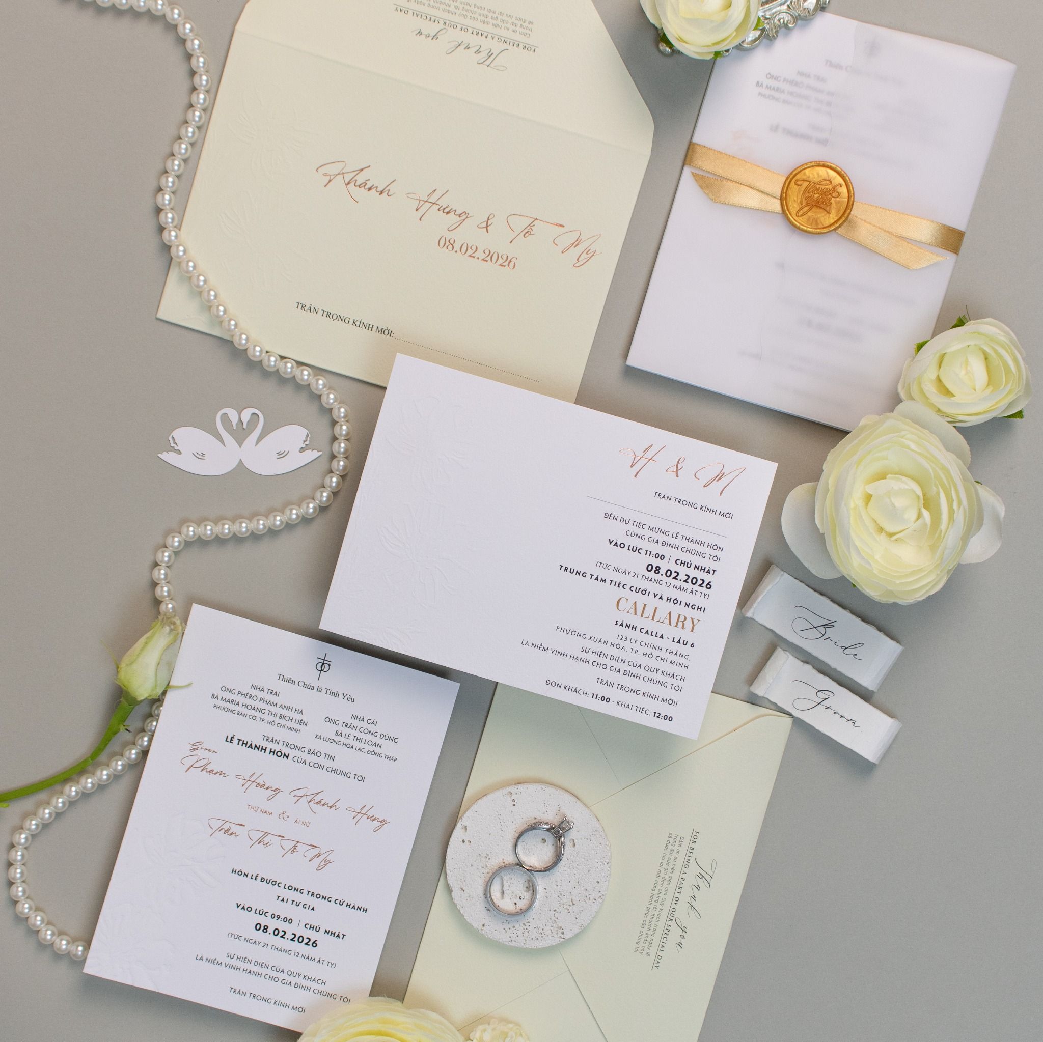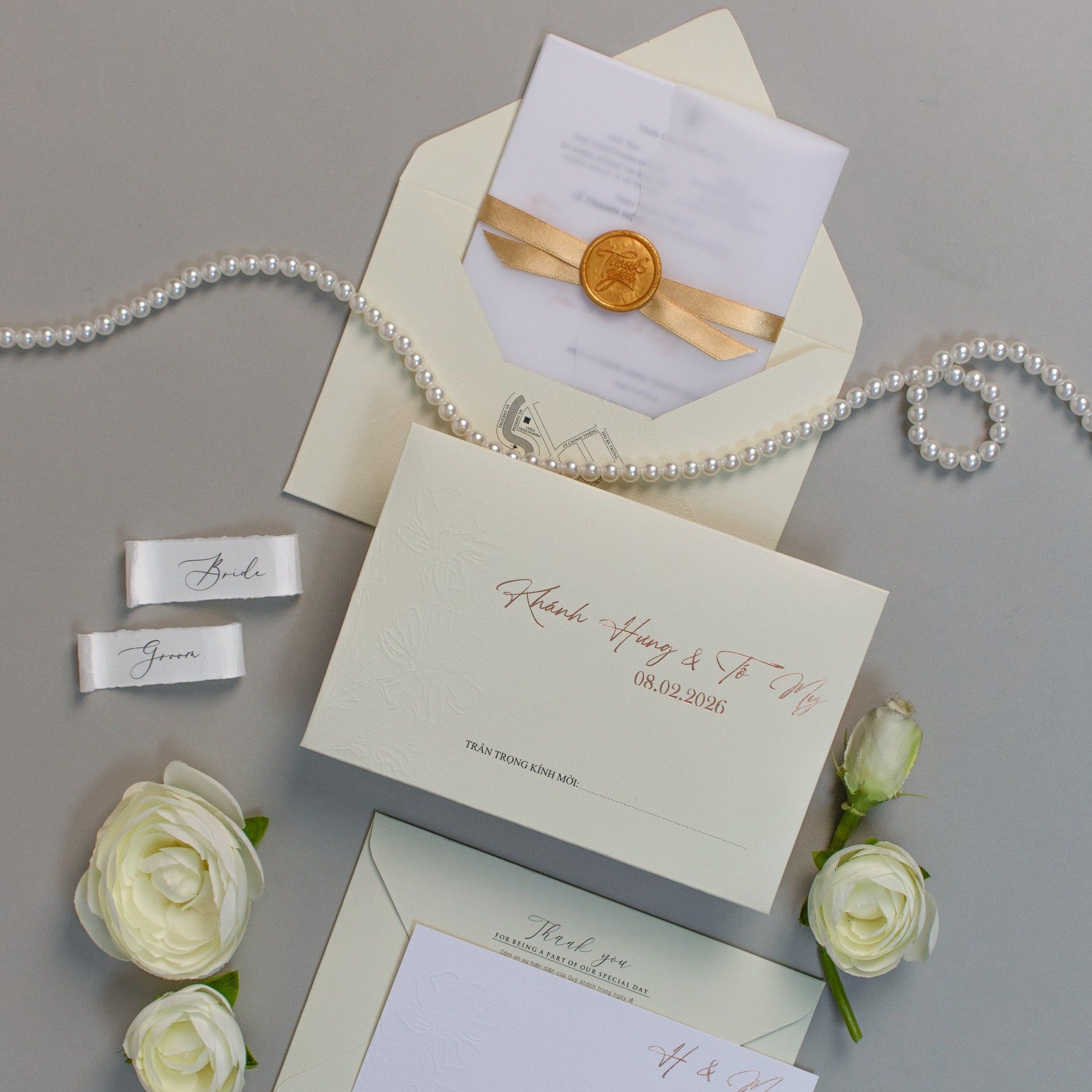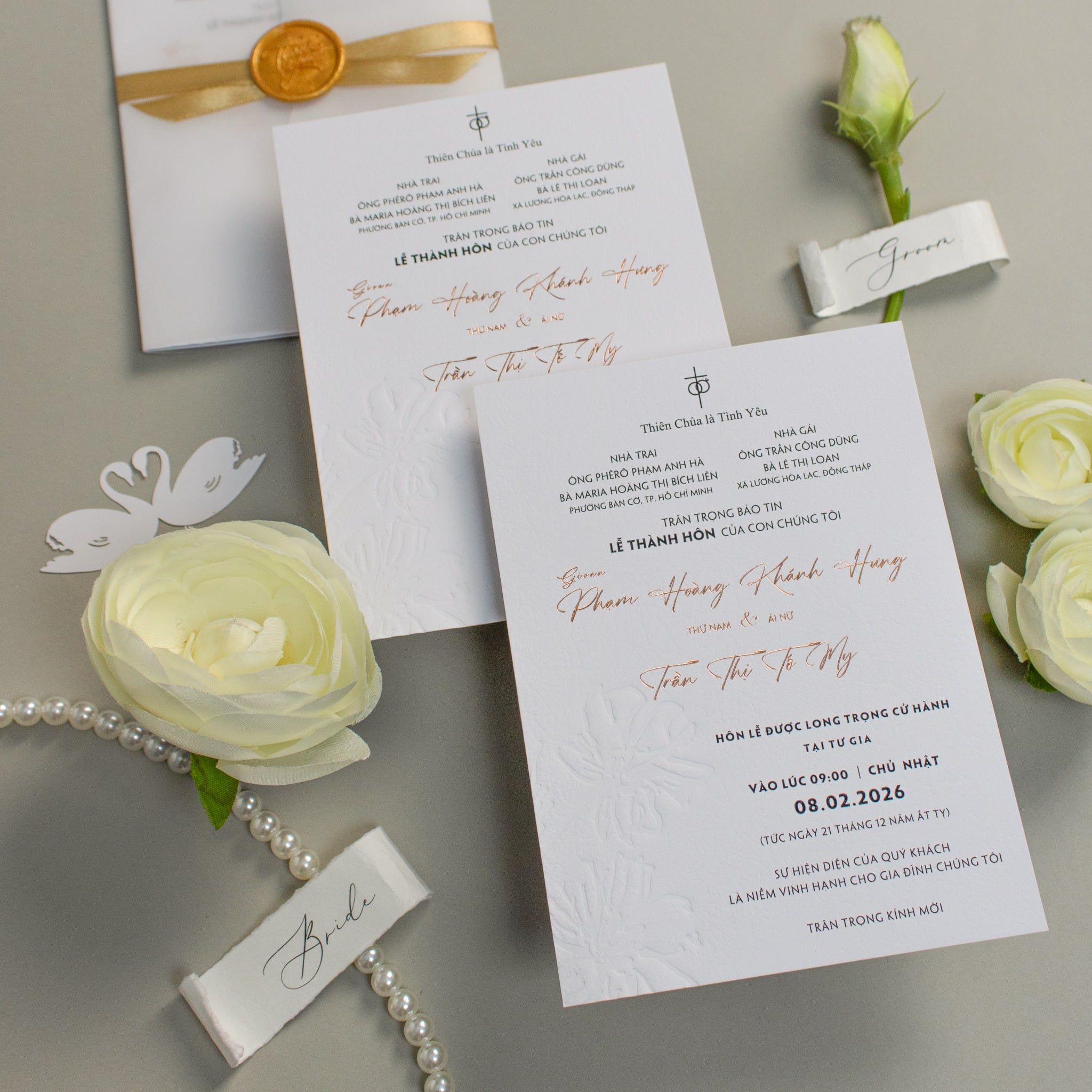 Cầm trên tay bộ thiệp của Khánh Hưng và Tú My, người ta cảm nhận ngay được sự chỉn chu từ chất liệu giấy mỹ thuật kem cán vân nhẹ nhàng đến những đường ép kim rose gold sắc sảo. Điểm nhấn đắt giá nhất chính là đóa cúc họa mi được in dập nổi thủ công, tạo nên hiệu ứng 3D sống động và tinh tế trong từng điểm chạm. Không cần quá cầu kỳ, chính sự tối giản trong bố cục và dấu ấn sáp vàng đồng đã tạo nên một lời mời đầy trân trọng. Đây không chỉ là một tờ giấy báo tin, mà là mảnh ghép đầu tiên vẽ nên không gian tiệc cưới sang trọng. Từng chi tiết nhỏ từ nét dập nổi hoa cúc mỏng manh đến sự lấp lánh của nhũ đồng đều tôn lên vẻ đẹp vượt thời gian, hứa hẹn một khởi đầu viên mãn cho lứa đôi.
