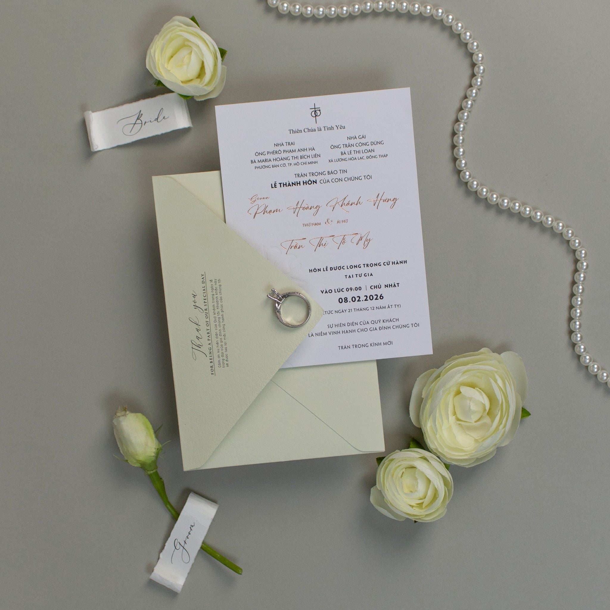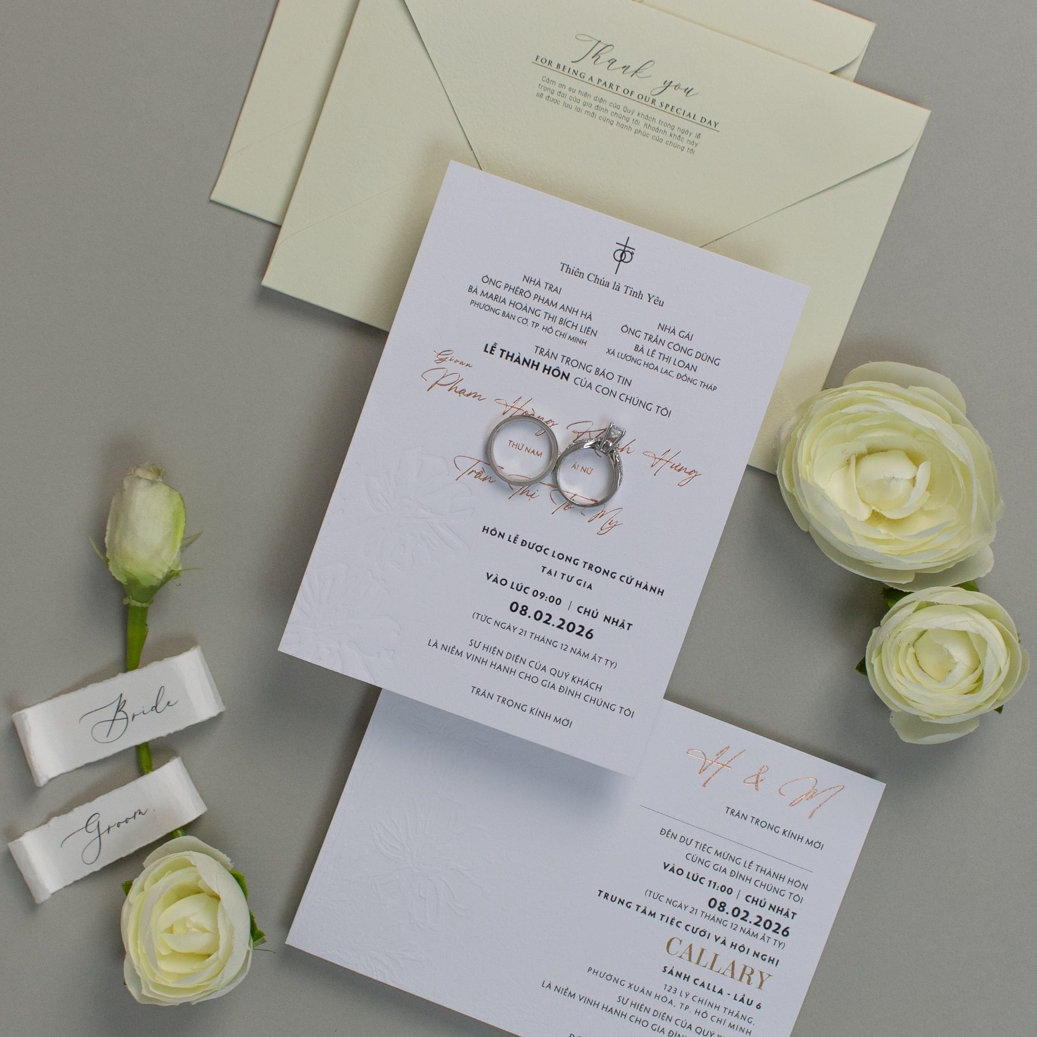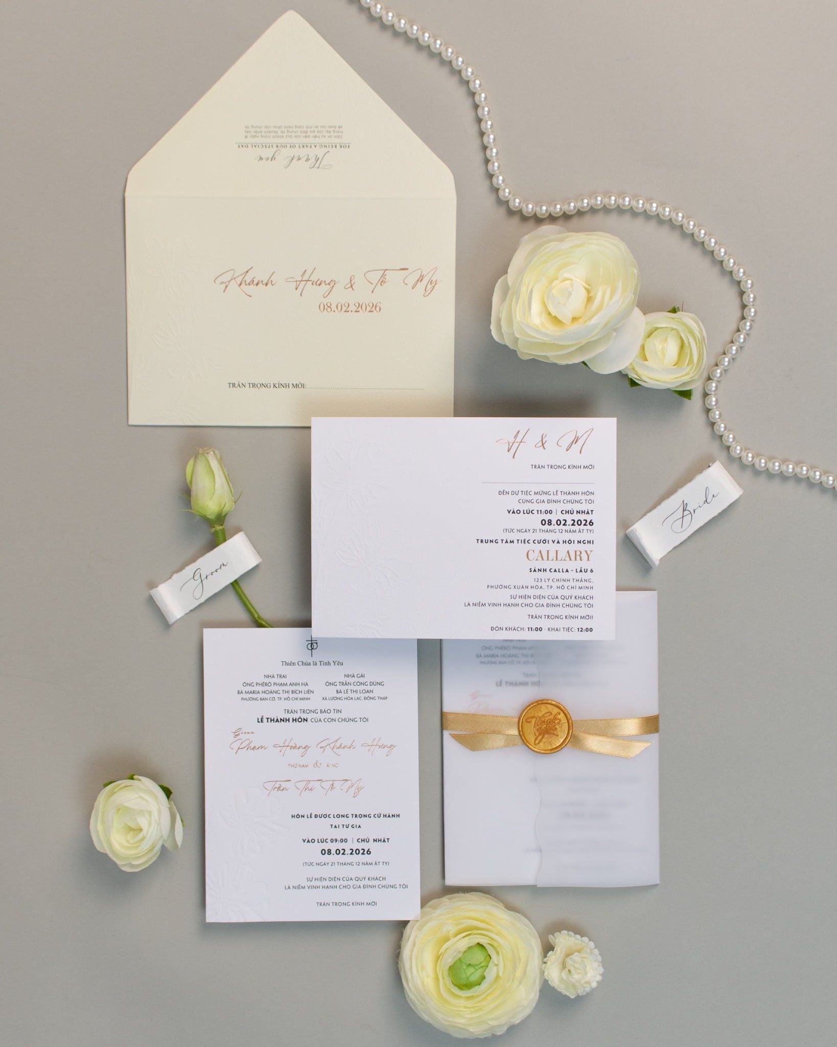 Cầm trên tay bộ thiệp của Khánh Hưng và Tú My, người ta cảm nhận ngay được sự chỉn chu từ chất liệu giấy mỹ thuật kem cán vân nhẹ nhàng đến những đường ép kim rose gold sắc sảo. Điểm nhấn đắt giá nhất chính là đóa cúc họa mi được in dập nổi thủ công, tạo nên hiệu ứng 3D sống động và tinh tế trong từng điểm chạm. Không cần quá cầu kỳ, chính sự tối giản trong bố cục và dấu ấn sáp vàng đồng đã tạo nên một lời mời đầy trân trọng. Đây không chỉ là một tờ giấy báo tin, mà là mảnh ghép đầu tiên vẽ nên không gian tiệc cưới sang trọng. Từng chi tiết nhỏ từ nét dập nổi hoa cúc mỏng manh đến sự lấp lánh của nhũ đồng đều tôn lên vẻ đẹp vượt thời gian, hứa hẹn một khởi đầu viên mãn cho lứa đôi.