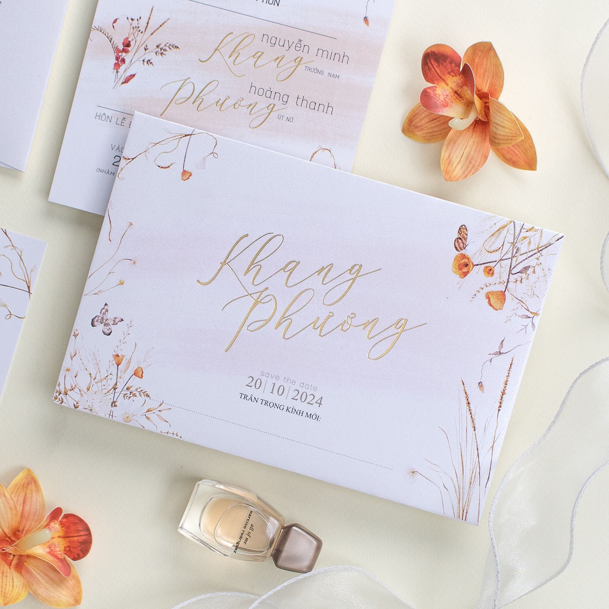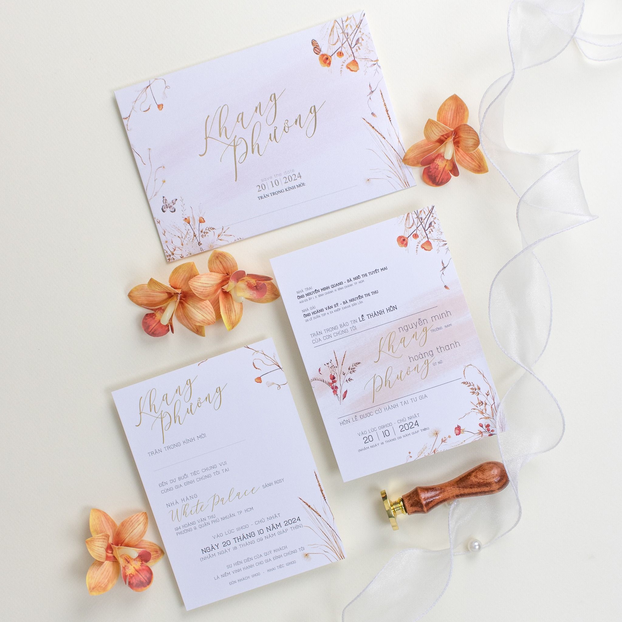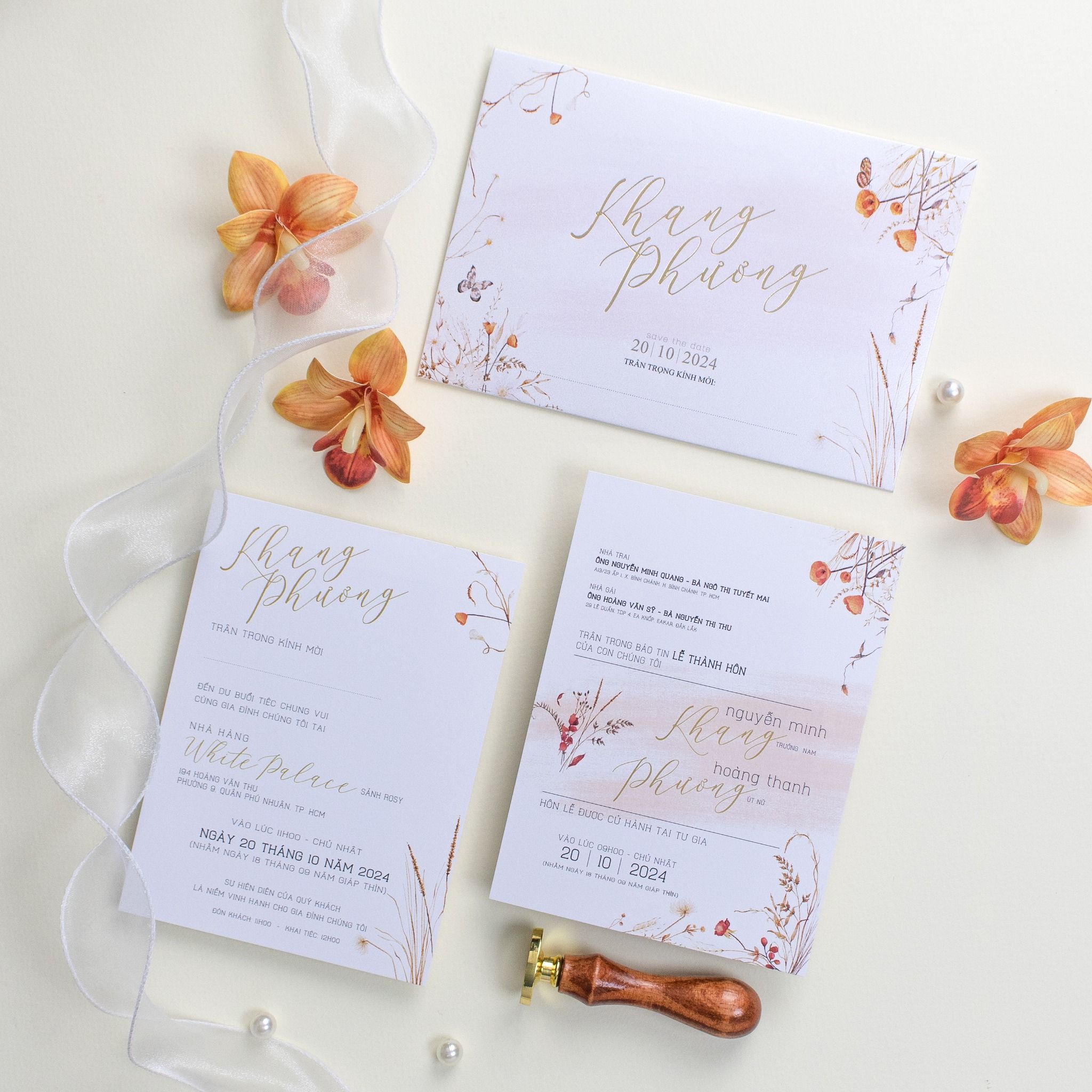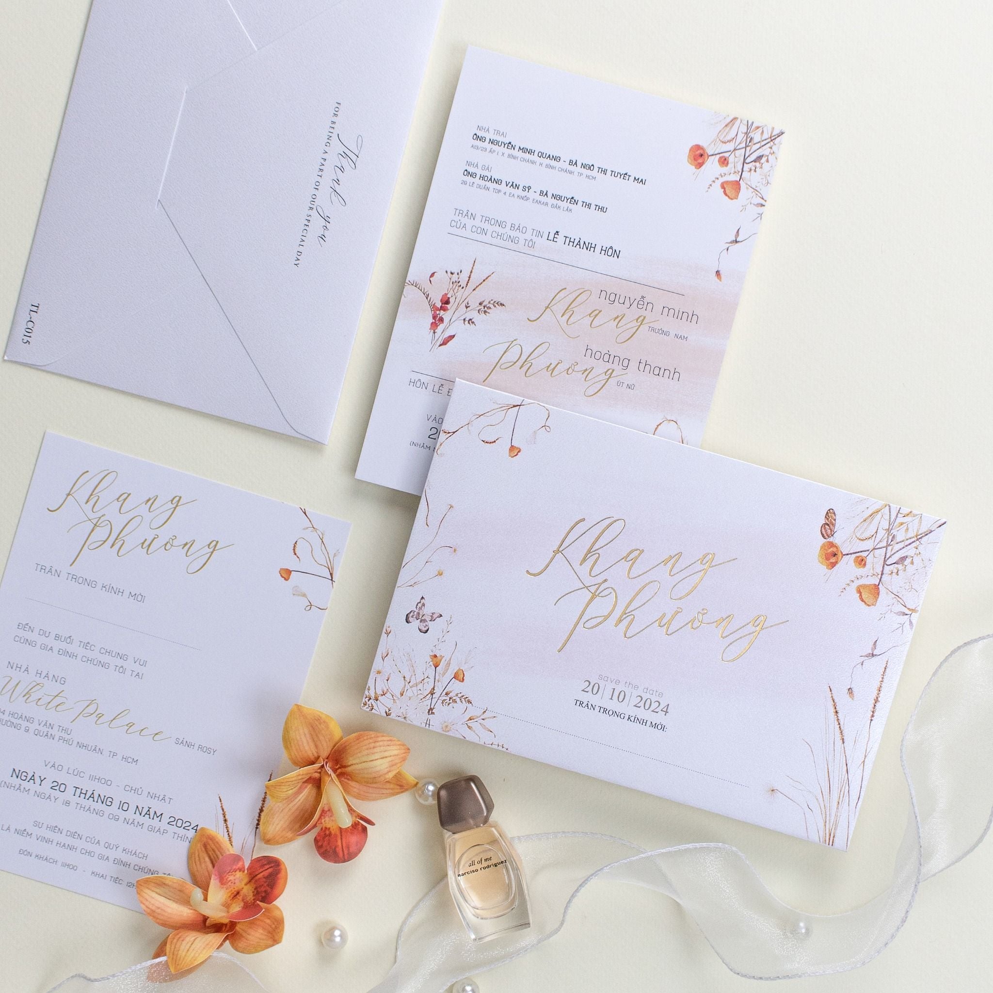 Mẫu thiệp cưới này mở ra một không gian đám cưới lãng mạn. Điểm nhấn đầu tiên nằm ở chất liệu giấy ánh kim trắng sang trọng, tỏa ra hiệu ứng lấp lánh nhẹ nhàng mỗi khi bắt sáng. Tên cô dâu chú rể được ép nhũ vàng tinh xảo, tạo nên vẻ ngoài quyền quý và bền vững theo thời gian. Xuyên suốt từ bìa thư đến ruột thiệp là những vệt màu loang nghệ thuật. Tông màu cam ấm chủ đạo từ những nhành hoa lan và họa tiết hoa cỏ khô mang lại cảm giác nồng ấm, chân thành. Thiết kế này không chỉ là một lời mời, mà còn là lời tự sự về một tình yêu thuần khiết nhưng không kém phần rực rỡ. Mẫu thiệp hứa hẹn dẫn lối khách mời bước vào một buổi lễ kỷ niệm đầy xúc cảm và sang trọng.