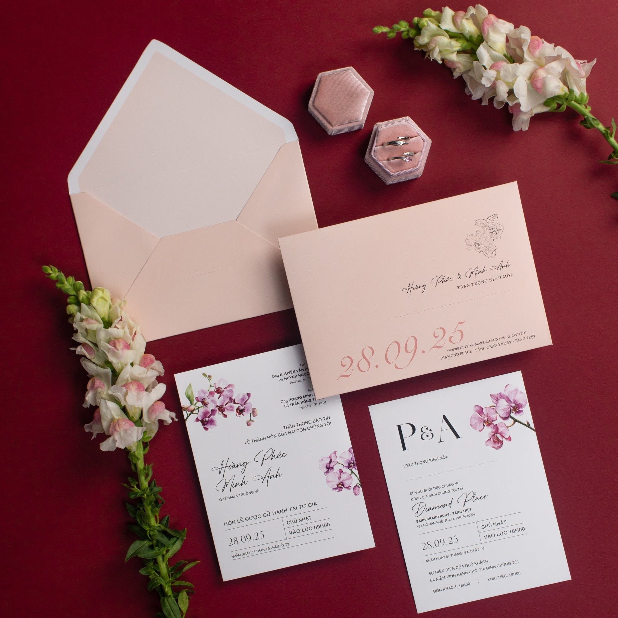 Đánh dấu khởi đầu câu chuyện tình yêu vĩnh cửu bằng mẫu thiệp cưới hoa anh đào lãng mạn này. Lấy cảm hứng từ vẻ đẹp tinh khôi và mong manh của những cánh hoa anh đào đầu xuân, mỗi tấm thiệp là một lời thì thầm ngọt ngào về hạnh phúc. Sắc hồng pastel nhẹ nhàng hòa quyện cùng chất liệu giấy cao cấp, tạo nên cảm giác sang trọng, thanh lịch. Họa tiết hoa anh đào được vẽ tay tỉ mỉ, như những nét chấm phá dịu dàng, báo hiệu một tình yêu đơm hoa kết trái. Thiệp còn được điểm xuyết bằng font chữ bay bổng, uyển chuyển, giúp truyền tải trọn vẹn thông điệp yêu thương. Hãy để thiệp cưới hoa anh đào của chúng tôi trở thành sứ giả đưa tin về ngày vui trọng đại của bạn.Khi bạn đặt trọn niềm tin vào Thiệp cưới KK để chuẩn bị cho ngày khởi đầu hạnh phúc, chúng tôi hiểu rằng sự riêng tư là điều quý giá nhất.
