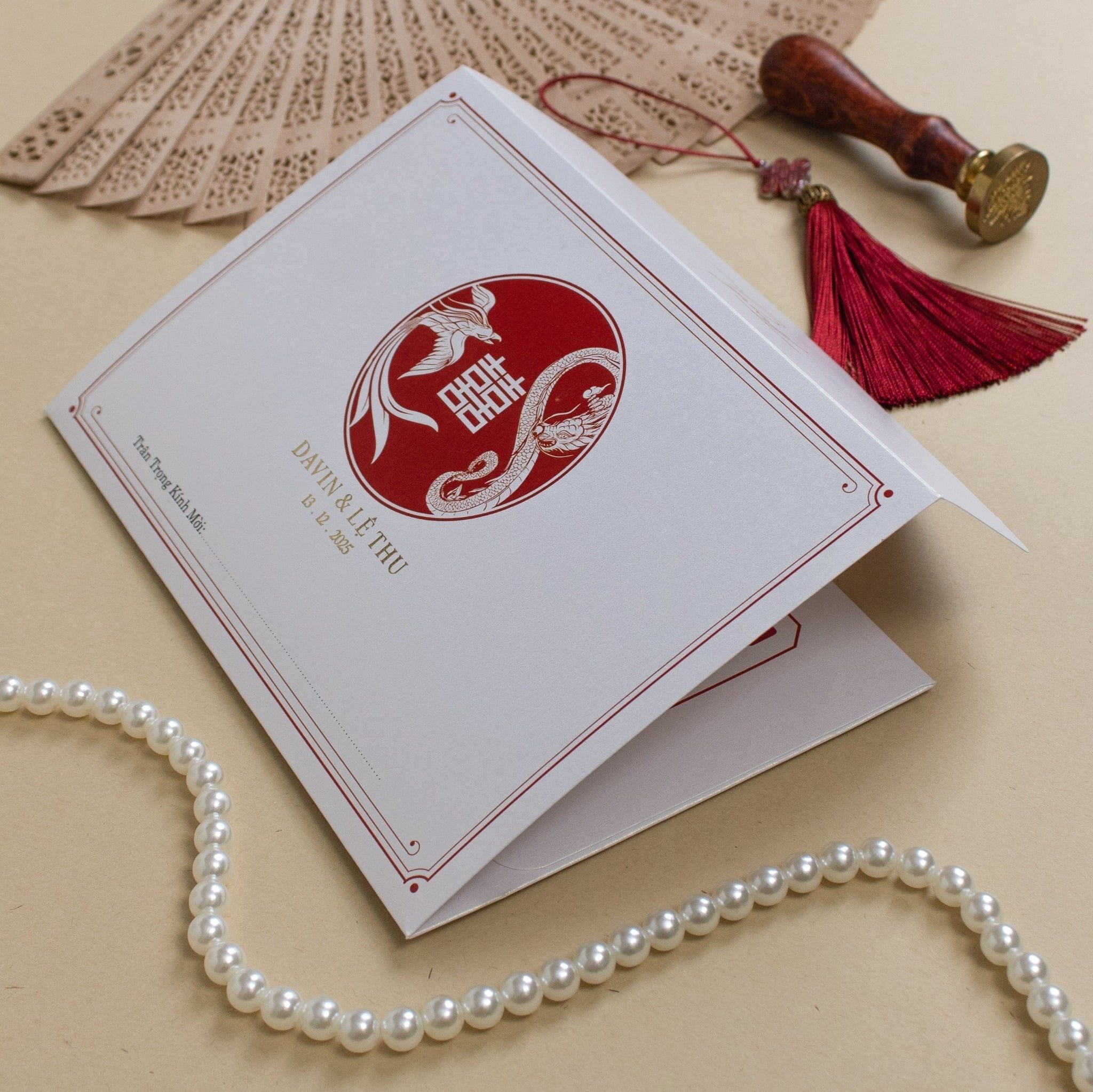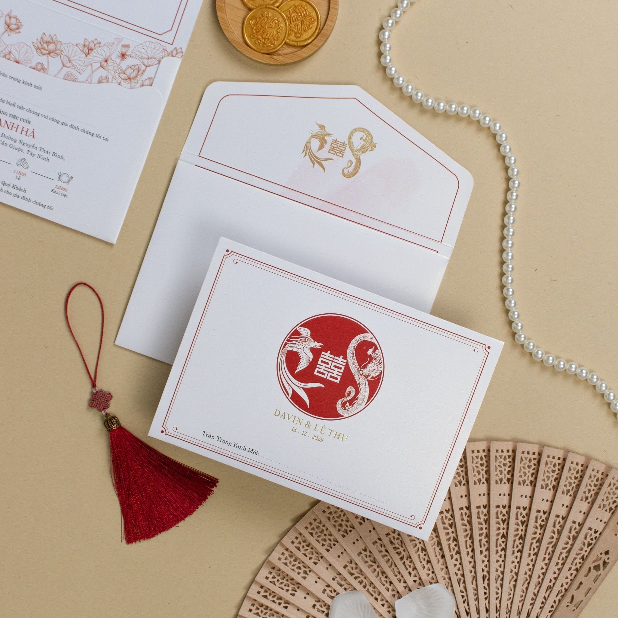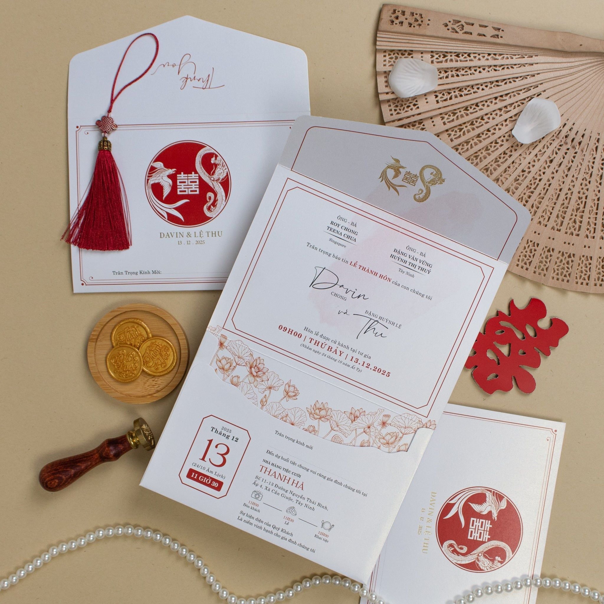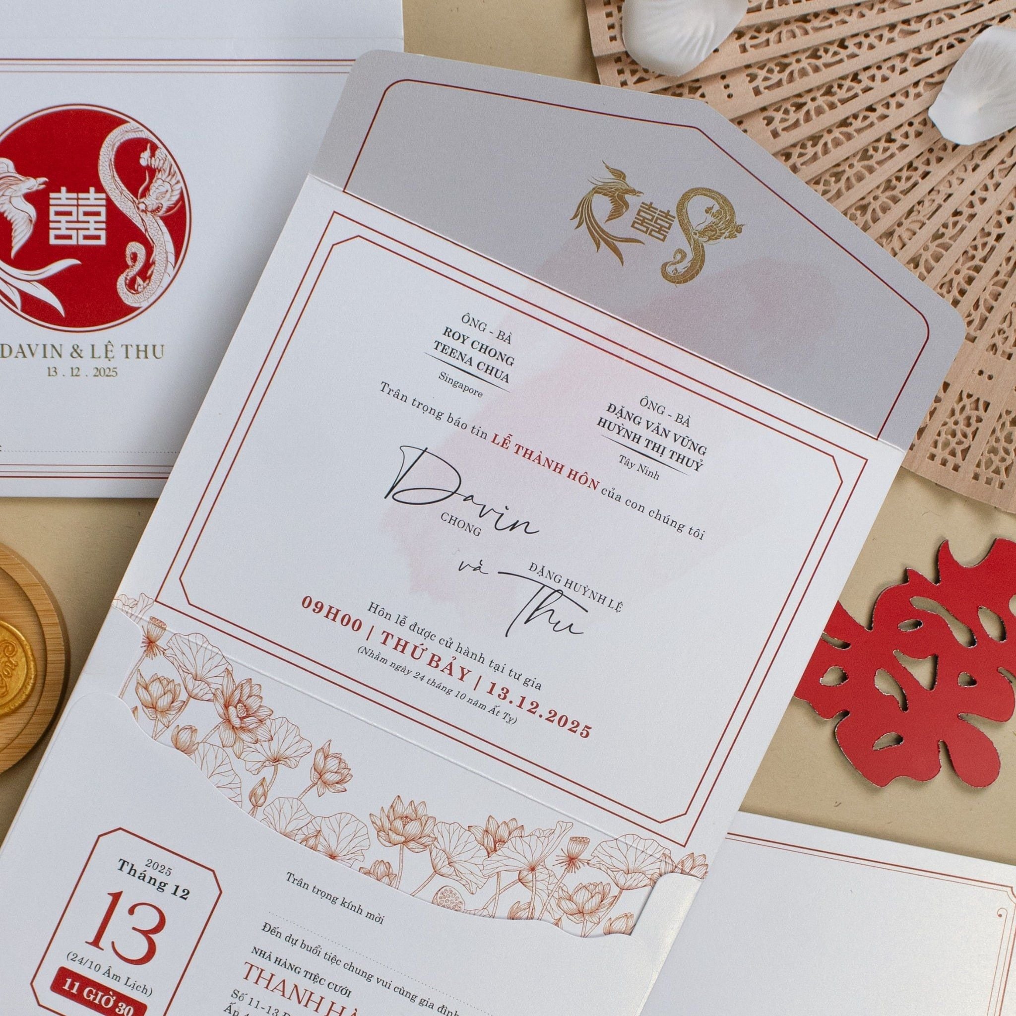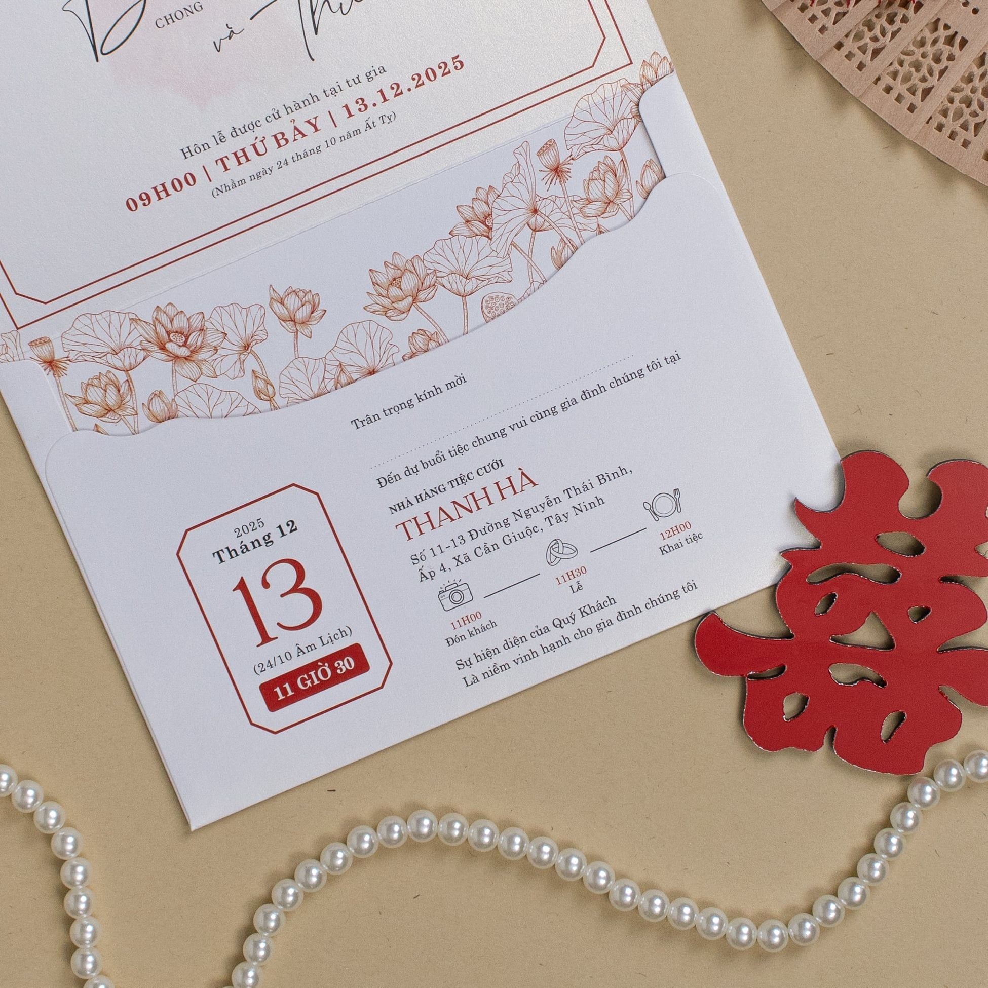 Cầm trên tay tấm thiệp "Hồng Liên Giao Ước", bạn sẽ cảm nhận rõ sự chỉn chu trong từng thớ giấy mỹ thuật và sự tỉ mỉ của những họa tiết sen vàng thanh tao. Sắc đỏ nồng nàn từ hòa quyện cùng biểu tượng Song Hỷ cách điệu, không đơn thuần là lời thông báo ngày vui mà còn là một tác phẩm nghệ thuật gói trọn ước nguyện về một cuộc hôn nhân viên mãn. Mỗi chi tiết, từ con dấu sáp cổ điển đến những hạt ngọc trai lấp lánh, đều được sắp đặt để kể lại câu chuyện tình yêu riêng biệt, khiến mỗi vị khách khi nhận thiệp đều thấy rõ sự trân trọng và gu thẩm mỹ tinh tế của đôi bạn.