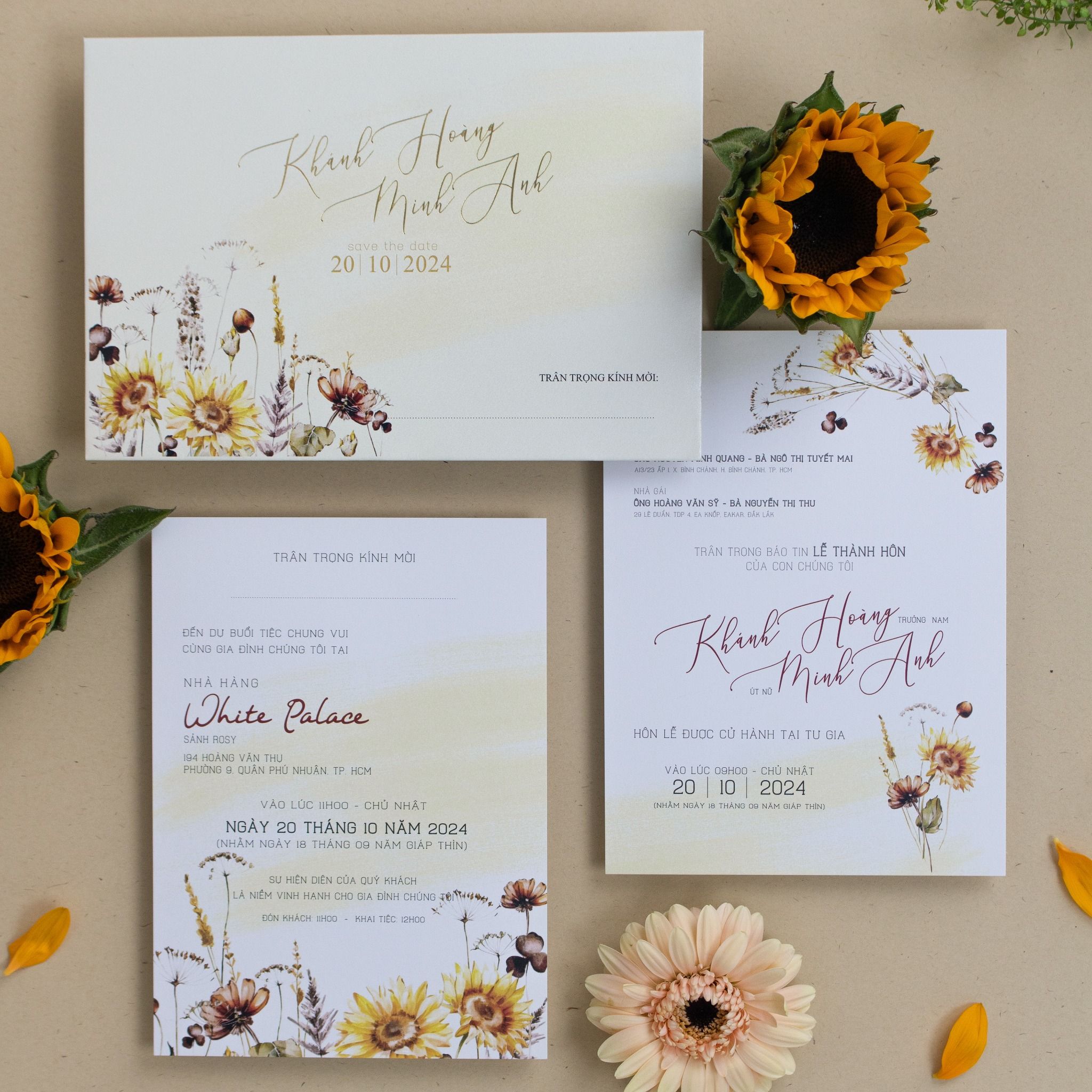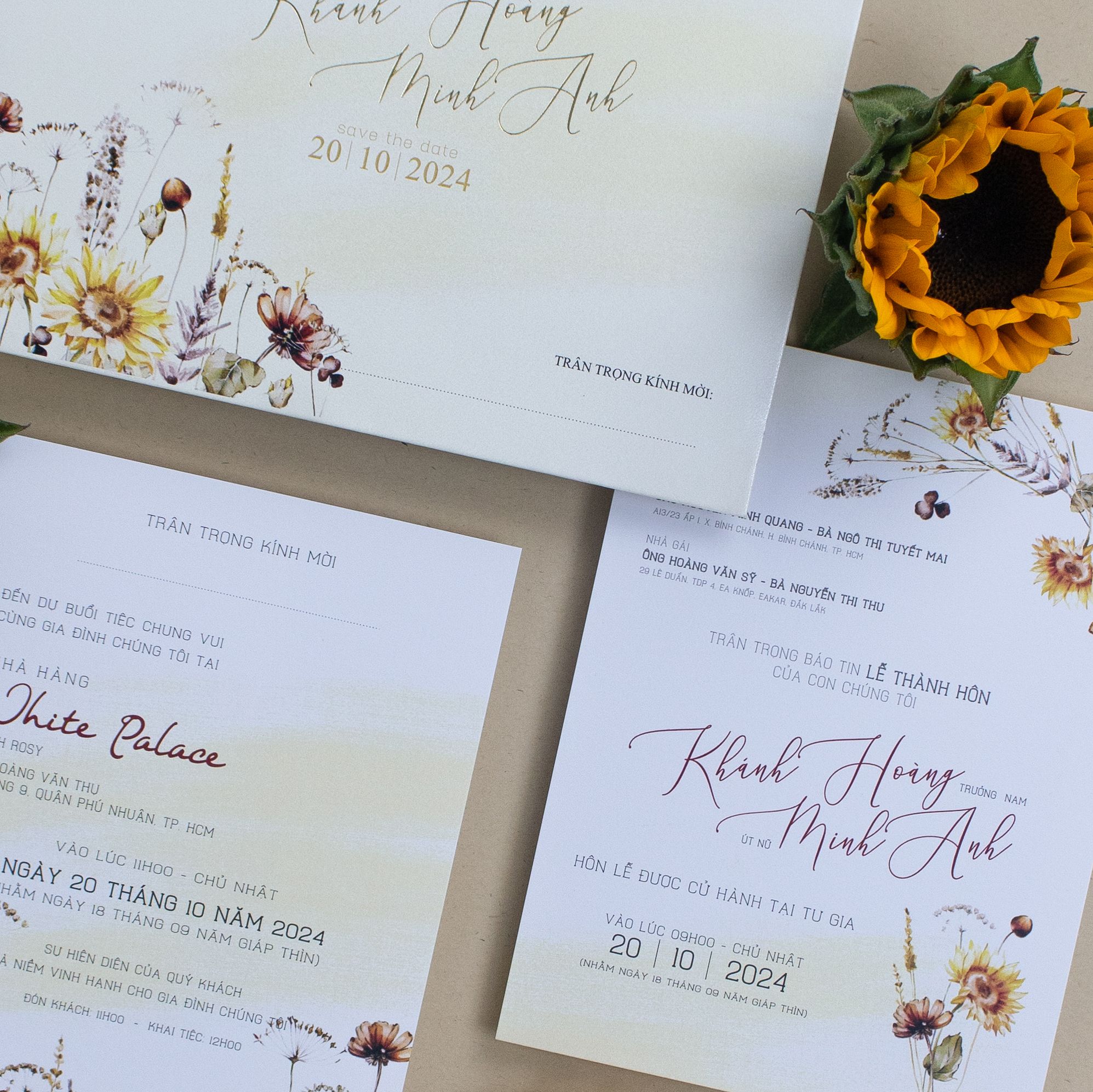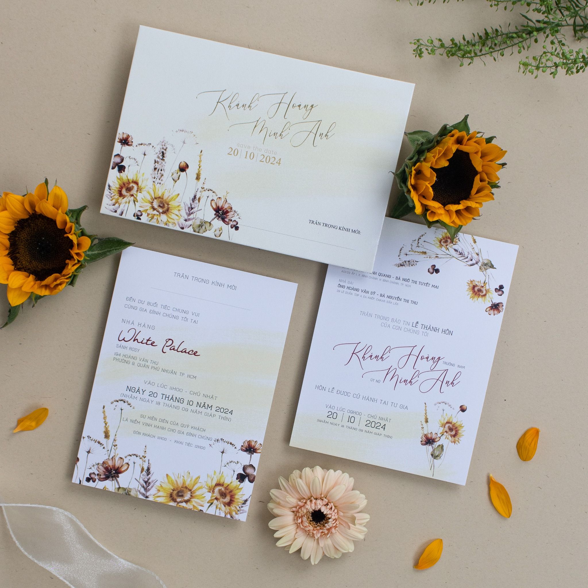 Chạm tay vào tấm thiệp, bạn sẽ cảm nhận ngay cái hơi ấm dịu dàng của một ngày nắng đẹp. Không chỉ dừng lại ở một lời mời, bộ thiệp là bản giao hưởng giữa sắc vàng rạng rỡ của hoa hướng dương và nét mộc mạc, chân thành từ những nhành cỏ dại. Từng đường nét calligraphy thanh mảnh được đặt để tinh tế trên nền giấy ánh kim kem, tạo nên một cảm giác vừa sang trọng vừa gần gũi đến lạ kỳ. Đây chính là lựa chọn dành riêng cho những cặp đôi muốn gửi gắm thông điệp về một tình yêu luôn hướng về phía ánh sáng, bền bỉ và rực rỡ như những đóa hướng dương đón nắng mai.Khi bạn đặt trọn niềm tin vào Thiệp cưới KK để chuẩn bị cho ngày khởi đầu hạnh phúc, chúng tôi hiểu rằng sự riêng tư là điều quý giá nhất.