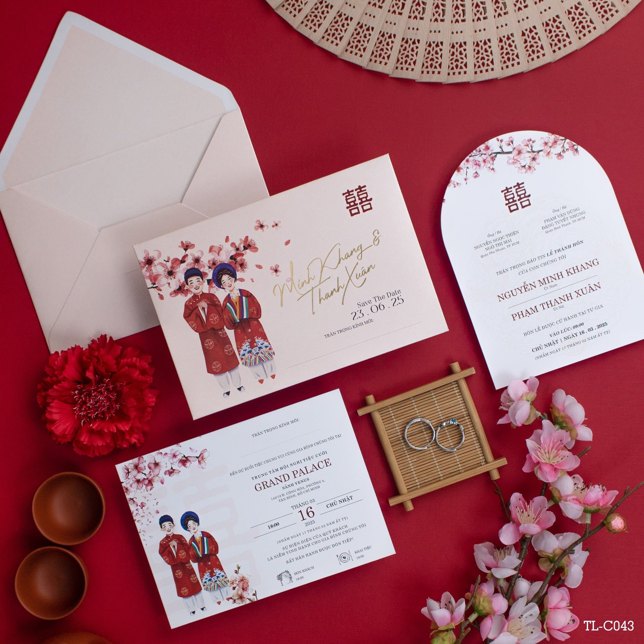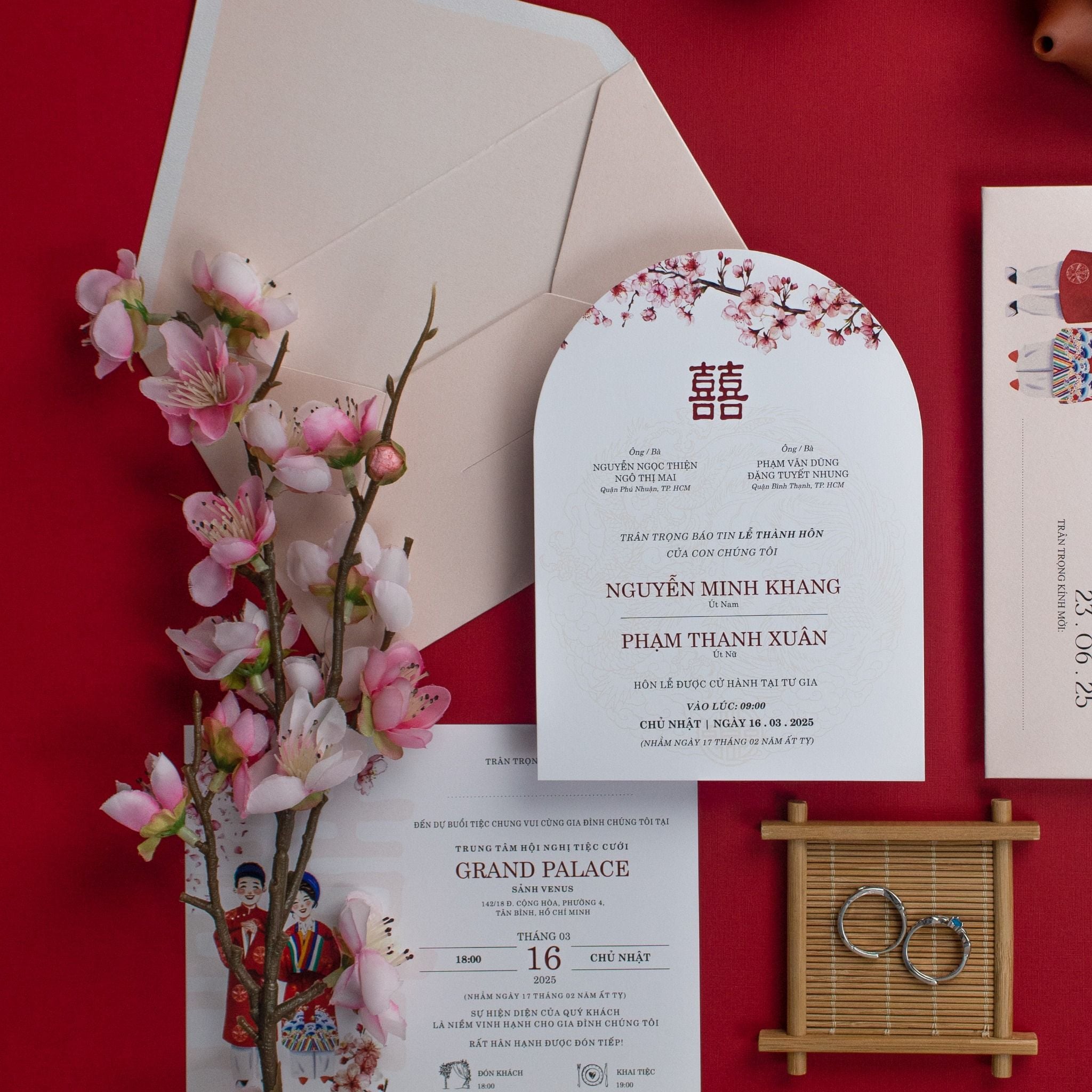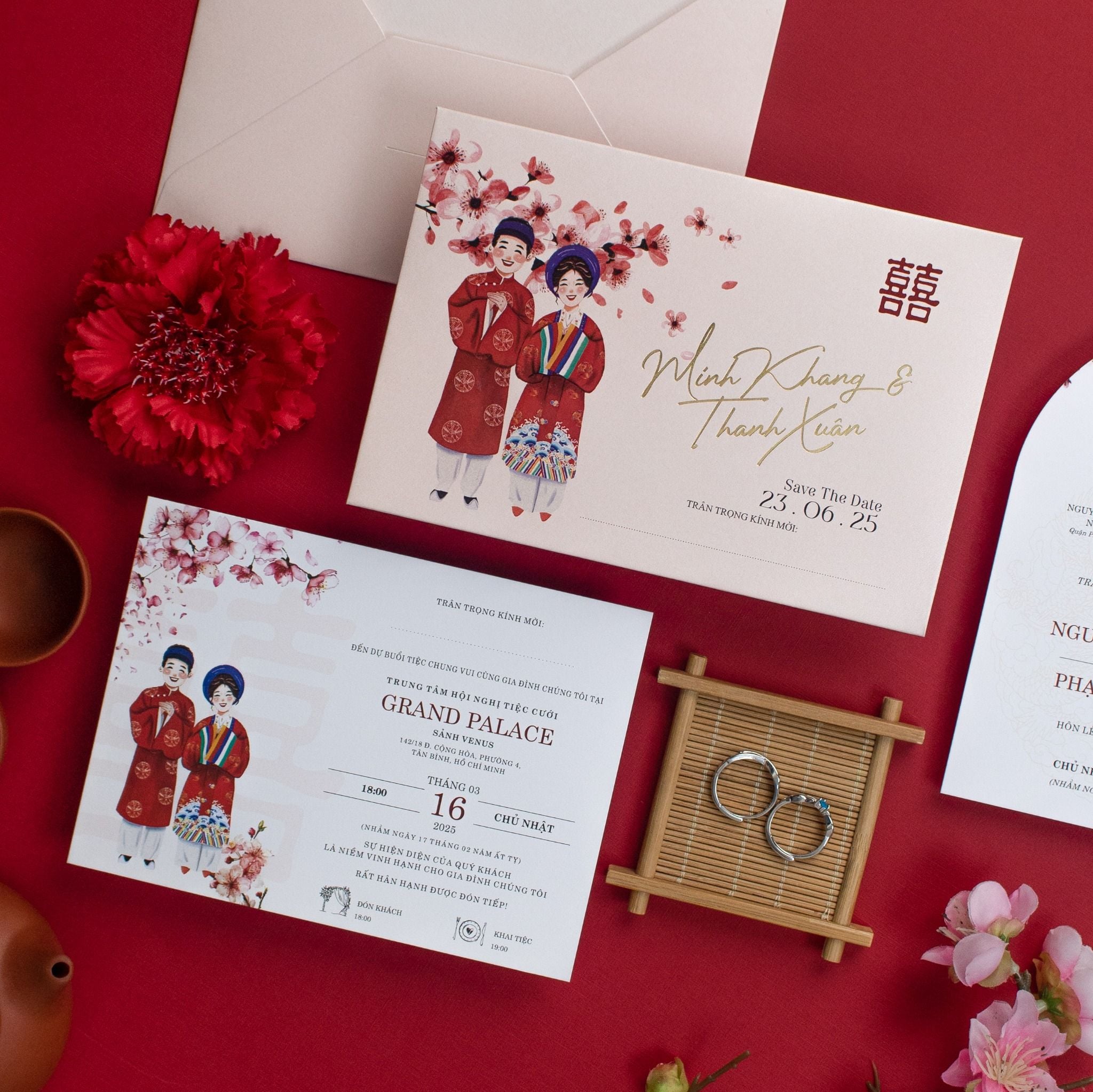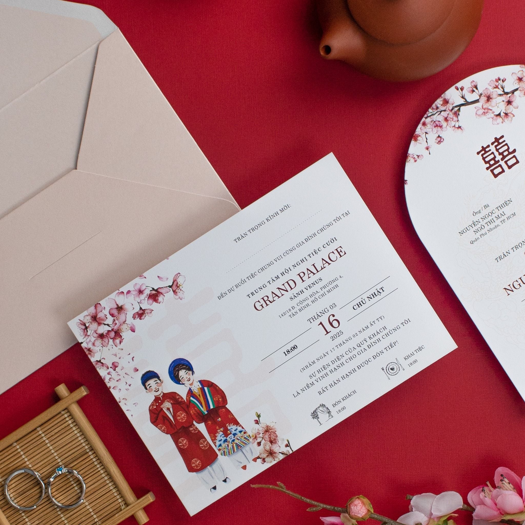 Cầm trên tay tấm thiệp Hỷ Kết Trăm Năm, bạn sẽ cảm nhận được sự tỉ mỉ trong từng nét vẽ tay phác họa đôi uyên ương rạng rỡ trong tà áo dài truyền thống. Sắc hồng pastel dịu ngọt của phông nền mang lại cảm giác thanh tao và lãng mạn, tượng trưng cho một tình yêu thuần khiết và khởi đầu đầy hy vọng. Những cánh hoa đào phớt hồng điểm xuyết nhẹ nhàng quanh tên cô dâu chú rể, tạo nên một tổng thể vừa hoài cổ vừa mang hơi thở hiện đại. Dòng giấy ánh kim có độ bắt sáng nhẹ, tạo hiệu ứng lung linh và sang trọng, đủ để người nhận thấy được sự trân trọng và chỉn chu mà bạn dành cho ngày trọng đại nhất đời mình.