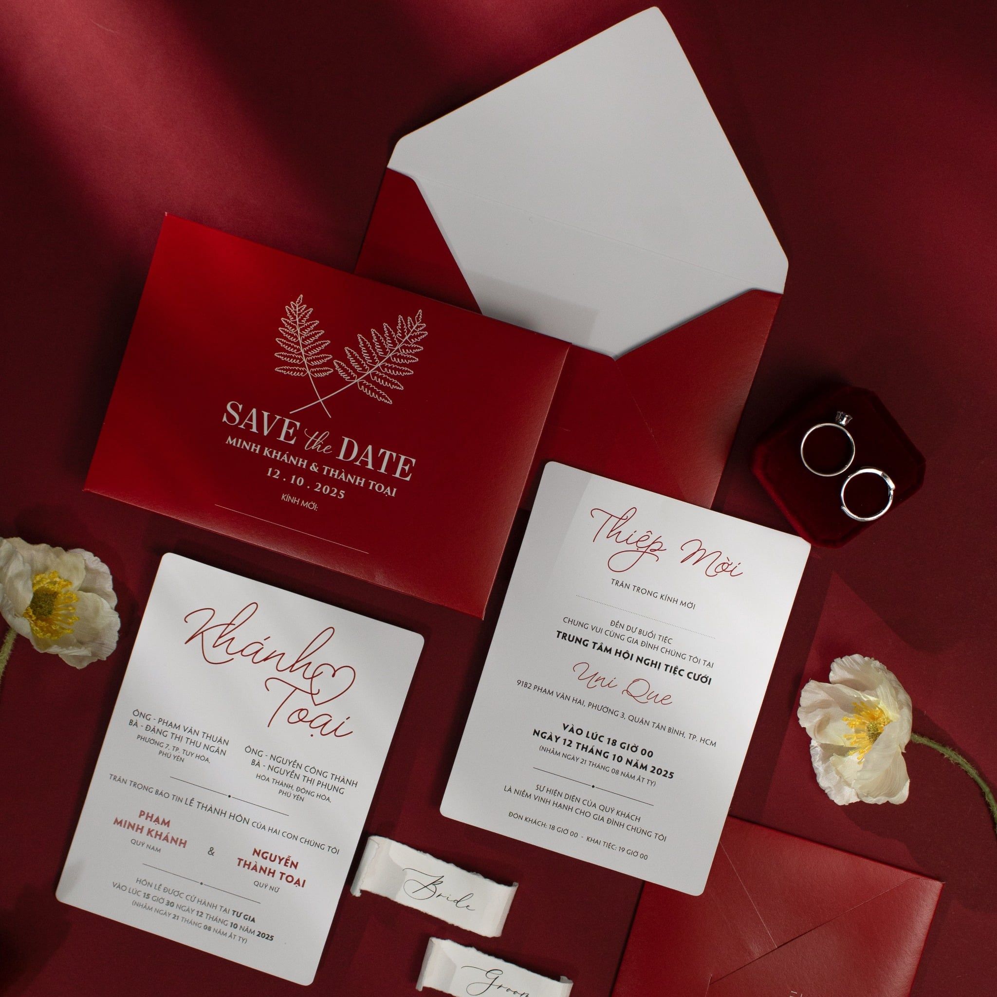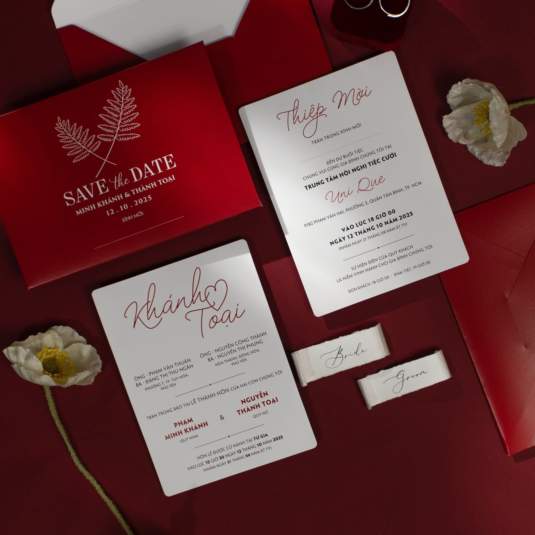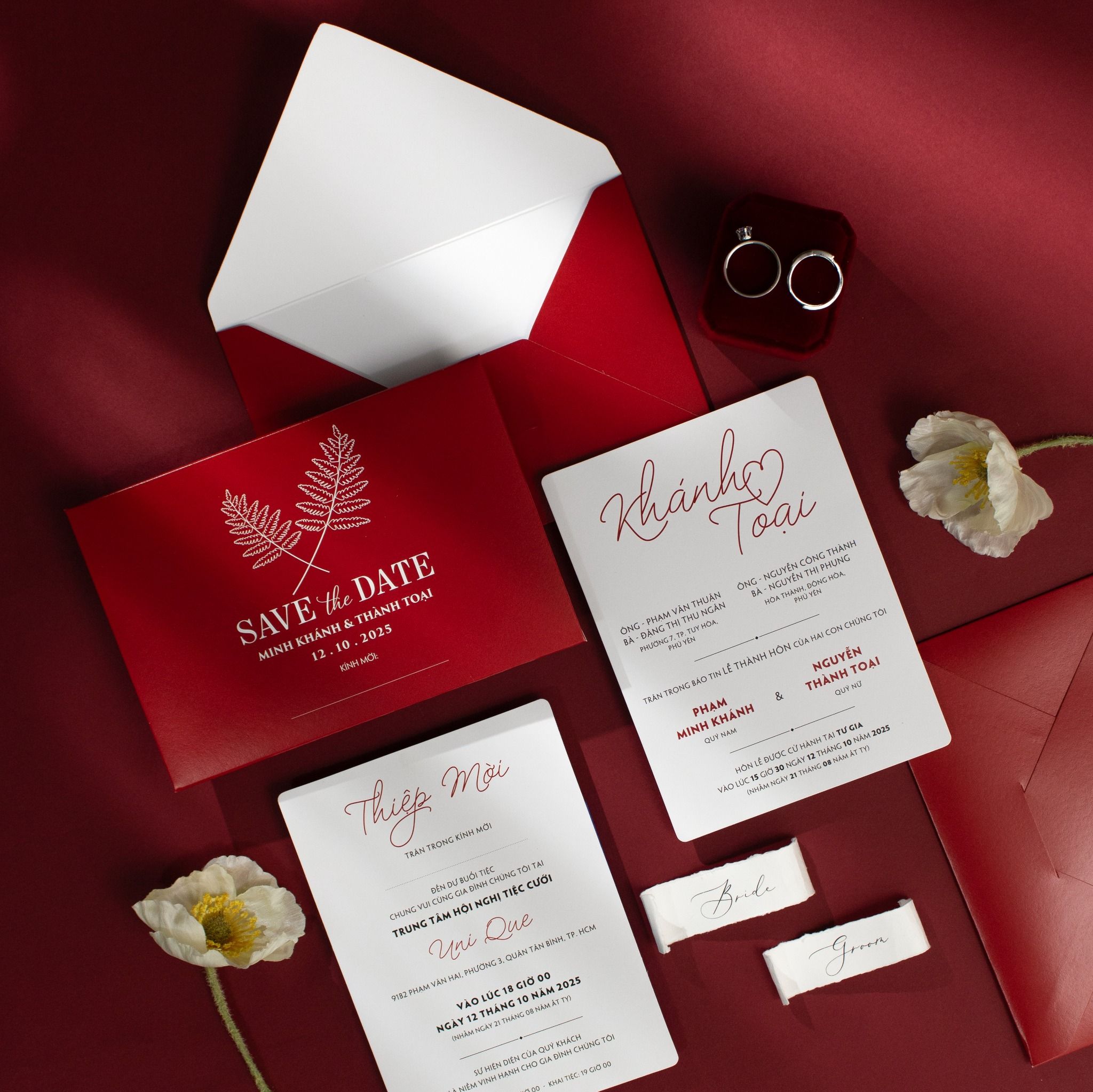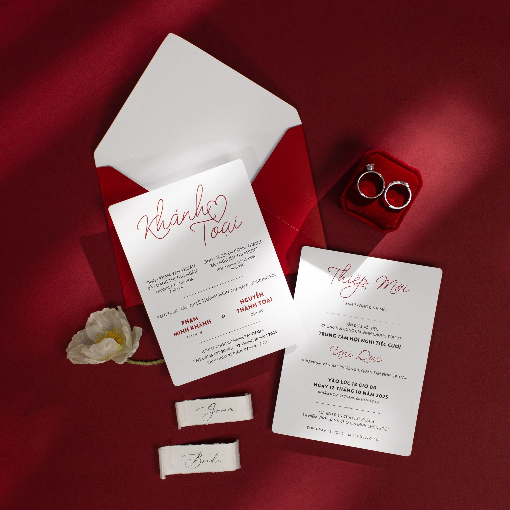 Chạm tay vào chất giấy, bạn sẽ cảm nhận rõ sự tinh khôi của sắc trắng hòa quyện cùng tông đỏ nhung nồng cháy. Bộ thiệp là sự kết hợp hoàn mỹ giữa nét chữ calligraphy bay bổng và bố cục hiện đại, tạo nên một lời mời đầy trân trọng gửi đến những người thân thương. Không cần quá nhiều họa tiết rườm rà, chính sự giản đơn trong thiết kế lại tôn vinh lên trọn vẹn sự sang trọng và gu thẩm mỹ tinh tế của chủ nhân bữa tiệc. Từng chi tiết từ phong bì đỏ thẫm đến font chữ đều được chăm chút tỉ mỉ, như cách bạn nâng niu tình yêu của chính mình.Khi bạn đặt trọn niềm tin vào Thiệp cưới KK để chuẩn bị cho ngày khởi đầu hạnh phúc, chúng tôi hiểu rằng sự riêng tư là điều quý giá nhất.