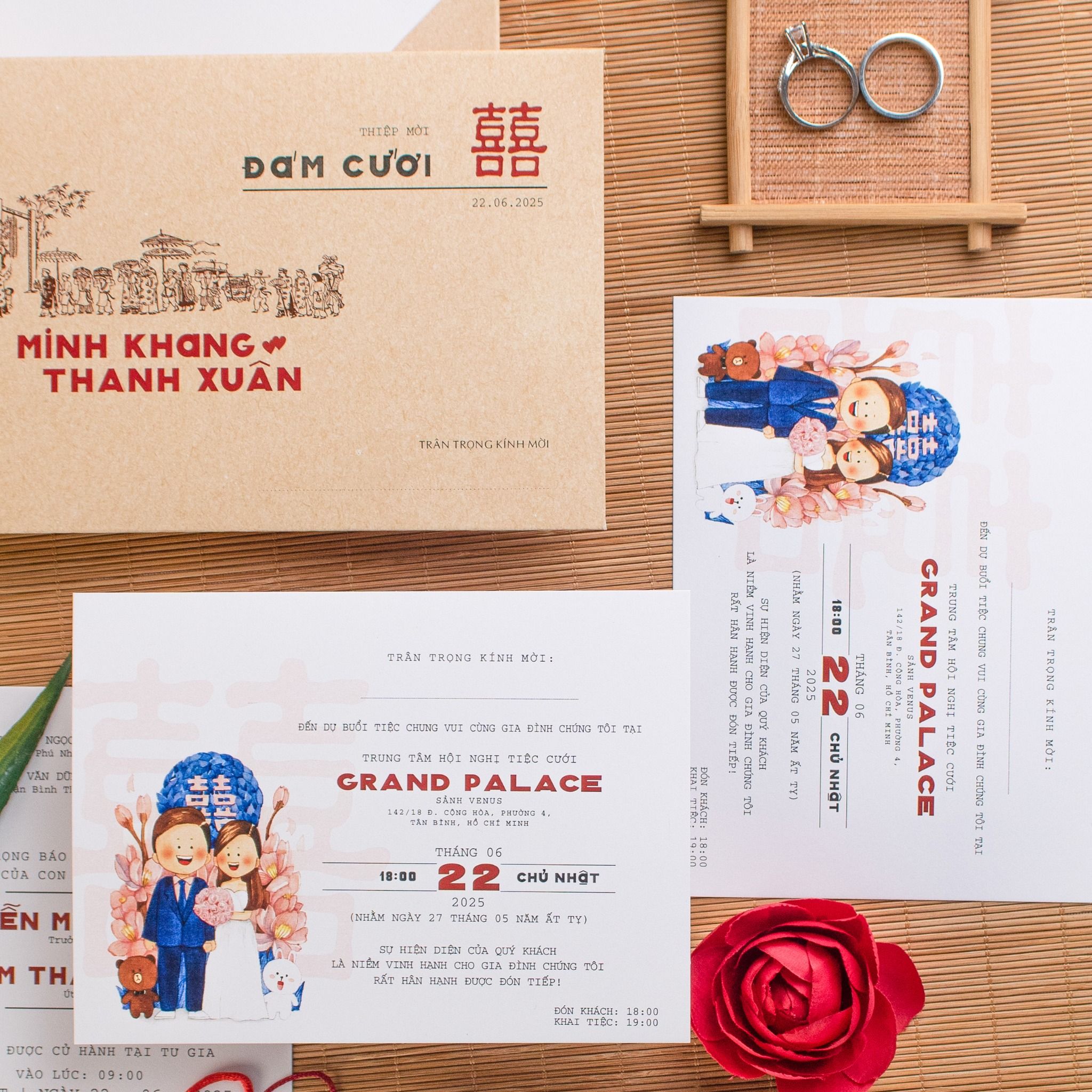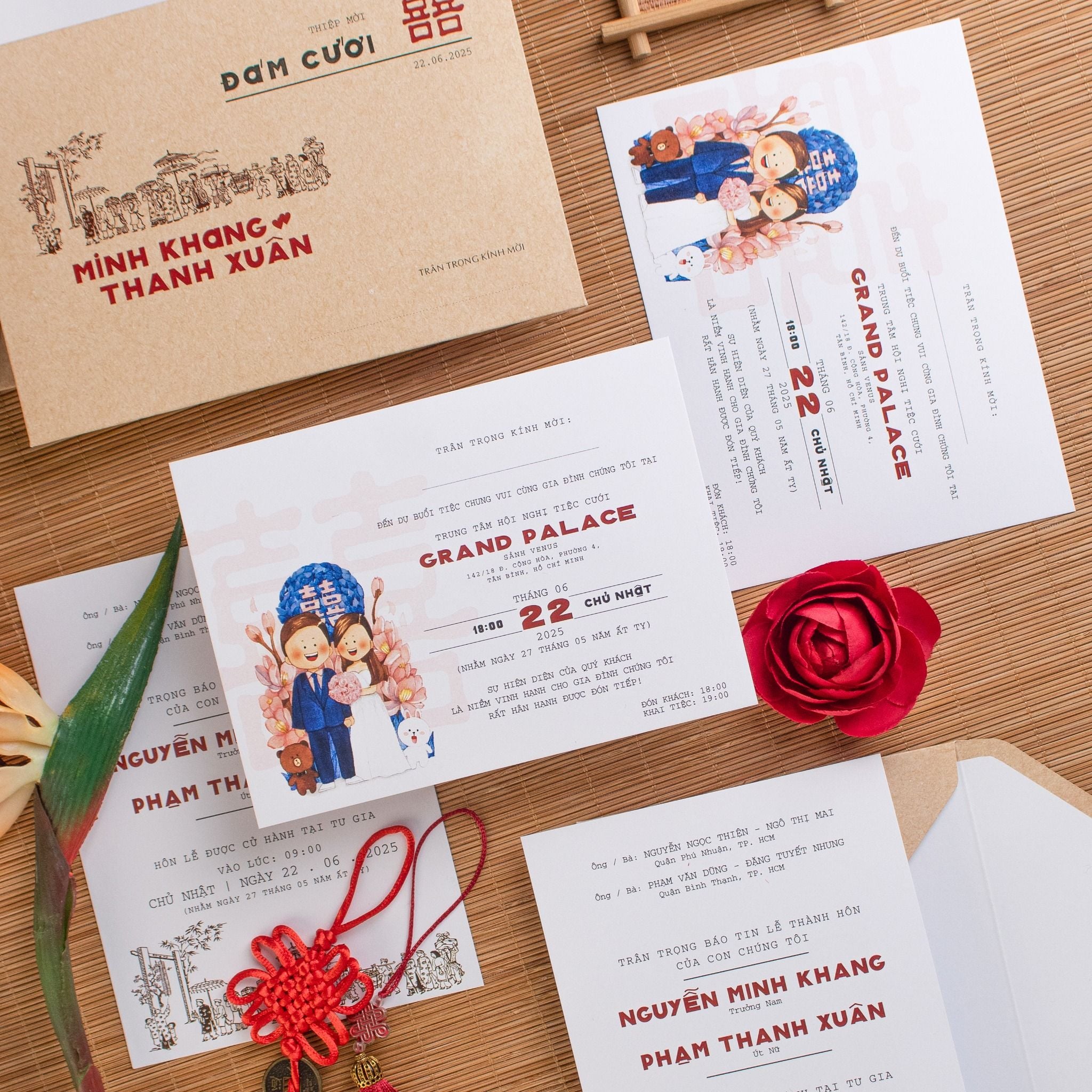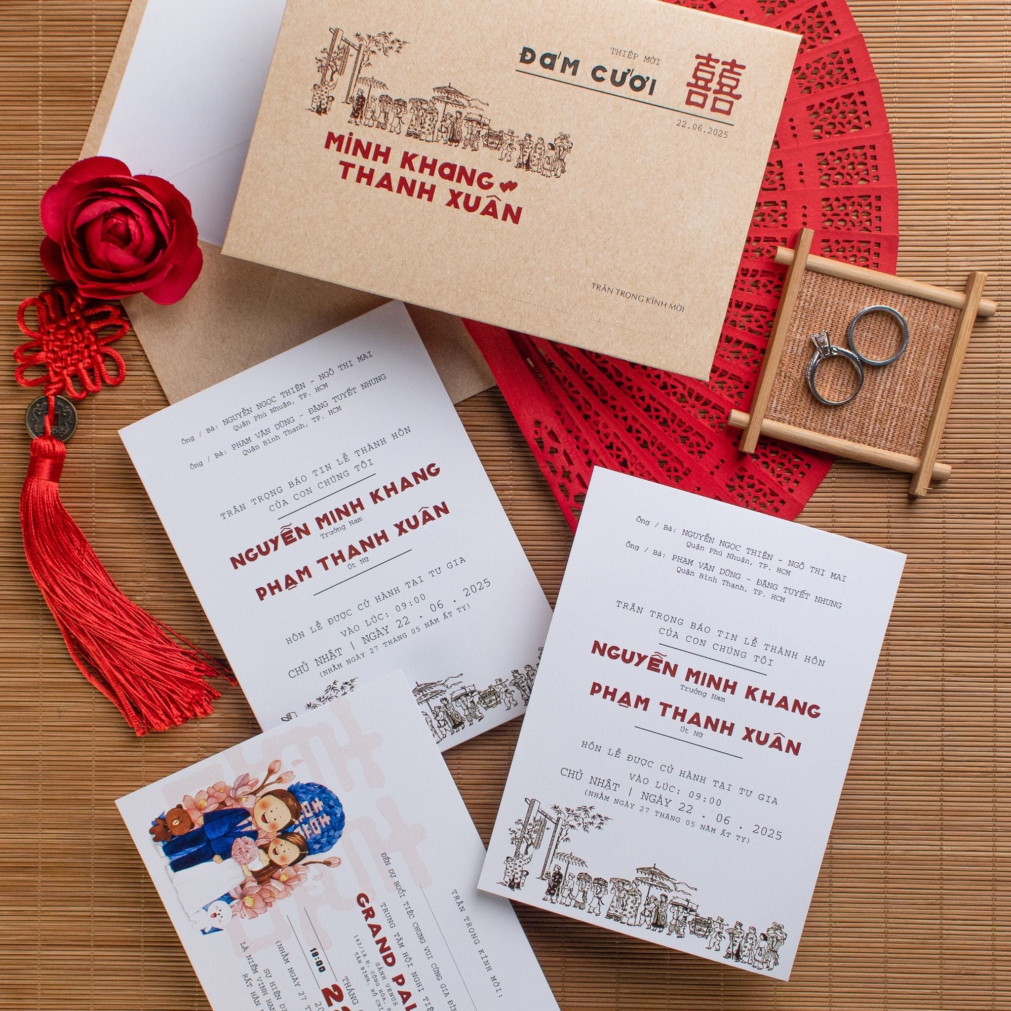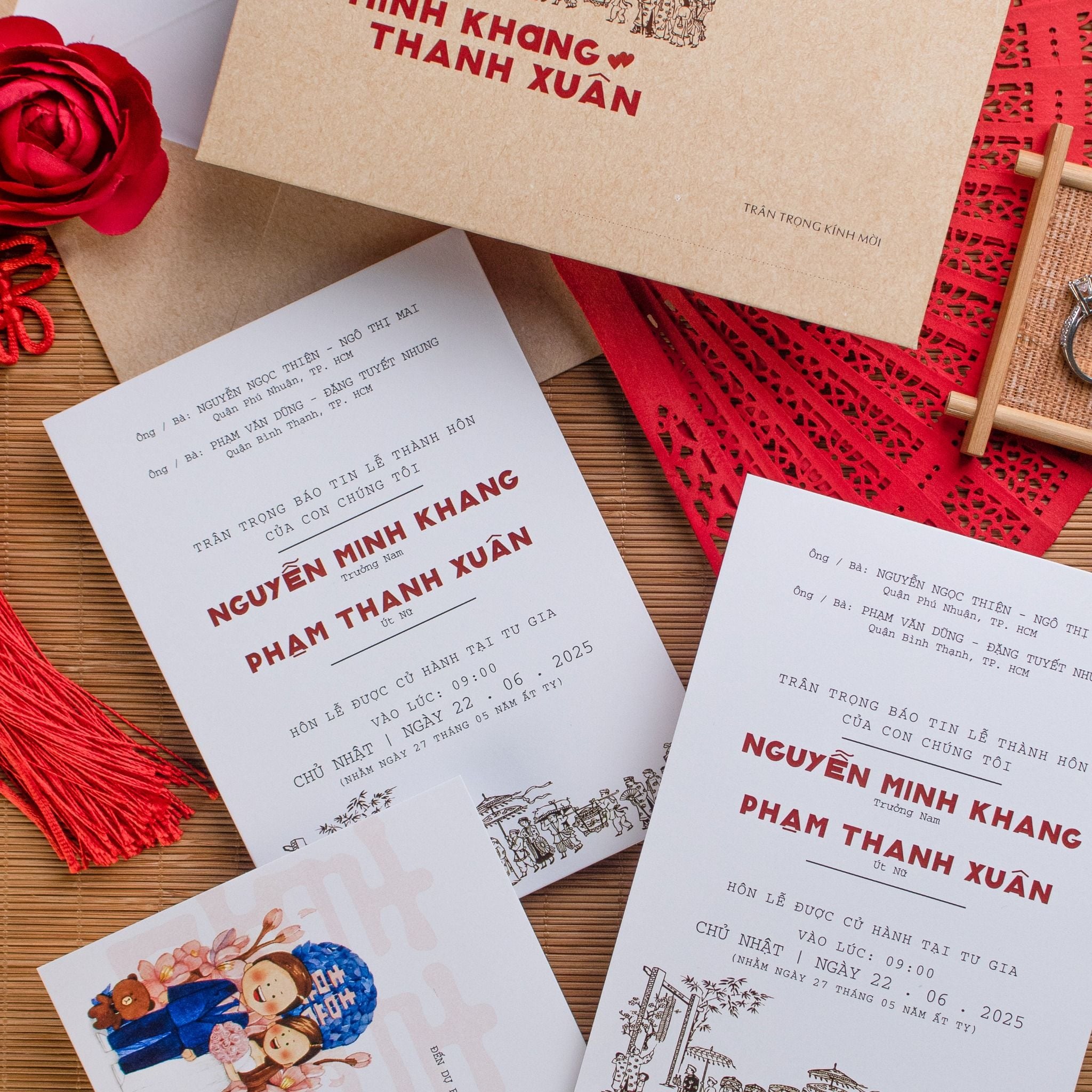 Nghệ thuật thiệp cưới giấy Kraft và phong cách dân gian đương đại Tấm thiệp không đơn thuần là lời thông báo, nó là sự giao thoa tinh tế giữa những giá trị xưa cũ và hơi thở của thời đại mới. Chất liệu giấy ánh kim giả Kraft, mang lại cảm giác mộc mạc nhưng không thô cứng đầy sang trọng. Điểm nhấn chính là bức họa đám rước dâu truyền thống được in sắc nét bằng mực đỏ thẫm, tạo nên sự tương phản quý phái trên nền giấy nâu trầm mặc. Từng chi tiết từ font chữ tối giản đến biểu tượng Song Hỷ đỏ rực đều được sắp đặt có ý đồ, giúp câu chuyện tình yêu của đôi lứa trở nên trọn vẹn và đậm chất thơ ngay từ cái nhìn đầu tiên.Khi bạn đặt trọn niềm tin vào Thiệp cưới KK để chuẩn bị cho ngày khởi đầu hạnh phúc, chúng tôi hiểu rằng sự riêng tư là điều quý giá nhất.