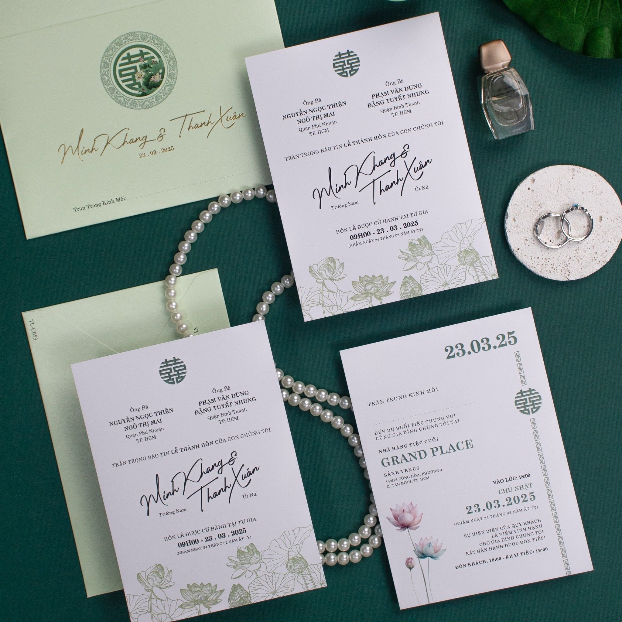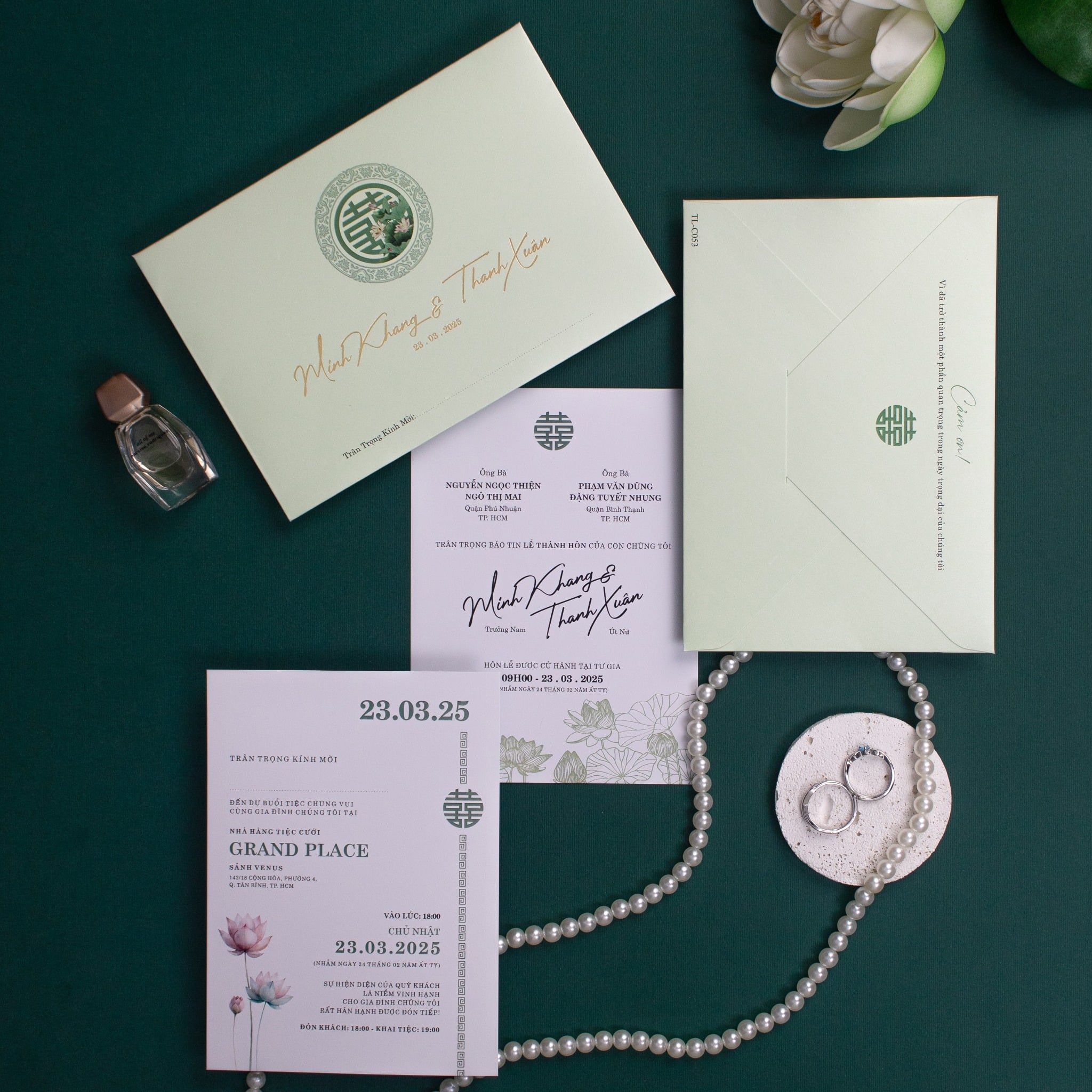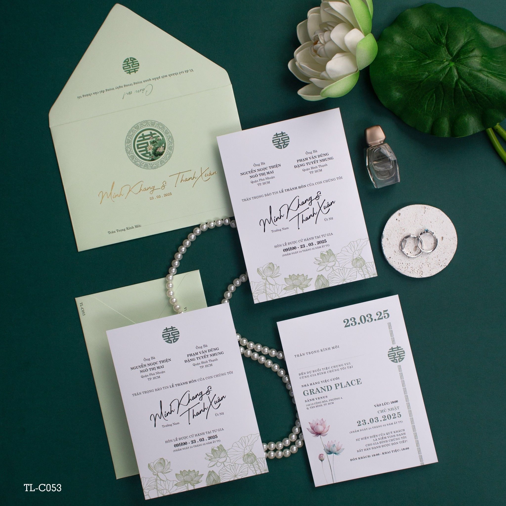 Chạm tay vào mẫu thiệp TL-C053, bạn sẽ cảm nhận ngay hơi thở của sự tinh khôi qua sắc xanh bạc hà (Sage Green) dịu mát. Không cần quá phô trương, bộ thiệp chọn cho mình ngôn ngữ thiết kế tối giản nhưng đầy chiều sâu với họa tiết hoa sen được phác họa thanh mảnh, gợi nhắc về một tình yêu thuần khiết và bền bỉ. Điểm nhấn đắt giá nằm ở sự kết hợp giữa phông chữ Calligraphy bay bổng và biểu tượng Hỷ truyền thống, tạo nên một tổng thể hài hòa, vừa mang nét hoài cổ của gia đình Việt, vừa phảng phất phong cách hiện đại phương Tây. Đây chính là lời ngỏ ý đầy trân trọng mà Minh Khang và Thanh Xuân muốn gửi trao đến những vị khách quý, hứa hẹn một khởi đầu viên mãn và bình yên.Khi bạn đặt trọn niềm tin vào Thiệp cưới KK để chuẩn bị cho ngày khởi đầu hạnh phúc, chúng tôi hiểu rằng sự riêng tư là điều quý giá nhất.