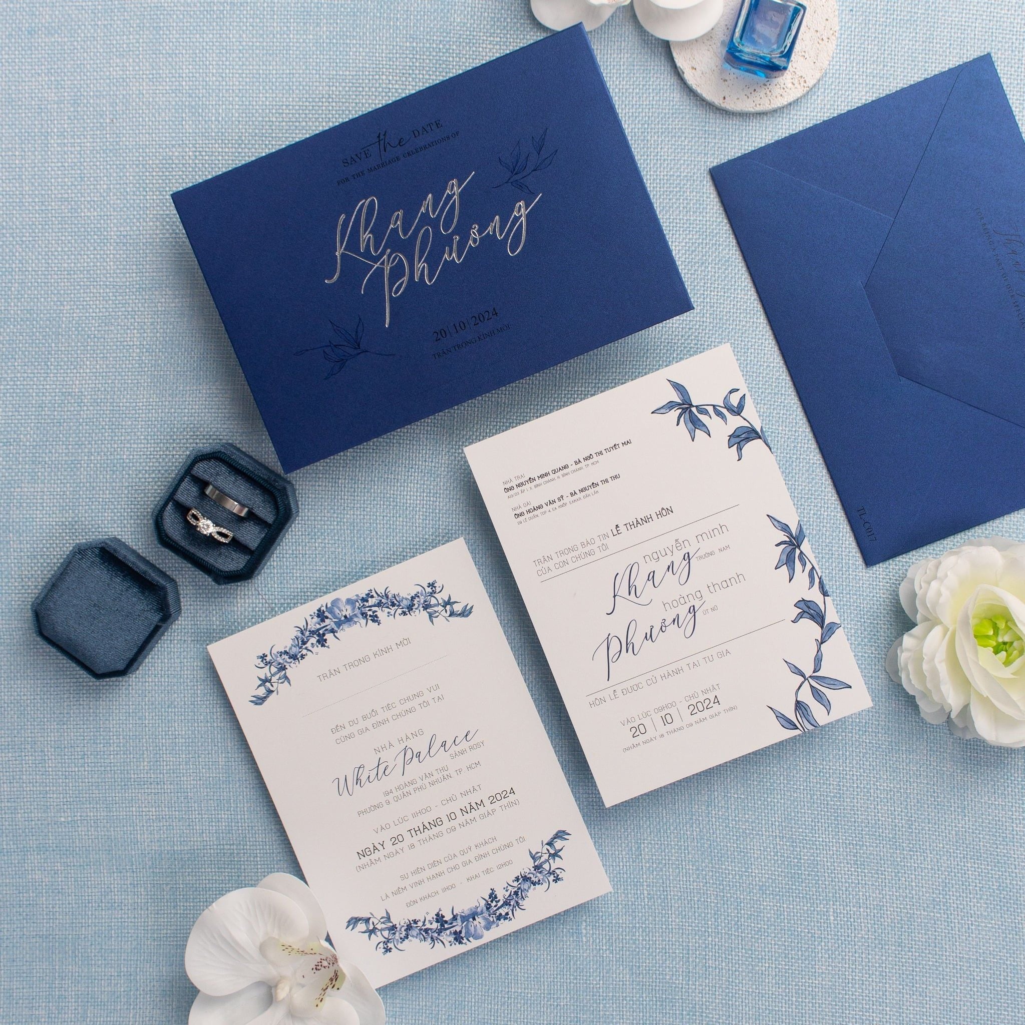 Khi cầm trên tay bộ thiệp cưới này, điều đầu tiên khiến người ta xao xuyến chính là sắc xanh Midnight thâm trầm nhưng đầy quyền lực. Không rực rỡ phô trương, gam màu này tựa như một lời khẳng định về một tình yêu bền chặt, sâu sắc và đầy bao dung. Những đường nét ép kim bạc trên nền giấy ánh xanh navy không chỉ là trang trí, đó là những tia sáng lấp lánh kể về hành trình hạnh phúc của Minh Khang và Thanh Phương.Từng chi tiết hoa văn thanh mảnh được chăm chút tỉ mỉ, kết hợp cùng phông chữ bay bổng tạo nên một tổng thể hài hòa. Một sự khởi đầu hoàn hảo cho buổi tiệc lung linh tại White Palace, nơi những kỷ niệm đẹp nhất bắt đầu được viết tiếp.