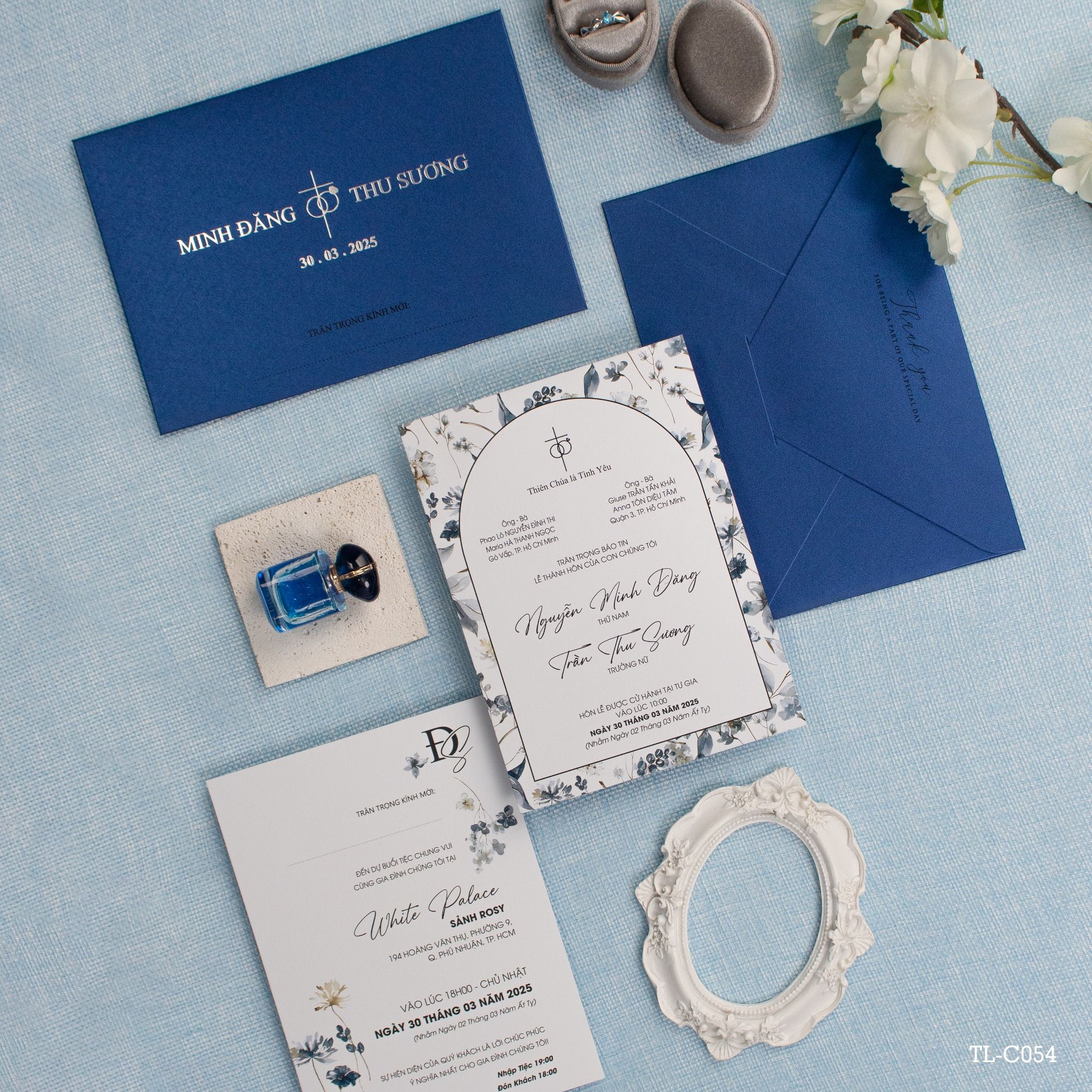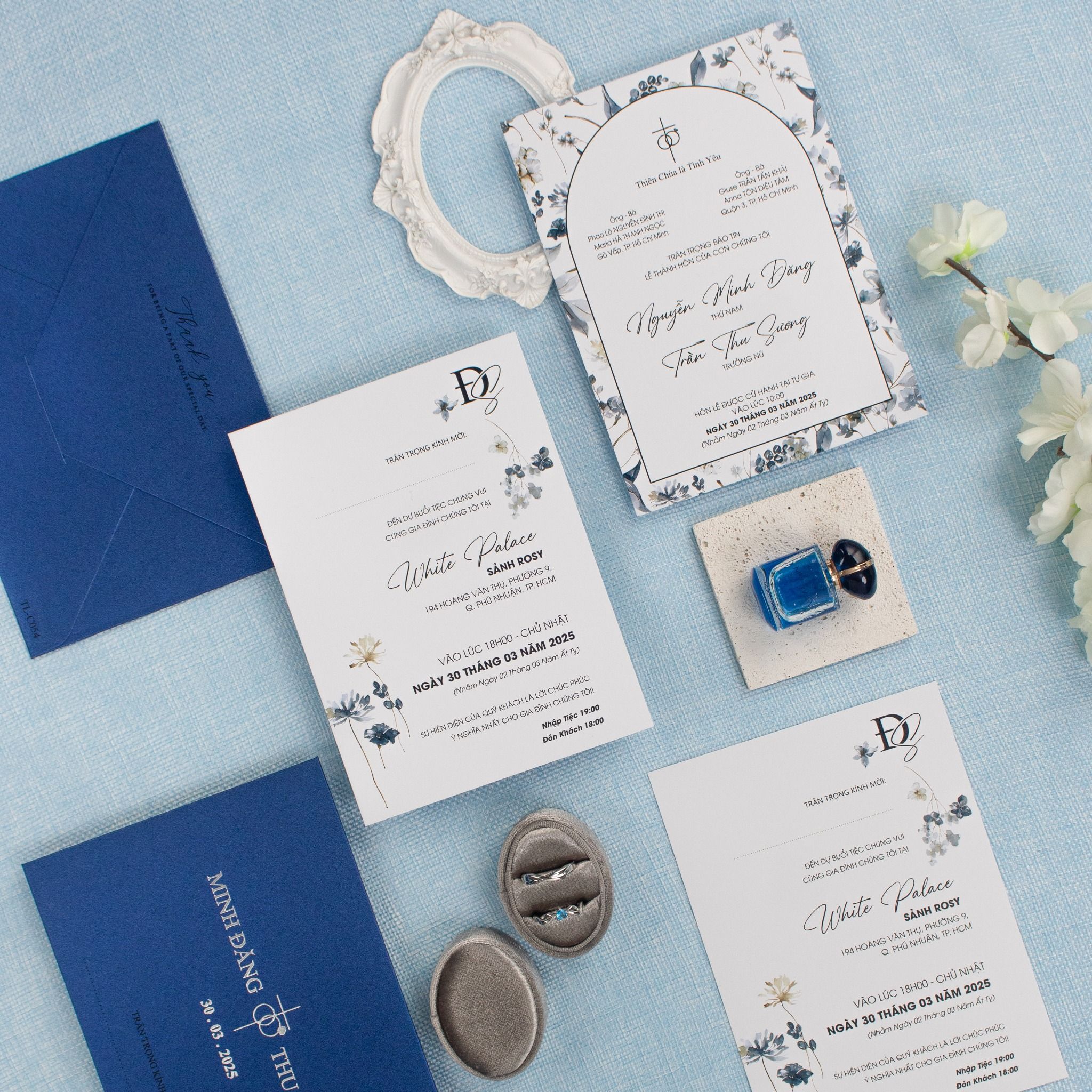 Sắc xanh Navy không chỉ là màu sắc, đó là biểu tượng của sự chân thành và bền vững mà đôi lứa dành cho nhau. Tên cô dâu chú rể được ép kim vàng rực rỡ trên nền xanh thẳm, tựa như những vì sao lấp lánh giữa bầu trời đêm. Điểm nhấn tinh tế nằm ở khung vòm mềm mại cùng những nhành hoa nhí được vẽ tay tỉ mỉ, bao bọc lấy thánh giá nhỏ minh chứng cho một tình yêu được Thiên Chúa chúc phúc. Bộ thiệp là một món quà đầu tiên bạn gửi trao đến khách mời, khẳng định gu thẩm mỹ tinh tế và đẳng cấp của buổi tiệc.