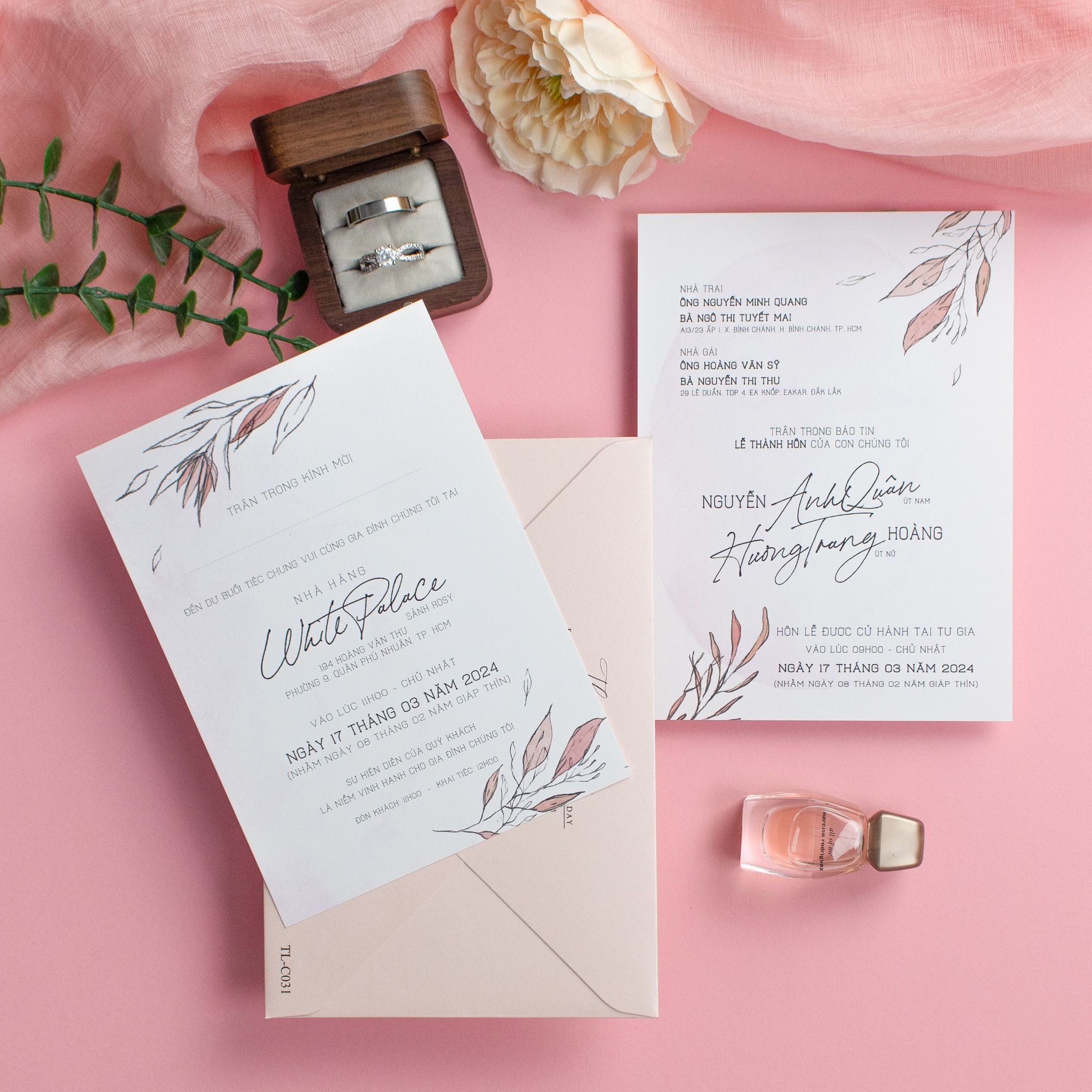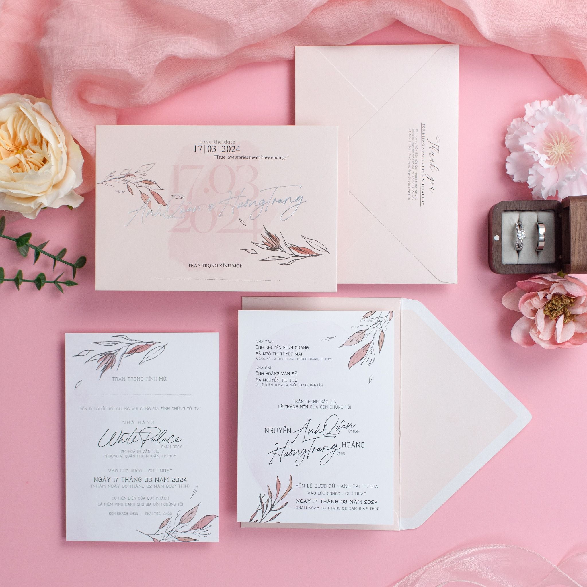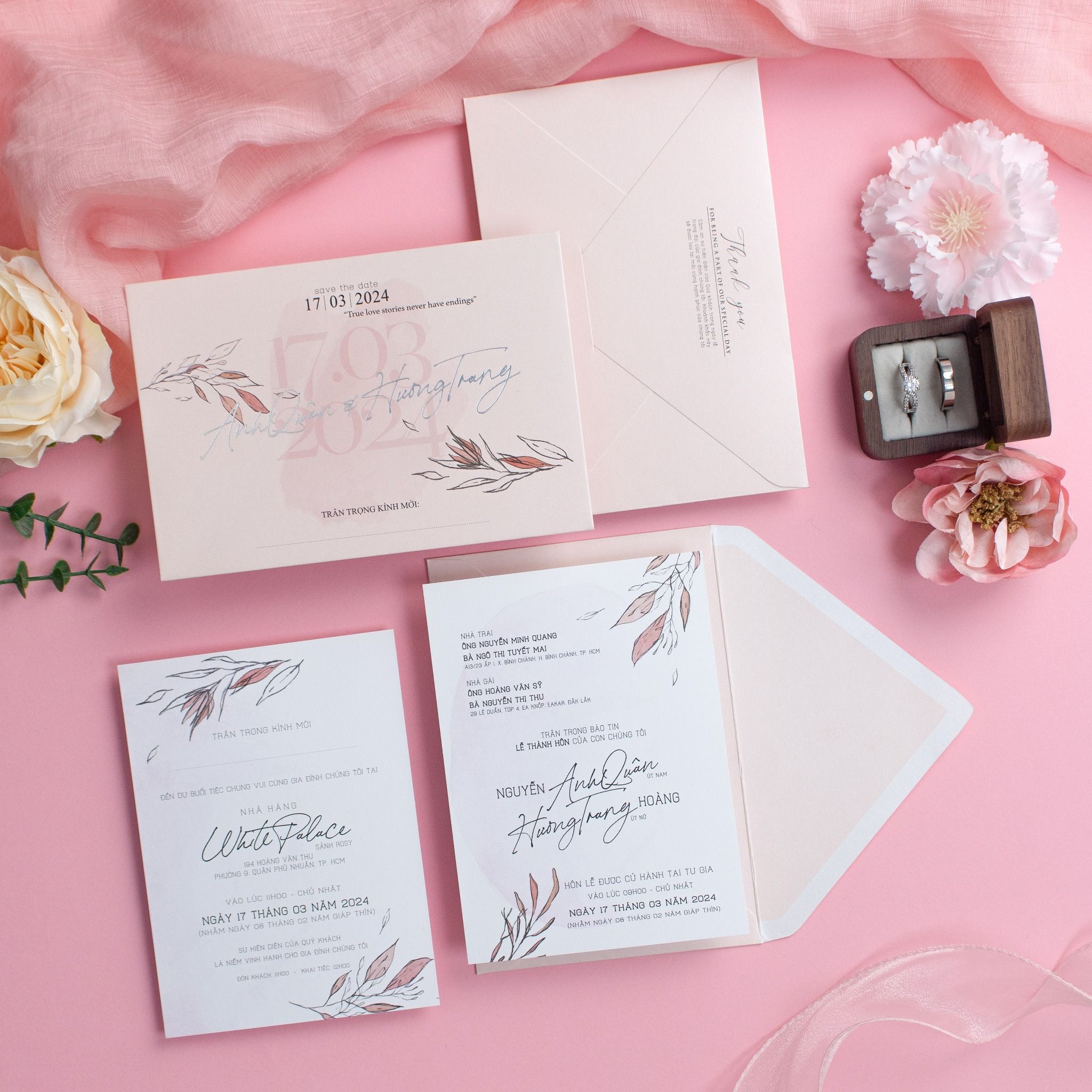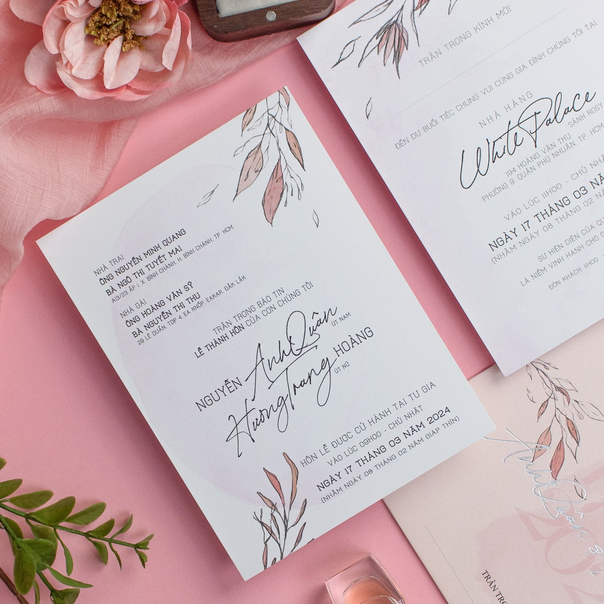 Thiệp Cưới Nhành Lá Xuân Thì Khởi Đầu Tinh Khôi Giữa Sắc Hồng Dịu Dàng