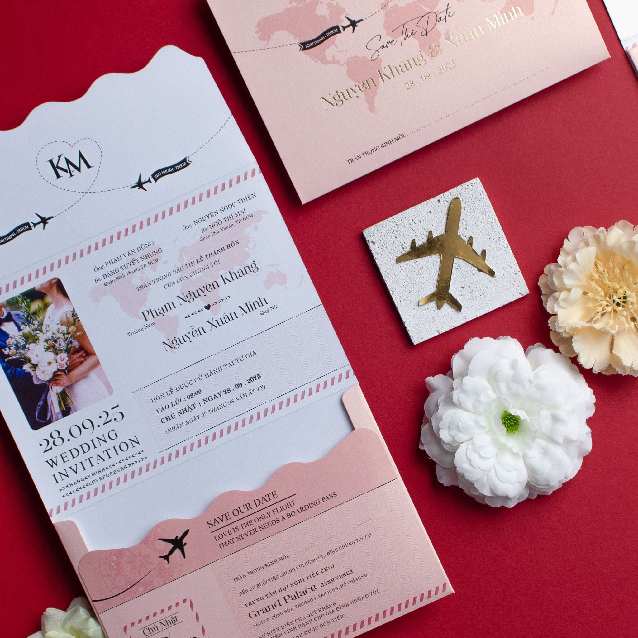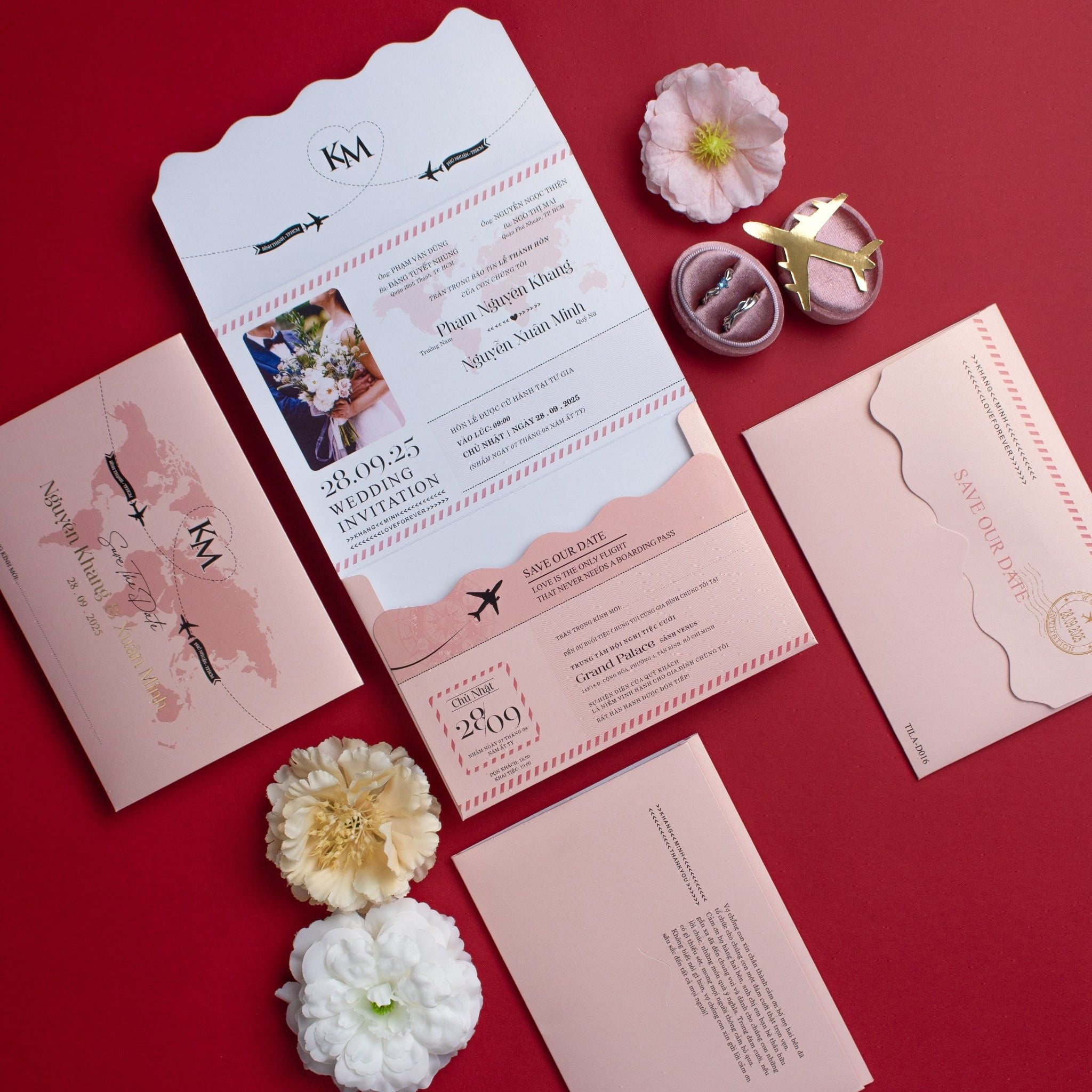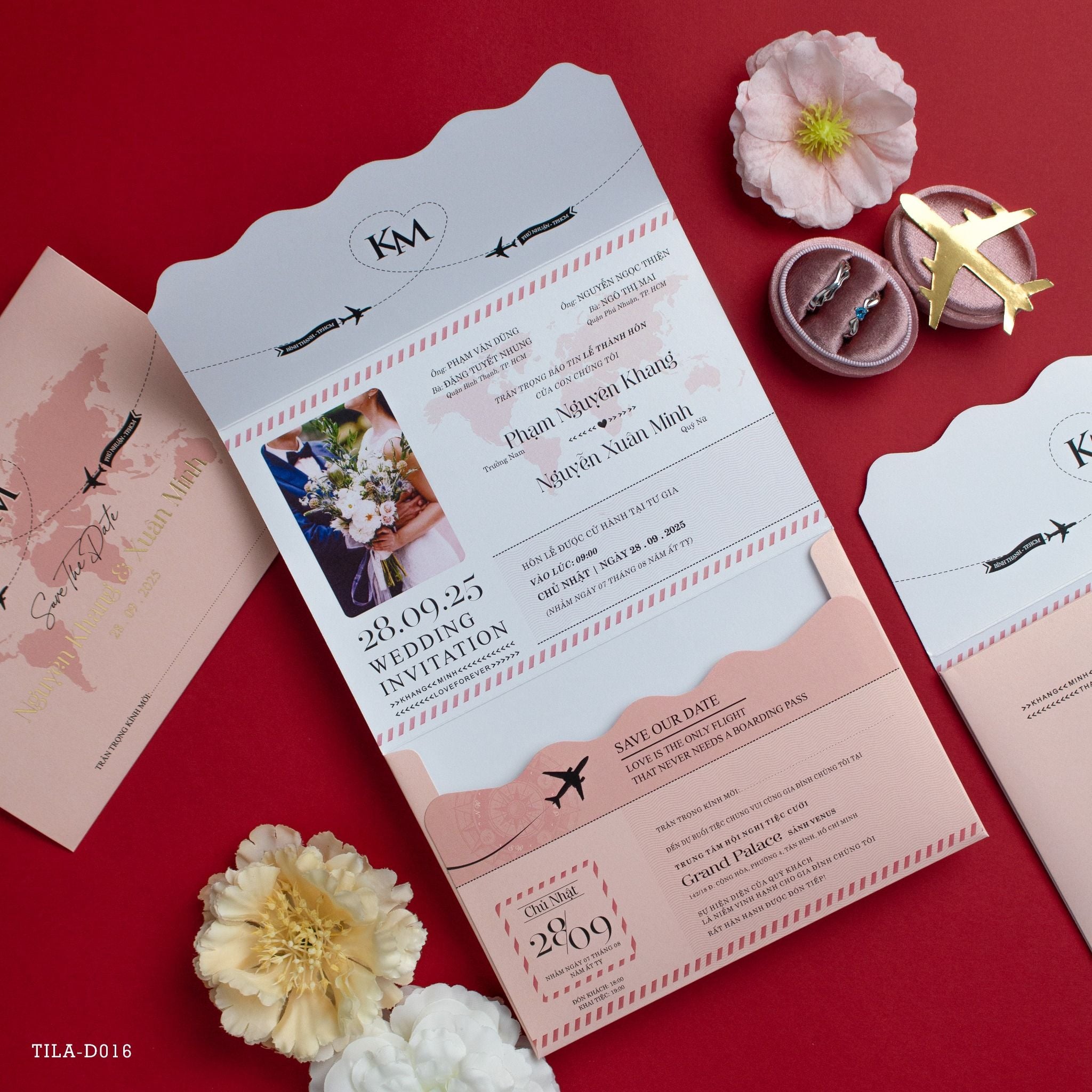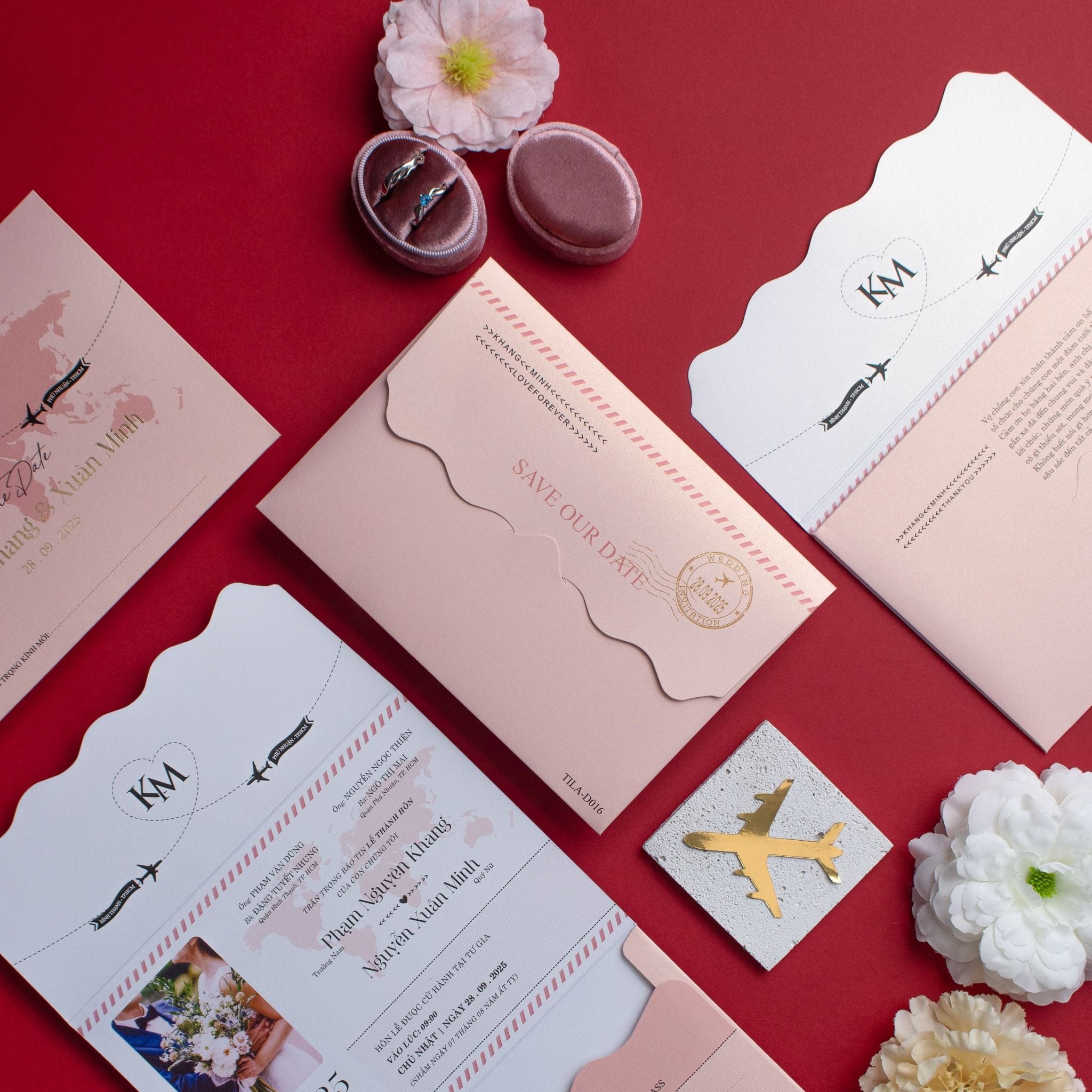 Không còn là những tấm thiệp đỏ truyền thống rập khuôn, TILA-D016 mở ra một không gian đầy cảm hứng cho những cặp đôi coi tình yêu là một chuyến phiêu lưu kỳ thú. Lấy ý tưởng từ cuốn hộ chiếu và thẻ lên máy bay, bộ thiệp là sự kết hợp tinh tế giữa sắc hồng pastel dịu ngọt và những đường cắt lượn sóng điệu đà. Cảm giác cầm trên tay tấm thiệp với chất liệu giấy mỹ thuật dày dặn, sờ vào thấy rõ độ mướt của vân giấy, khiến khách mời cảm thấy mình thực sự đang sở hữu một tấm vé VIP cho chuyến bay hạnh phúc. Từng chi tiết nhỏ như biểu tượng máy bay cất cánh hay hình ảnh bản đồ thế giới đều được chăm chút tỉ mỉ, khơi gợi sự tò mò và hào hứng cho bất kỳ ai nhận được. Đây không chỉ là lời mời, đó là một kỷ niệm mà bạn dành tặng cho những người thân yêu nhất.Khi bạn đặt trọn niềm tin vào Thiệp cưới KK để chuẩn bị cho ngày khởi đầu hạnh phúc, chúng tôi hiểu rằng sự riêng tư là điều quý giá nhất.
