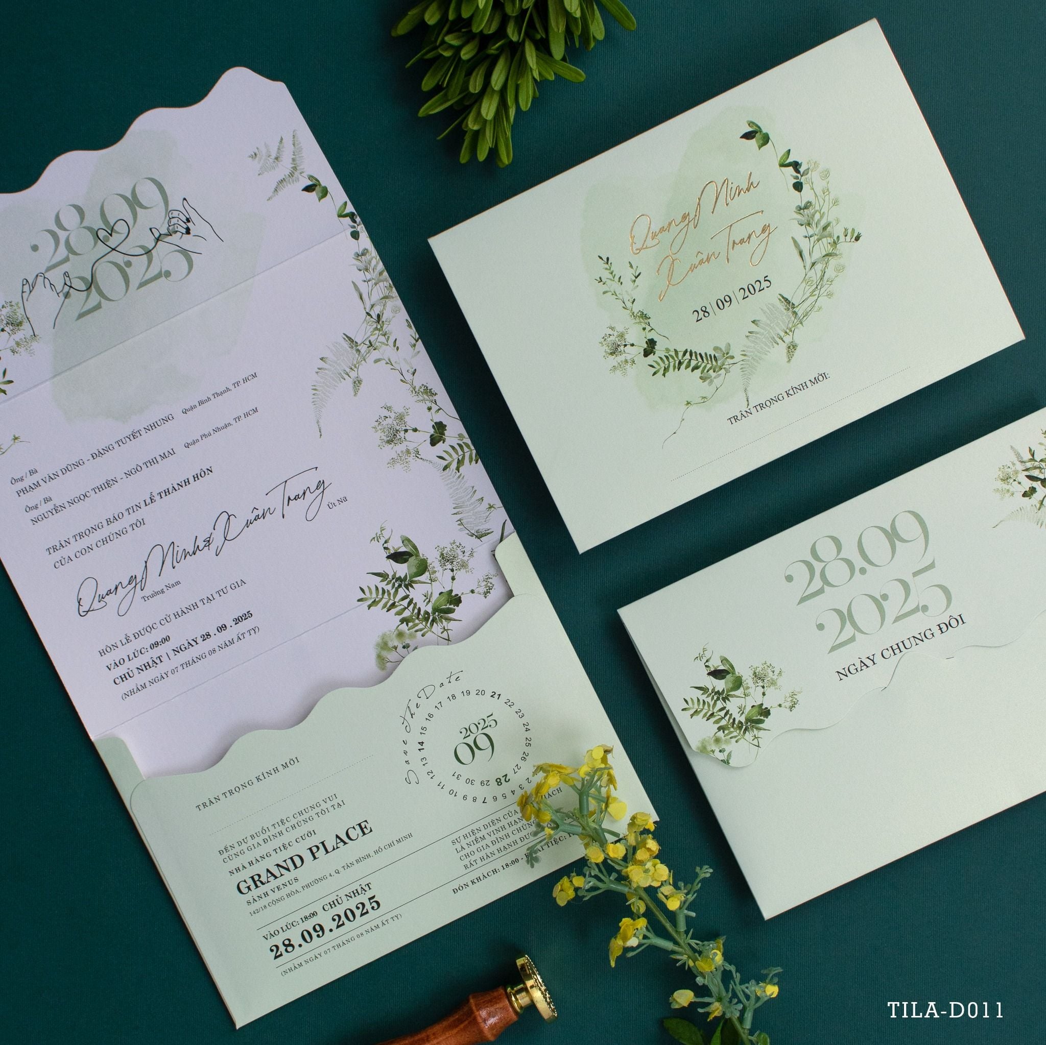 Nghệ thuật thiệp cưới phong cách thảo mộc tinh tế Khẽ chạm tay lên bề mặt giấy mỹ thuật của mẫu TILA-D011, bạn sẽ thấy một sự rung động khác biệt. Không đi theo lối mòn của những gam màu rực rỡ, bộ thiệp chọn cho mình sắc xanh Sage dịu mắt, gợi nhắc về một buổi sớm mai trong trẻo. Những nhành dương xỉ và cỏ dại được phác họa mềm mại, đan xen cùng kỹ thuật in nhũ vàng sắc sảo, tạo nên vẻ đẹp vượt thời gian. Từng chi tiết từ bố cục chữ cho đến cách gấp thiệp đều được tính toán kỹ lưỡng để khi khách mời cầm trên tay, họ không chỉ nhận một lời mời mà là đang đón nhận một tác phẩm nghệ thuật đầy trân quý.