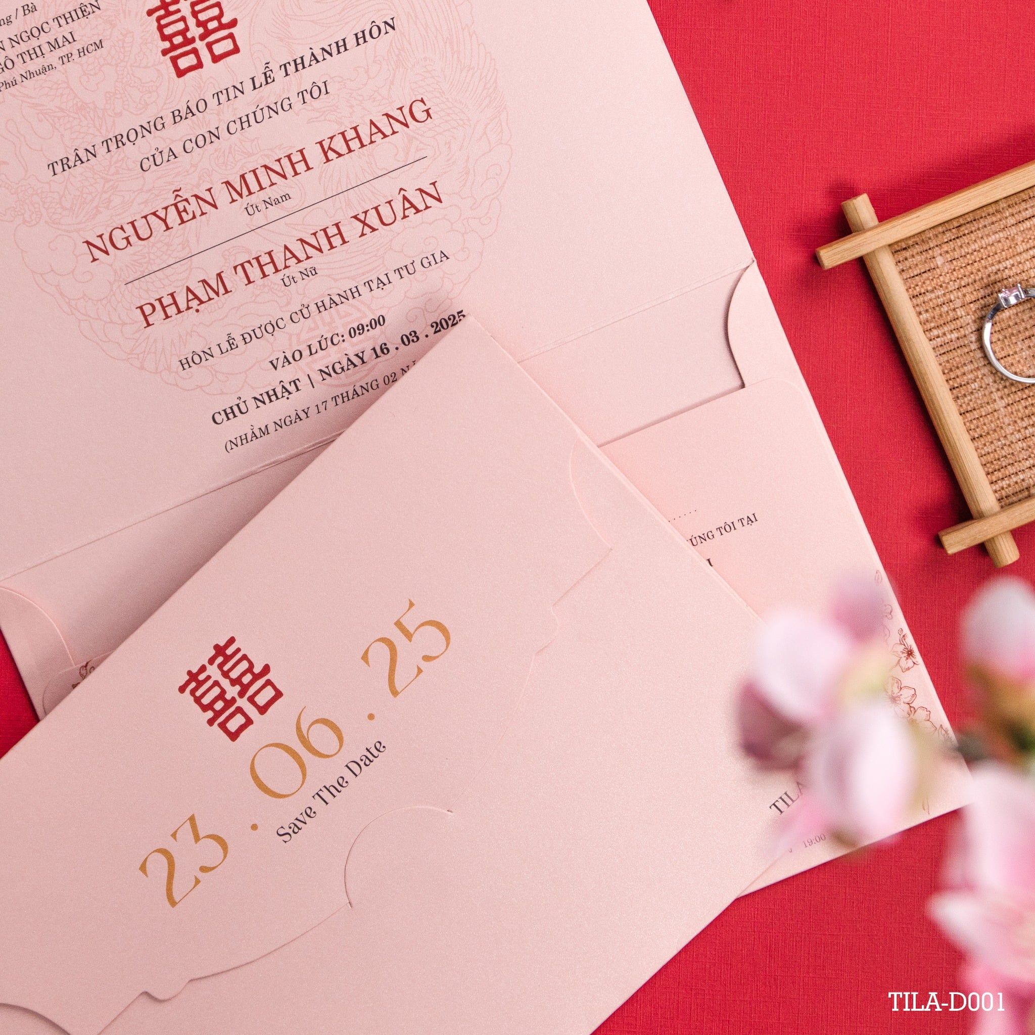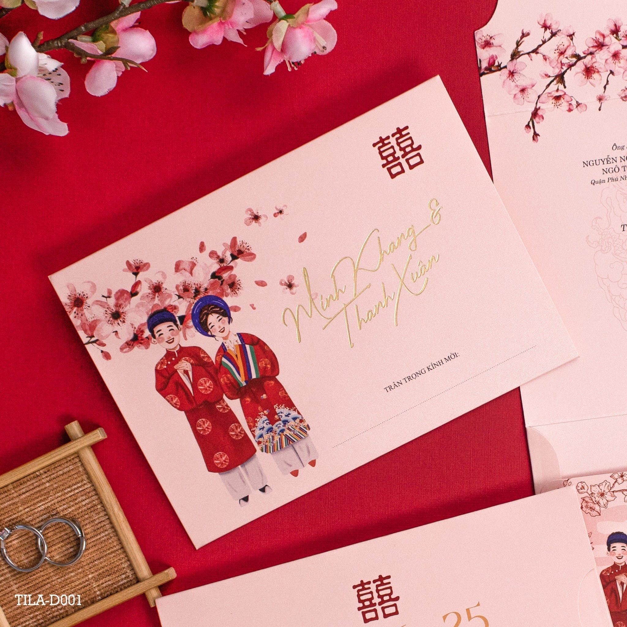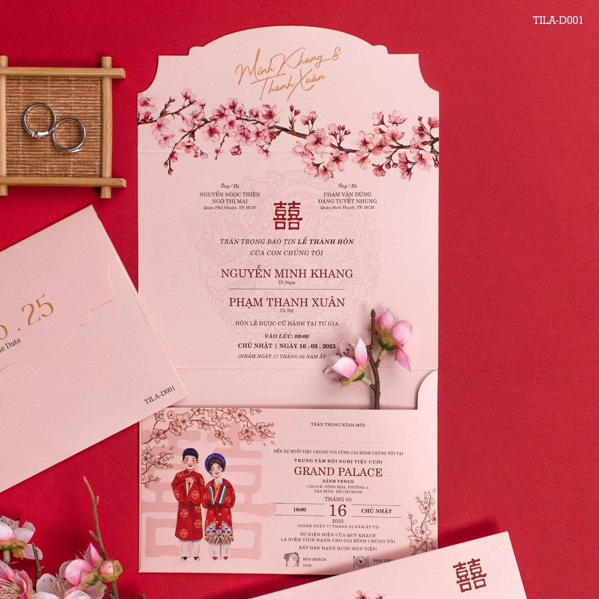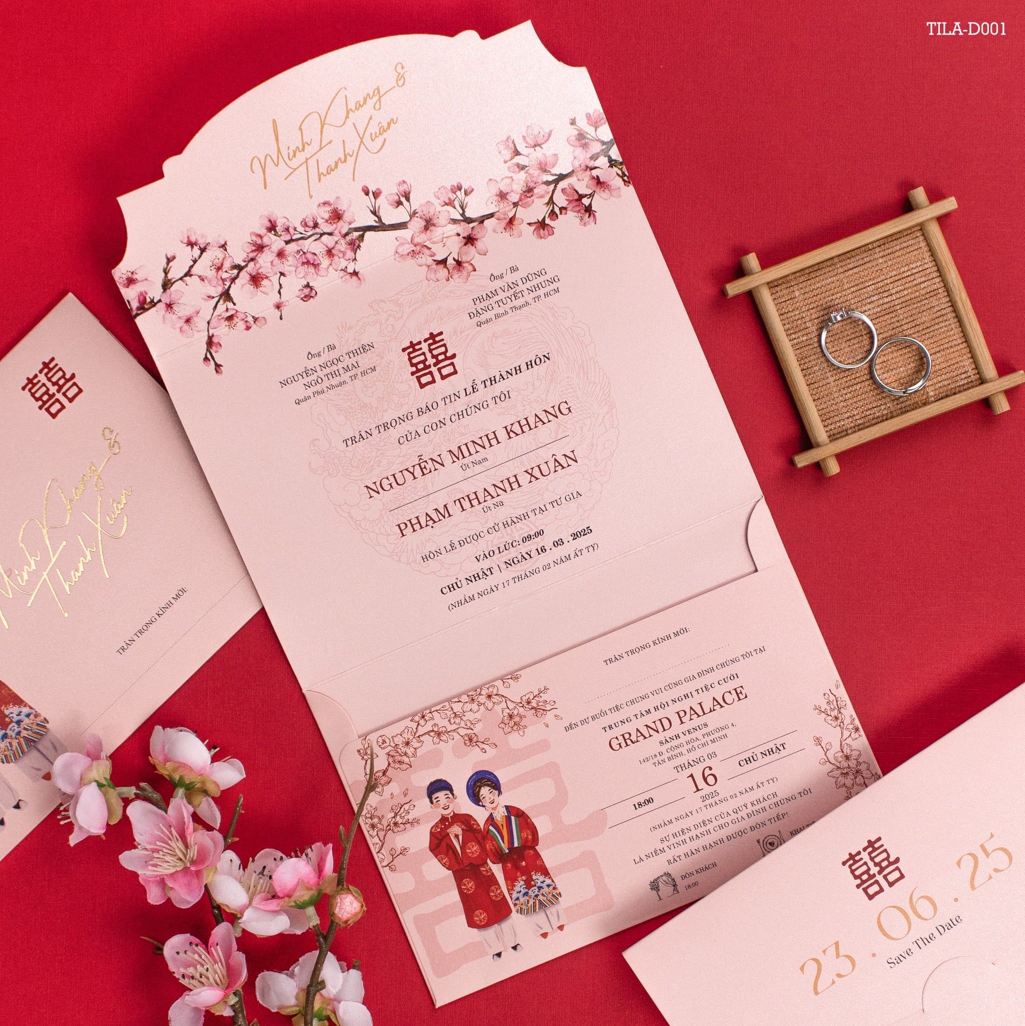 Từng đường nét trên bộ thiệp TILA-D001 như kể lại một câu chuyện tình ngọt ngào giữa mùa xuân rực rỡ. Sắc hồng phấn dịu nhẹ không chỉ tôn lên vẻ thanh tao mà còn gợi nhắc về những xúc cảm tinh khôi thuở ban đầu. Điểm xuyết nhành hoa đào nở rộ cùng hình ảnh đôi uyên ương trong tà áo dài truyền thống, bộ thiệp là sự giao thoa hoàn hảo giữa hơi thở hiện đại và giá trị văn hóa lâu đời. Khi cầm trên tay tấm thiệp này, khách mời sẽ cảm nhận rõ sự chỉn chu, trân trọng mà bạn dành cho ngày trọng đại nhất cuộc đời mình.