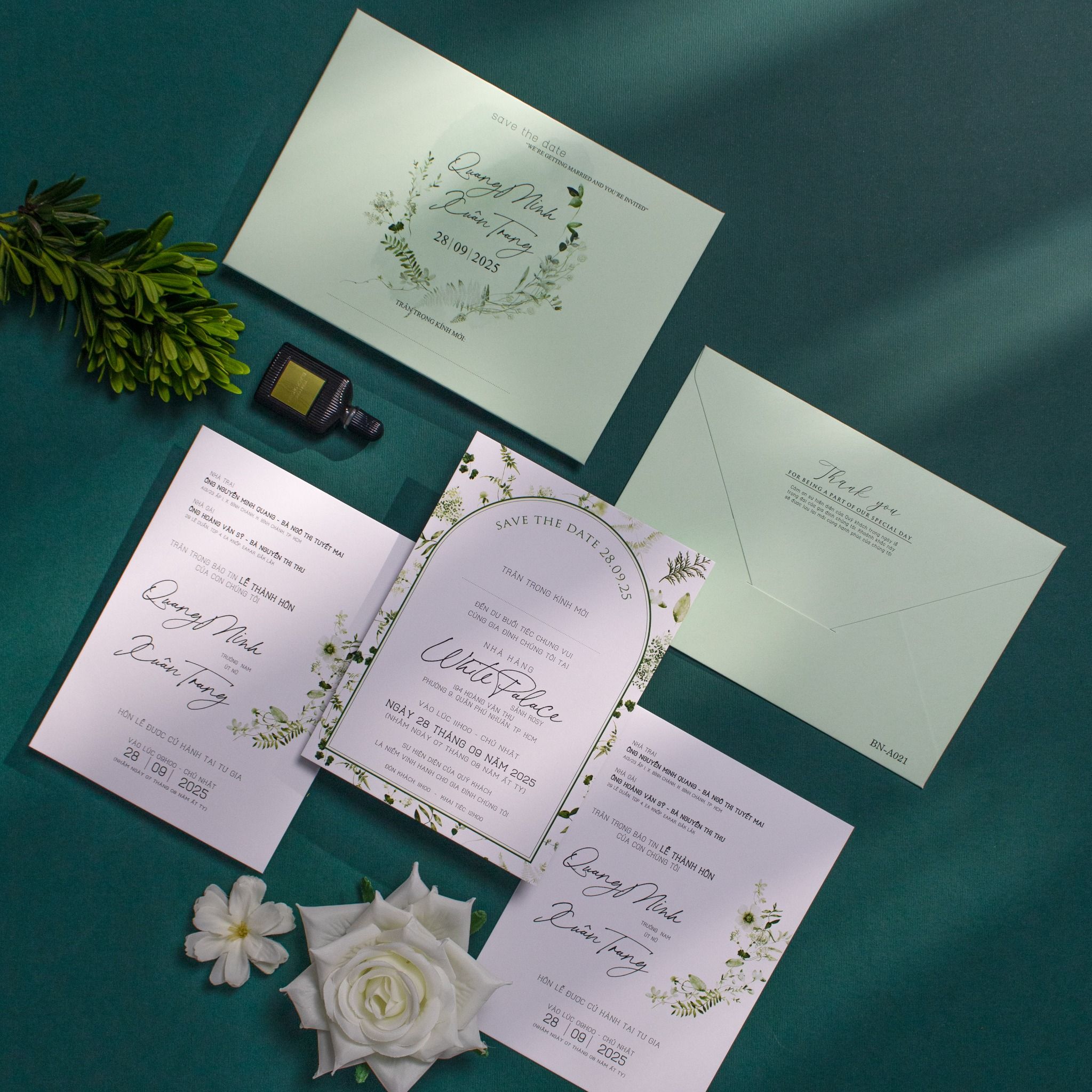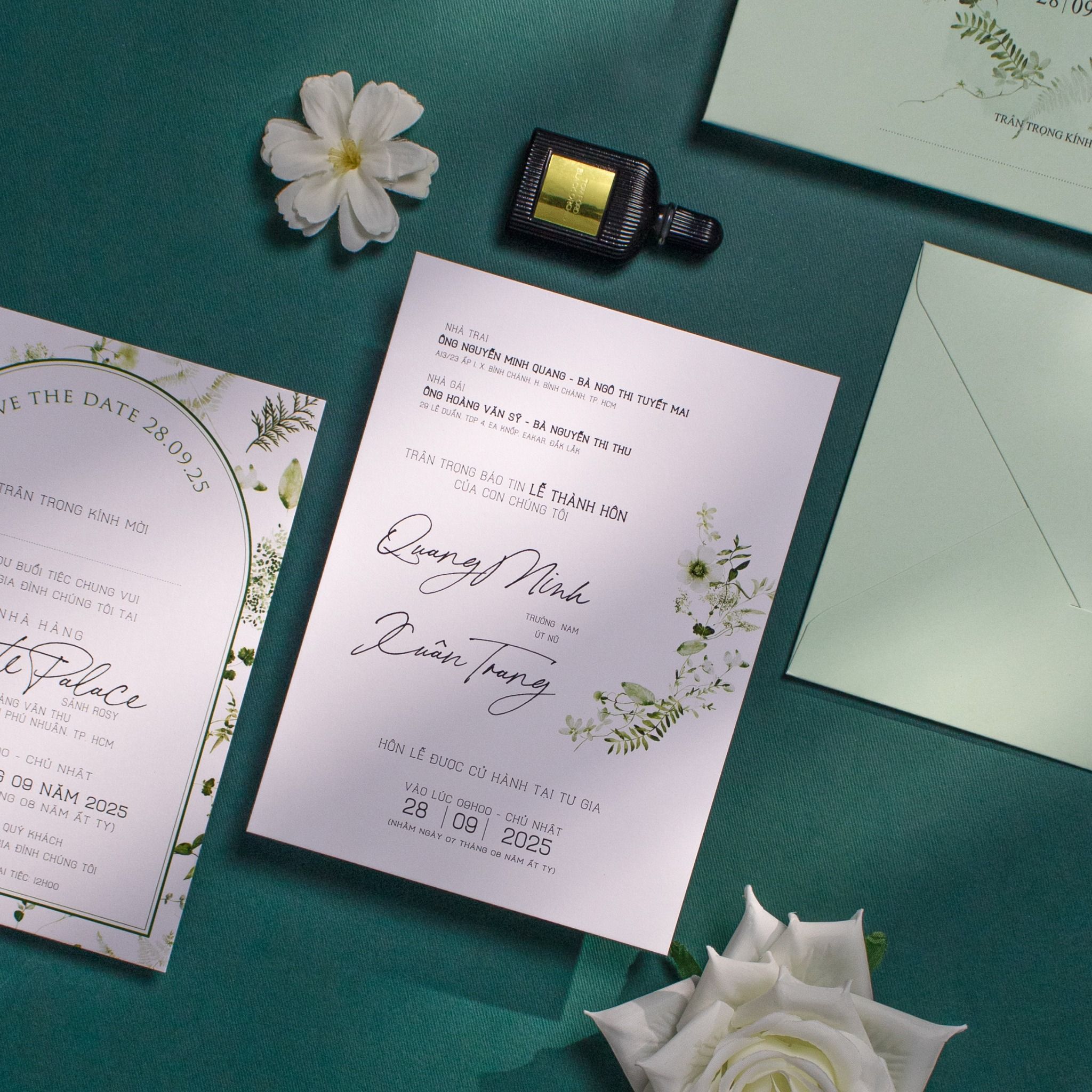 Không cần những chi tiết cầu kỳ, bộ thiệp mượn những nhành lá thanh mảnh để kể về một tình yêu tự nhiên và bền bỉ. Nét chữ bay bổng như lời thầm thì của đôi lứa, được đặt tinh tế trong khung vòm mềm mại, tạo nên một tổng thể vừa sang trọng vừa gần gũi. Đây không chỉ là một tấm thiệp, mà là lời mời chân thành gửi gắm trọn vẹn sự trân quý đến những vị khách đặc biệt trong ngày trọng đại nhất cuộc đời.Khi bạn đặt trọn niềm tin vào Thiệp cưới KK để chuẩn bị cho ngày khởi đầu hạnh phúc, chúng tôi hiểu rằng sự riêng tư là điều quý giá nhất.