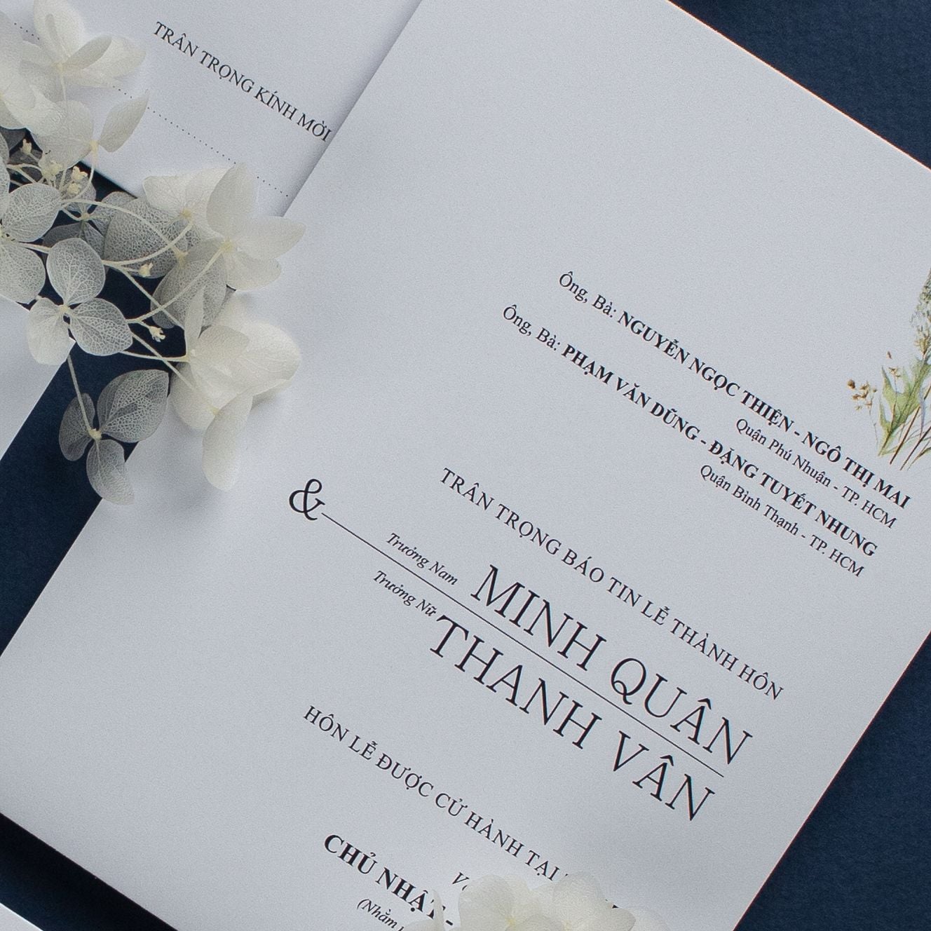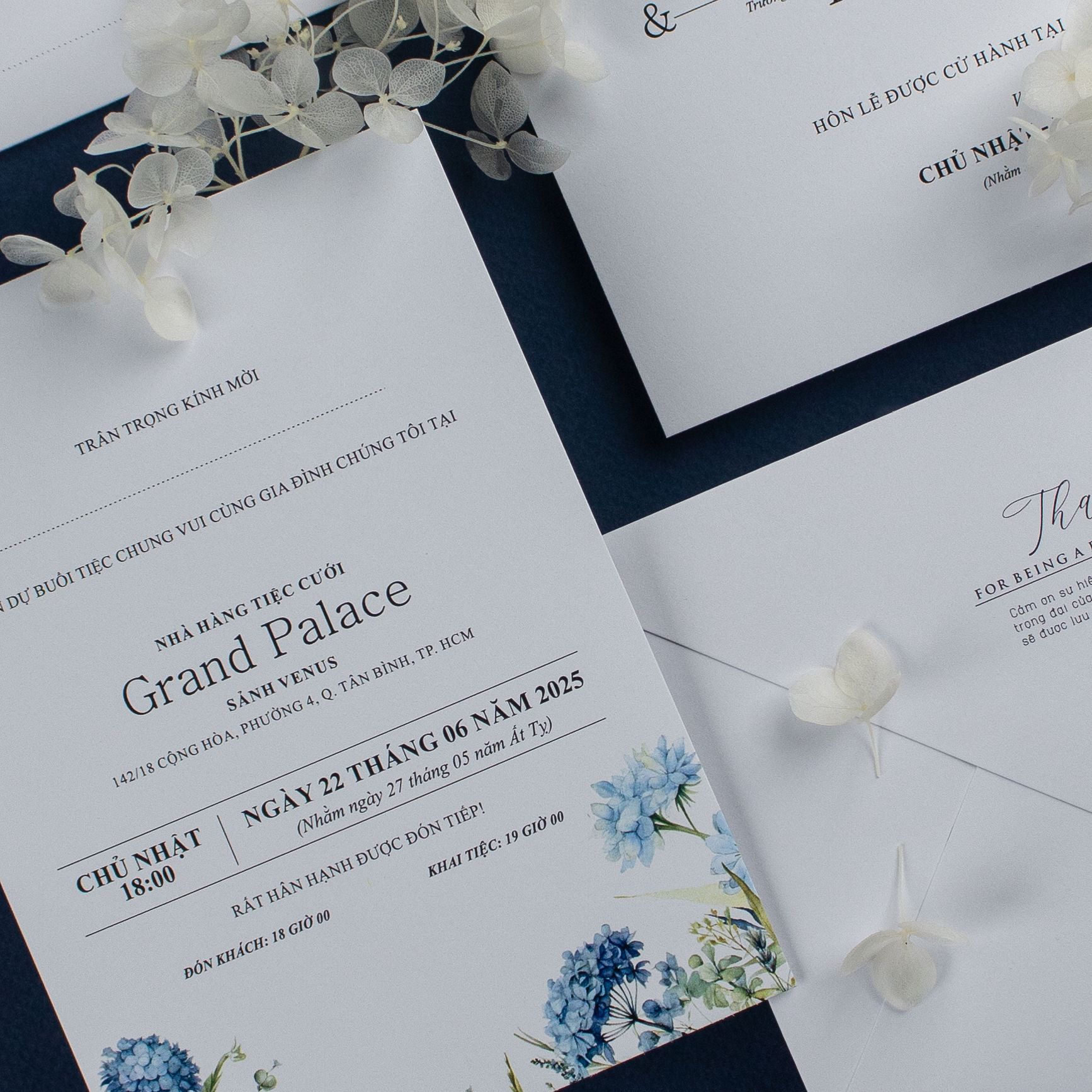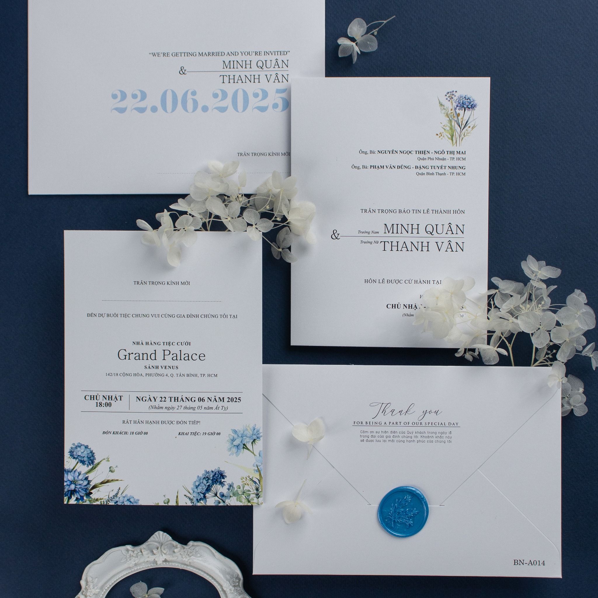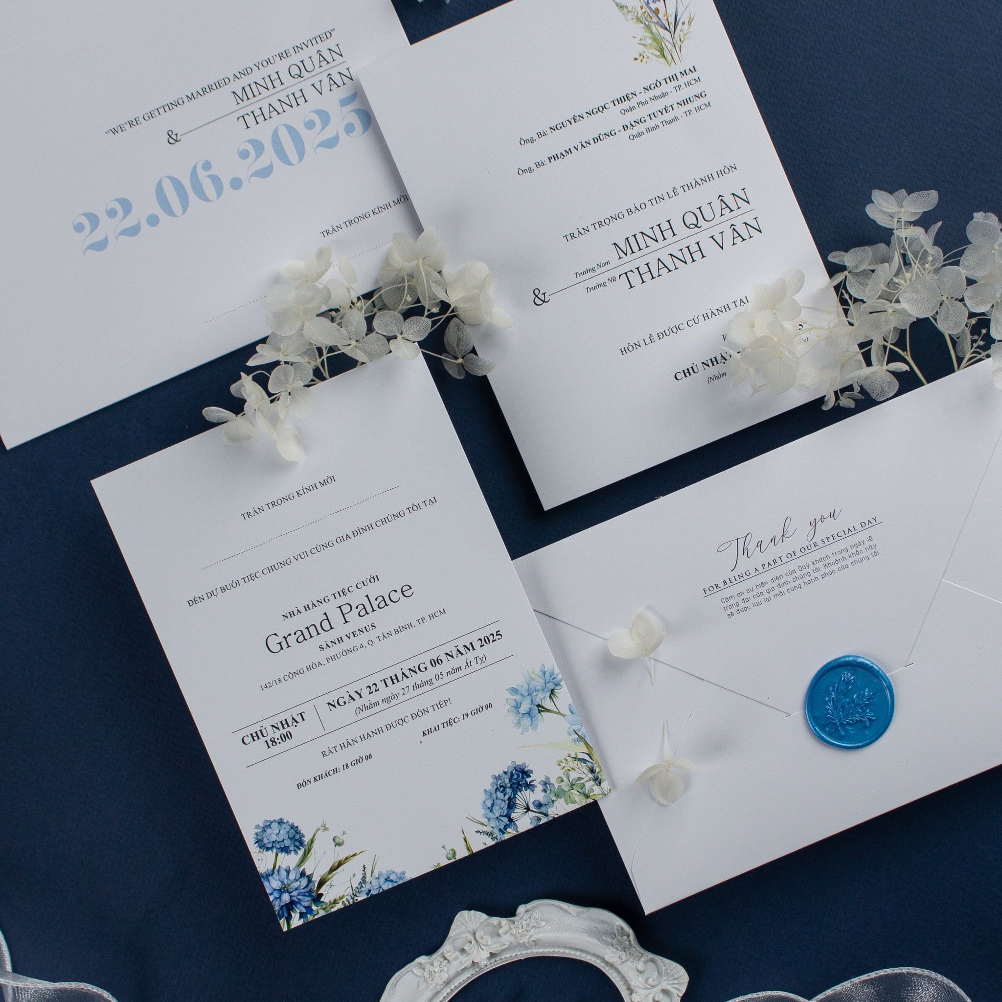 Lấy cảm hứng từ những đóa Cẩm Tú Cầu rạng rỡ, mẫu thiệp Thanh Lam là lời ngỏ về một tình yêu chân thành và bền chặt. Sắc xanh dịu mát của hoa kết hợp cùng dấu sáp thủ công đồng màu tạo nên một tổng thể trang nhã, đầy chất thơ. Với thiết kế tối giản nhưng tinh tế, mẫu thiệp này không chỉ là lời mời mà còn là biểu tượng cho sự biết ơn và hạnh phúc viên mãn trong ngày trọng đại. Một khởi đầu thuần khiết cho hành trình lứa đôi.Khi bạn đặt trọn niềm tin vào Thiệp cưới KK để chuẩn bị cho ngày khởi đầu hạnh phúc, chúng tôi hiểu rằng sự riêng tư là điều quý giá nhất.