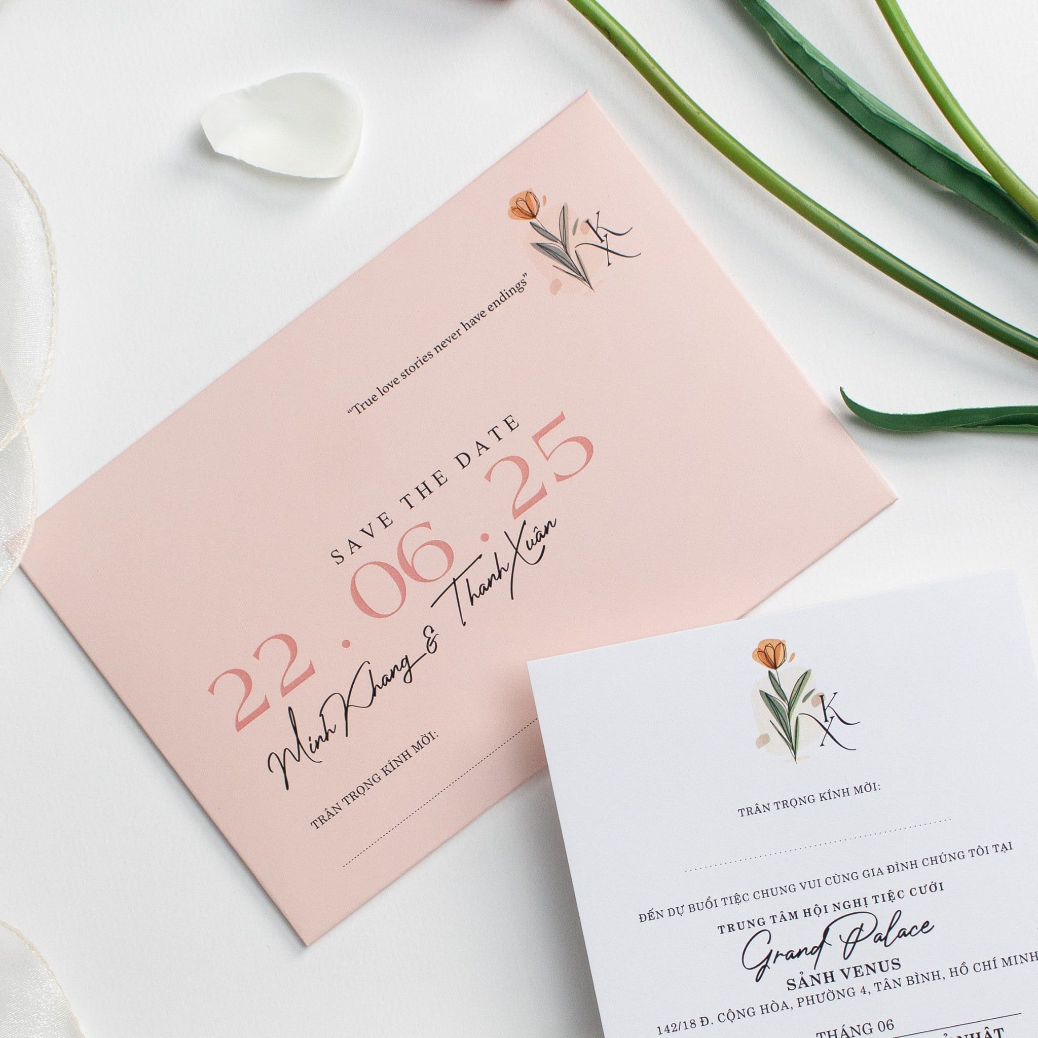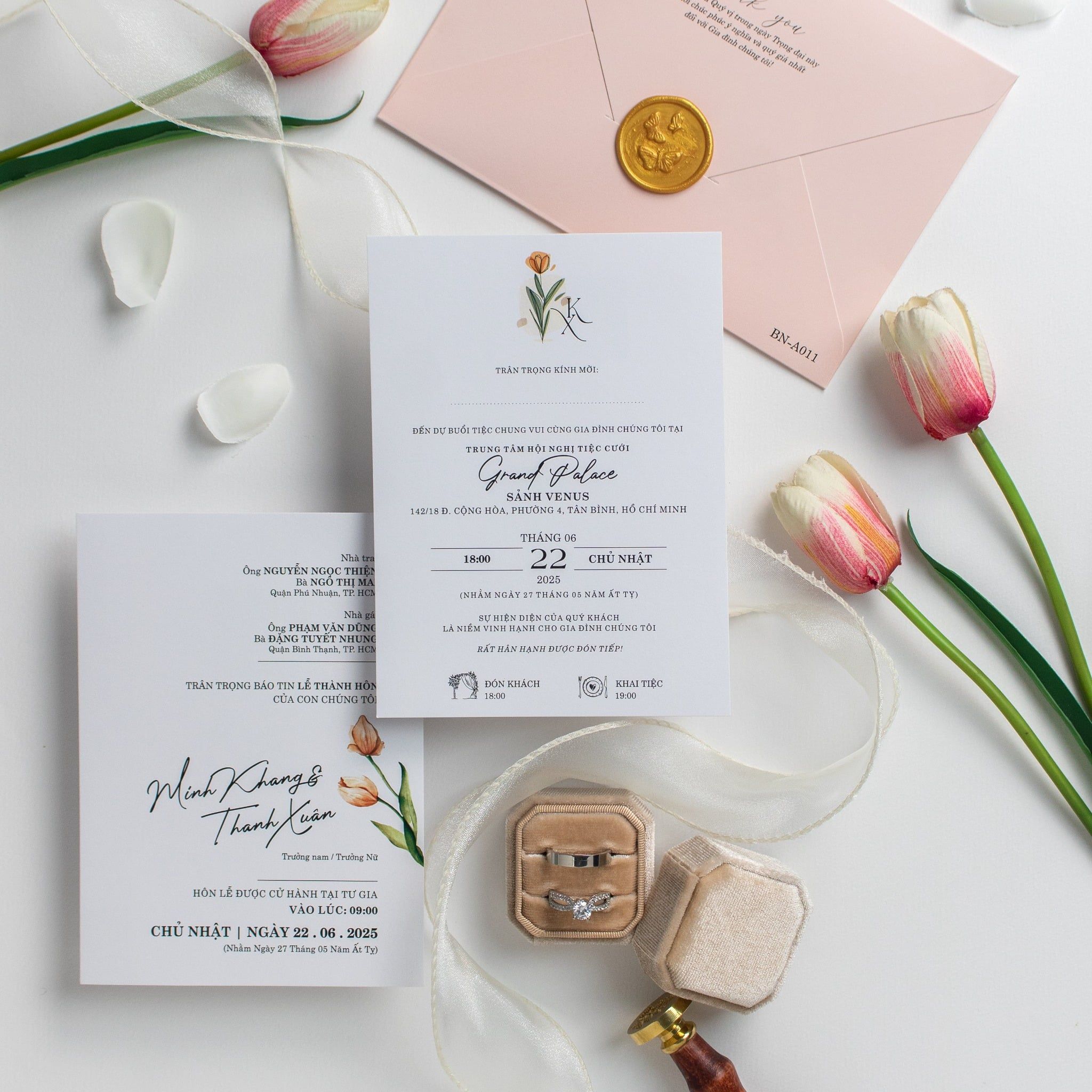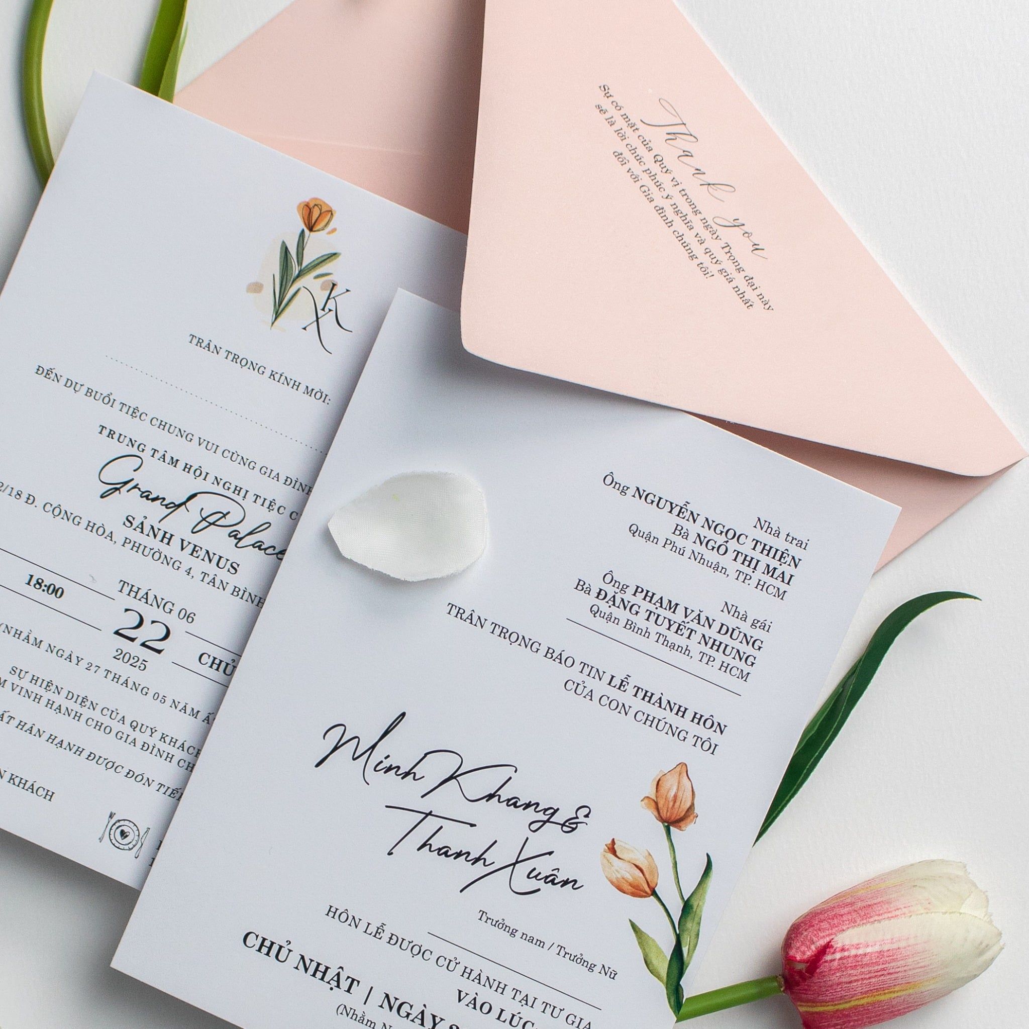Là sự kết hợp hoàn hảo giữa nét hiện đại và vẻ đẹp lãng mạn vượt thời gian. Điểm nhấn trung tâm của thiết kế chính là những nhành hoa Tulip được vẽ màu tinh tế, tượng trưng cho một tình yêu hoàn hảo và sự khởi đầu mới đầy hy vọng. Bộ thiệp sử dụng tông nền trắng kem sang trọng, làm nổi bật phông chữ Serif thanh mảnh phối cùng nét Script bay bổng. Sự chăm chút còn thể hiện qua phụ kiện phong bì màu hồng phấn dịu dàng và dấu sáp vàng gold quý phái, tạo nên một tổng thể trang nhã và đẳng cấp.