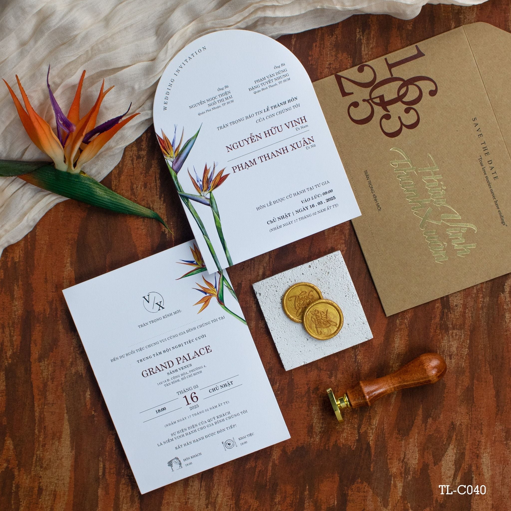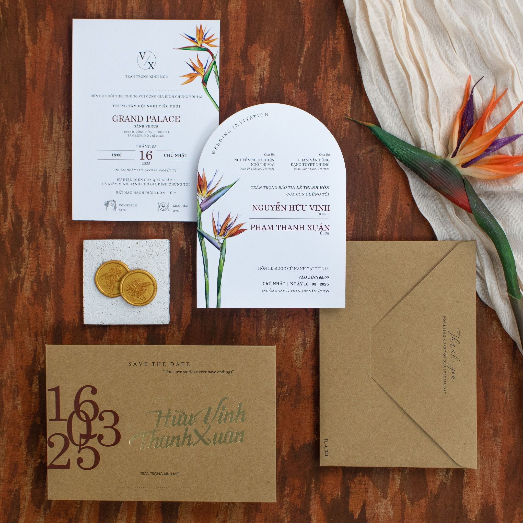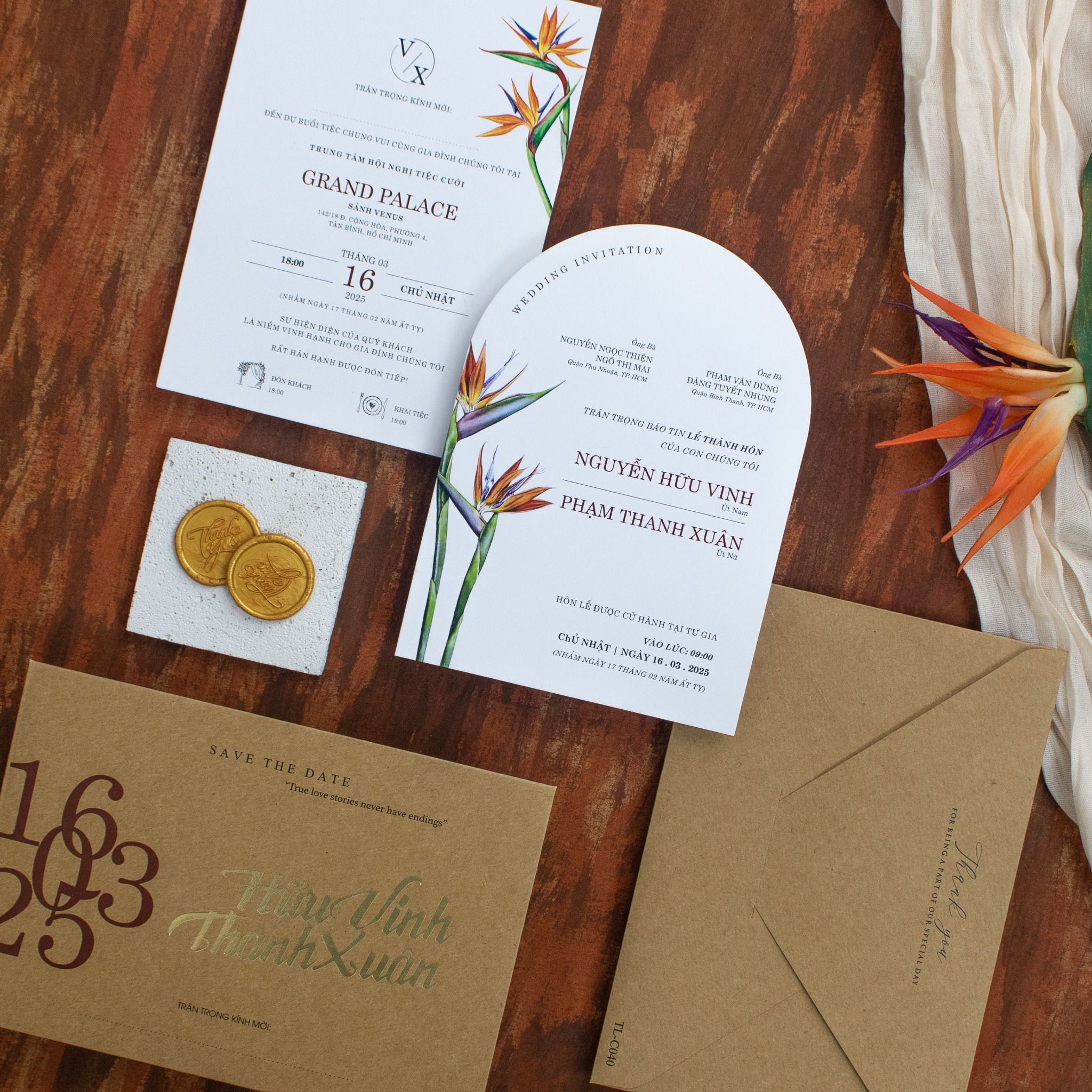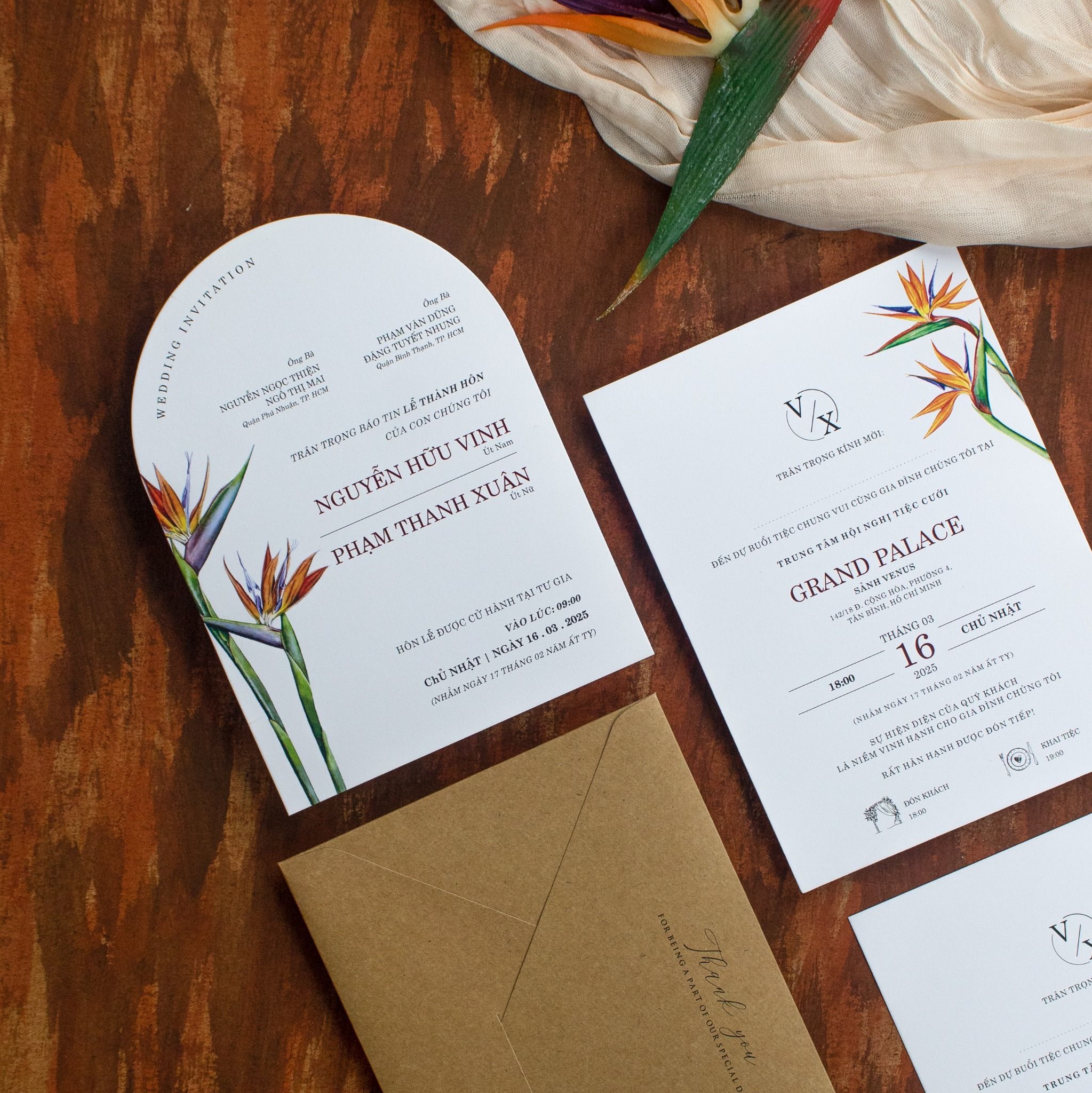 Thiệp cưới hoa Thiên Điểu thiết kế trên chất liệu giấy Kraft cao cấp Cầm trên tay bộ thiệp này, bạn sẽ cảm nhận rõ sự giao thoa giữa nét thô mộc của giấy Kraft và vẻ rạng rỡ của đóa Thiên Điểu. Không cầu kỳ phô trương, thiết kế tập trung vào những đường cắt vòm tinh tế, tạo nên một khởi đầu nhẹ nhàng cho ngày trọng đại. Mỗi tấm thiệp không chỉ là một lời mời, mà là một kỷ vật được chăm chút tỉ mỉ, từ con dấu sáp vàng đồng óng ánh đến font chữ bay bổng khắc ghi tên đôi lứa. Đây chính là lựa chọn cho những cặp đôi trân trọng giá trị tự nhiên, muốn gửi gắm sự ấm áp và chân thành nhất đến từng vị khách mời ngay từ cái chạm tay đầu tiên.