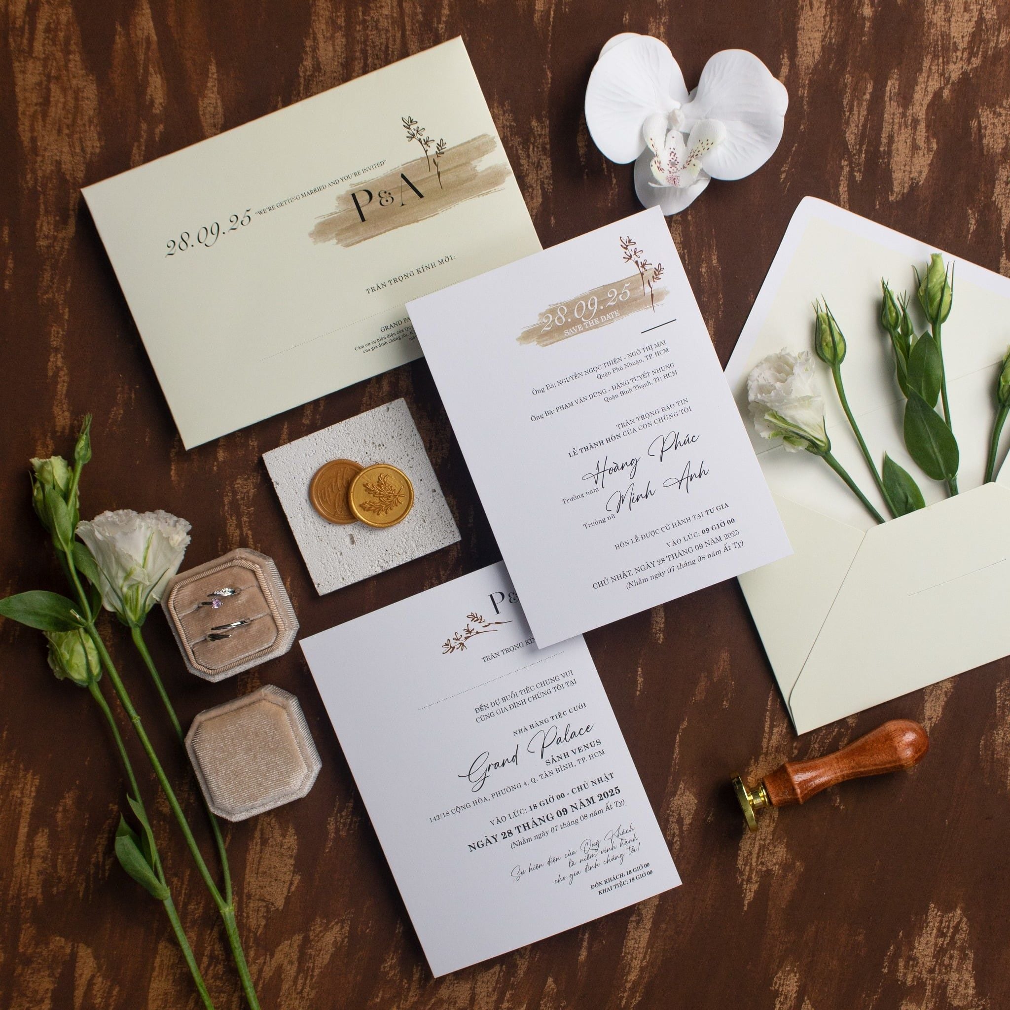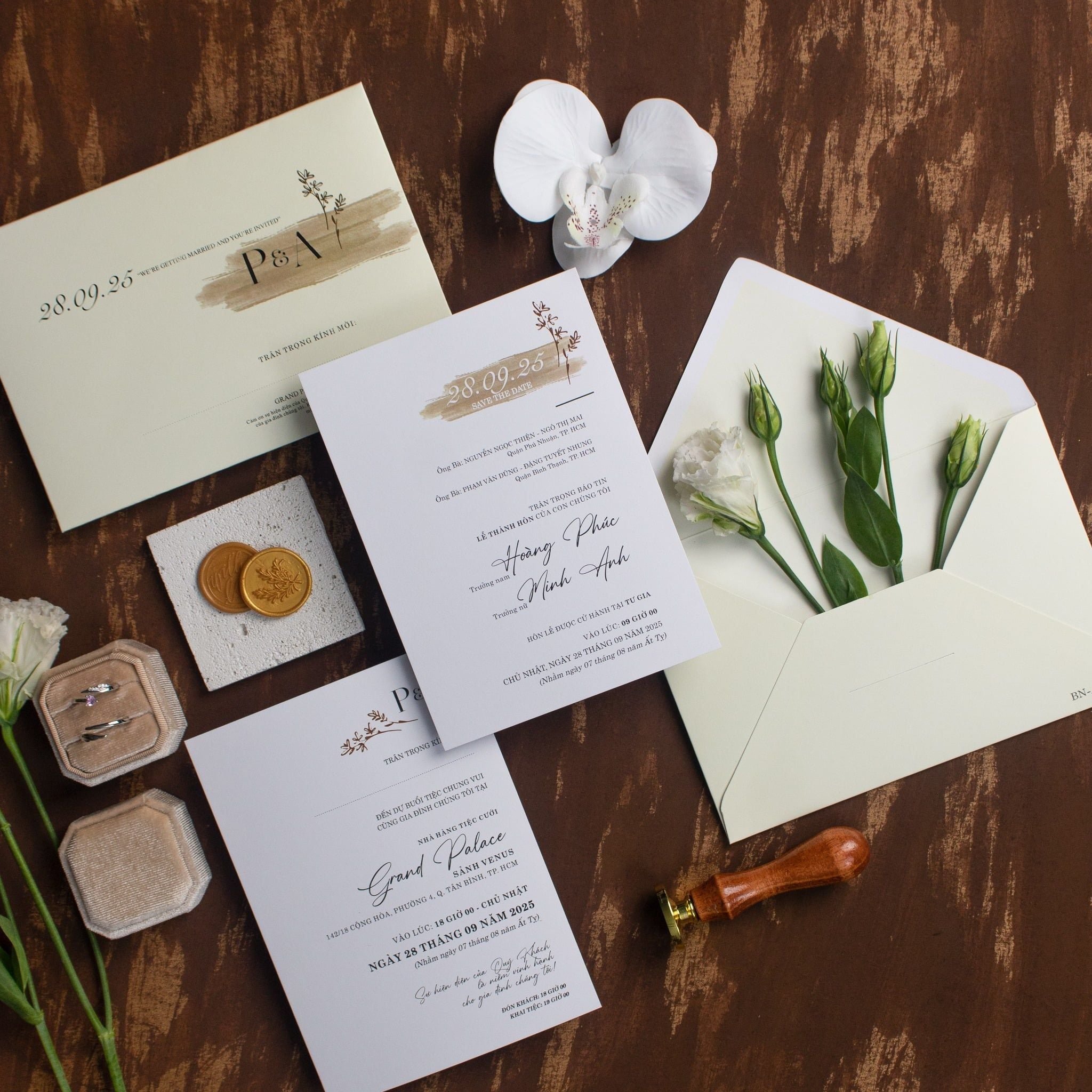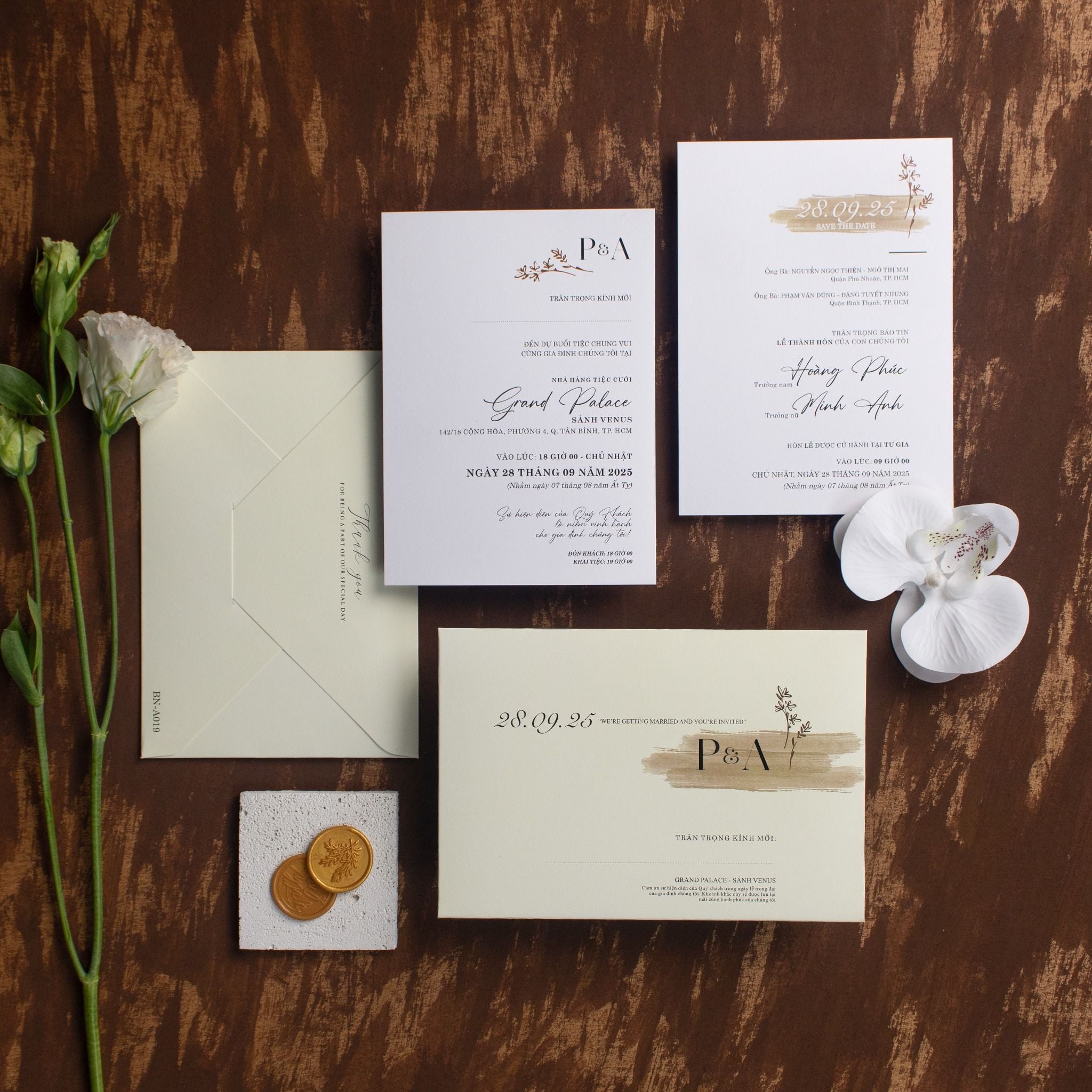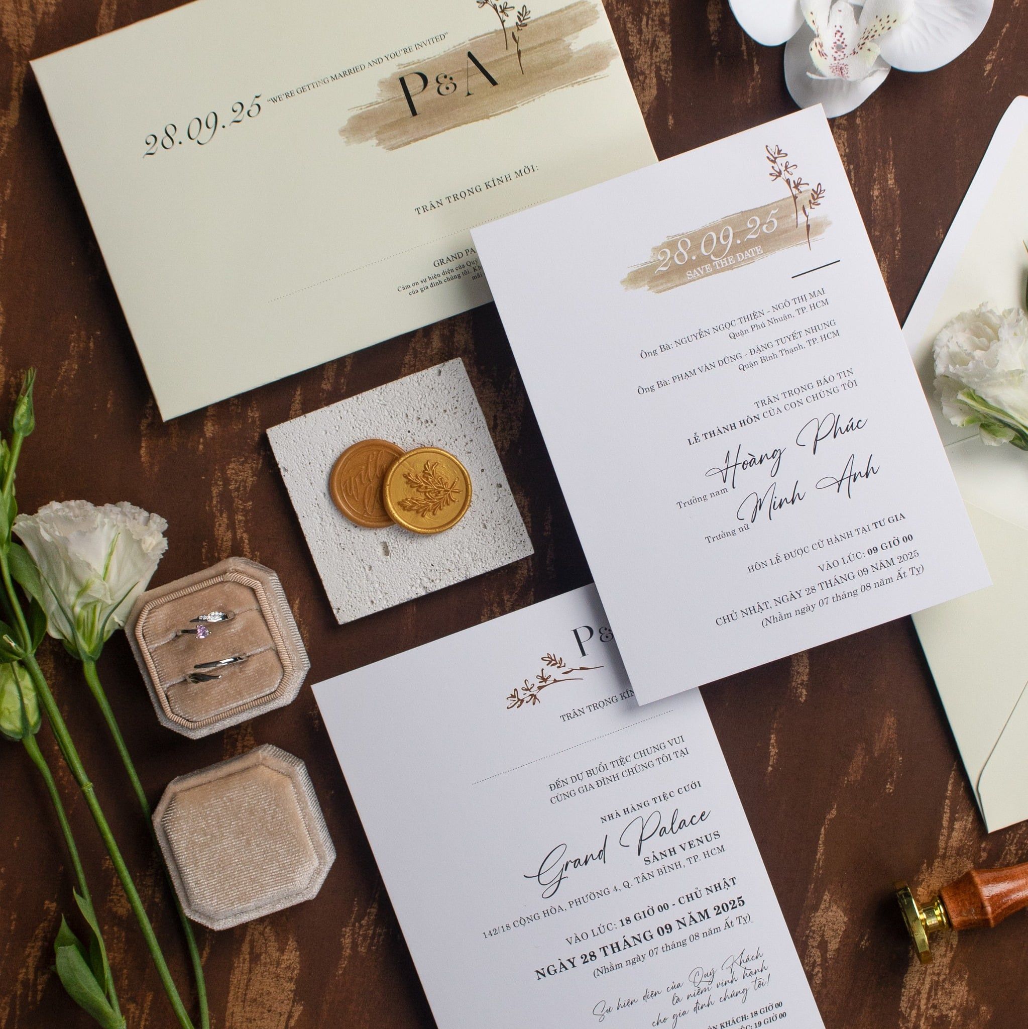Không cần những hoa văn cầu kỳ, bộ thiệp chọn ngôn ngữ thiết kế Minimalism với tông màu kem và nâu đất trầm ấm, gợi nhắc về một tình yêu bình dị nhưng bền bỉ. Điểm nhấn đắt giá nằm ở nét cọ vàng đồng bay bổng, tạo nên sự giao thoa hoàn hảo giữa nét mộc mạc và hơi thở sang trọng. Đây không đơn thuần là một lời mời, mà là cách bạn kể về gu thẩm mỹ tinh tế và sự trân trọng dành cho từng vị khách mời trong ngày trọng đại của đời mình.Khi bạn đặt trọn niềm tin vào Thiệp cưới KK để chuẩn bị cho ngày khởi đầu hạnh phúc, chúng tôi hiểu rằng sự riêng tư là điều quý giá nhất.