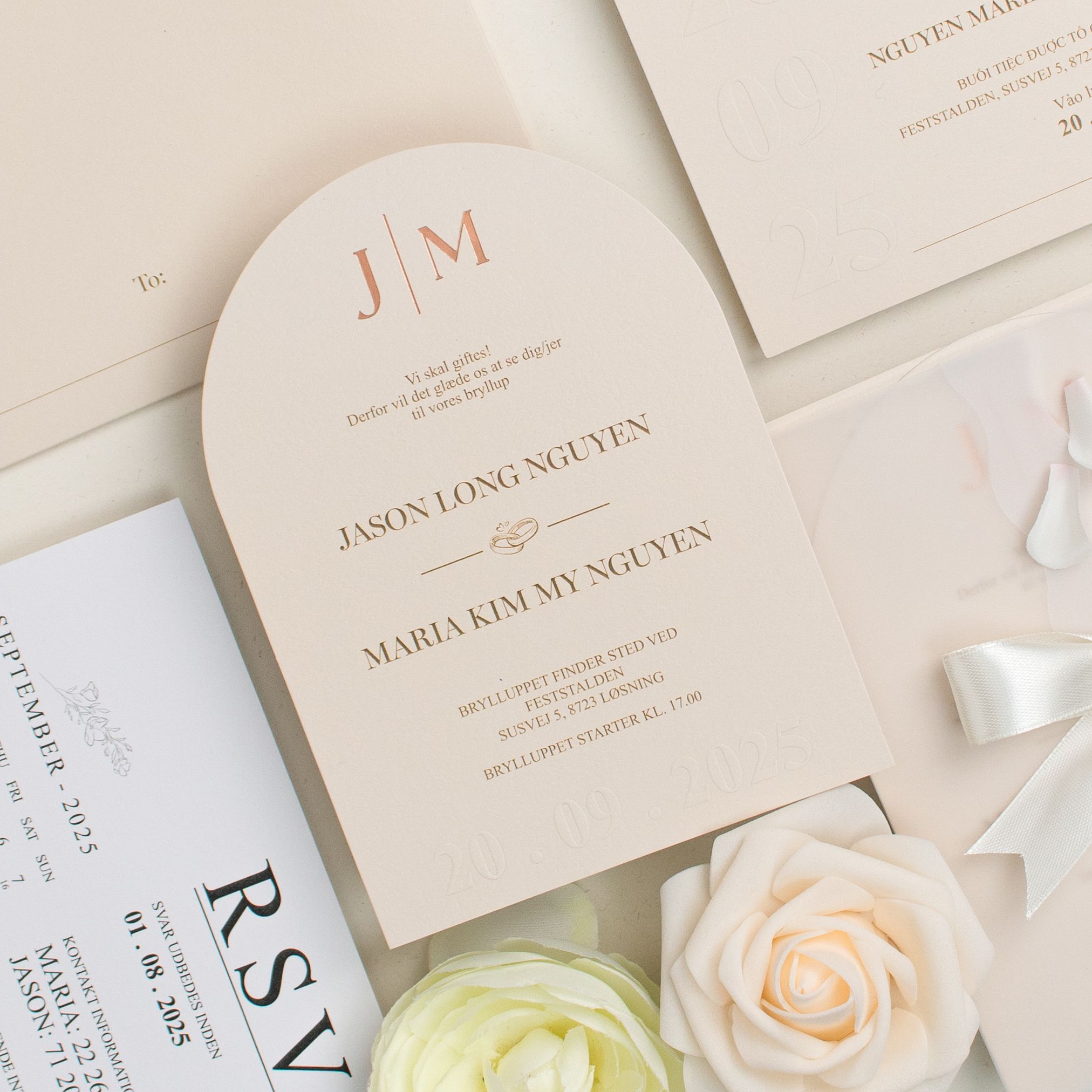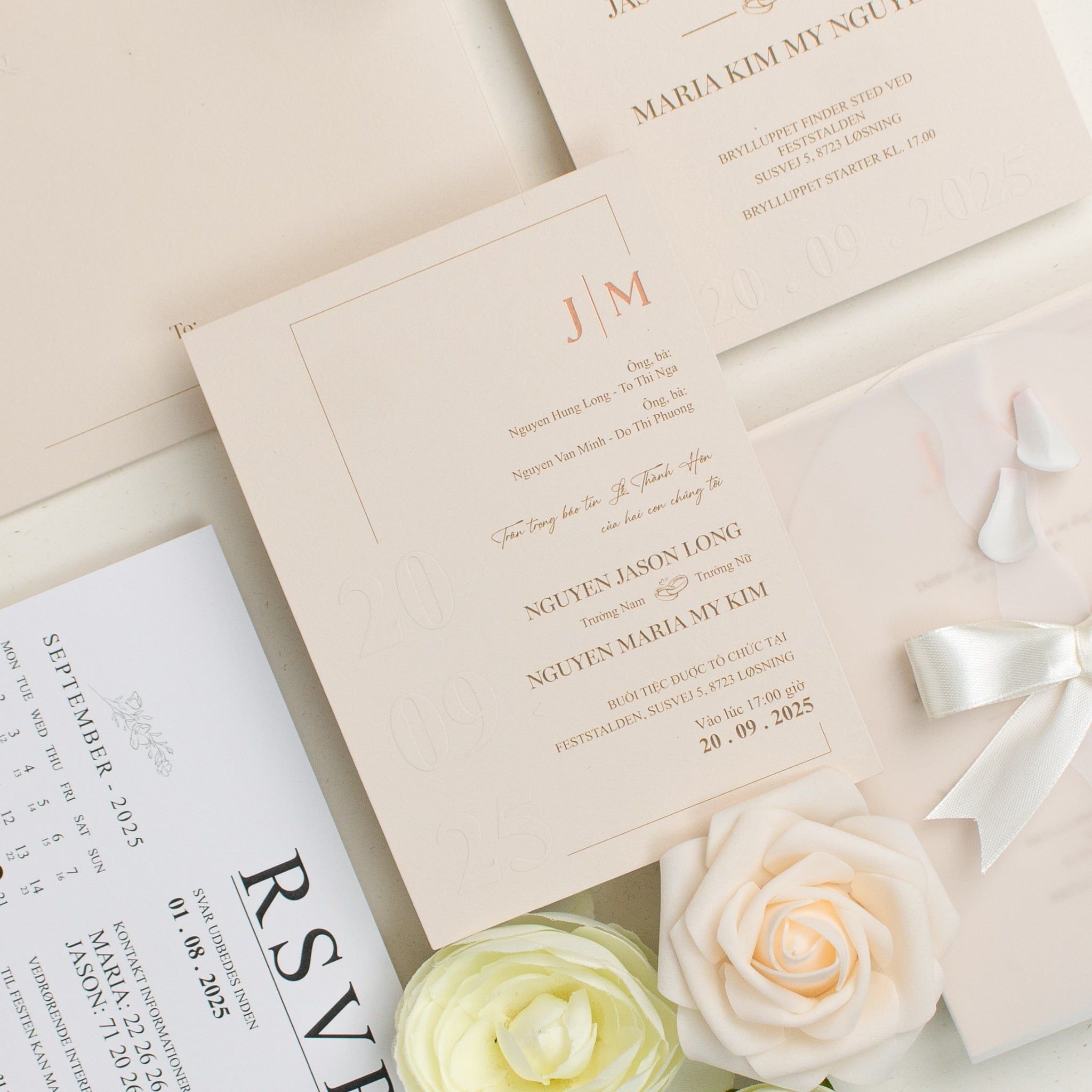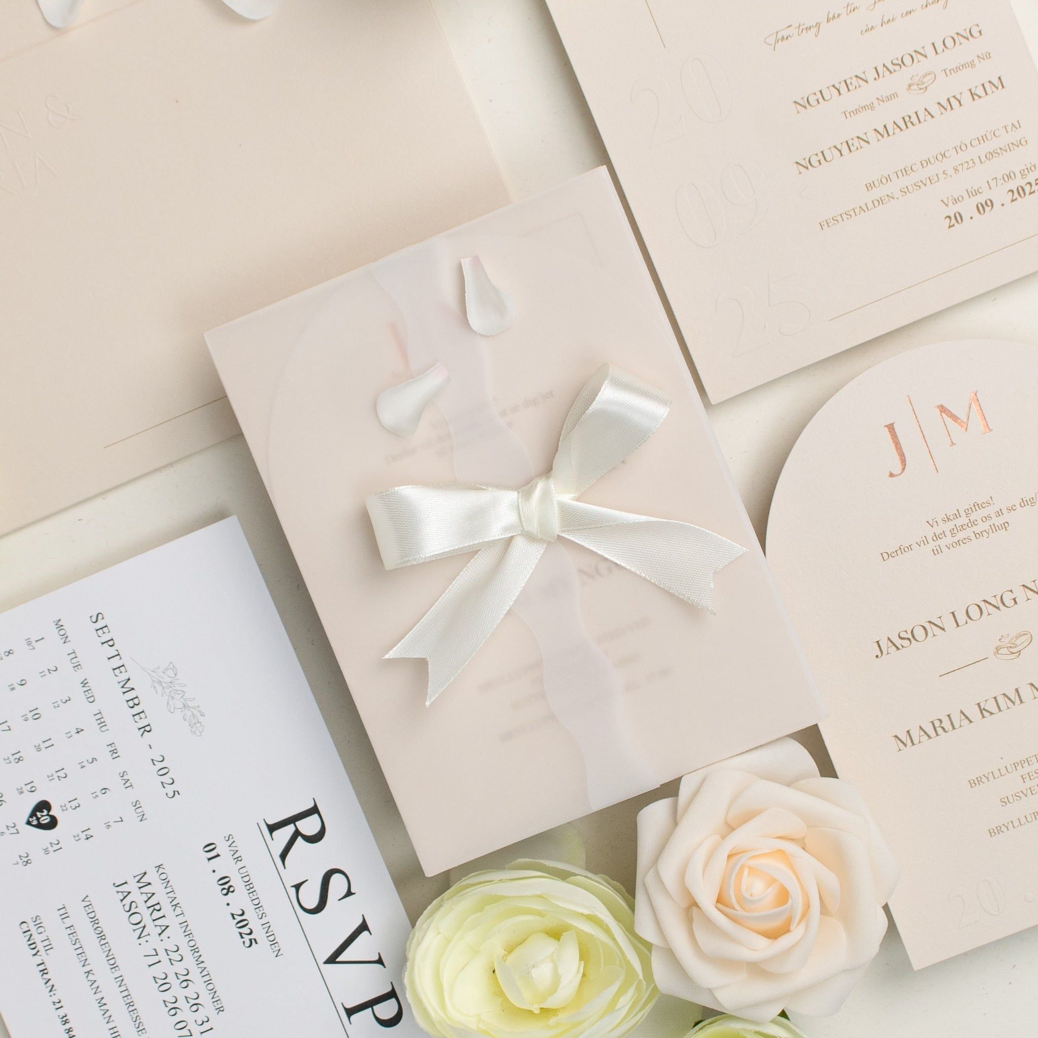 Nghệ thuật thiệp cưới tối giản tone màu Beige cao cấp Một lời mời không chỉ là thông tin, đó là cái chạm đầu tiên của khách mời vào câu chuyện tình yêu của bạn. Bộ thiệp Jason & Maria hiện diện với sắc Beige kem thanh lịch, nơi những đường nét dập nổi tinh xảo trên nền giấy mỹ thuật cao cấp kể về một sự gắn kết bền chặt. Không cần phô trương, sự sang trọng toát lên từ chiếc nơ ruy băng lụa mềm mại thắt thủ công, từ phông chữ hiện đại được sắp đặt có ý đồ đến những cánh hoa hồng trắng điểm xuyết. Đây là lựa chọn dành riêng cho những cặp đôi trân trọng giá trị nguyên bản, muốn gửi gắm sự chân thành và gu thẩm mỹ tinh tế trong từng chi tiết nhỏ nhất của ngày trọng đại.