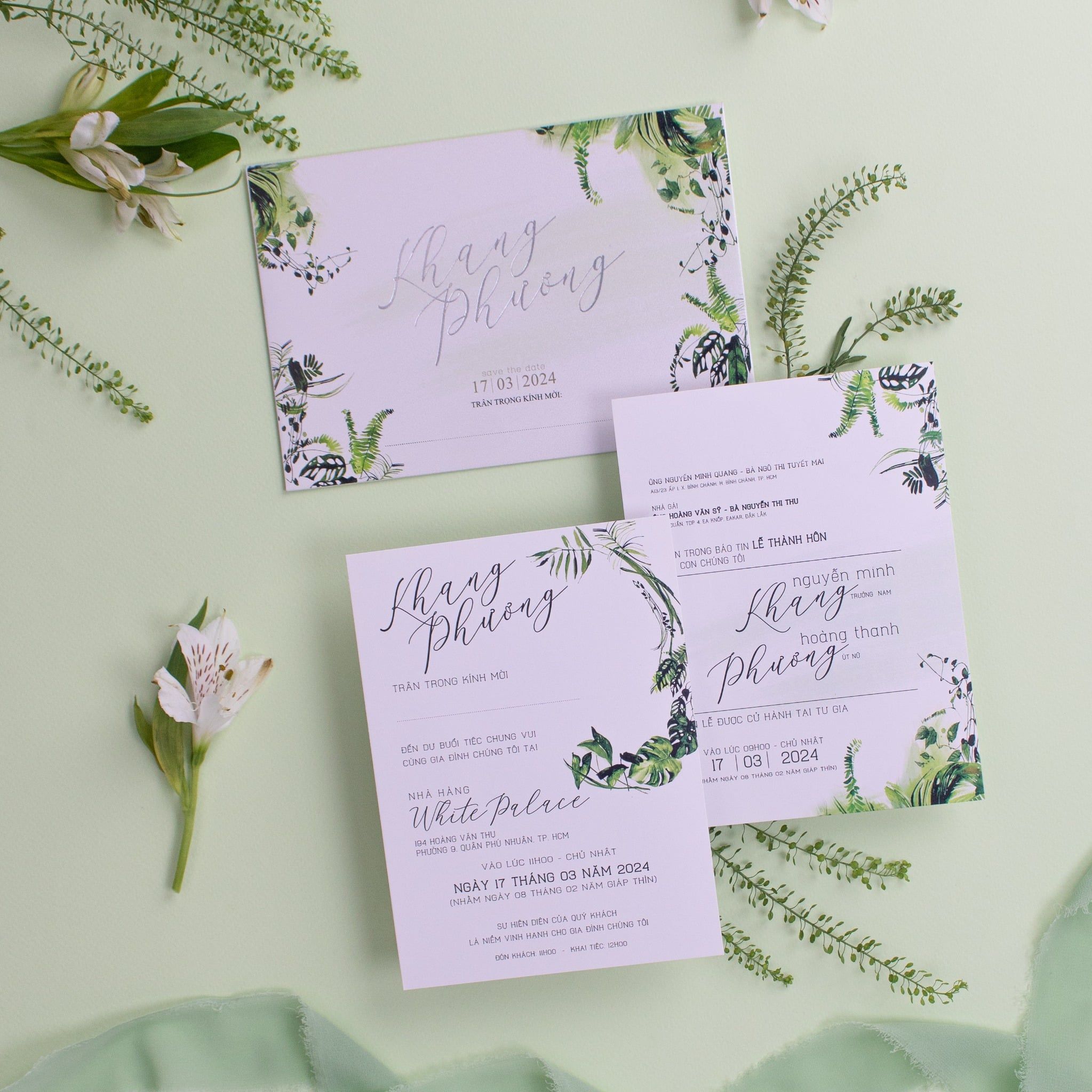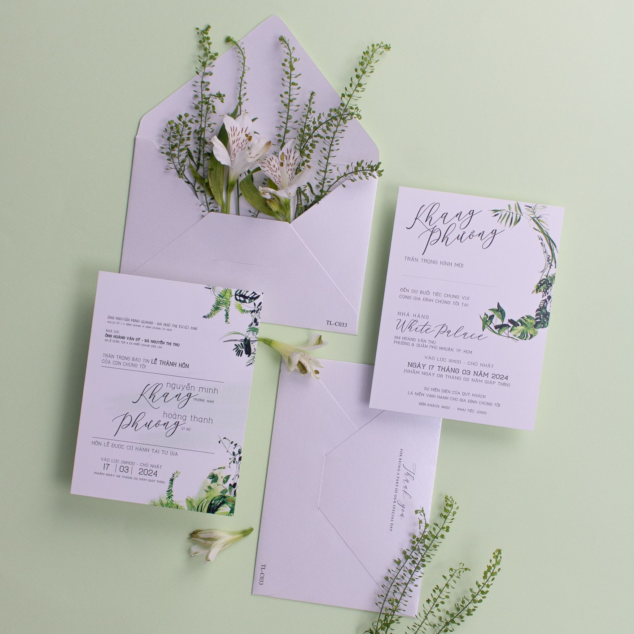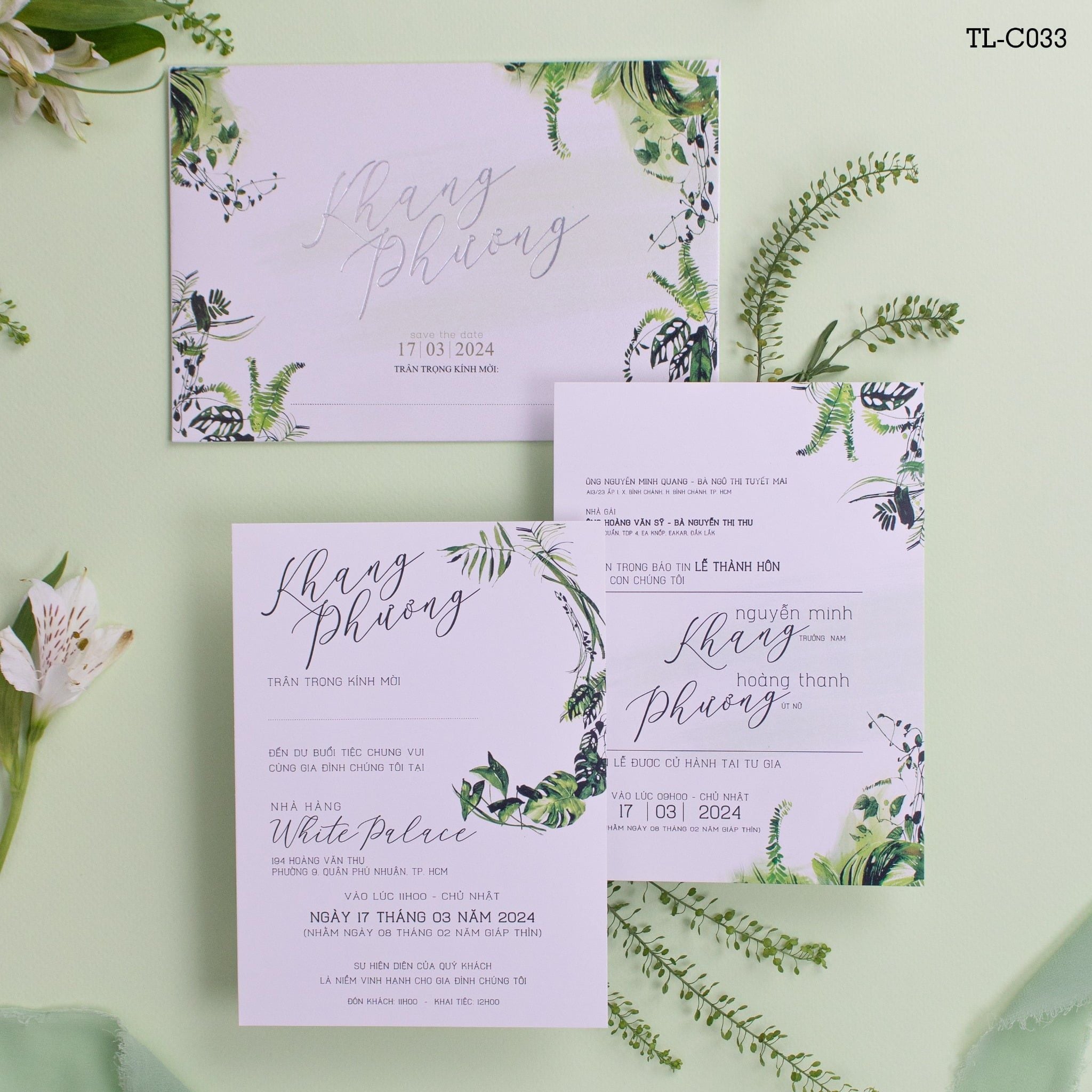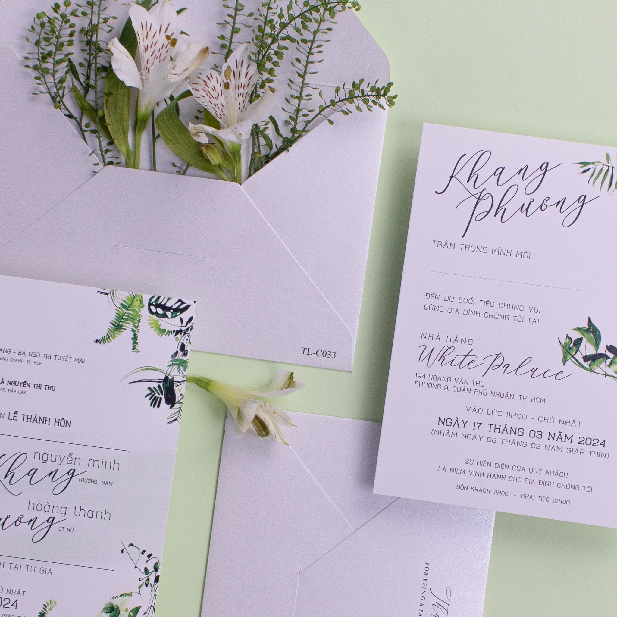 Bộ thiệp những nhành lá nhiệt đới xanh mướt, tạo nên một bản giao hưởng màu sắc đầy sức sống và tươi mới. Đây không chỉ đơn thuần là một tấm thiệp mời, mà là lời ngỏ chân thành, dẫn lối khách mời bước vào không gian lễ cưới ngập tràn hơi thở thiên nhiên. Từng nét chữ Calligraphy bay bổng được ép kim sang trọng trên nền giấy ánh kim, mang lại cảm giác chỉn chu và trân quý ngay từ cái chạm tay đầu tiên. Nếu bạn đang ấp ủ một buổi tiệc hiện đại, thanh lịch tại những không gian như White Palace, mẫu thiết kế TL-C033 chính là mảnh ghép hoàn hảo để hiện thực hóa giấc mơ về một ngày chung đôi vẹn tròn.Khi bạn đặt trọn niềm tin vào Thiệp cưới KK để chuẩn bị cho ngày khởi đầu hạnh phúc, chúng tôi hiểu rằng sự riêng tư là điều quý giá nhất.