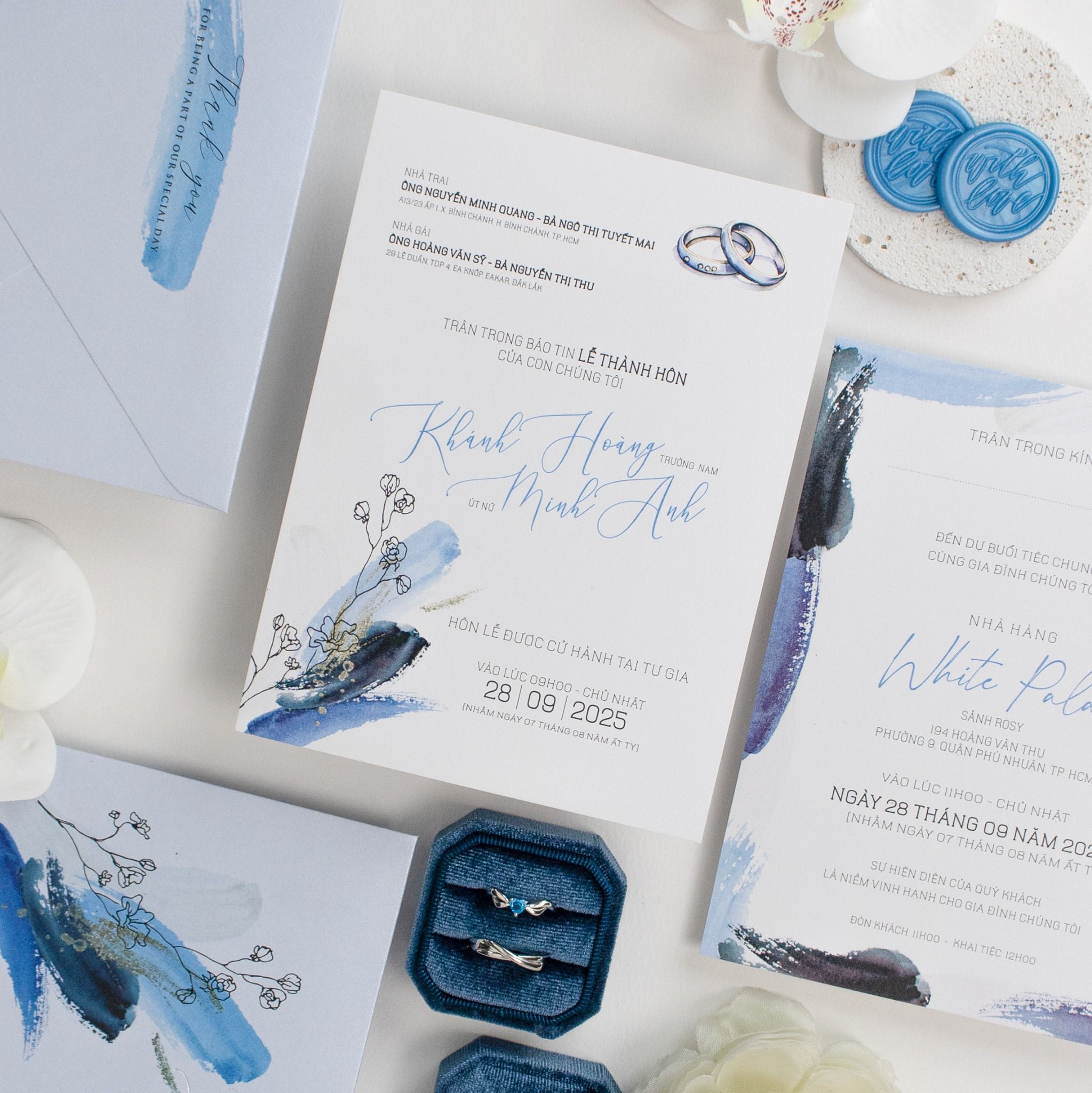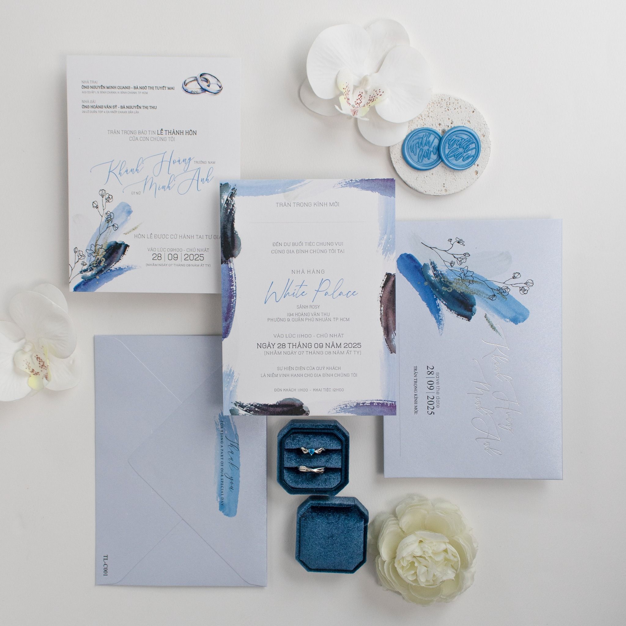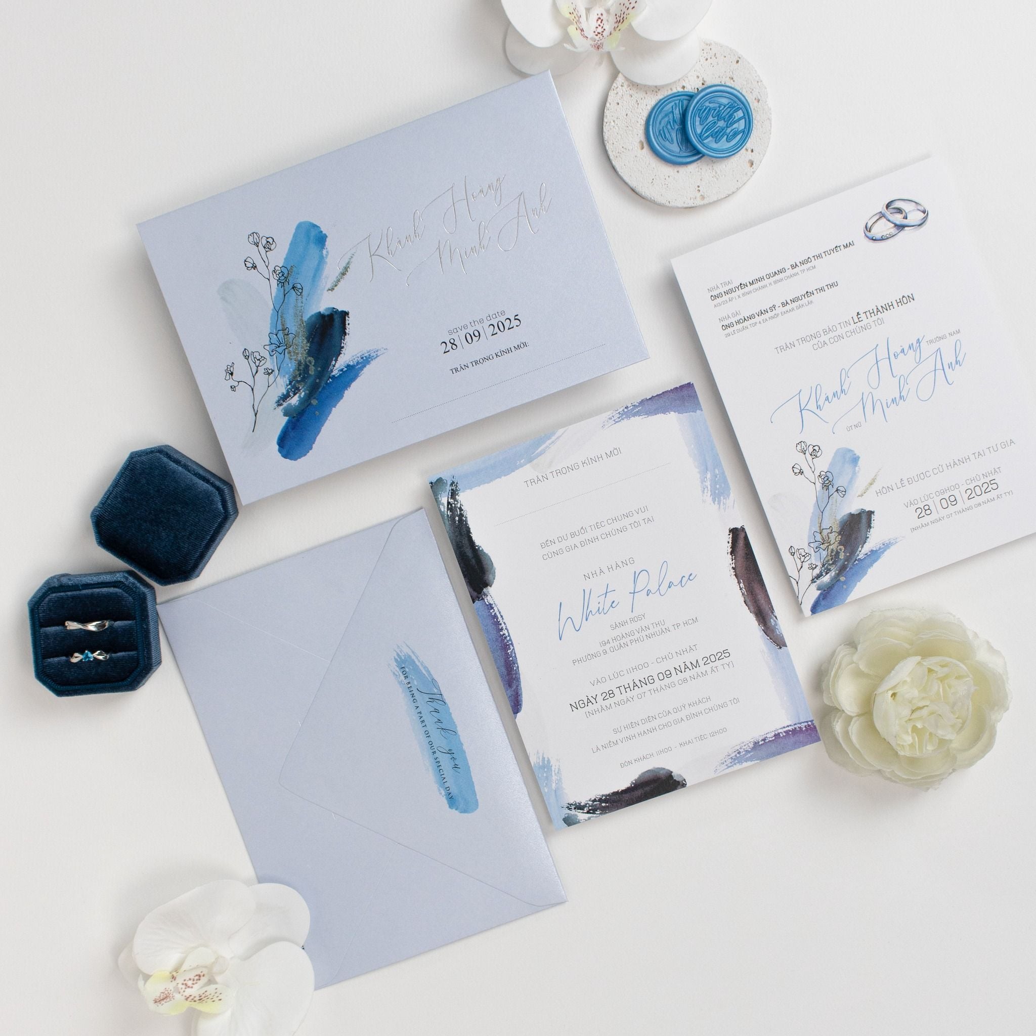 Thiệp Cưới Vệt Màu Nước Navy Nét Phóng Khoáng Đương Đại là một tác phẩm nghệ thuật lôi cuốn, mang hơi thở đại dương và sự tự do vào từng lời mời cưới. Mẫu thiết kế gây ấn tượng mạnh mẽ nhờ những vệt màu nước xanh Navy được đặt để ngẫu hứng, tạo nên dòng chảy màu sắc sống động và đầy chiều sâu trên nền giấy trắng thanh khiết. Chất nghệ thuật phóng khoáng này được cân bằng hoàn hảo bởi những nhành hoa dại mảnh mai, mang đến một tổng thể vừa cá tính, mạnh mẽ lại vừa lãng mạn, tinh tế. Với bố cục thoáng đãng cùng phông chữ tối giản, bộ thiệp là tuyên ngôn cho gu thẩm mỹ đẳng cấp và sự phá cách của những cặp đôi yêu thích phong cách đương đại, biến lời mời thành một kỷ vật nghệ thuật đáng lưu giữ.