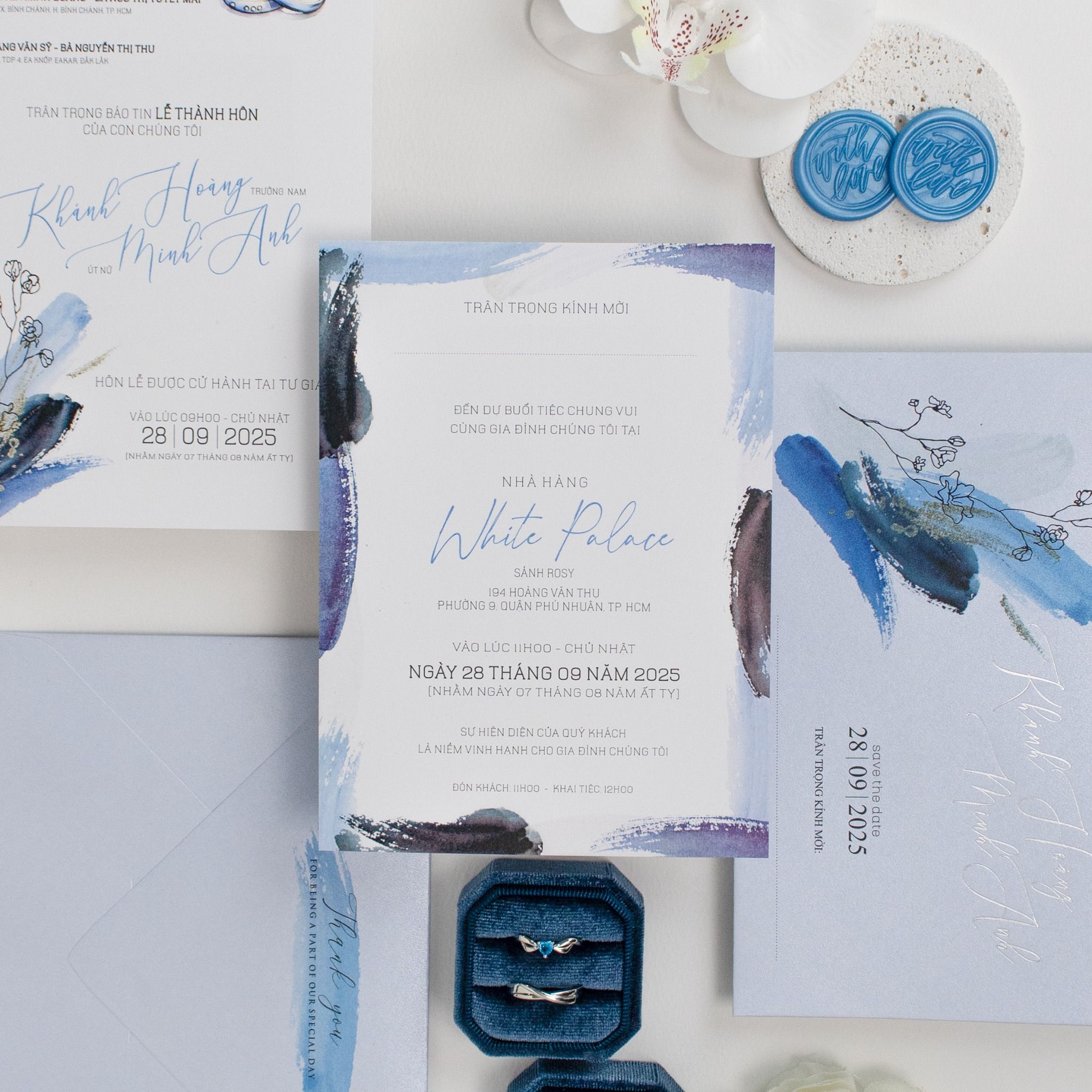 Thiệp Cưới Vệt Màu Nước Navy Nét Phóng Khoáng Đương Đại
