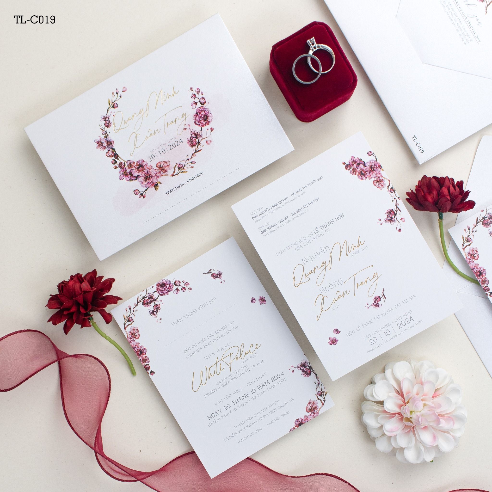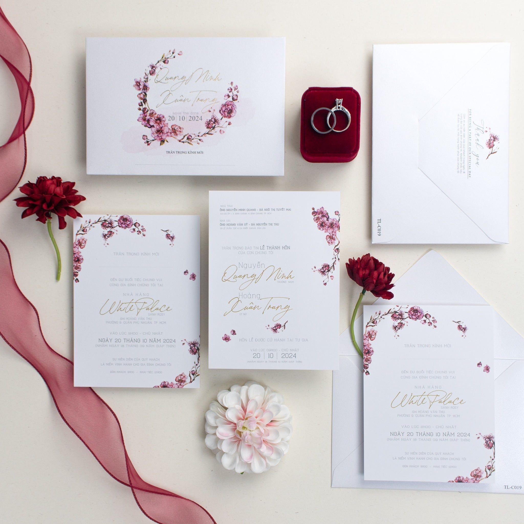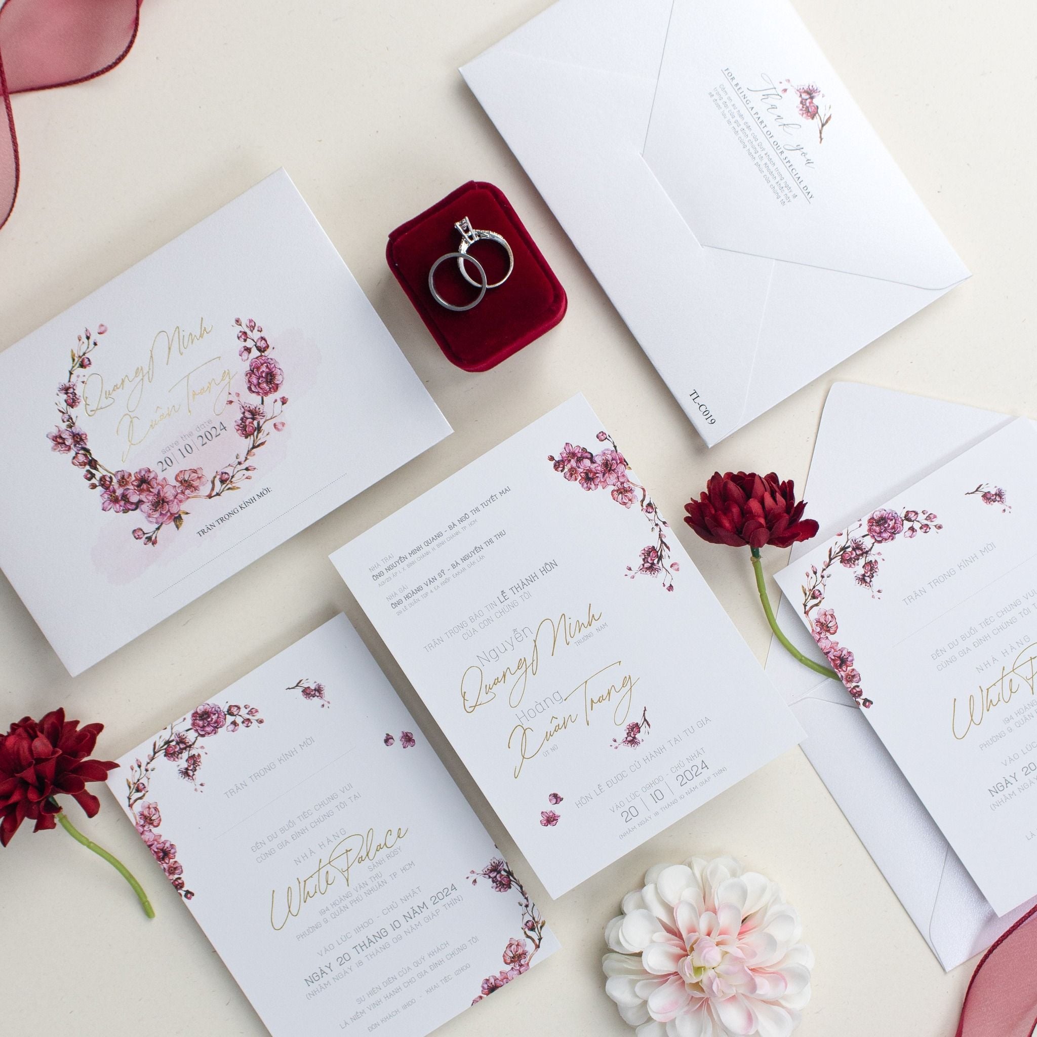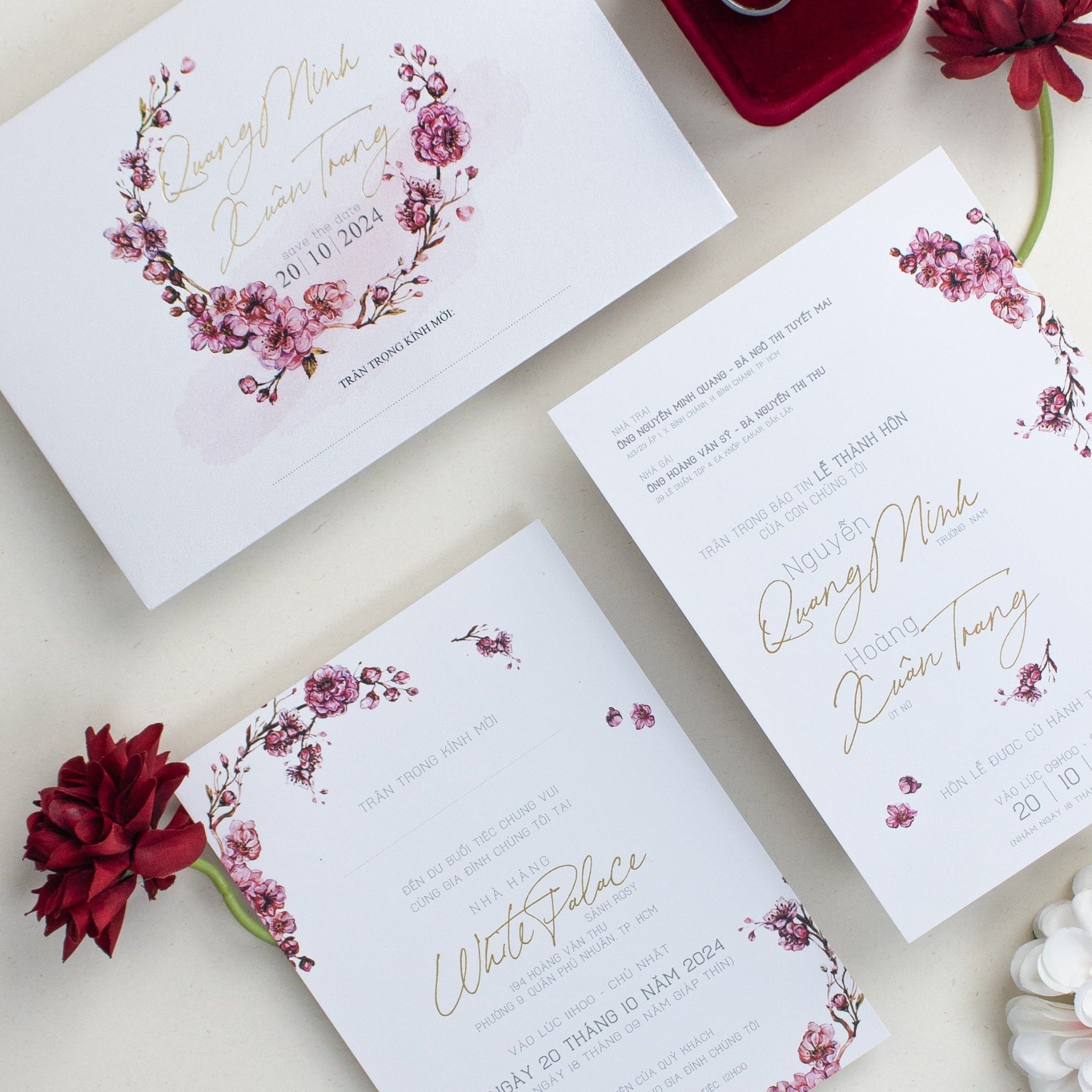 Đây là chương mở đầu cho câu chuyện tình yêu của Quang Minh và Xuân Trang. Từng nhành hoa anh đào được phác họa mềm mại, bao bọc lấy tên đôi uyên ương bằng kỹ thuật ép kim vàng rực rỡ, tạo nên một hiệu ứng thị giác đầy mê hoặc trên nền ánh kim trắng mịn. Cầm tấm thiệp trên tay, khách mời sẽ cảm nhận rõ sự mềm mại và cái tâm của người chuẩn bị. Sắc đỏ nồng nàn từ hộp nhẫn nhung và những đóa hoa trang trí đi kèm như một lời khẳng định về sự vẹn tròn, viên mãn.