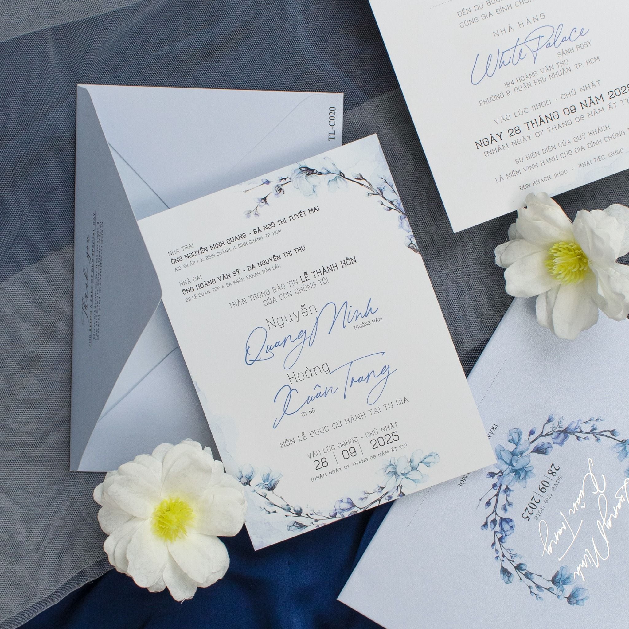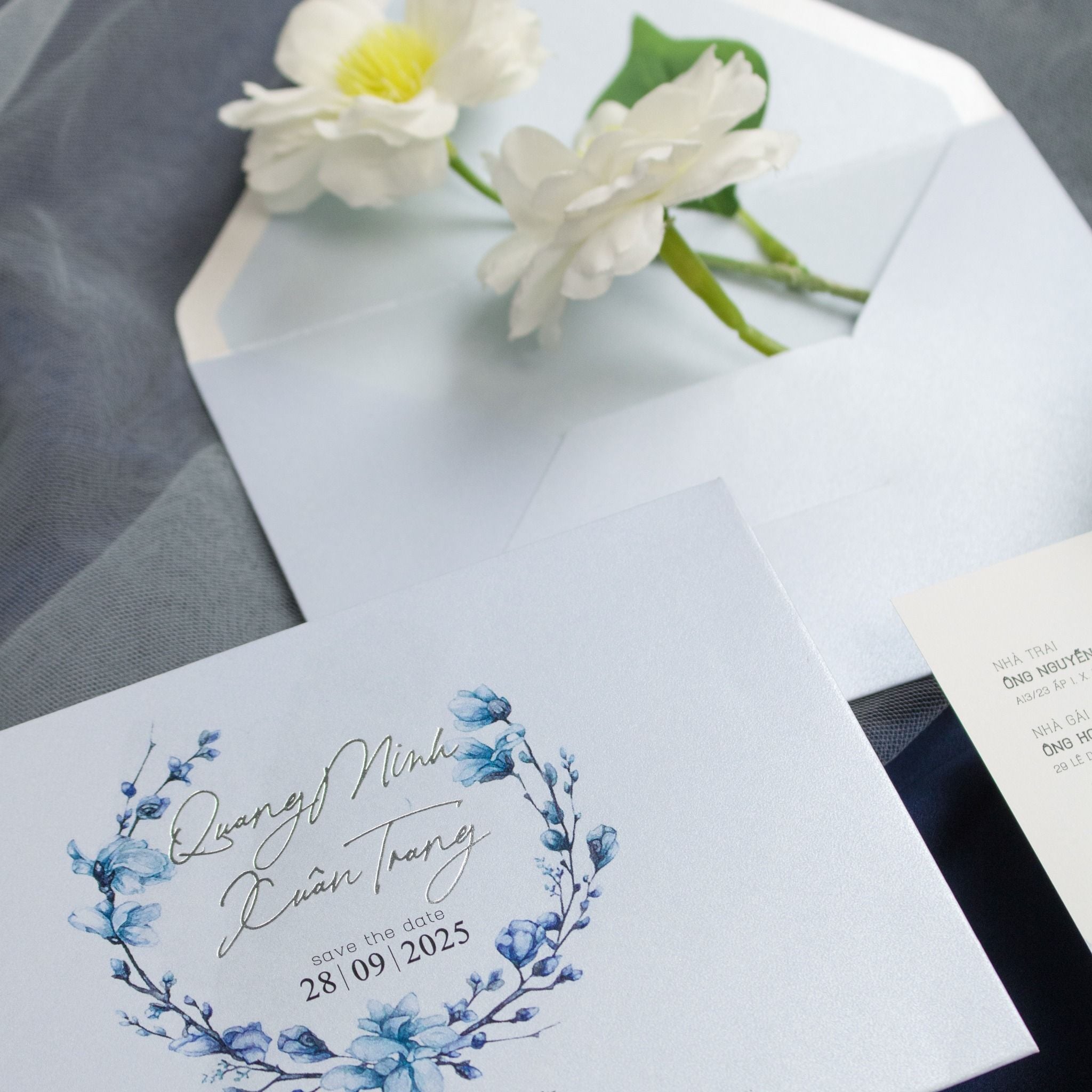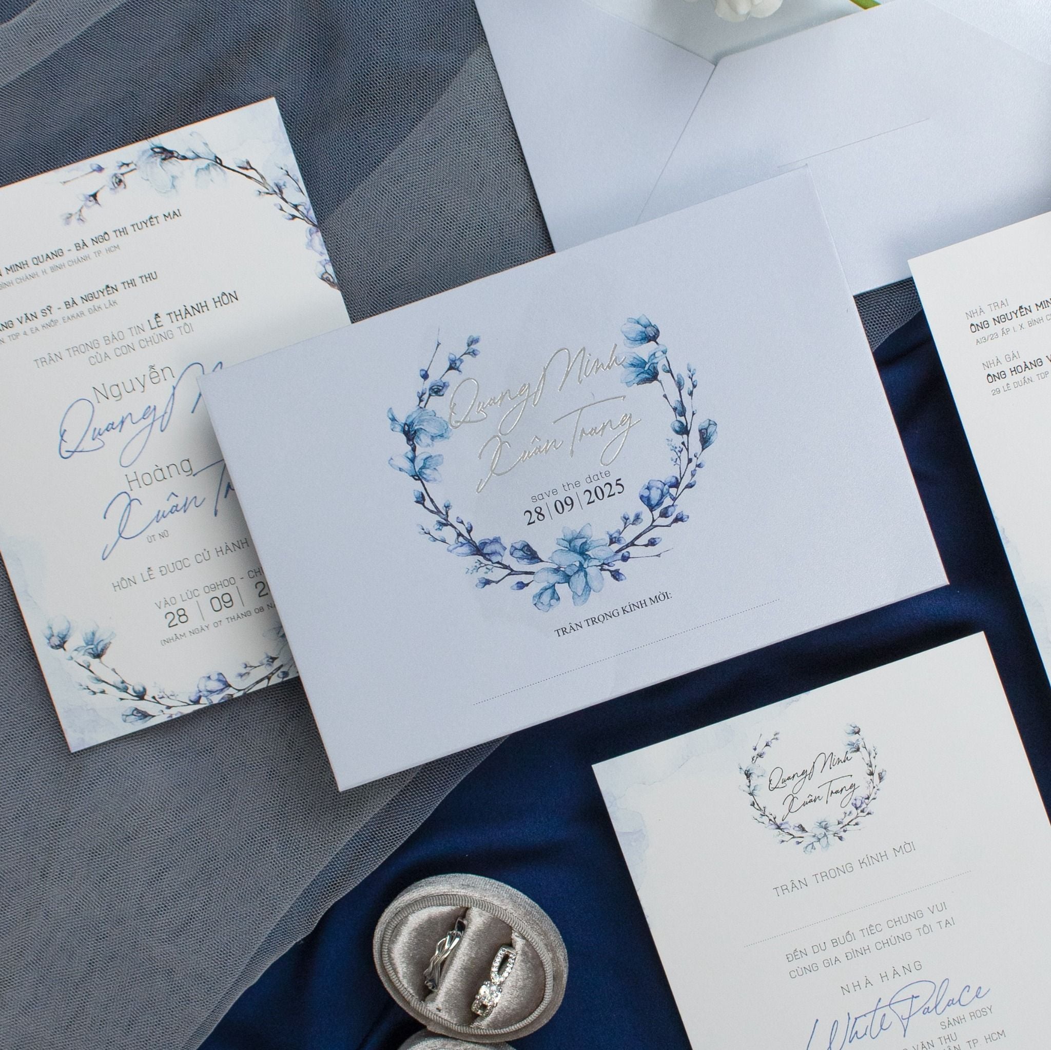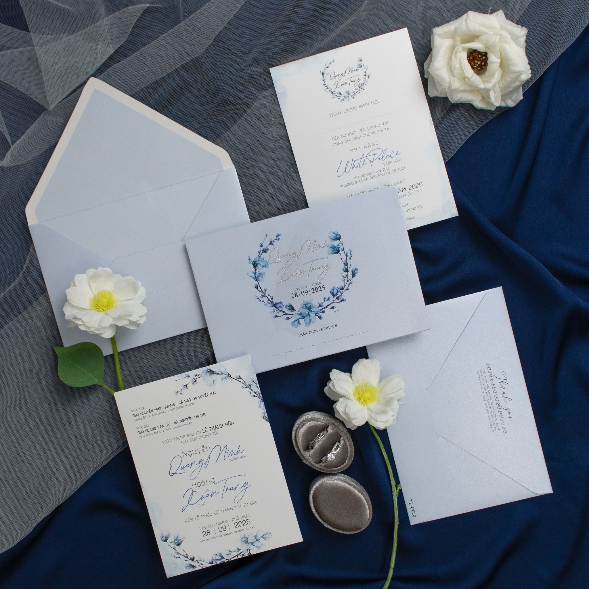 Giữa muôn vàn sắc hoa rực rỡ, ta chọn cho mình sắc xanh trầm mặc của Lưu Ly, loài hoa mang lời nhắn nhủ chân thành "Forget-me-not". Không phô trương, bộ thiệp là sự kết hợp tinh tế giữa nghệ thuật loang nhạt và vòng lưu ly mềm mại. Những nhành lá mảnh khảnh đan xen cùng sắc hoa lam như ẩn hiện trong màn sương sớm, ôm lấy tên gọi của đôi ta trong một vòng tròn viên mãn. Là một bản tình ca dịu dàng, viết nên từ những rung động thanh khiết và lời hứa về một sự gắn kết dài lâu.